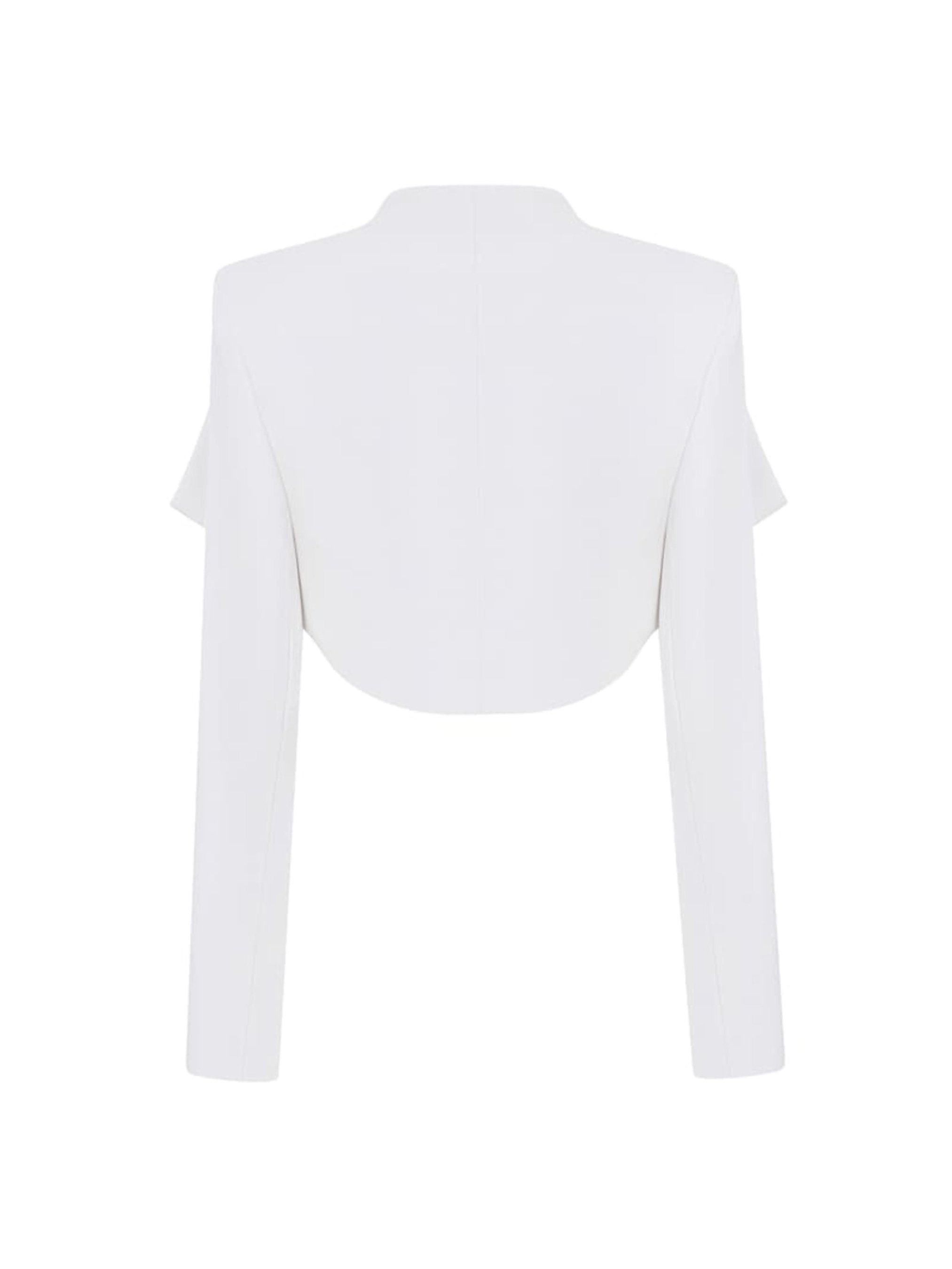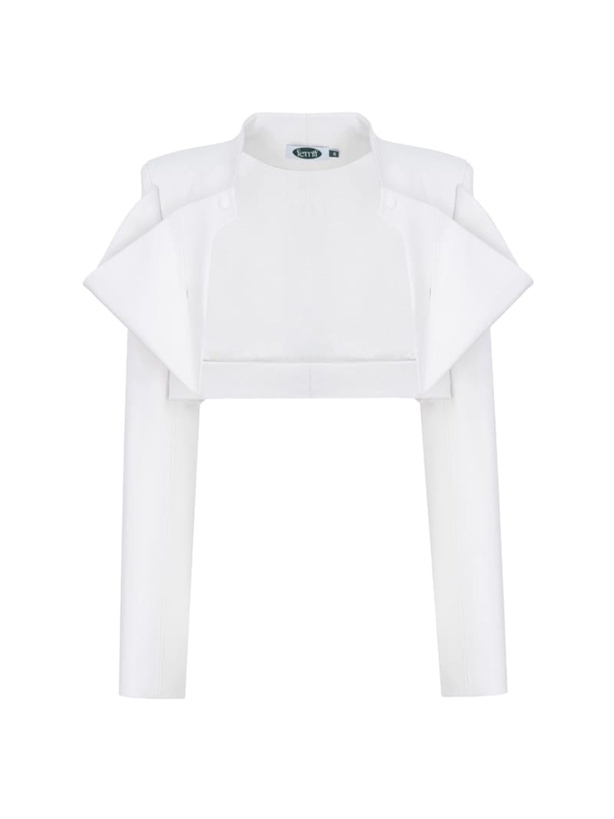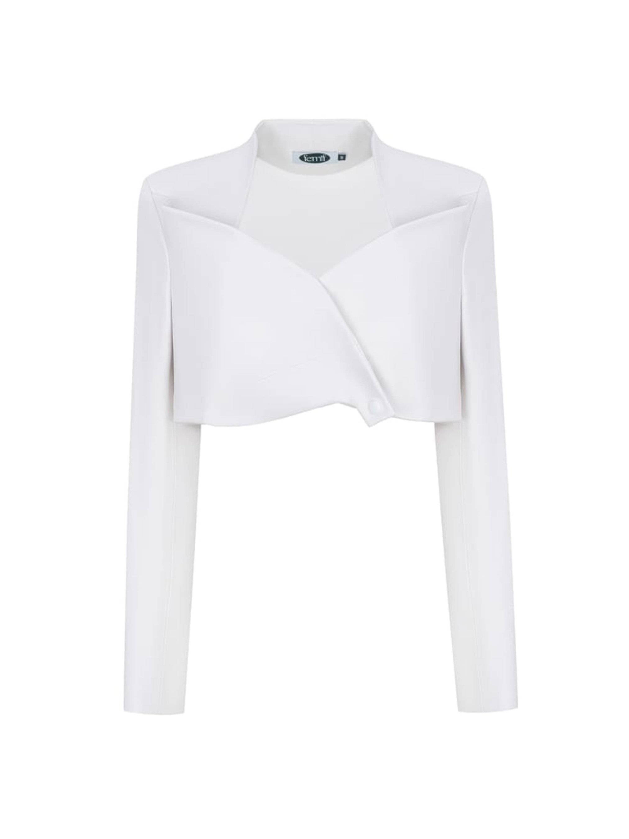 Куртка Protea из высококачественной белой экокожи алькантара, чрезвычайно приятная на ощупь, на вискозе с эластаном. Имеет большие декоративные лацканы, которые можно трансформировать в разные положения с помощью декоративных пуговиц с логотипом бренда.