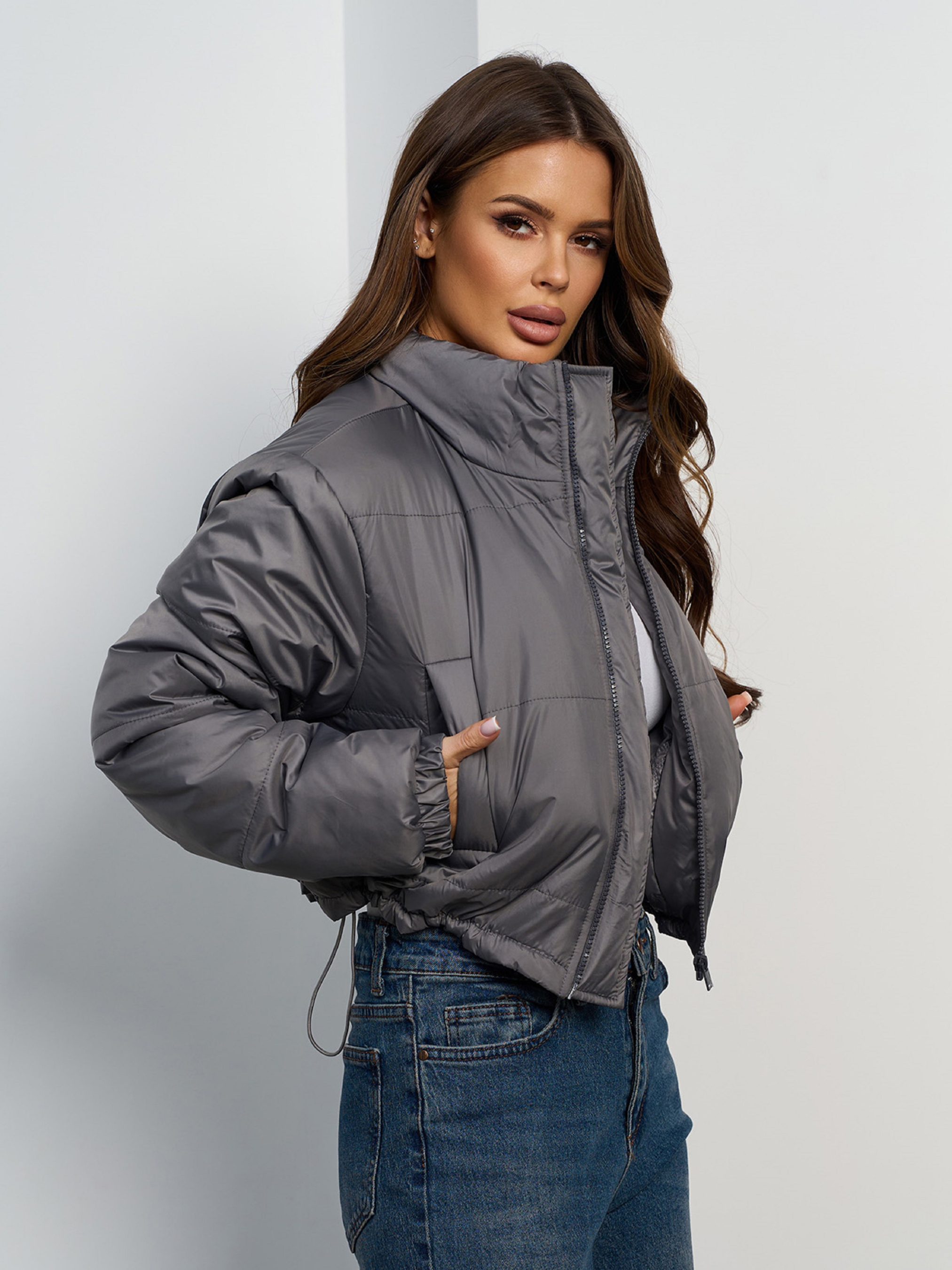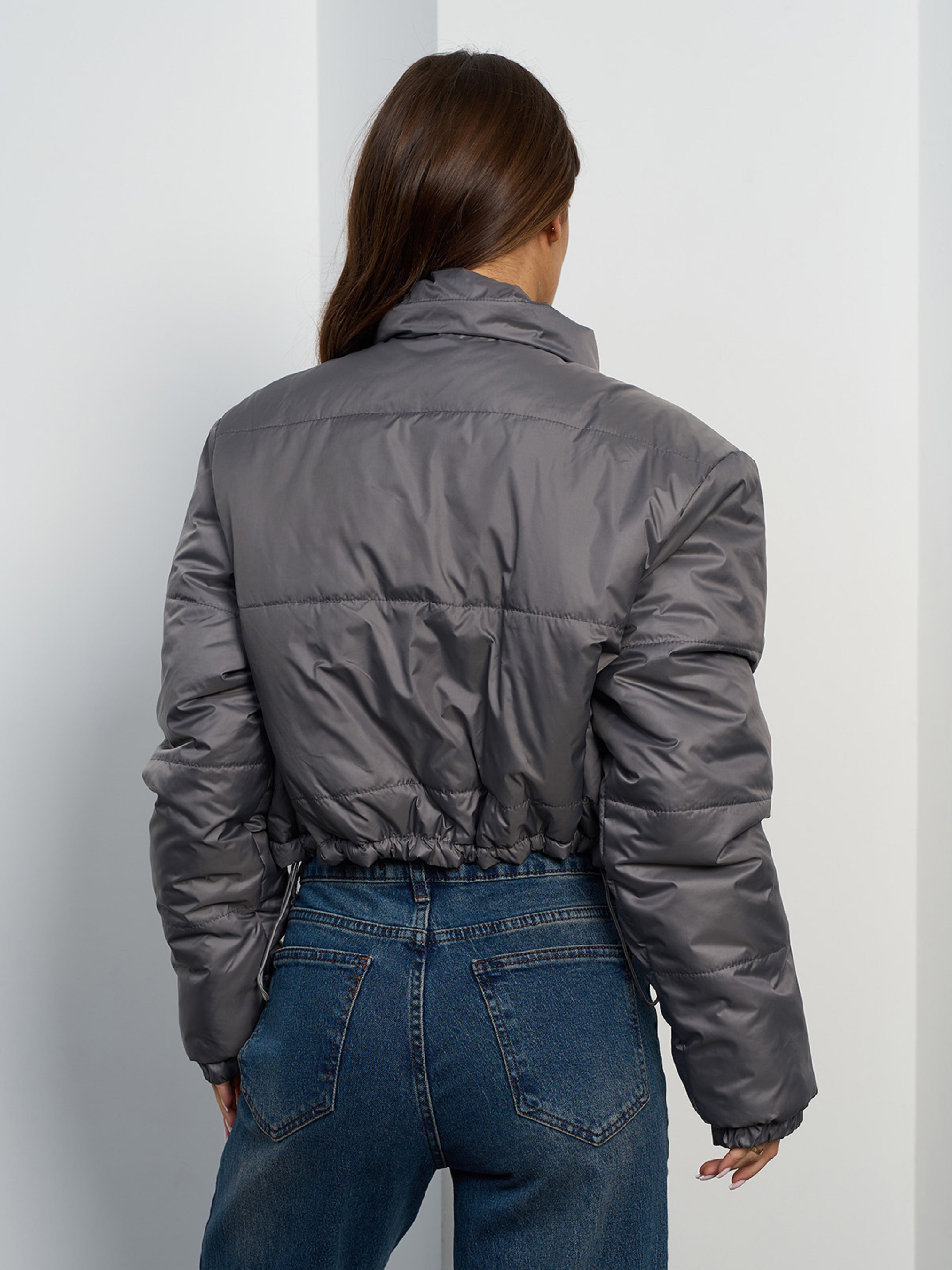 Теплая серая куртка на молнии с укороченной длиной. Модель с нижней кулиской, воротником-стойкой и карманами. Куртка выполнена из плащевки на синтепоне с пуховым утеплителем. Полуобхват: Кофта: Грудь: S (58), M (60), L (62), XL (64), Длина изделия - 48, Рукав - 61, Ткань: Низкой эластичности.