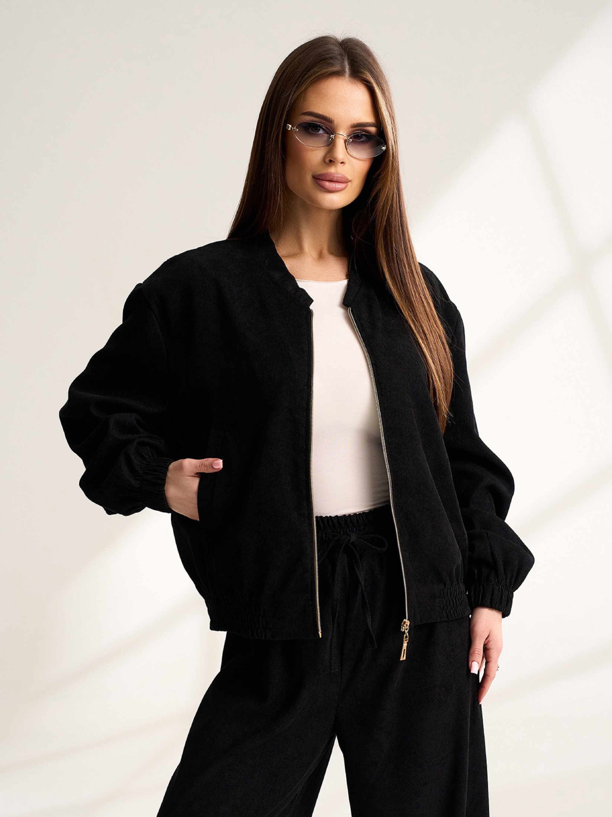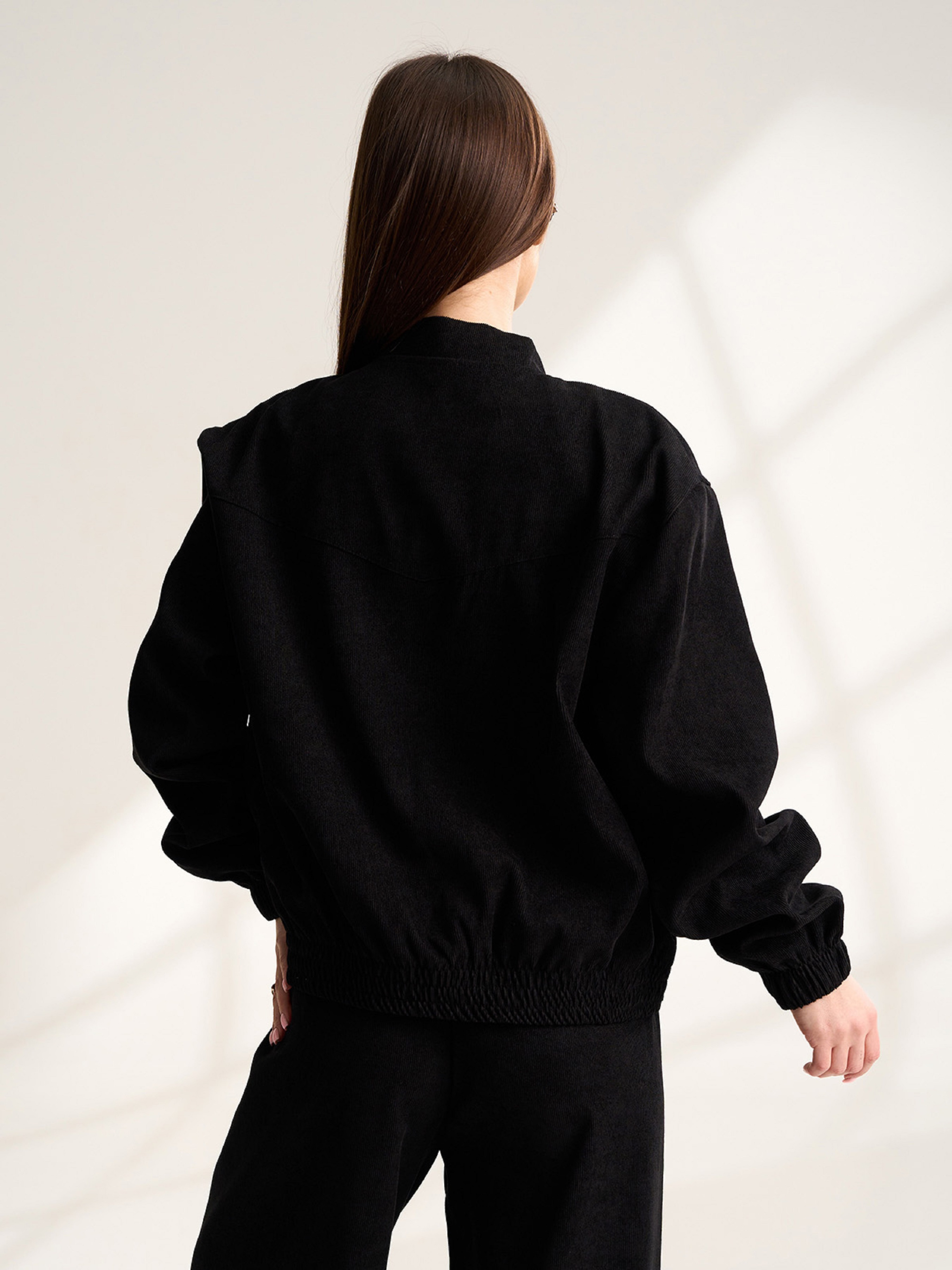 Вельветовая легкая куртка бомбер на молнии, выполненная в черном цвете без подклада. Модель с эластичными манжетами и воротником-стойкой. Бомбер с карманами. Полуобхват: Грудь: S (57), M (59), L (61), XL (63), Длина изделия - 58, Рукав - 59, Ткань: Низкой эластичности.