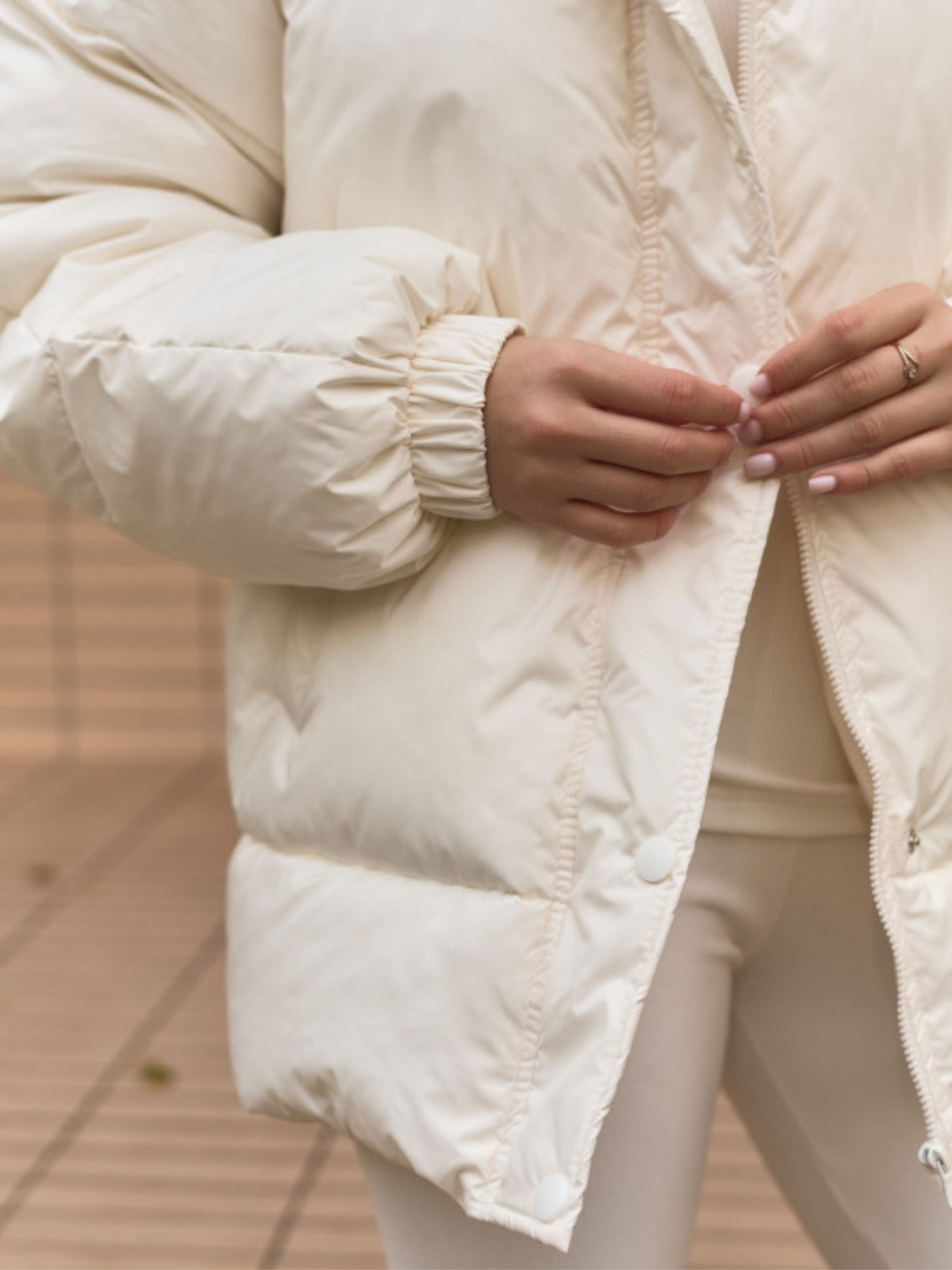 Легкость, нежность и тепло – три слова, которые лучше всего описывают этот пуховик. Молочный оттенок придает образу свежести и деликатности, а объемная форма создает современный и уютный силуэт. Идеальный вариант для тех, кто любит минимализм и комфорт. Наполнитель из эко-пуха обеспечивает тепло даже в самые сильные морозы — до –15°C, не прибавляя лишнего веса. Высокий воротник и капюшон созданы, чтобы обнимать тебя ветреными днями, а практичные карманы хранят все необходимое рядом. Пуховик легко вписывается в любой гардероб: сочетай его с трикотажем, любимыми брюками или платьем – будет смотреться гармонично в каждом варианте. Плащевая ткань