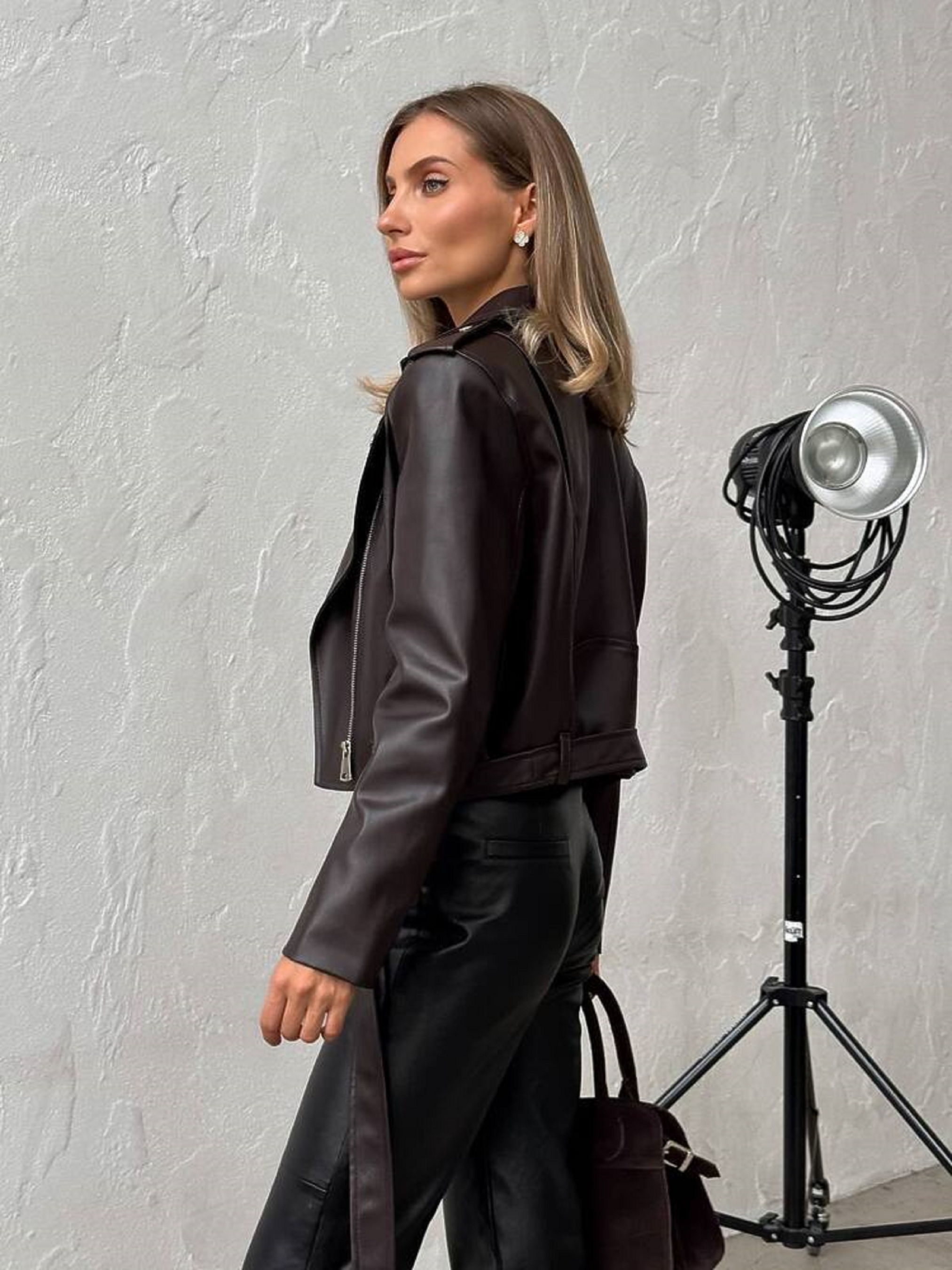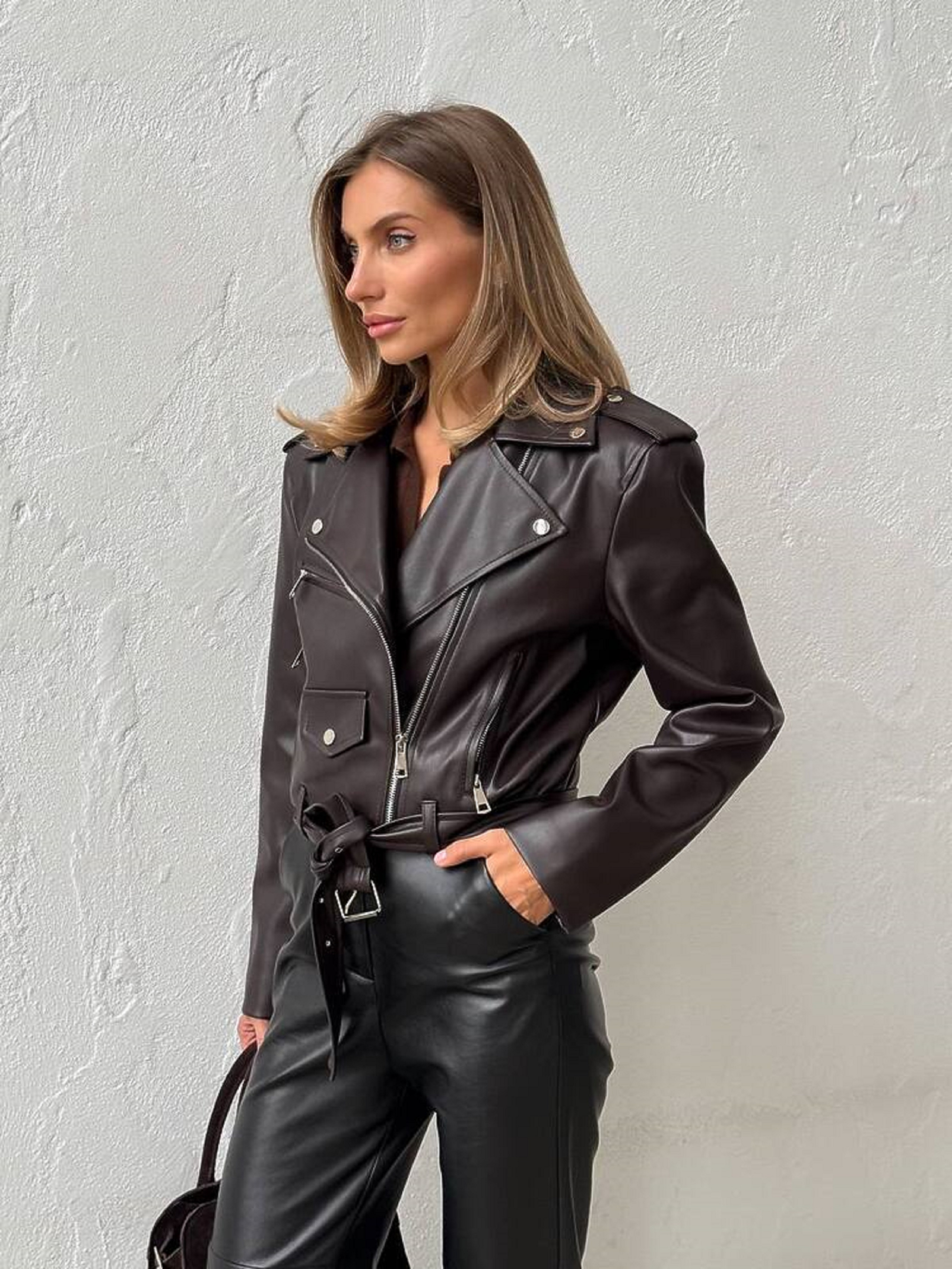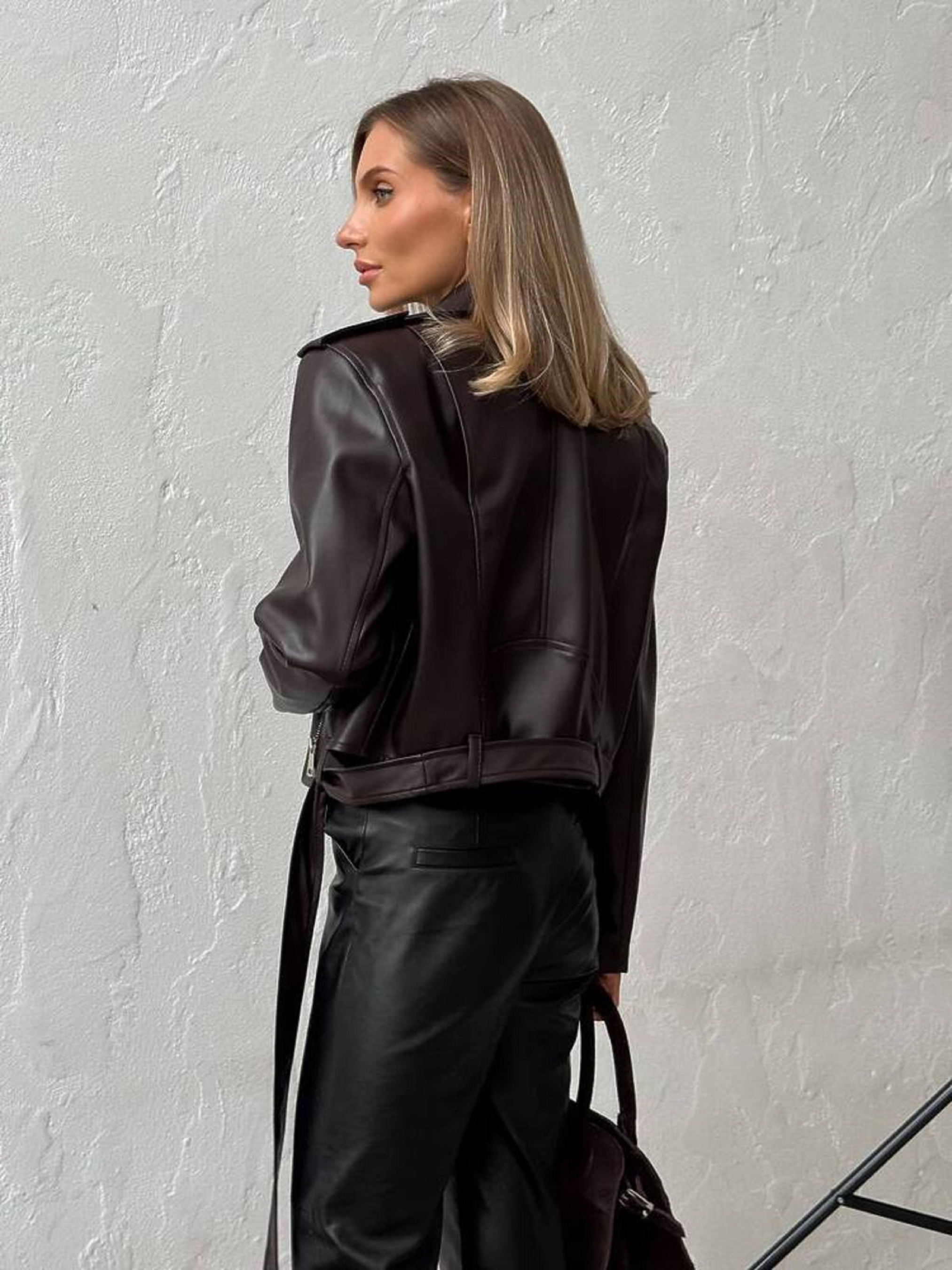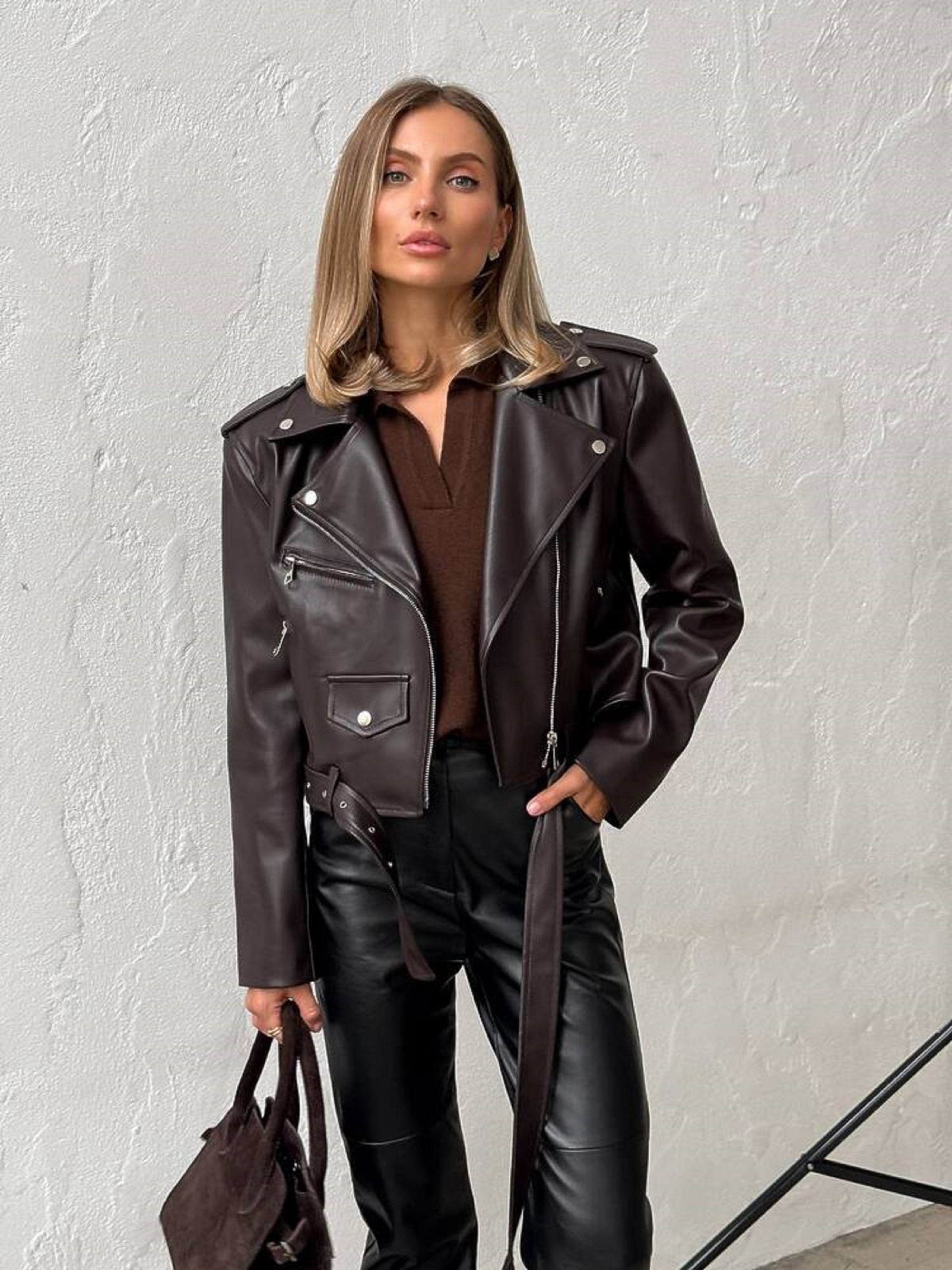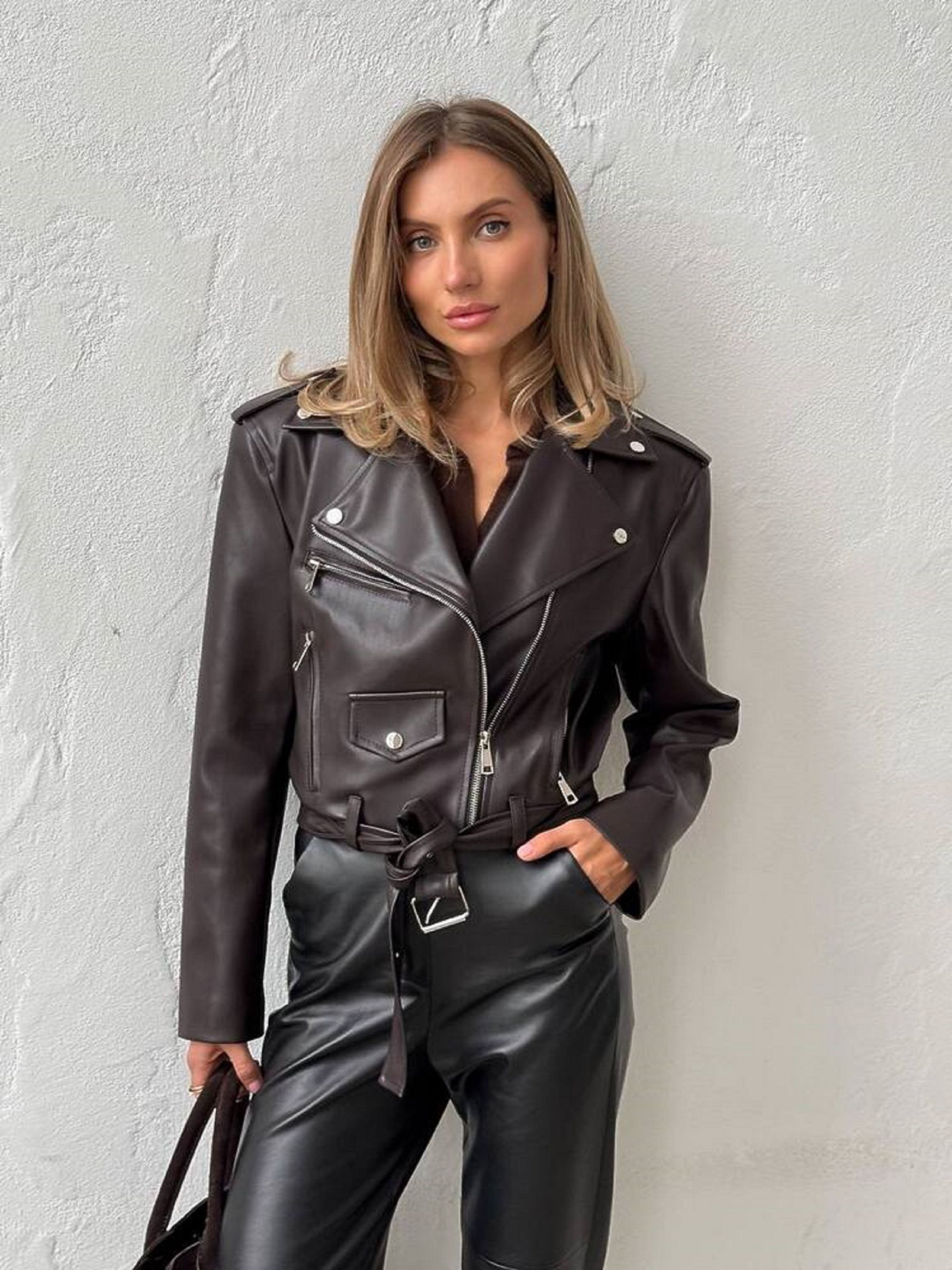 Особливості та характеристики: Модель: укорочена косуха прямого силуету Тканина: екошкіра ЛЮКС якості Підкладка: нейлон Фурнітура: блискавки та деталі металевого кольору “нікель” Кишені: функціональні (діючі) Застібка: блискавка на косу Довжина виробу: укорочена Стиль: casual / street / smart-casual Кольори в наявності: Індіго, айворі, коричневий, молоко, шоколад, чорний Переваги моделі: Екошкіра преміум-якості має м’яку фактуру, приємна на дотик, не тріскається та не втрачає форму. Універсальний дизайн легко поєднується з сукнями, джинсами, спідницями. Ідеальна як для повсякденного образу, так і для вечірнього виходу. Догляд: Прати не рекомендується — очищати м’якою вологою тканиною Не відбілювати Не сушити біля джерел тепла Зберігати на тремпелі, у прохолодному, сухому місці Стильна та трендова жіноча куртка-косуха POWER — must-have у гардеробі сучасної жінки. Виконана з високоякісної екошкіри ЛЮКС класу, вона виглядає ефектно, зберігаючи при цьому комфорт у носінні. Укорочений силует підкреслює фігуру, а металеві блискавки додають образу характеру й сучасного настрою.