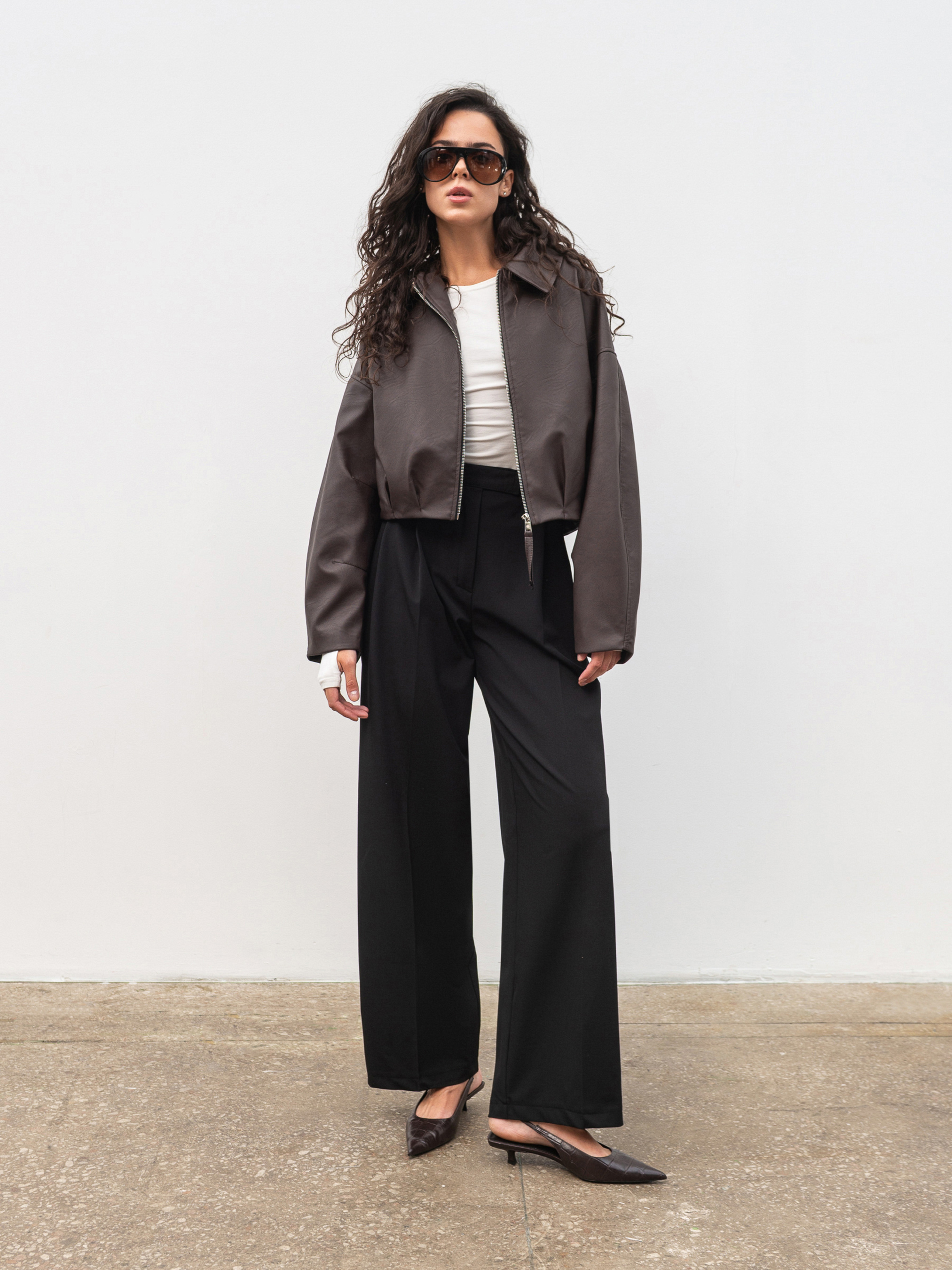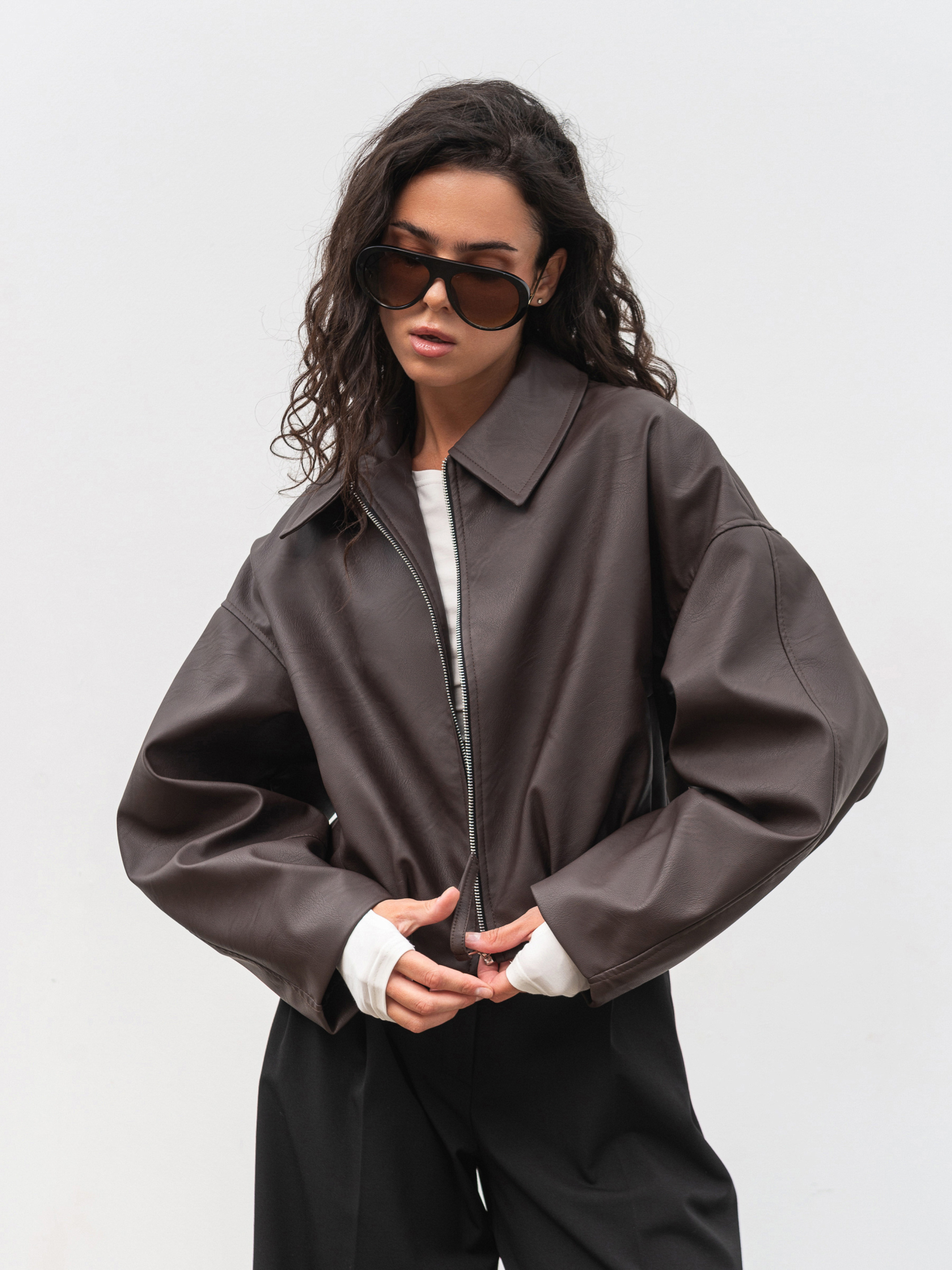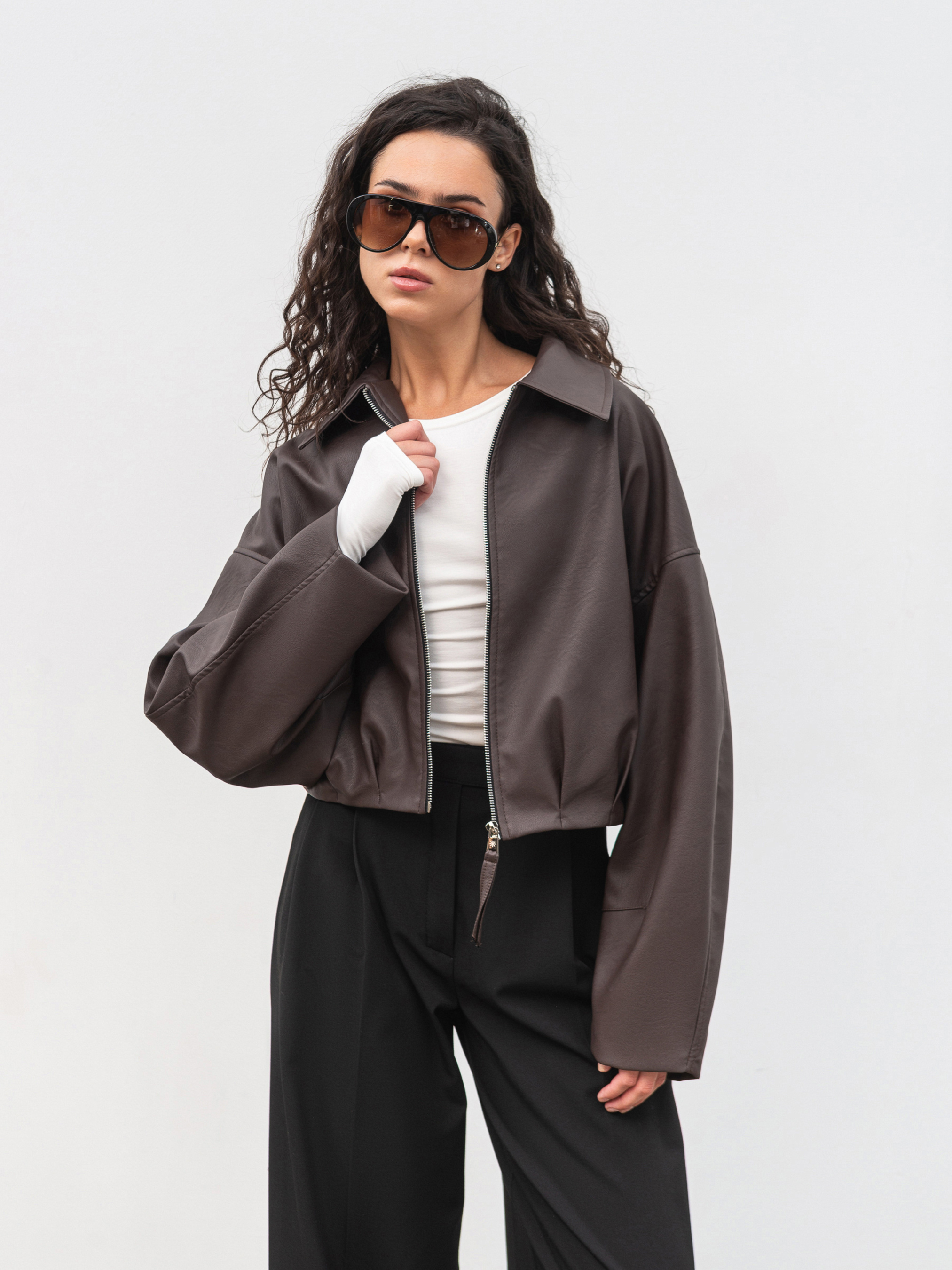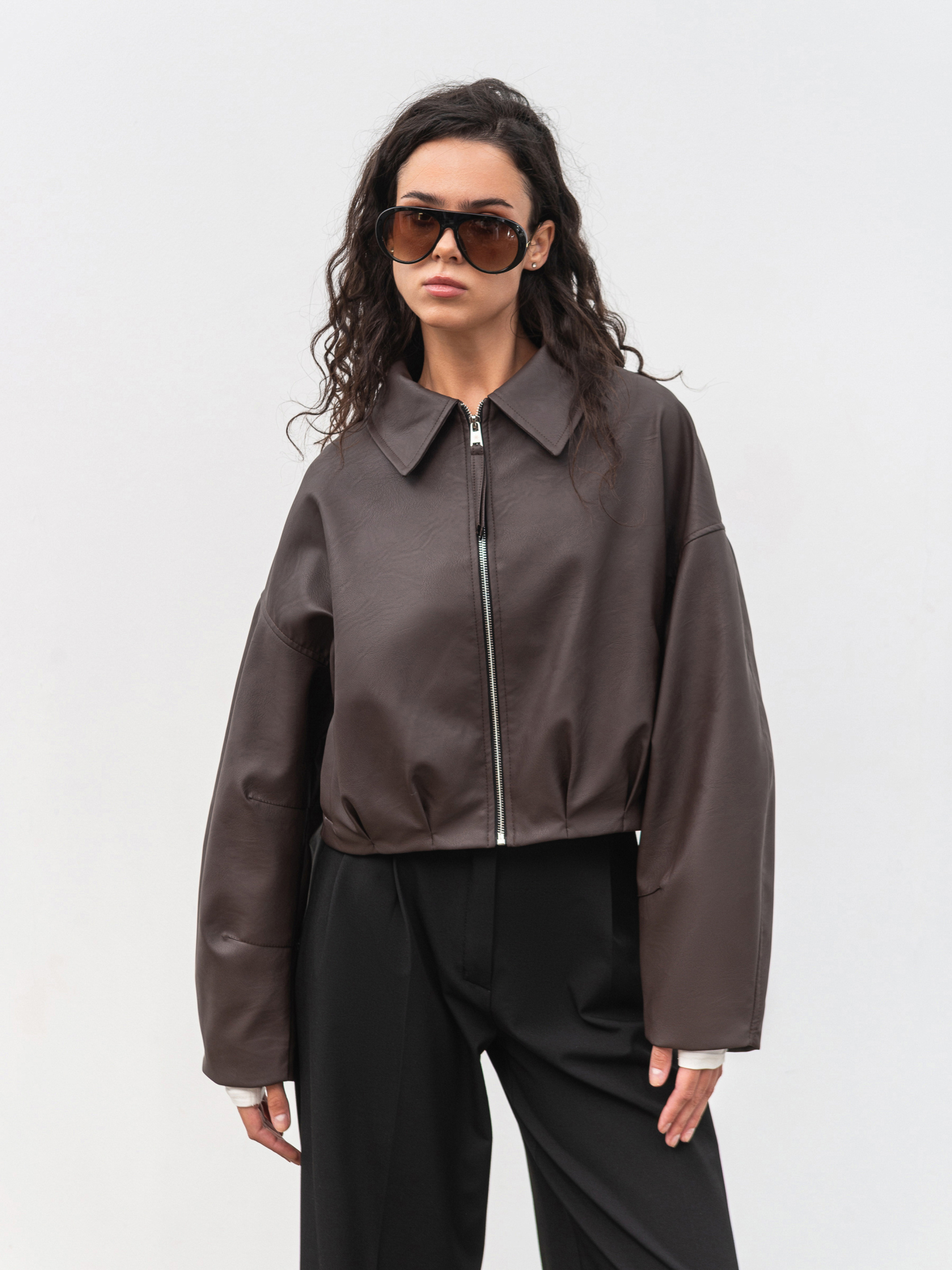 Стильный бомбер свободного кроя, выполненный из фактурного материала под кожу. Легкая матовая поверхность придает изделию современный вид, а свободные рукава со швами создают трендовый объем. Внизу модели декоративные складки, подчеркивающие силуэт. Бомбер имеет удобные карманы и подкладку для комфорта при ношении. Подойдет для повседневных образов в переходный сезон. Доступные цвета: коричневый, черный. ХС-С Длина по спине: 50 см Длина рукава: 50 см Полуобхват груди: 53 см Полуобхват талии: 42 см Плечи: 58 см С-М Длина по спине: 50 см Длина рукава: 51 см Полуобхват груди: 55 см Полуобхват талии: 45 см Плечи: 60 см М-Л Длина по спине: 50 см Длина рукава: 50 см Полуобхват груди: 57 см Полуобхват талии: 47 см Плечи: 64 см
