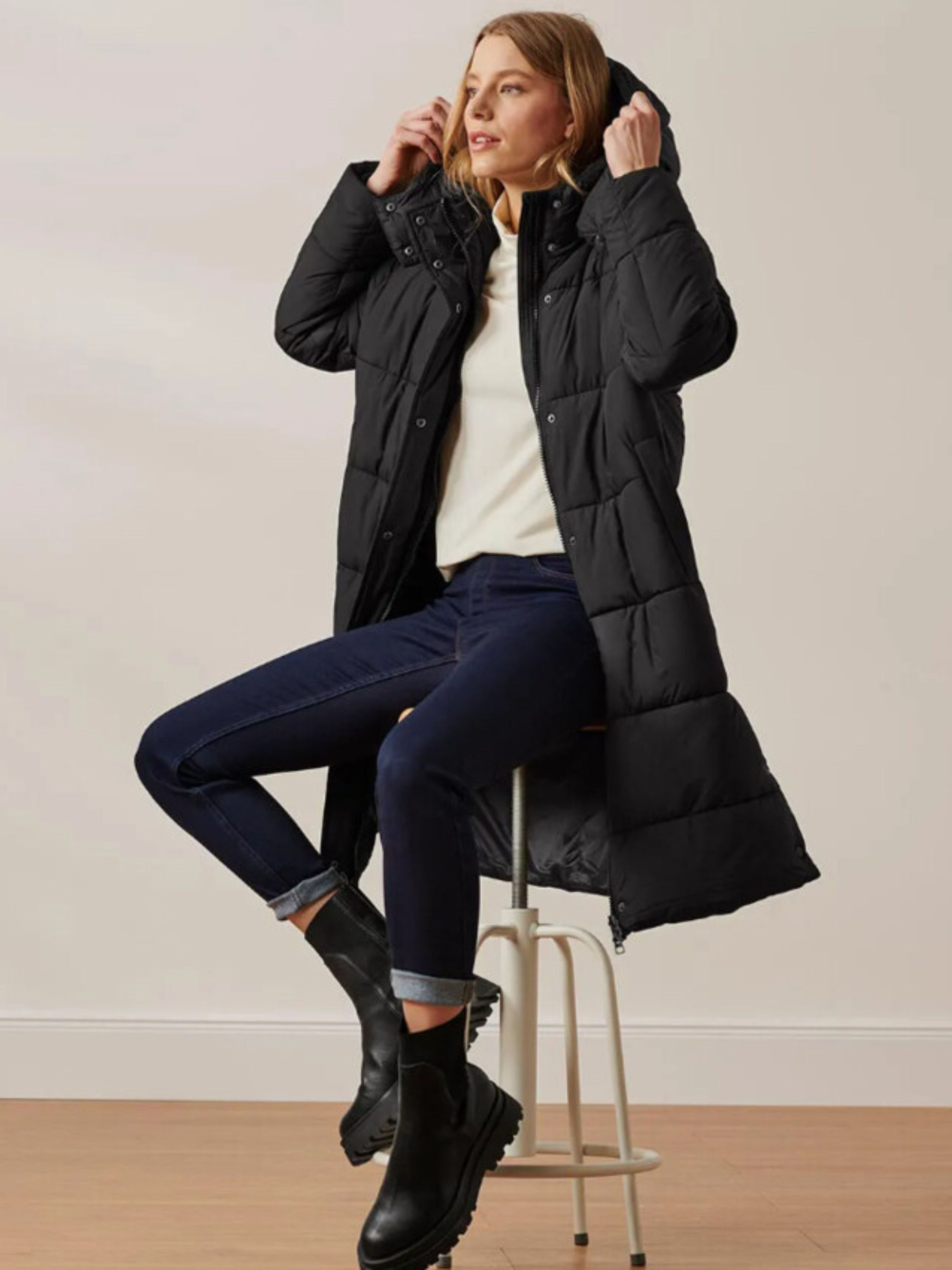 Практичная женская удлиненная куртка с мягкой теплой подкладкой – стильное и функциональное решение для холодного сезона. Она сочетает удобство, тепло и защиту от ветра, сохраняя при этом элегантный вид. Куртка имеет двустороннюю молнию спереди, прикрываемую ветрозащитной планкой с кнопками, чтобы холод не проникал внутрь. Капюшон со шнурком и фиксатором, а также воротник-стойка с мягкой трикотажной вставкой надежно защищают от ветра. Два боковых кармана на кнопках с мягкой подкладкой обеспечивают комфорт для рук в холодную погоду. На рукавах – эластичные манжеты в рубчик, удерживающие тепло. Снизу куртку можно расширить с помощью кнопок, что придает удобство при движении. Легкая теплая подкладка из переработанного полиэстера делает куртку теплой, но не громоздкой. Модель имеет светоотражающие детали безопасности и протестирована внешними аккредитованными институтами на содержание вредных веществ. Цвет: черный Посадка: регулярная Материал: Наружный слой и подкладка - 100% полиэстер Наполнитель - 100% полиэстер (переработанный) Ребра - 98% полиэстер, 2% эластан Размеры: 38 (европейский) / 46 (украинский) ПОГ – 56 см Полуобхват бедер - 60 см Длина рукава - 64 см. Длина – 100 см Плечи - 40 см 40 (европейский) / 46–48 (украинский) ПОГ – 58 см Полуобхват бедер - 63 см Длина рукава - 64 см. Длина – 102 см Плечи - 41 см 42 (европейский) / 48 (украинский) ПОГ – 60 см Полуобхват бедер - 60 см Длина рукава - 63 см. Длина – 102 см Плечи - 42 см 44 (европейский) / 48-50 (украинский) ПОГ - 68 см Полуобхват бедер - 66 см Длина рукава - 64 см. Длина – 102 см Плечи - 43 см 46 (европейский) / 52 (украинский) ПОГ - 70 см Полуобхват бедер - 62 см Длина рукава - 64 см. Длина – 103 см Плечи - 44 см 48 (европейский) / 52-54 (украинский) ПОГ - 73 см Полуобхват бедер - 66 см Длина рукава – 65 см. Длина – 104 см Плечи - 45 см Одежда бренда Tchibo обычно не имеет бумажных этикеток. В большинстве случаев внутренние бирки с составом ткани, названием бренда или размером срезаны частично или полностью.