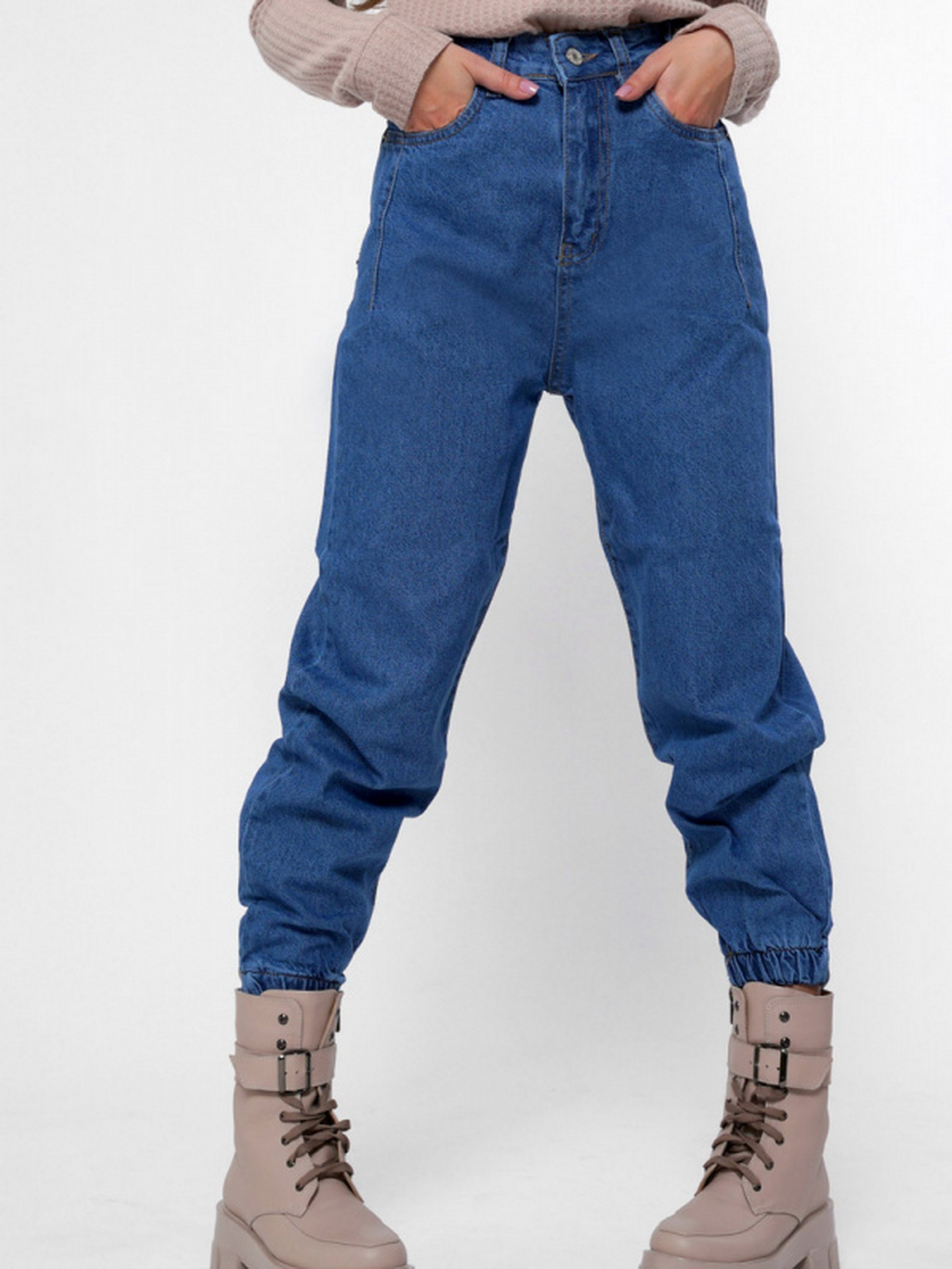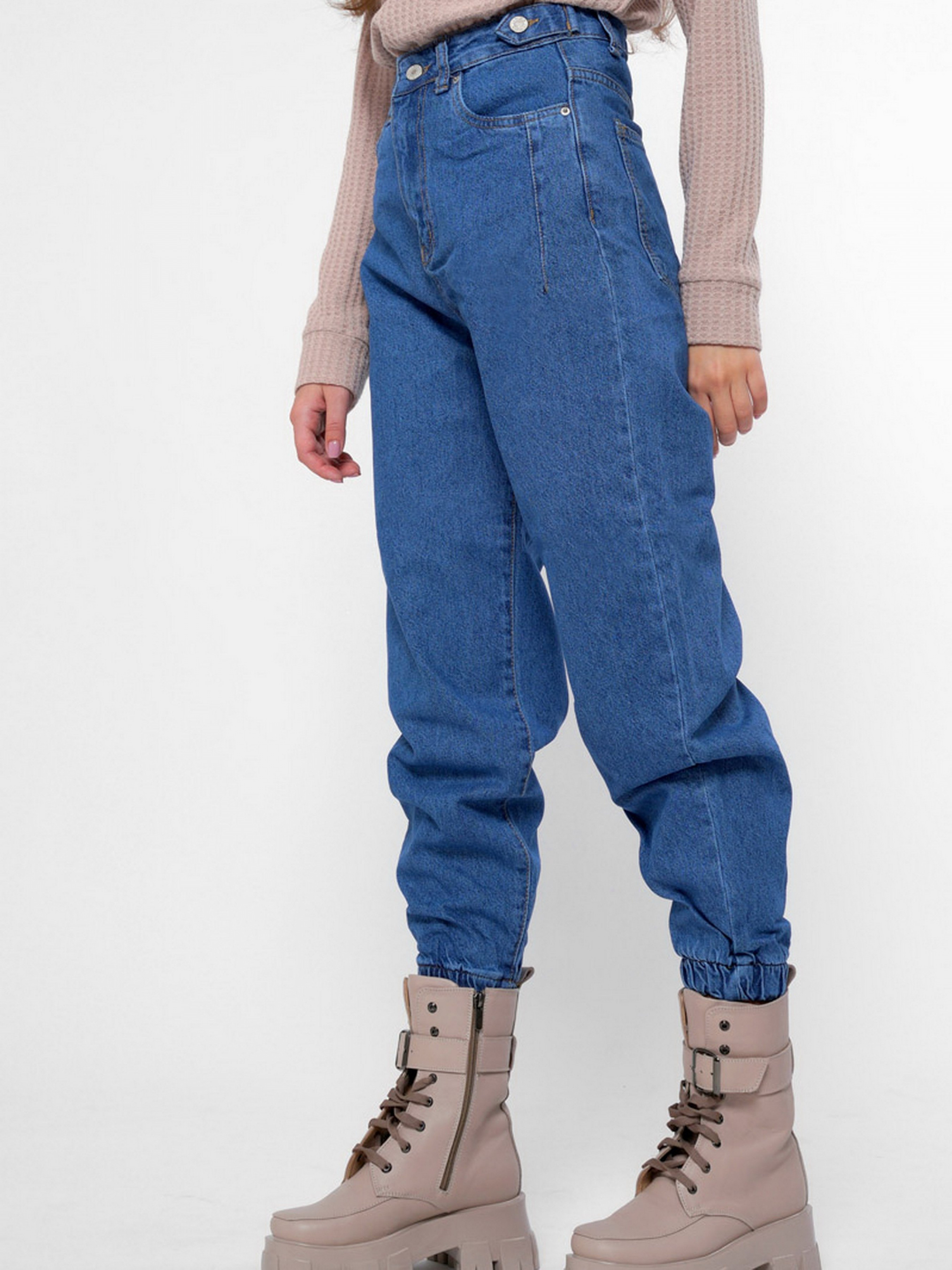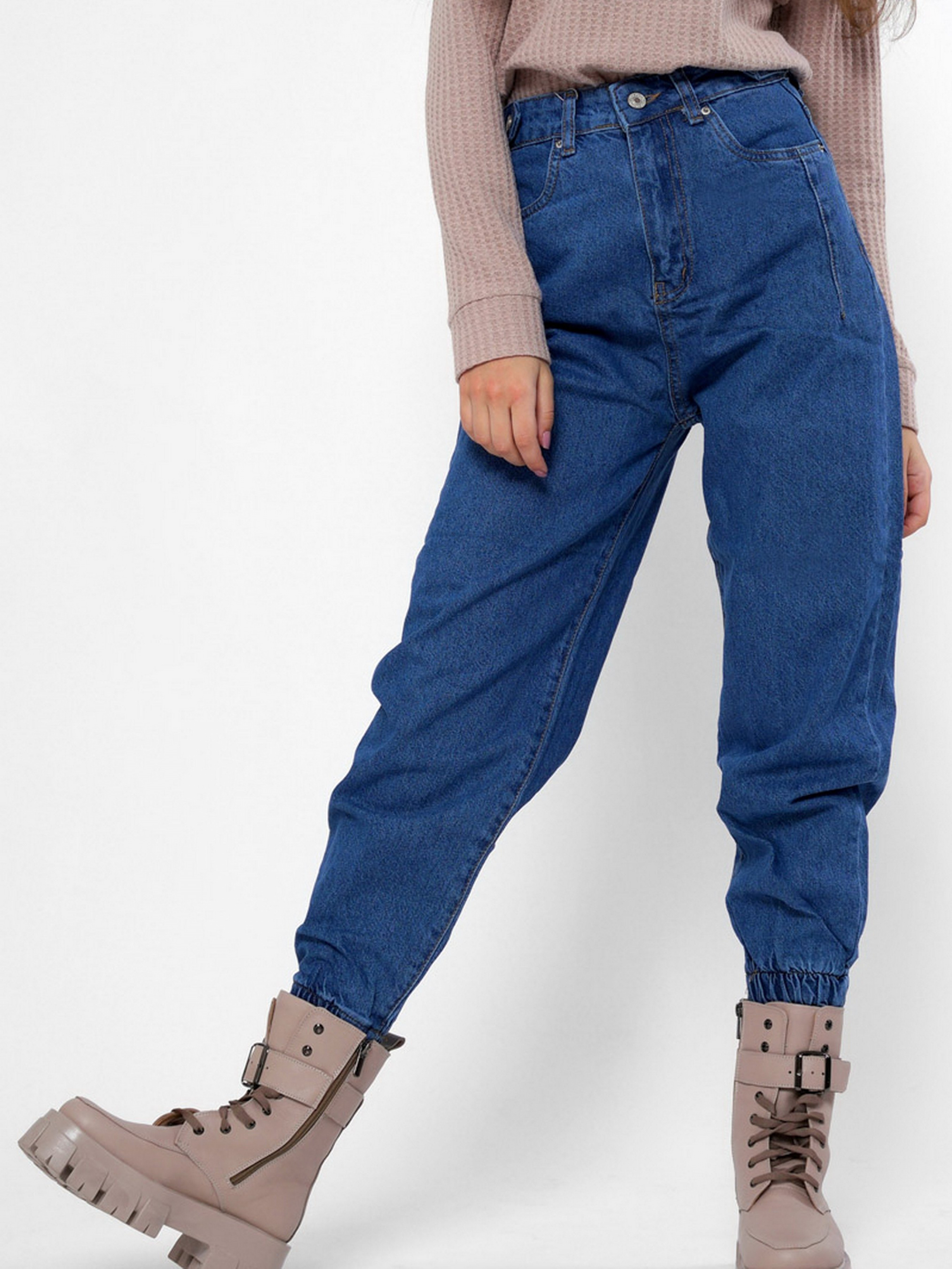 Стильные джинсы джоггеры. Модель имеет высокую посадку и слегка зауженный к низу крой. Включает 4 кармана: два накладных сзади, два прорезных спереди. На талии специальные петли шлевки; для пояса. По нижнему краю штанин эластичные резинки. Застежка на молнию и пуговицу.