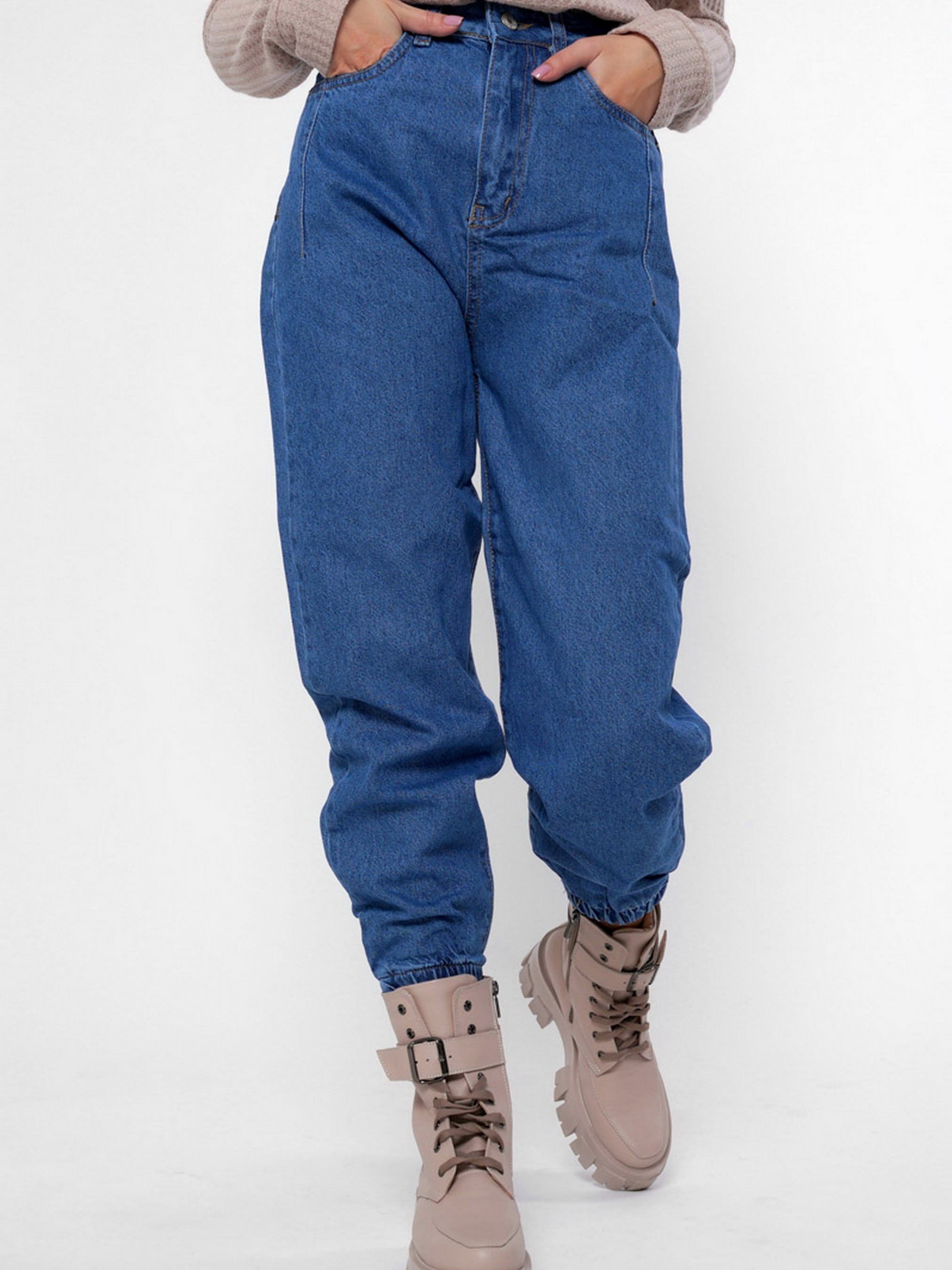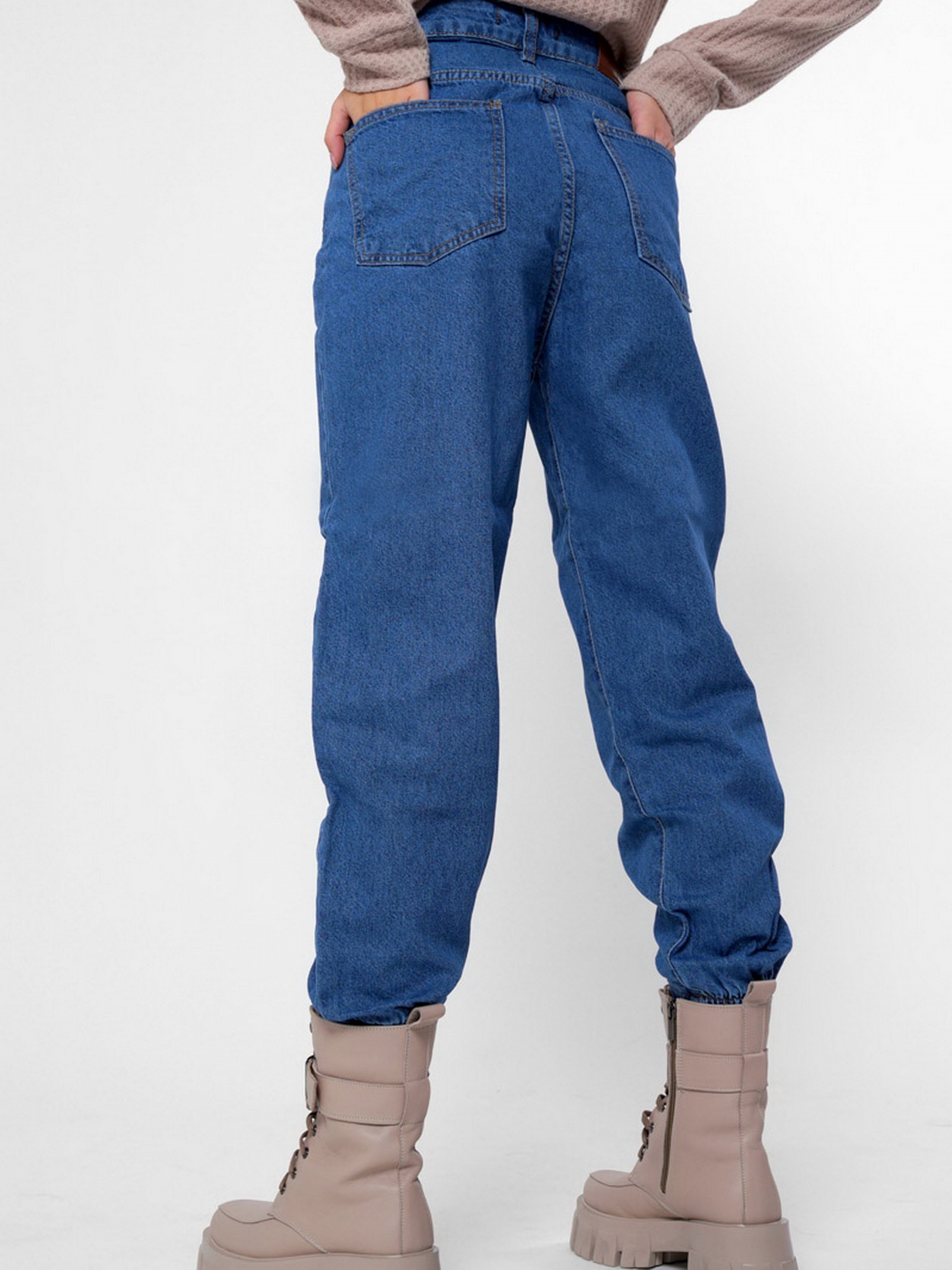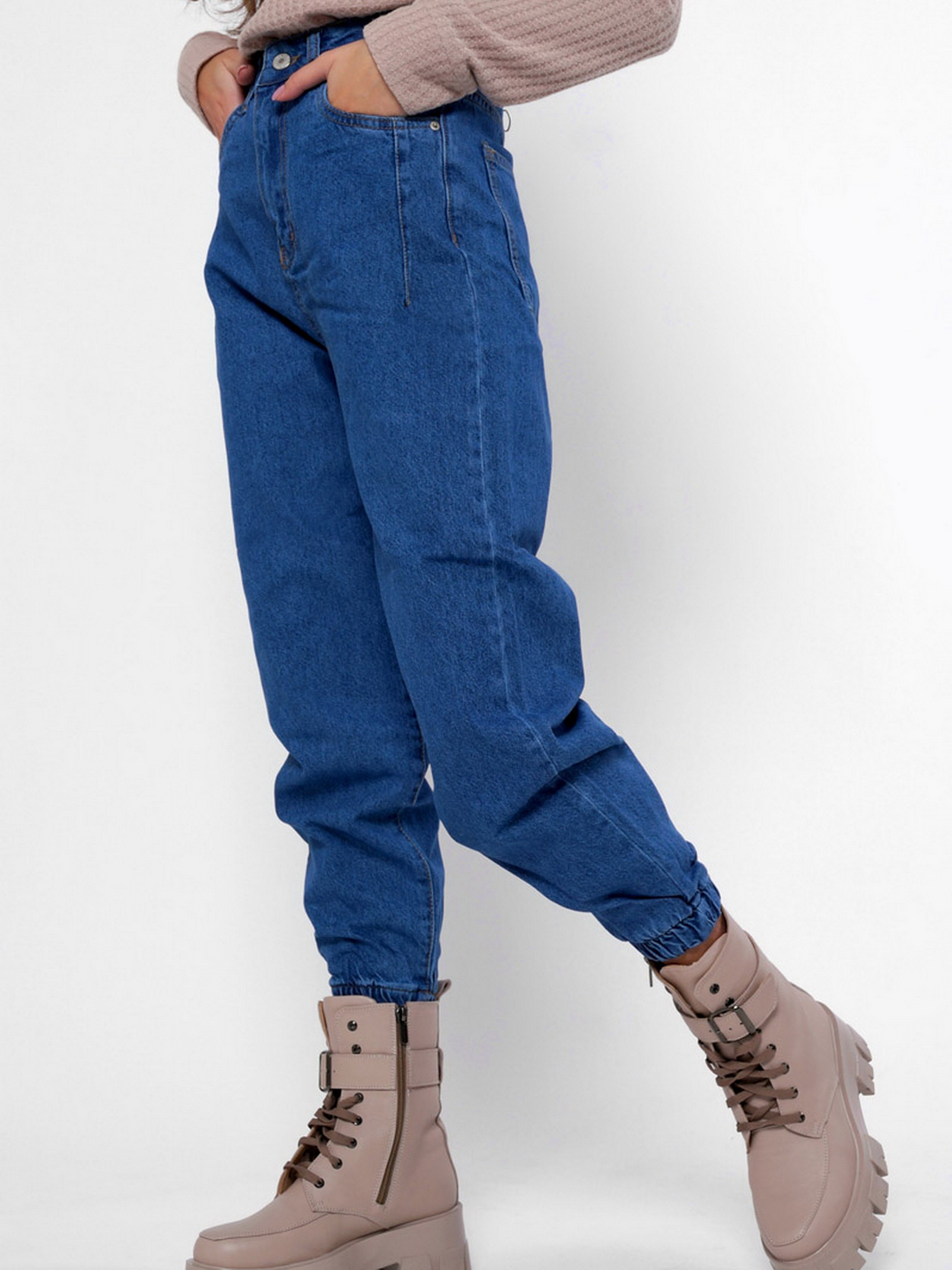 Стильные джинсы джоггеры. Модель имеет высокую посадку и слегка зауженный к низу крой. Включает 4 кармана: два накладных сзади, два прорезных спереди. На талии специальные петли шлевки; для пояса. По нижнему краю штанин эластичные резинки. Застежка на молнию и пуговицу.