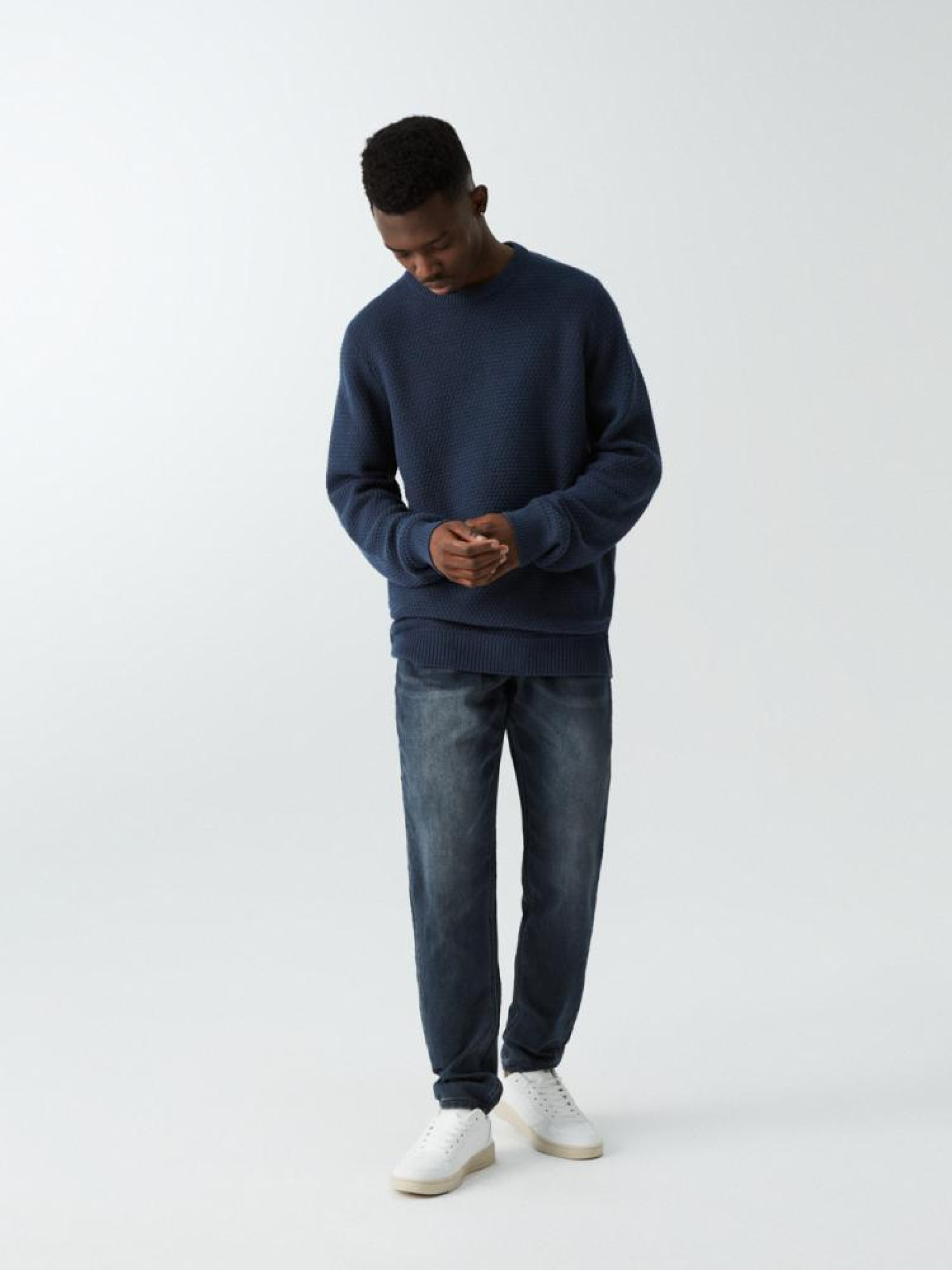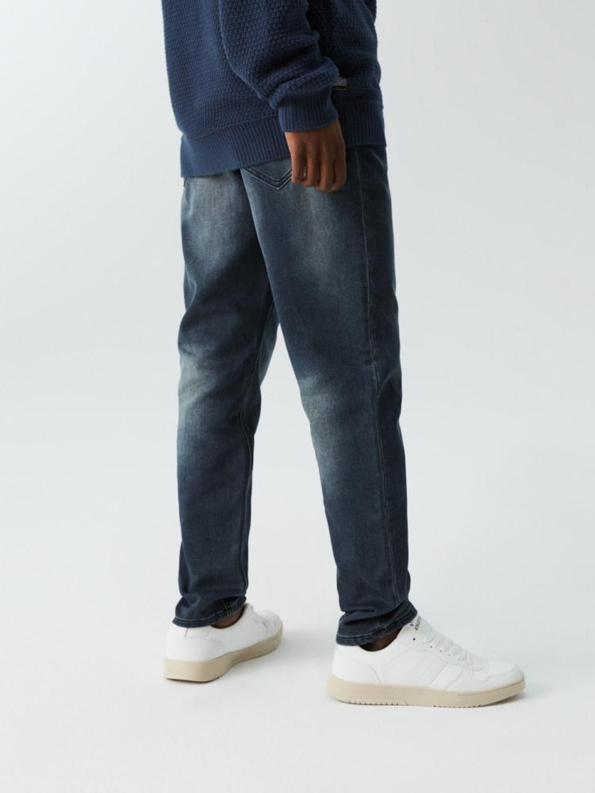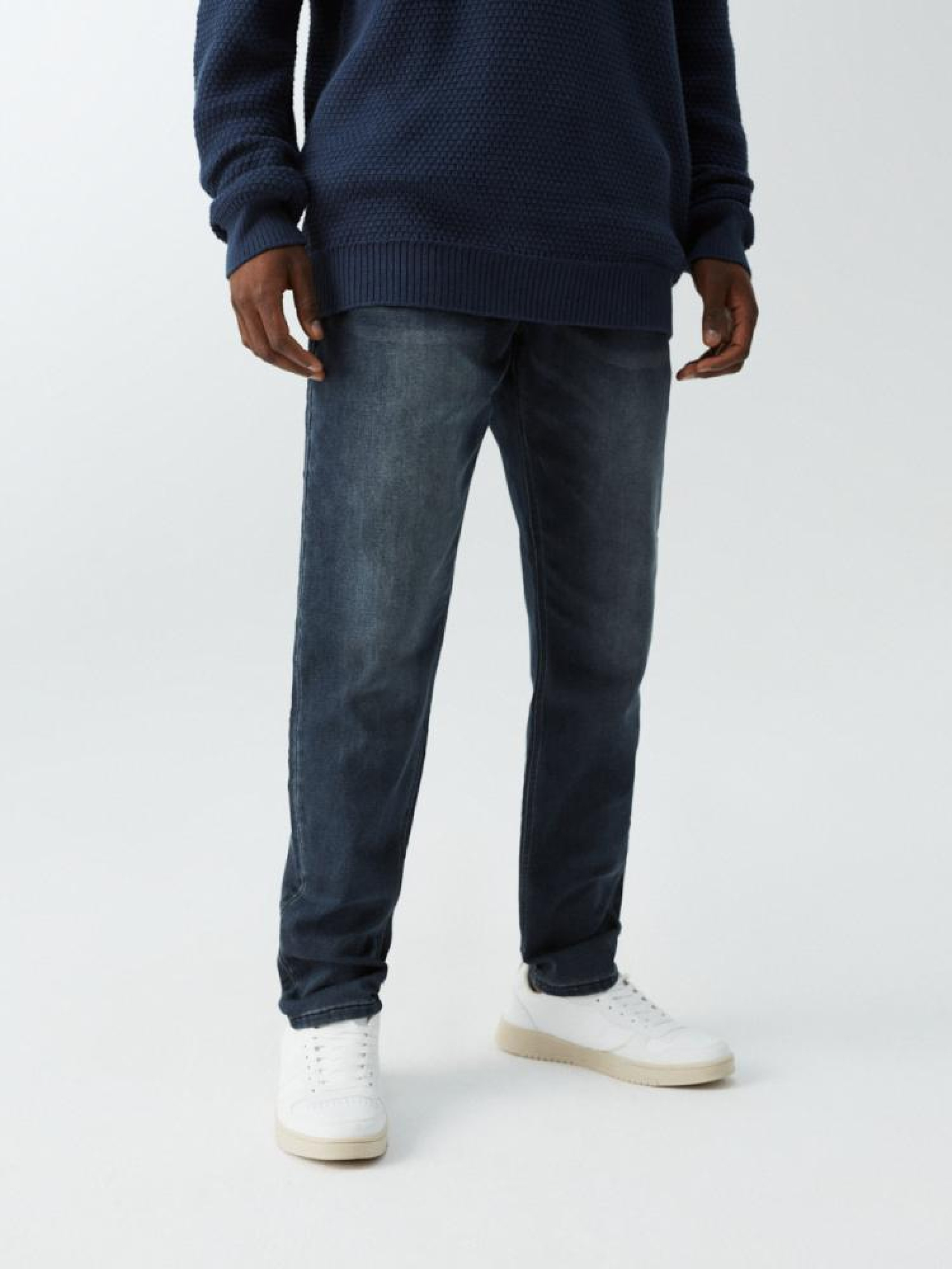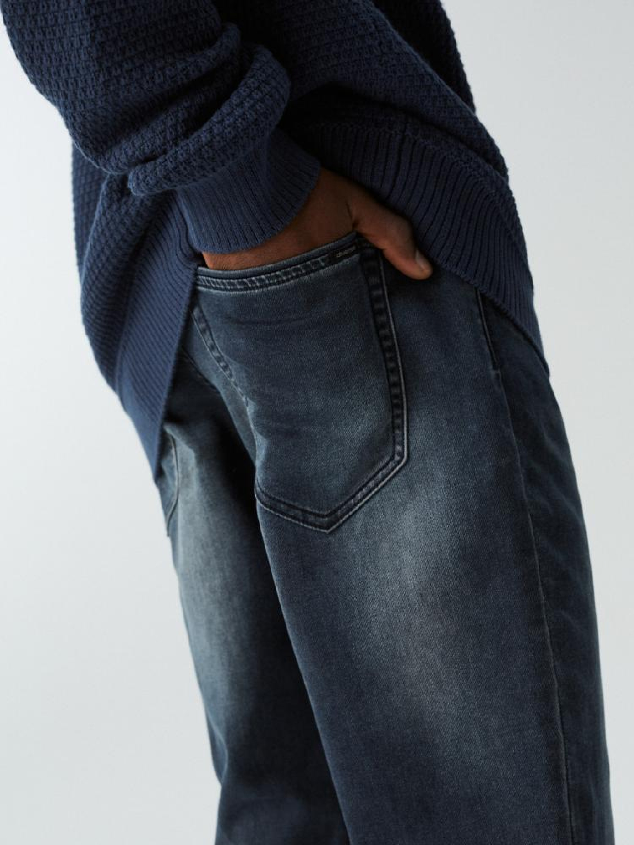 Мужские джинсовые штаны: - удобные, эластичные джинсы из ткани трикотаж деним, - приталенный крой с приталенными штанинами, - застегиваются на молнию и пуговицы, дополнительно завязываются на талии, - доступны в темно-синем цвете. Сезон: осень/зима. Состав: 54% хлопок, 44% полиэстер, 1% вискоза, 1% эластан. Уход: - стирка при максимуме 40 °С - не отбеливать - сушите при низкой температуре - гладить максимум при темп. 150°С - не химчистка Размер на модели – L Рост модели – 182 см