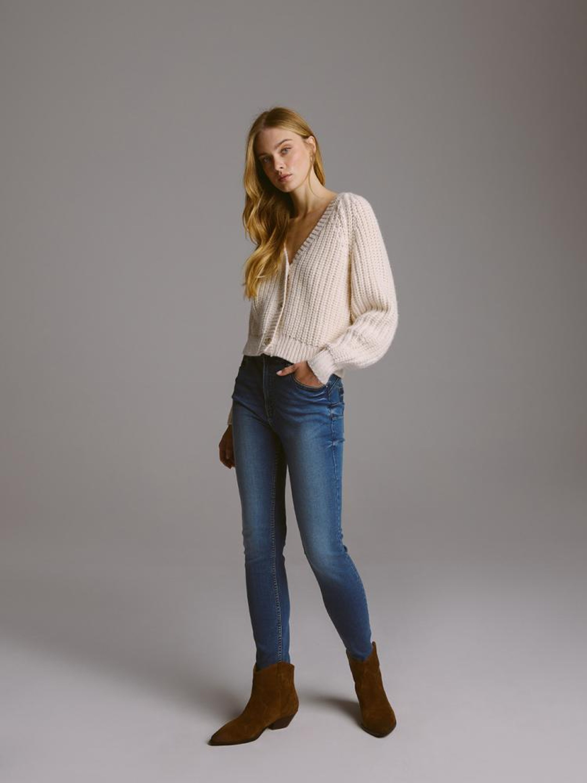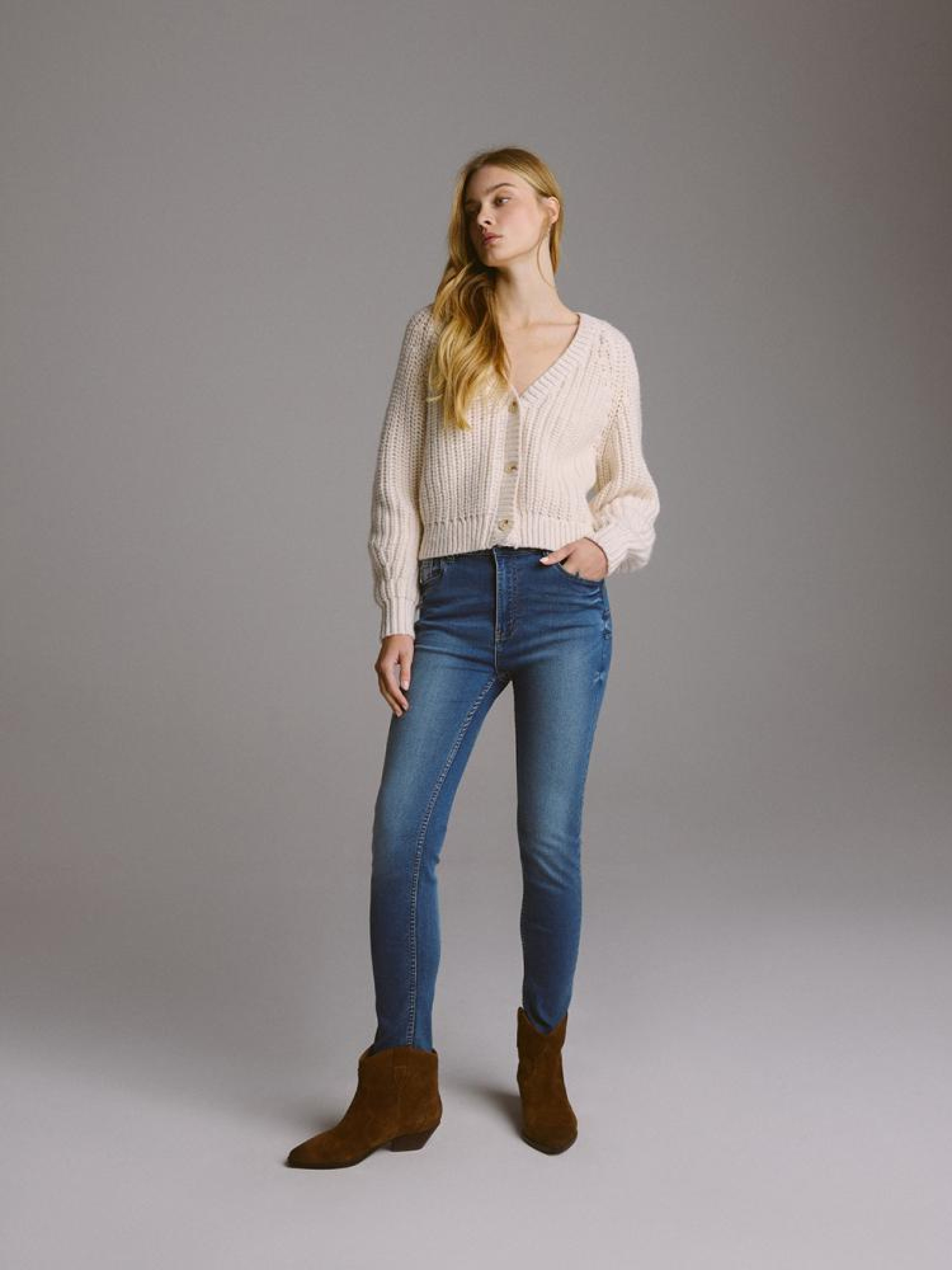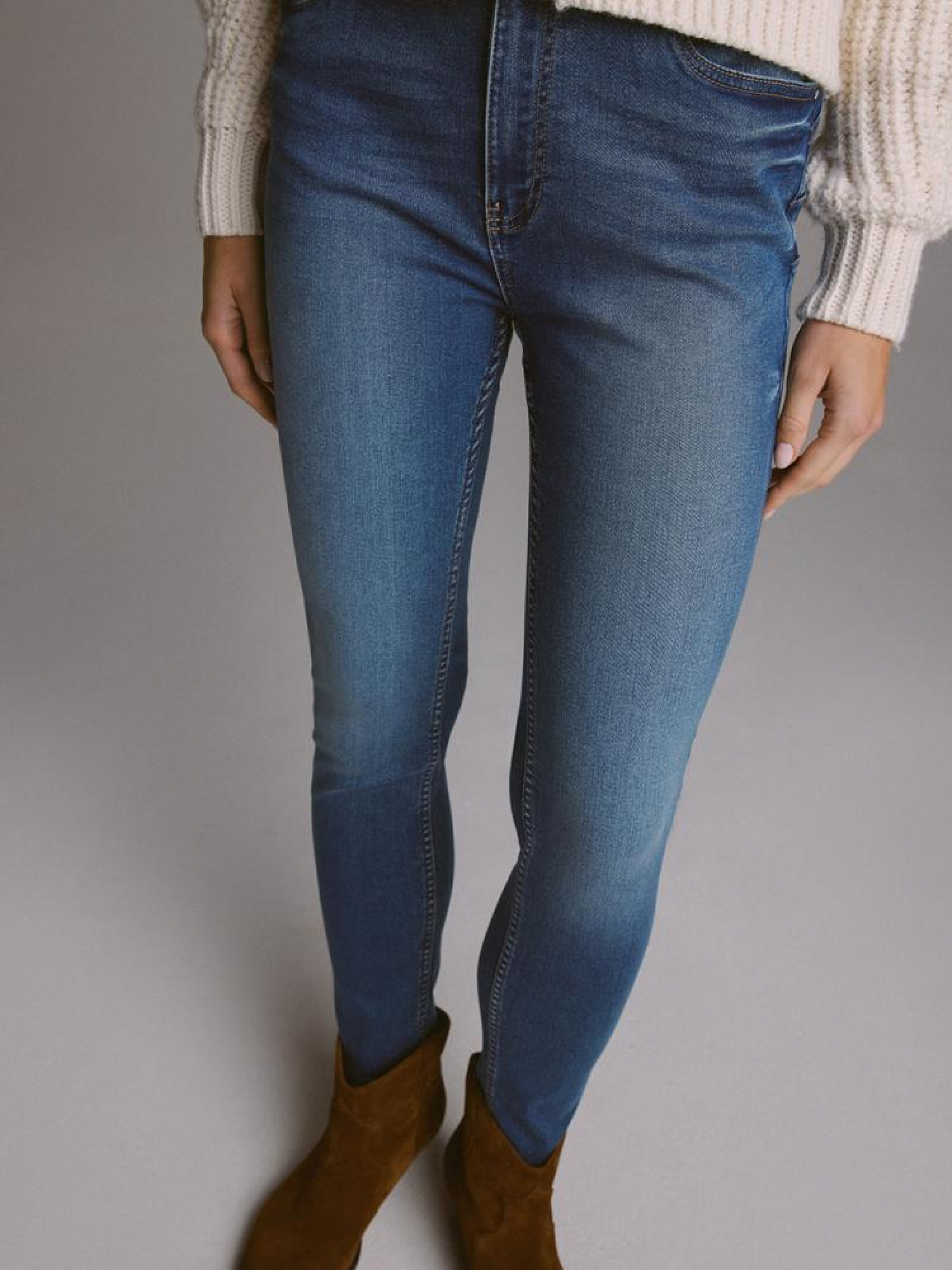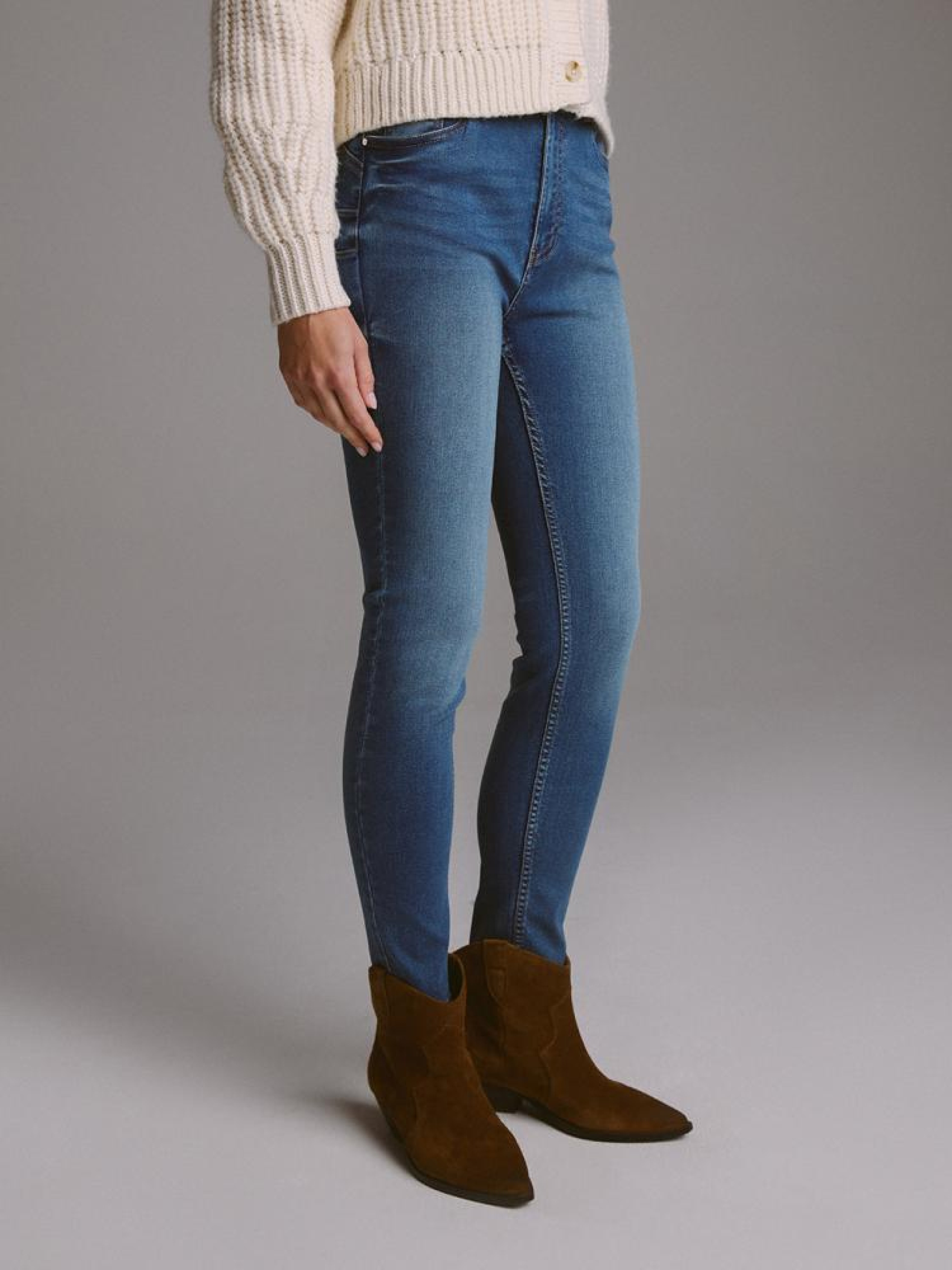 Джинсы POLENA II 10045283 Узкие джинсовые брюки из эластичного денима: - средняя талия, - узкие штанины, длина до щиколотки, - задняя форма изделия визуально выделяет попу, - пять карманов для удобства, - серебристые детали, - доступны в темно-синем цвете. Сезон: осень/зима 2024 Состав: 74% хлопок 24% полиэстер 2% эластан Уход: - стирка при максимум 40 °С - не отбеливать - сушить при низкой температуре - гладить максимум при темп. 150°С - не химчистка Размер на модели - 36 Рост модели - 179 см