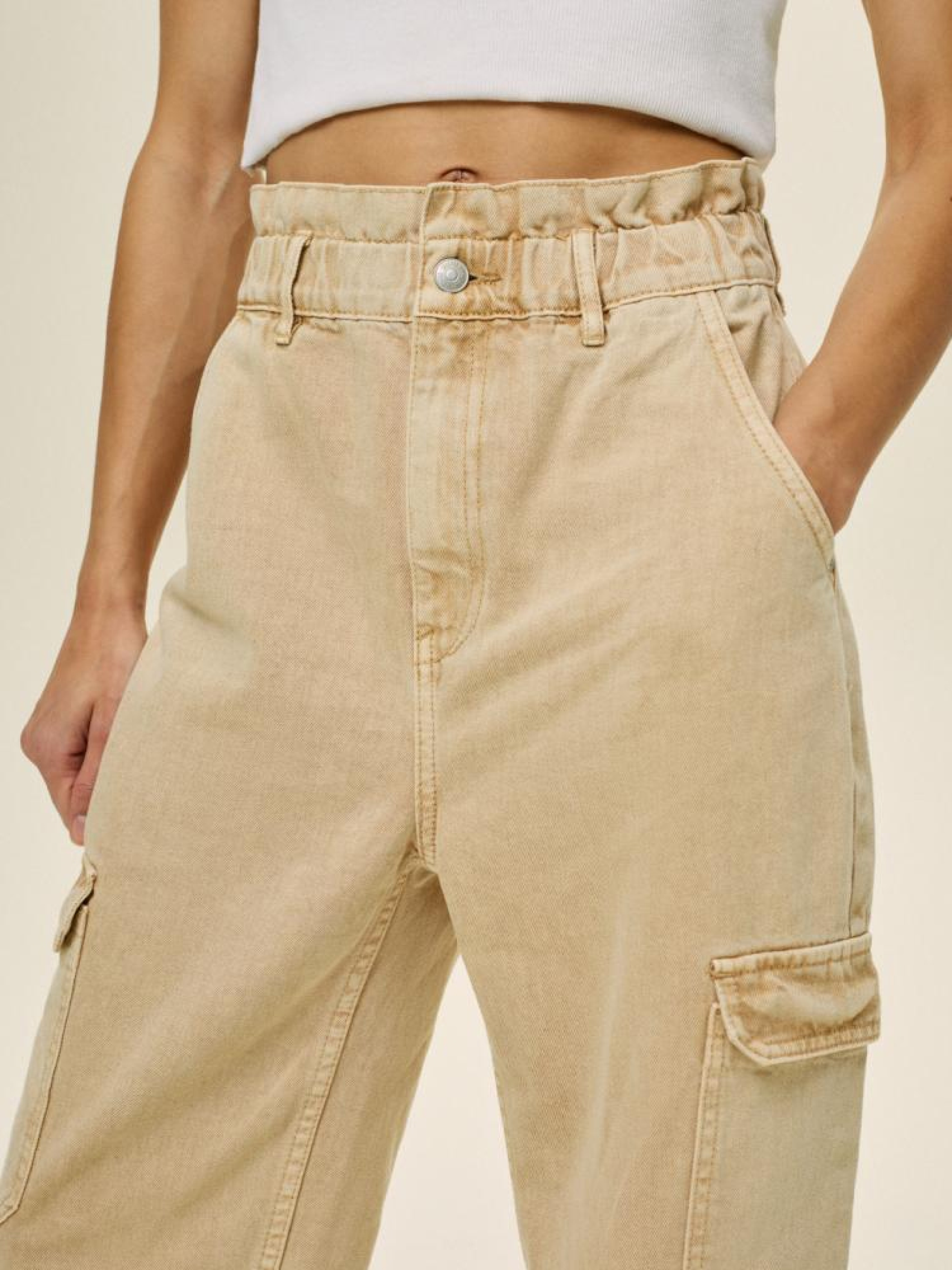 Брюки GABE 10044037 Женские хлопковые брюки карго: - из 100% хлопка, - высокая талия, - длина до щиколотки, - имеют 5 карманов, - застегиваются спереди на молнию и пуговицу. - в наличии в бежевом цвете. Сезон: Весна/Лето 2024 Уход: - стирка при максимум 40 °С - не отбеливать - сушить при низкой температуре - гладить максимум при темп. 150°С - не химчистка Размер на модели - 36 Рост модели - 167 см