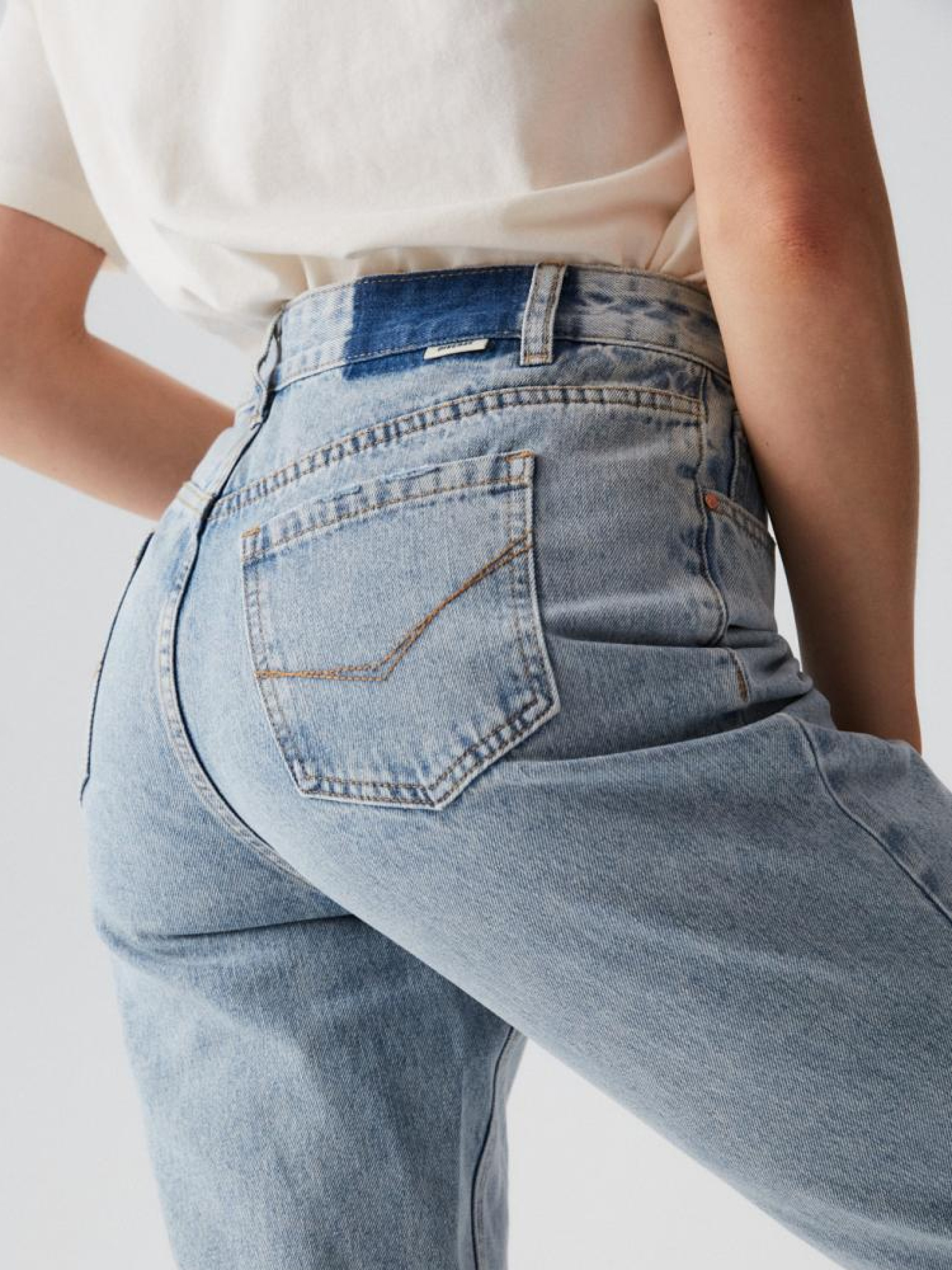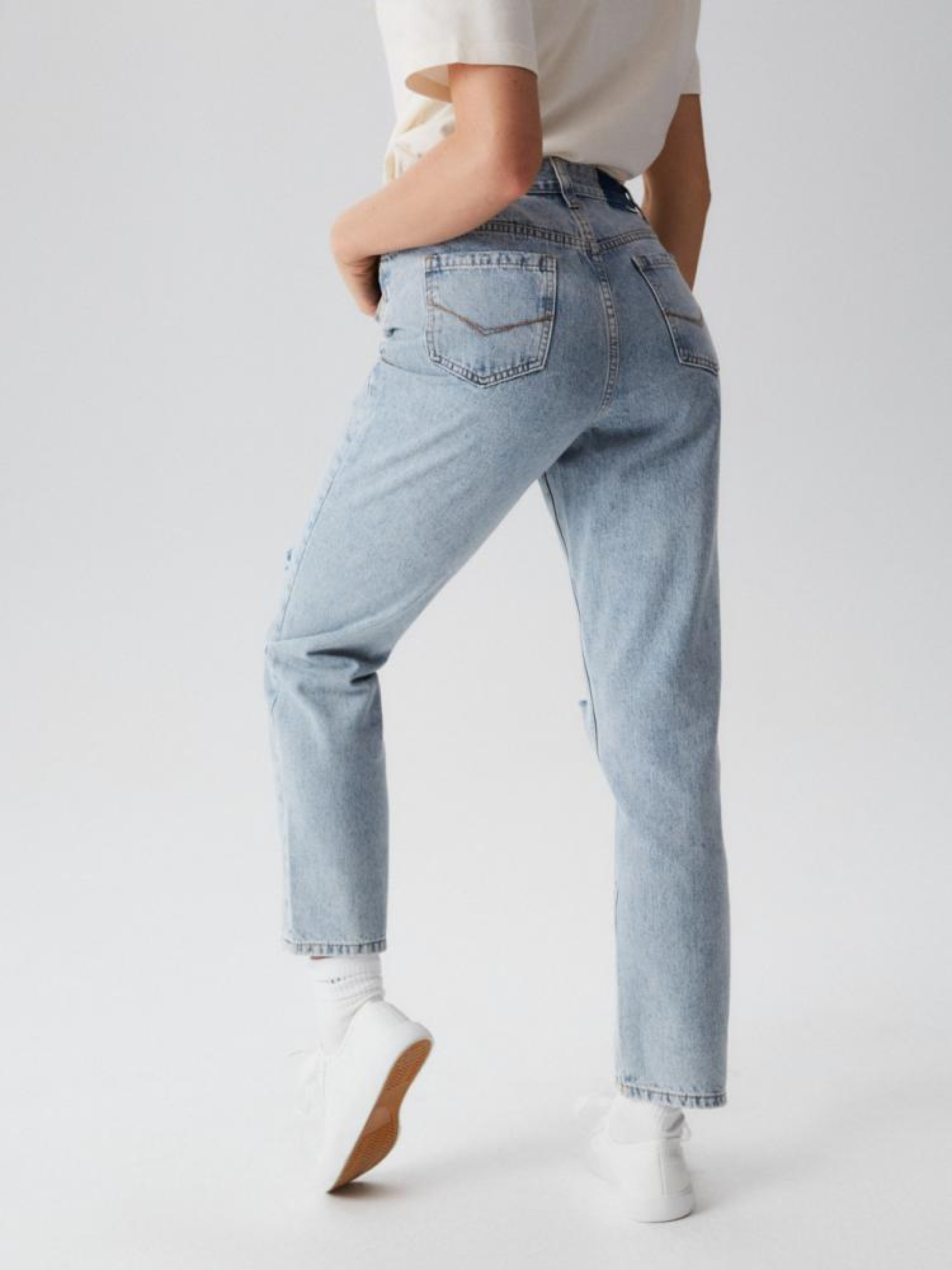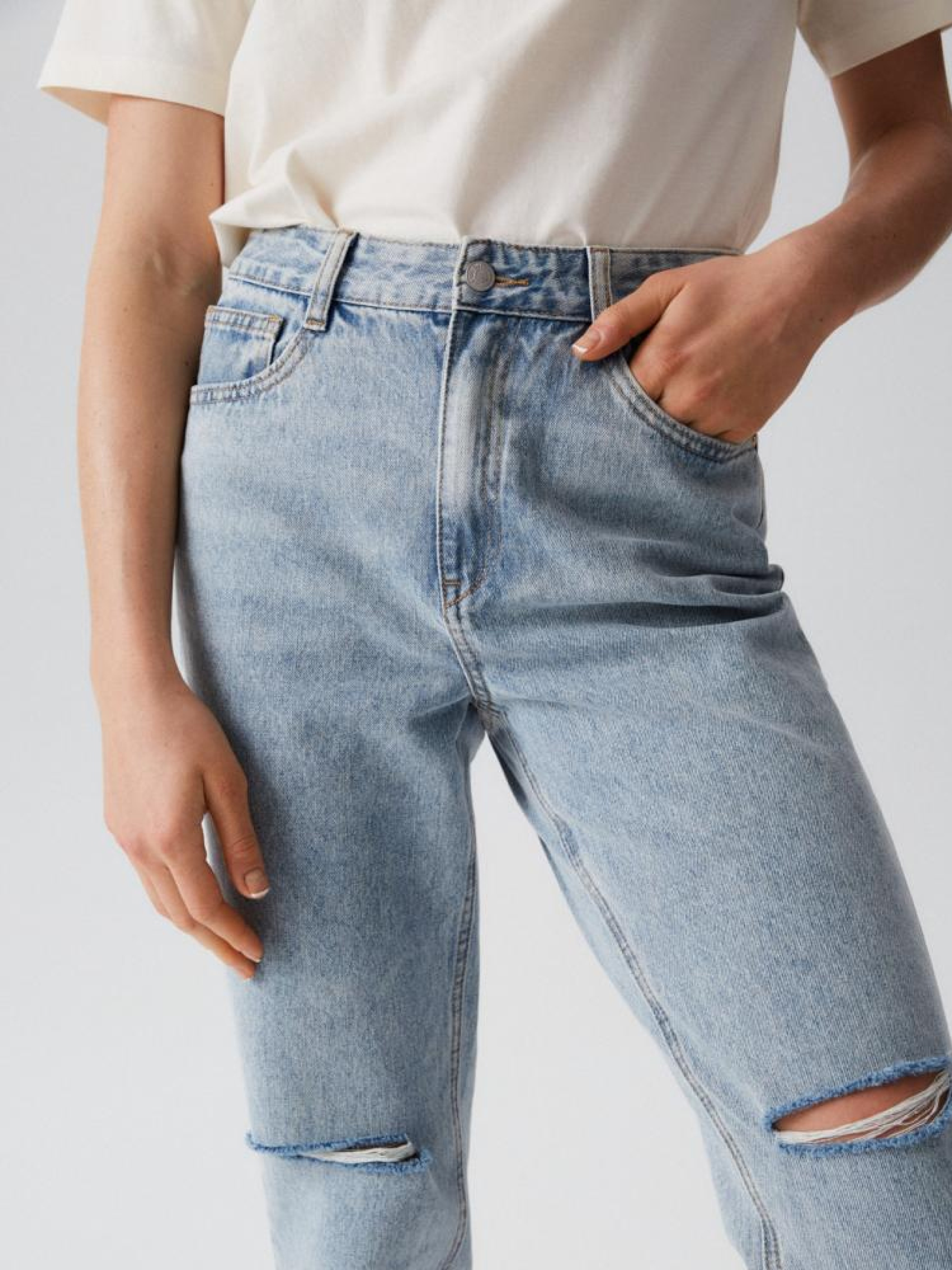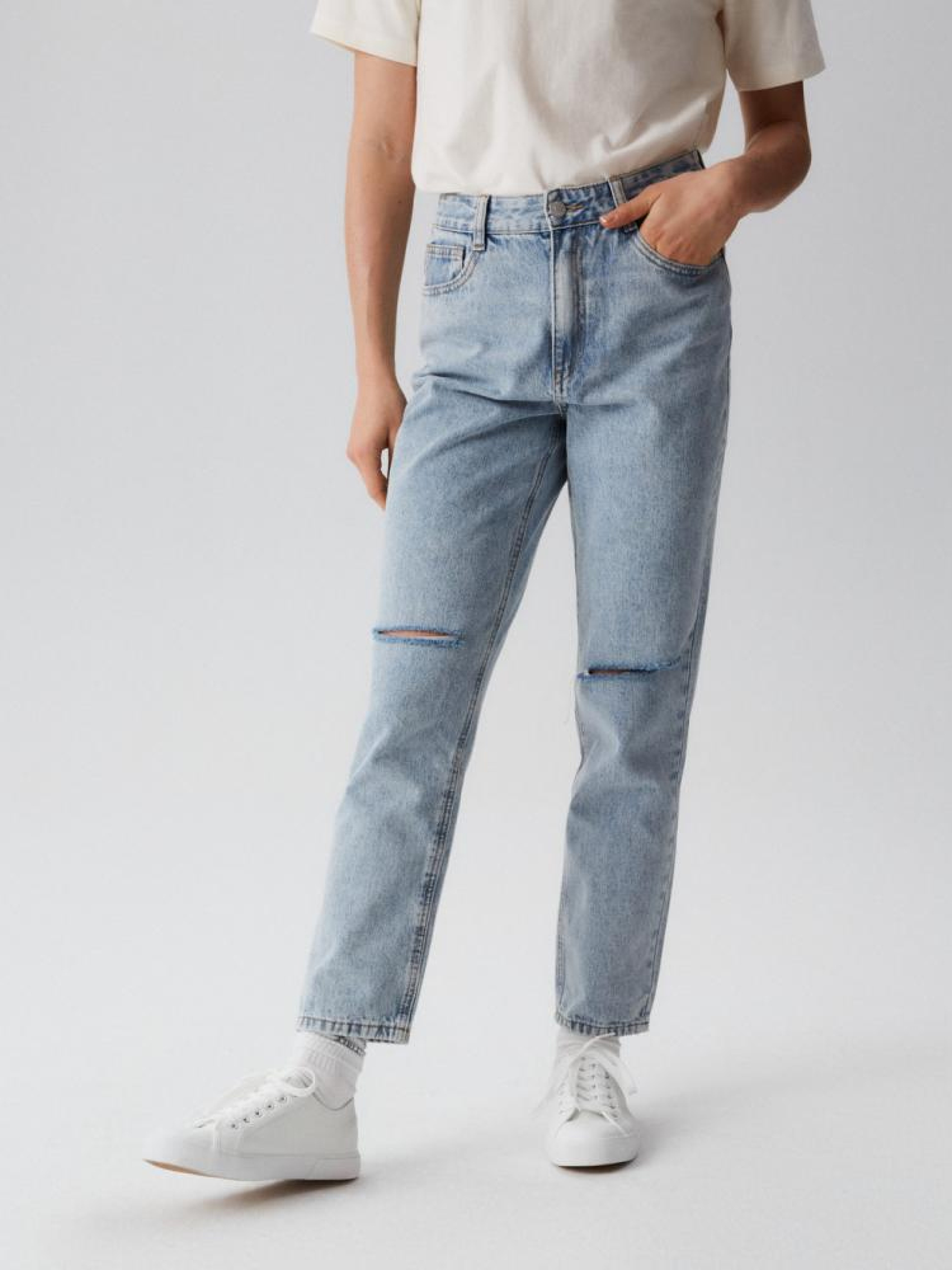 Джинсы с завышенной талией с потертостями: - прямого кроя, - из джинсовой ткани с хлопком, - с потертостями на коленях, - с прямыми штанинами, - с длиной до лодыжки, - доступны в светло-голубом цвете. Сезон: Весна/Лето Состав: 90% хлопок, 10% полиэстер. Уход: - стирка при максимум 40 °С - не отбеливать - сушите при низкой температуре - гладить максимум при темп. 150°С - не химчистка Размер на модели – 36 Рост модели – 174 см