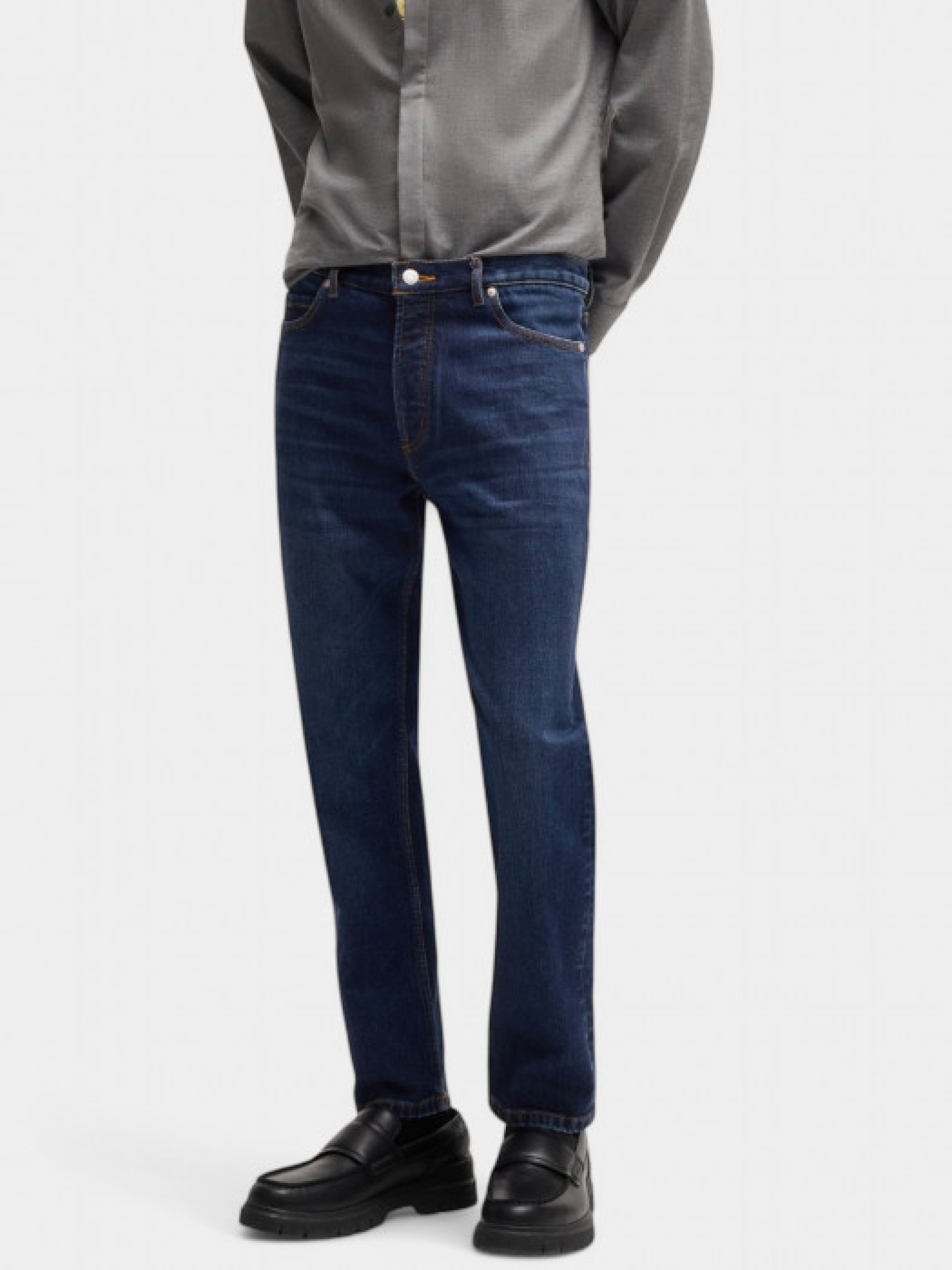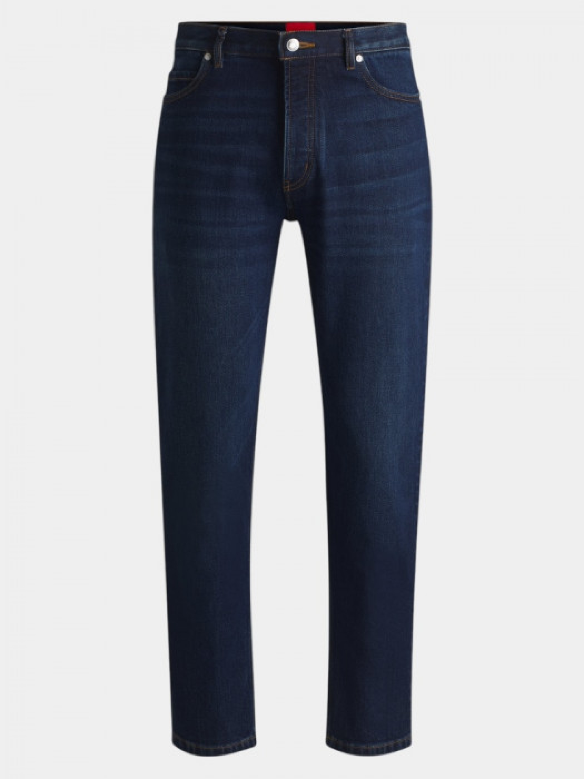 Джинсы зауженного кроя от Hugo Menswear со средней посадкой. Выполнены из темно-синего эластичного денима для комфорта. Оснащены застежкой на пуговицу и молнию, боковыми карманами спереди и накладными карманами сзади. Изготовлены из материала, полученного по принципам регенеративного земледелия, способствующего сохранению биоразнообразия, улучшению качества почвы и воды и уменьшению выбросов CO₂. Стандартная длина, ширина штанины внизу – 34 см.