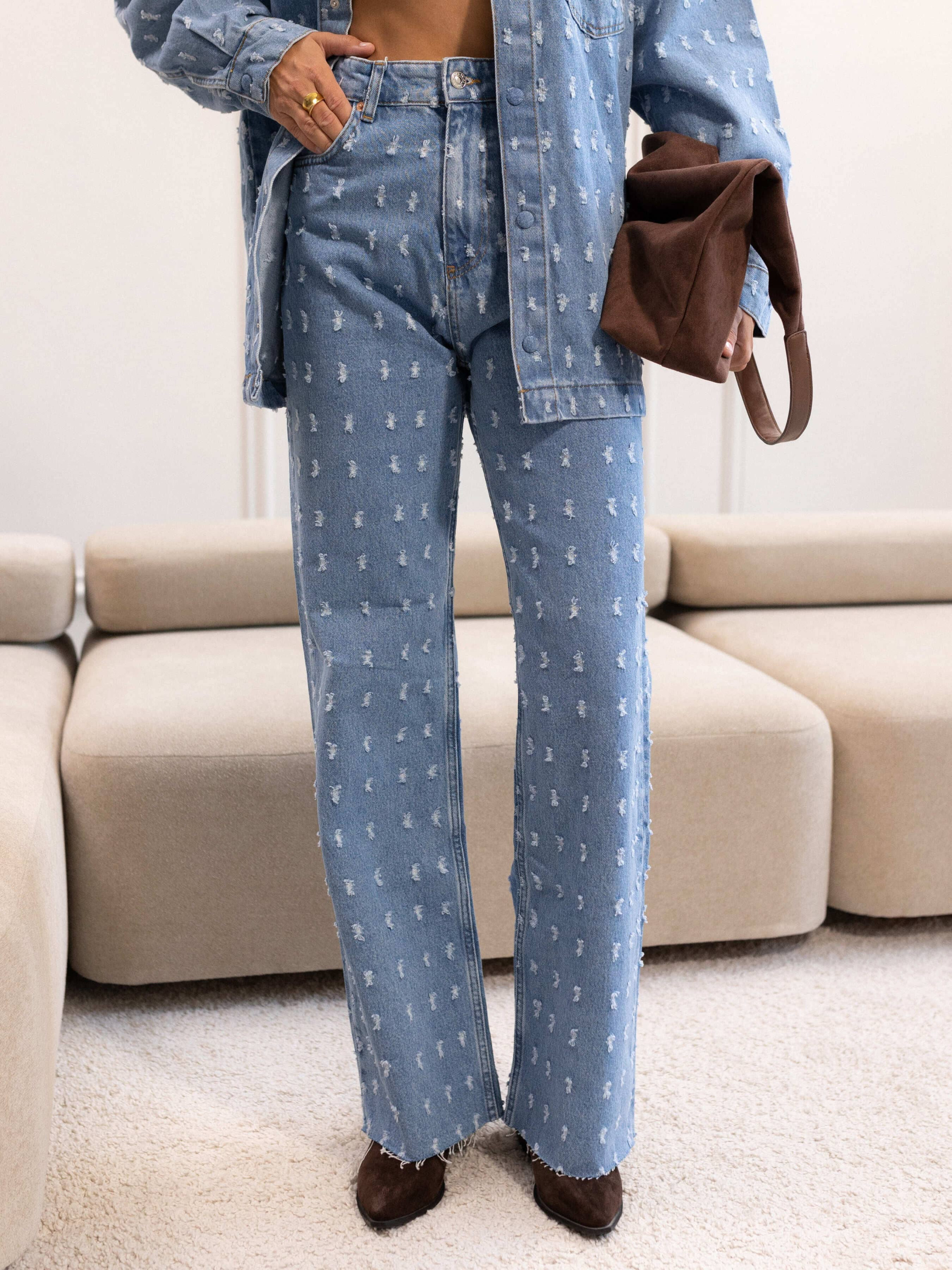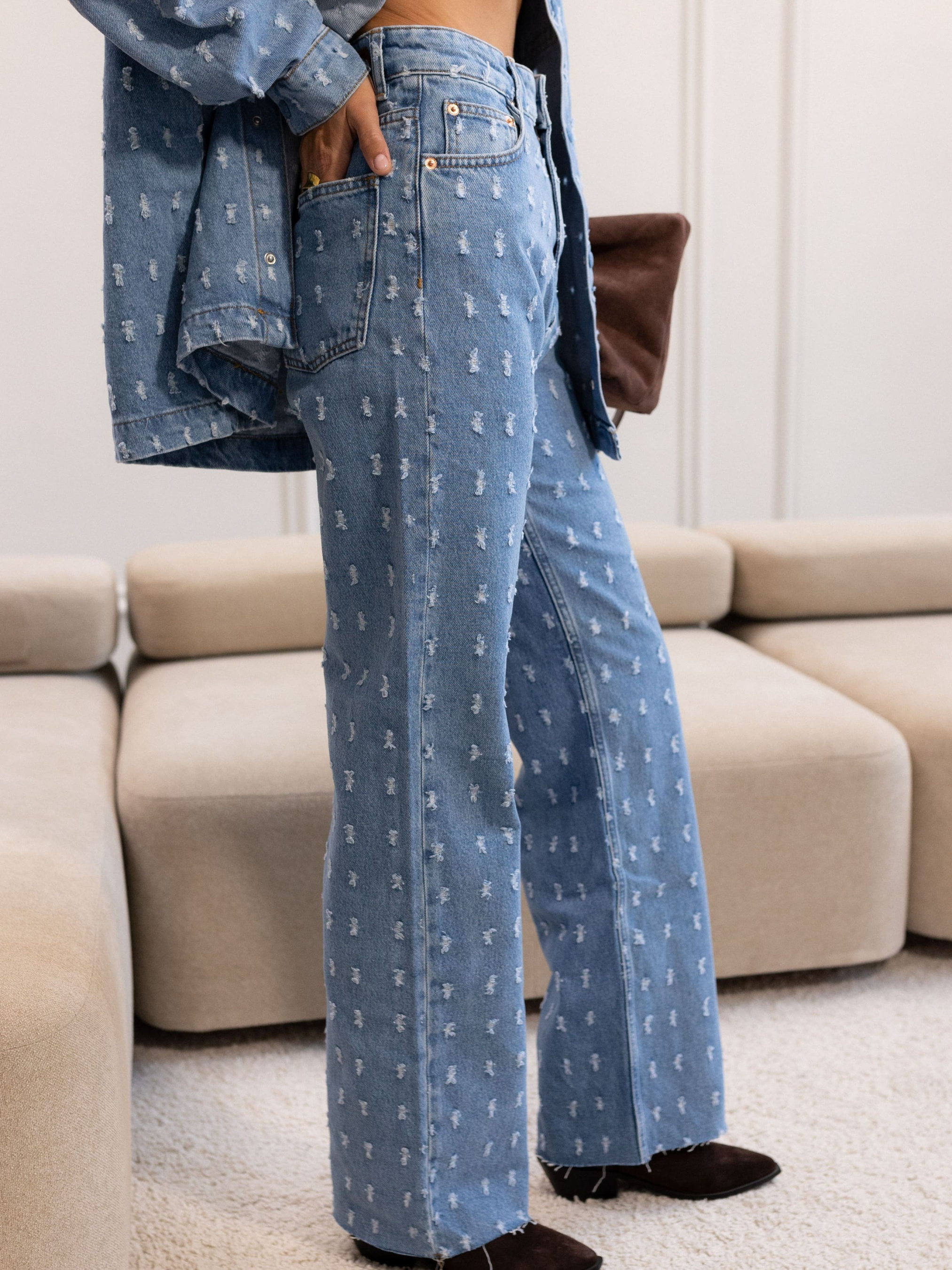 Джинсы Wide leg с потертостями – это стильный и модный вариант джинсов, которые характеризуются широкими брюками и эффектными потертостями на ткани. Потертости – это искусственно созданные дефекты на ткани, которые придают джинсам изношенный и стильный вид. Такие джинсы можно сочетать с разными верхами и обувью. Они прекрасно подходят как к простым футболкам или свитерам, так и к элегантным блузкам или жакетам. параметры модели 95-62-93/175см. размер на модели 36 Замеры изделия: 34: Полуобхват талии – 31 см; Полуобхват бедер – 44 см; Длина – 118 см; Высота посадки – 33 см. 36: Полуобхват талии – 32 см; Полуобхват бедер – 48 см; Длина – 116 см; Высота посадки – 33 см. 38: Полуобхват талии – 34 см; Полуобхват бедер – 51 см; Длина – 120 см; Высота посадки – 35 см. 40: Полуобхват талии – 35 см; Полуобхват бедер – 54 см; Длина – 119 см; Высота посадки – 35 см. 42: Полуобхват талии – 38 см; Полуобхват бедер – 57 см; Длина – 120 см; Высота посадки – 35 см. Материал и уход: Котон 100%.