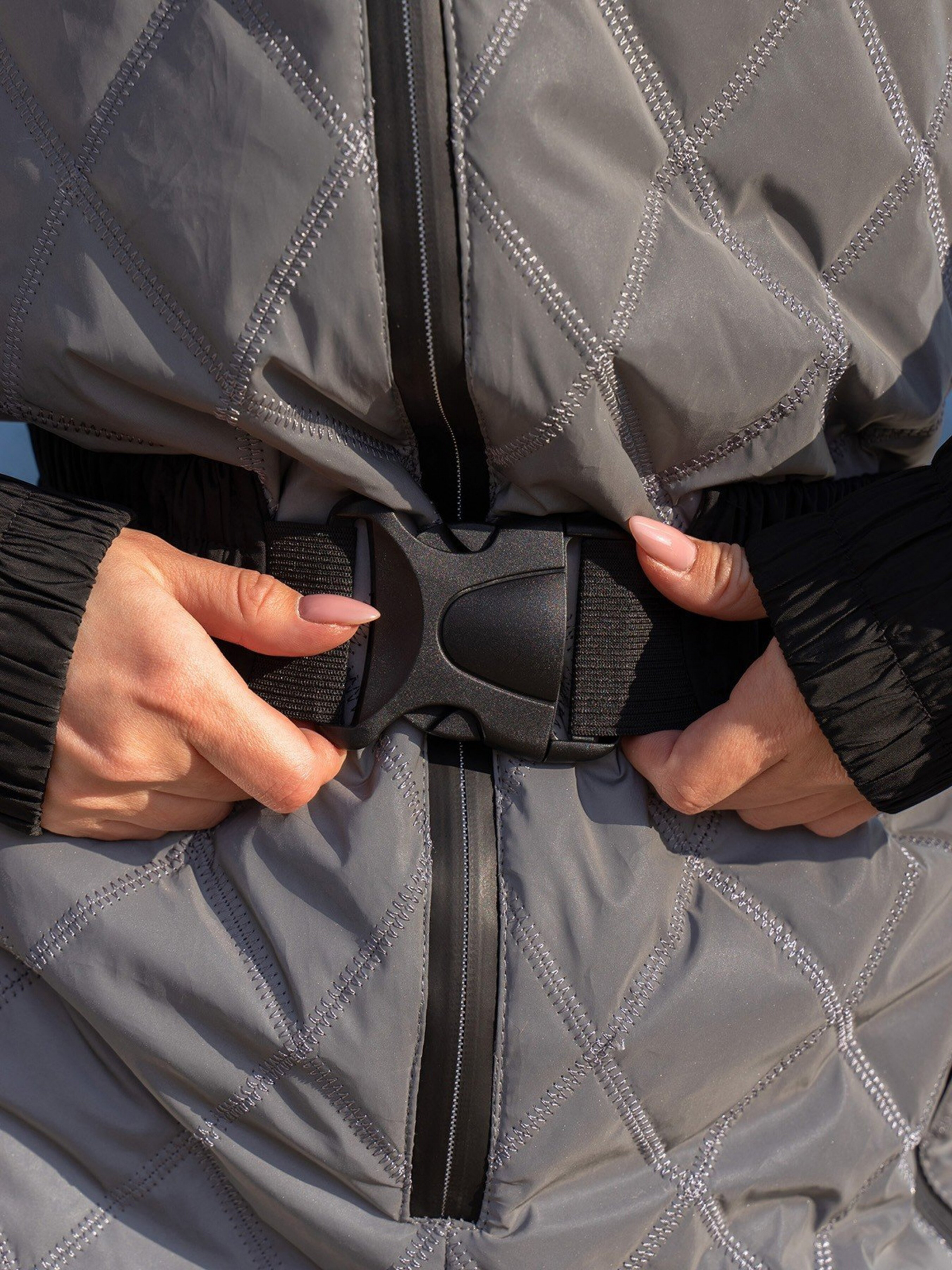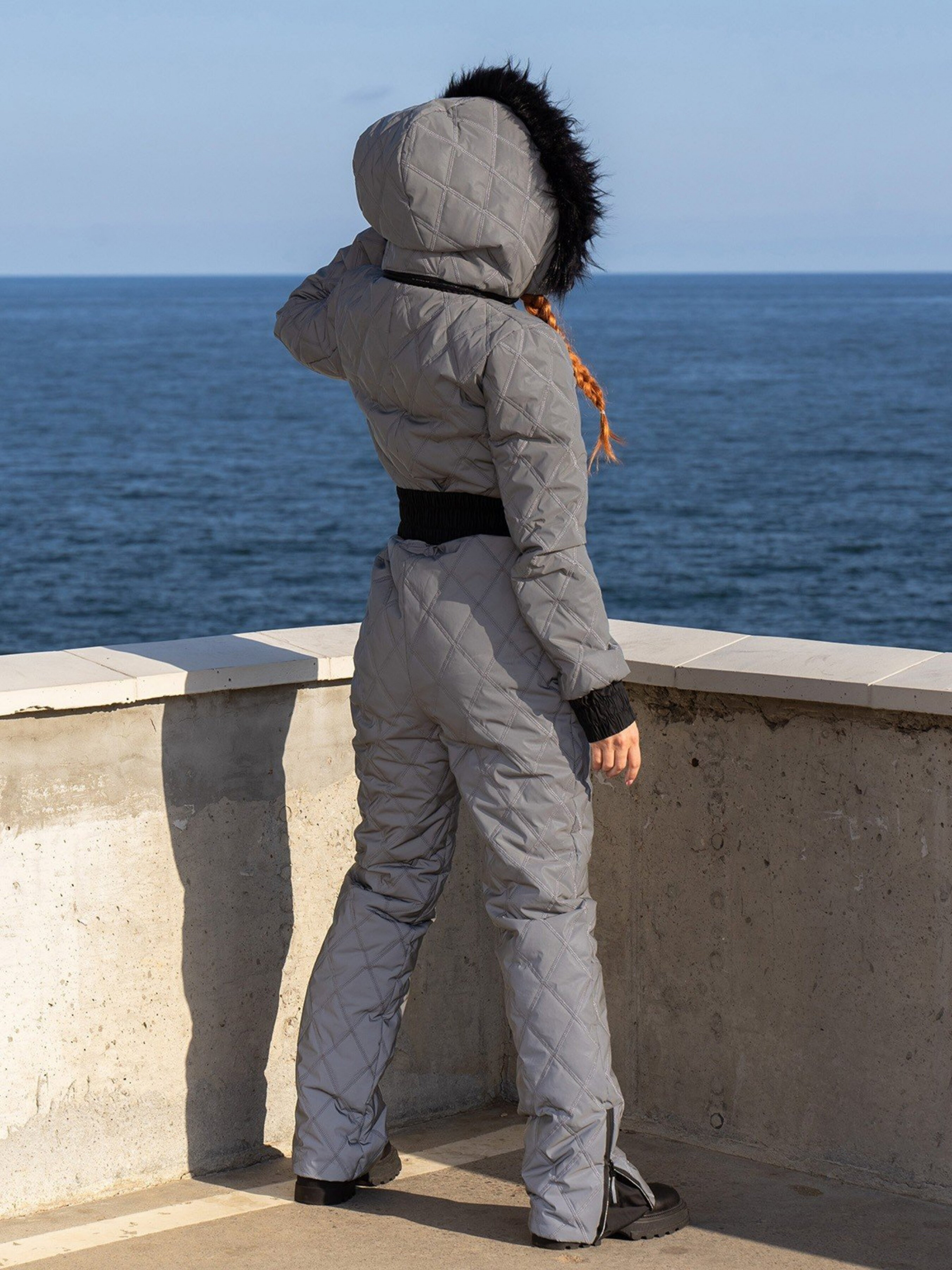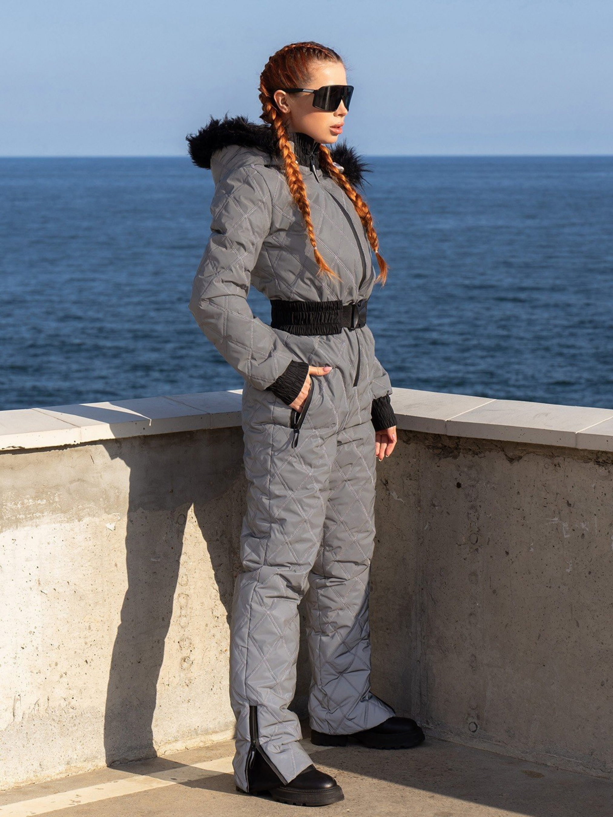 Сірий лижний комбінезон зі стьобаної плащової тканини на синтепоні з хутряною опушкою капюшона. Модель із широкими еластичними манжетами оснащена кишенями та застібкою-блискавкою спереду. Комбінезон комплектується еластичним поясом із фастексом. Знімний капюшон, кишені на блискавці, знизу штанів функціональні застібки. Склад тканини: 100% поліестер. Матеріал: Плащівка на синтепоні Напівобхват: Груди: S (46), M (48), L (50), XL (52), Талія: S (42), M (44), L (46), XL (48) , Стегна: S (50), M (52), L (54), XL (56), Довжина виробу - 160, Рукав - 66, Тканина: Низька еластичність.