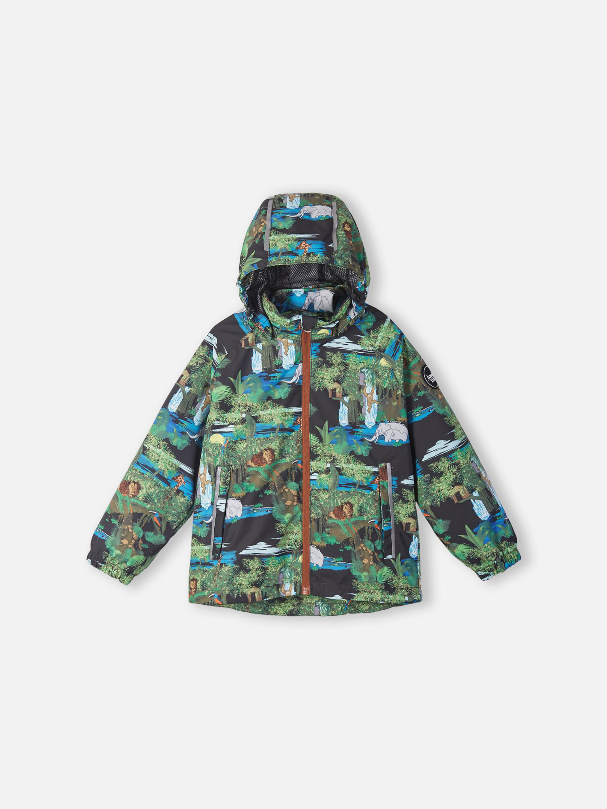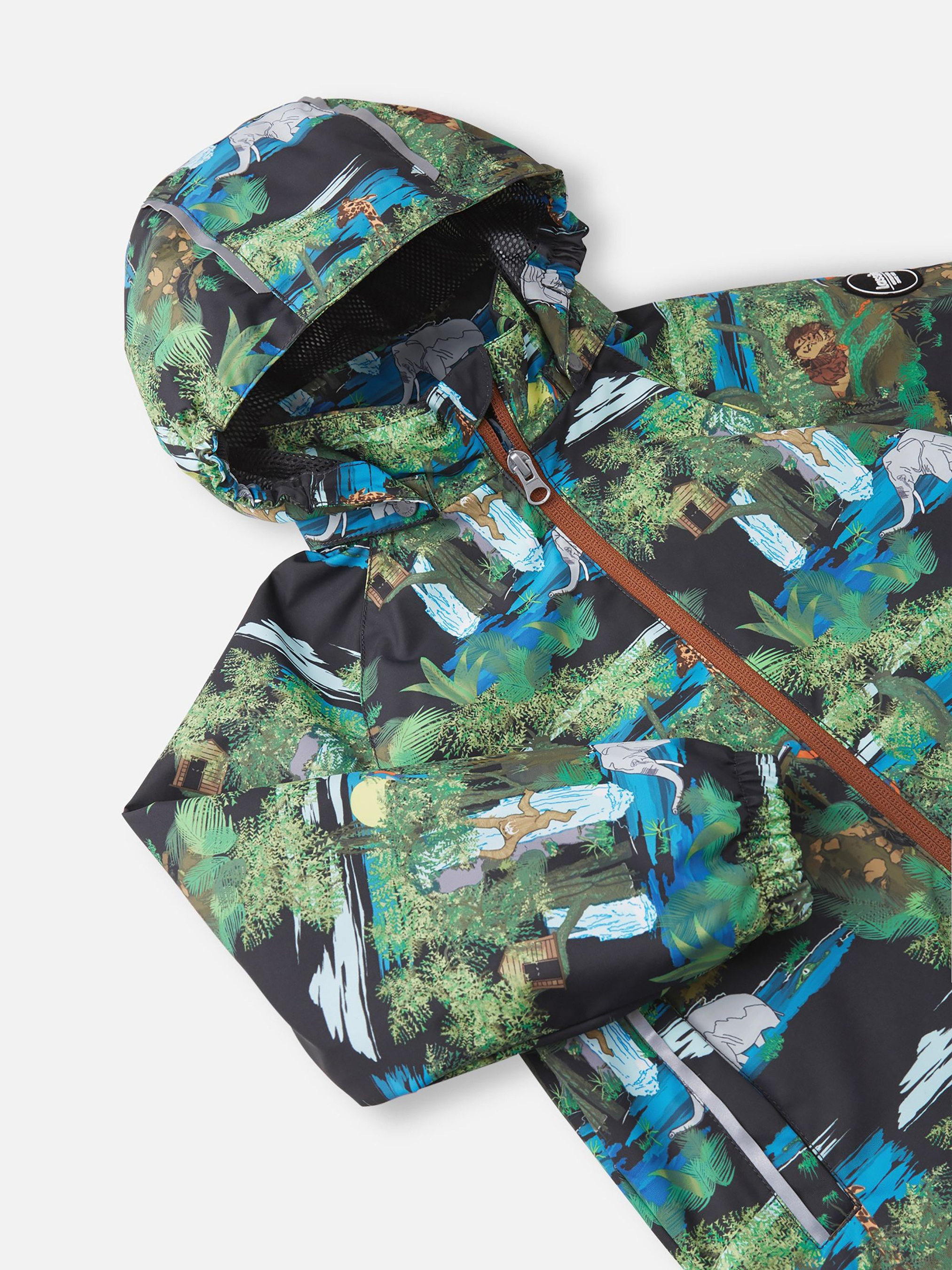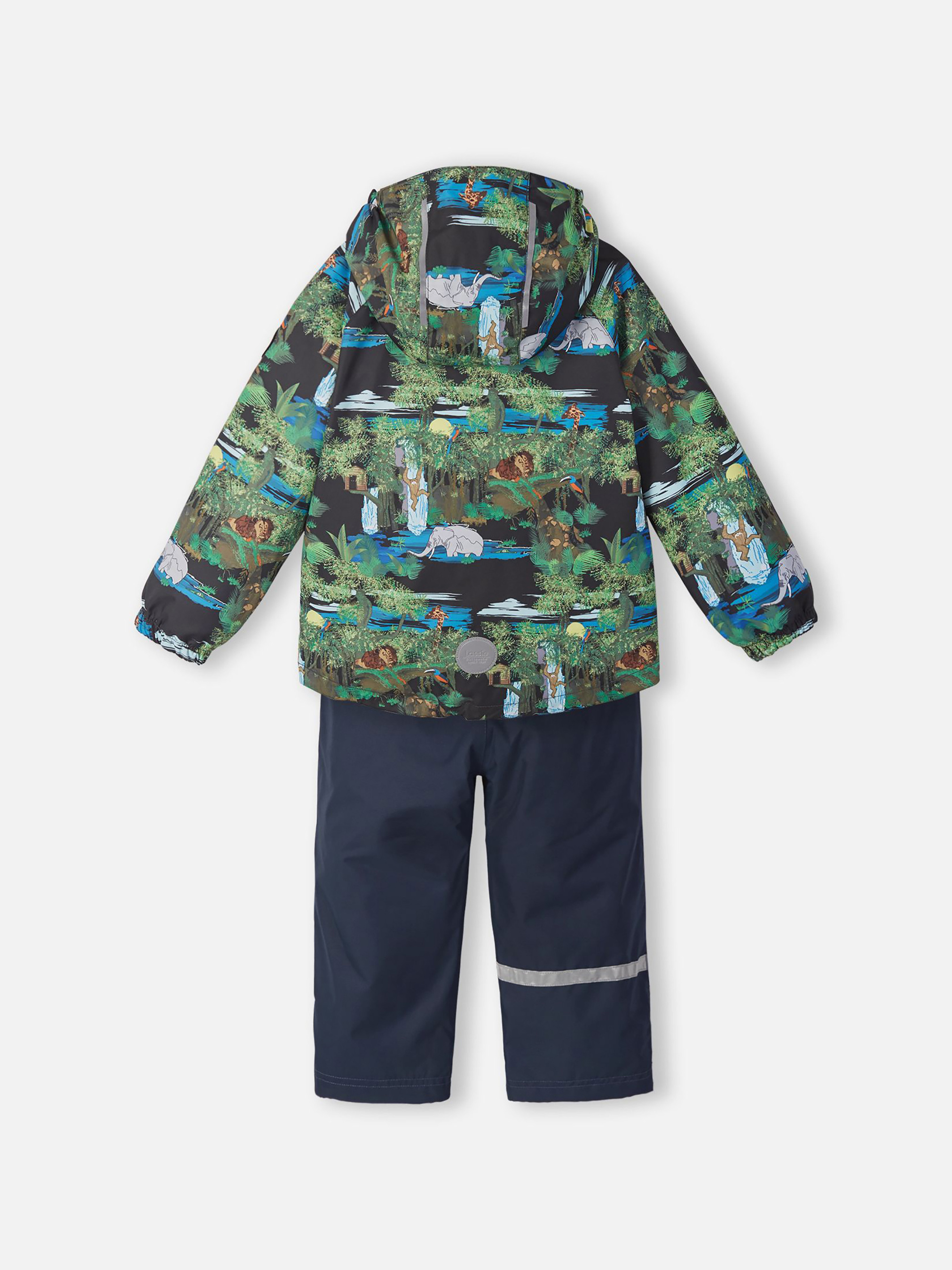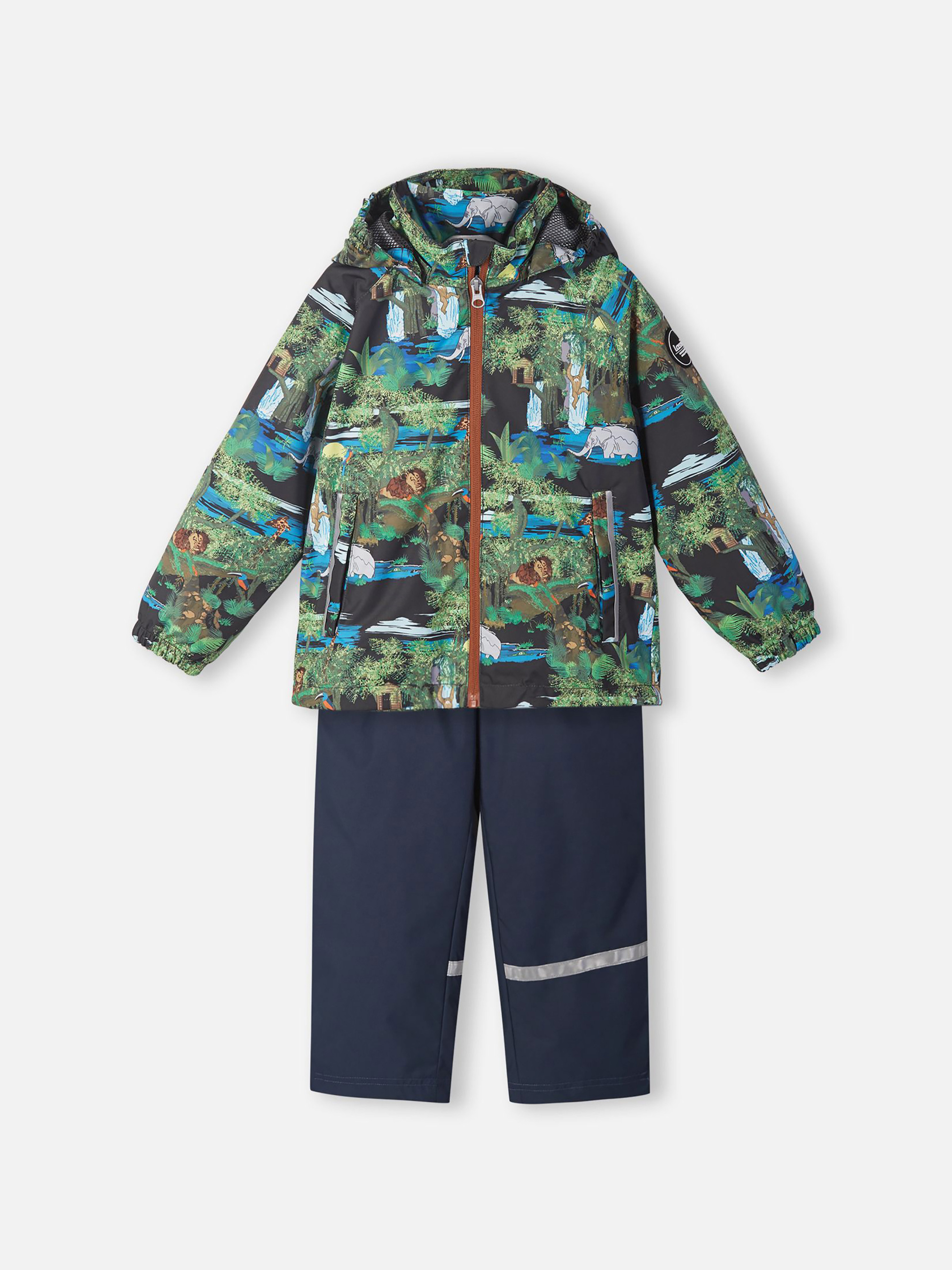 Детский демисезонный непромокаемый комплект. Этот практичный комплект изготовлен из прочного водоотталкивающего, ветронепроницаемого и дышащего материала. Гладкая, дышащая подкладка из полиэстера облегчает одевание, а регулируемый подол позволяет подобрать нужную ширину. Съемный капюшон защищает от пронизывающего ветра и безопасен во время игр на свежем воздухе. Куртка снабжена удлиненной спинкой, двумя прорезными карманами, эластичными манжетами, светоотражателями и украшена модным сплошным рисунком. В брюках предусмотрена эластичная регулируемая талия и регулируемые концы брючин для того, чтобы модель хорошо сидела по фигуре, а также один прорезной карман и светоотражающие элементы. Этот практичный комплект позволяет детям быть активными при любой погоде!