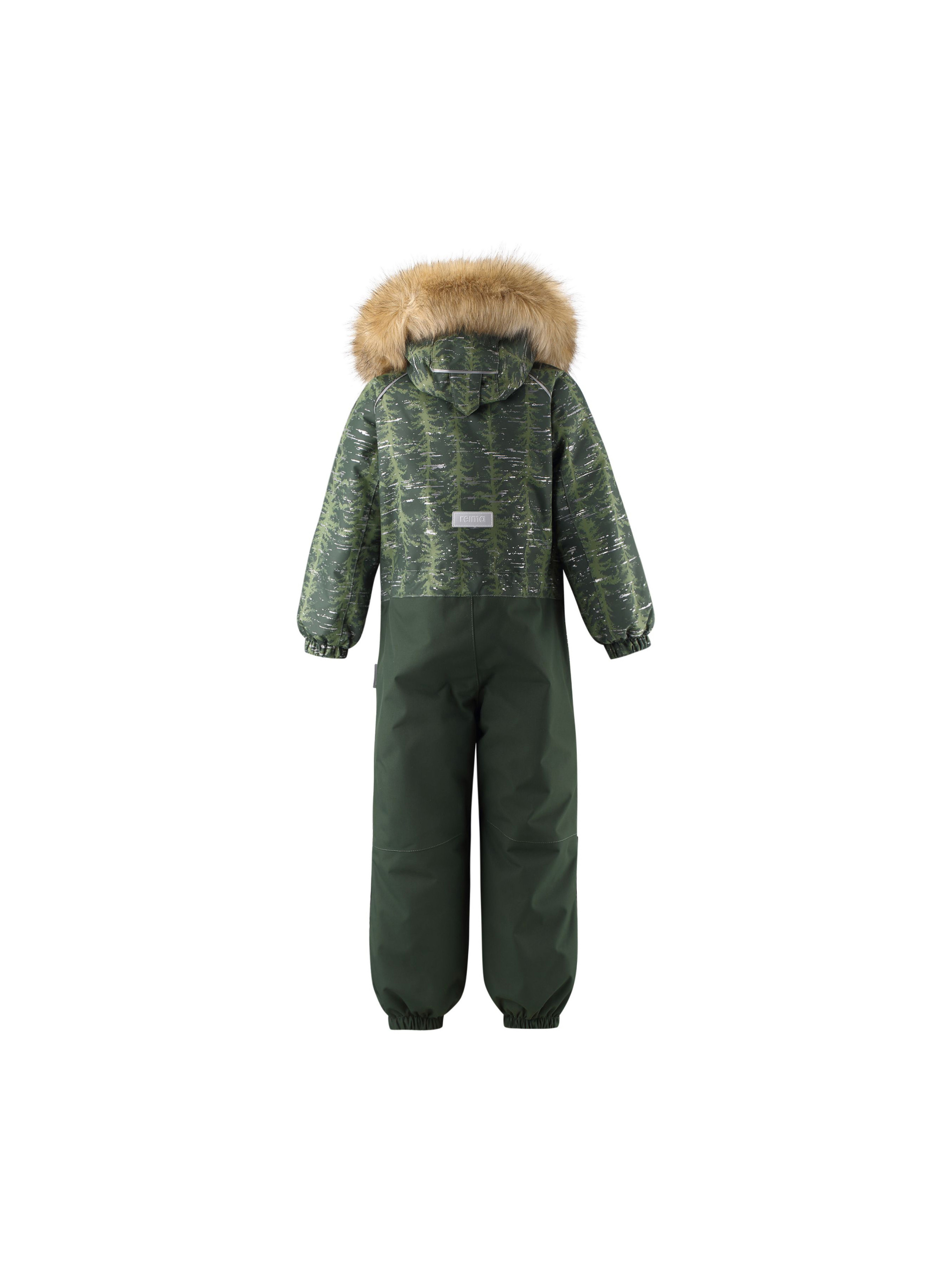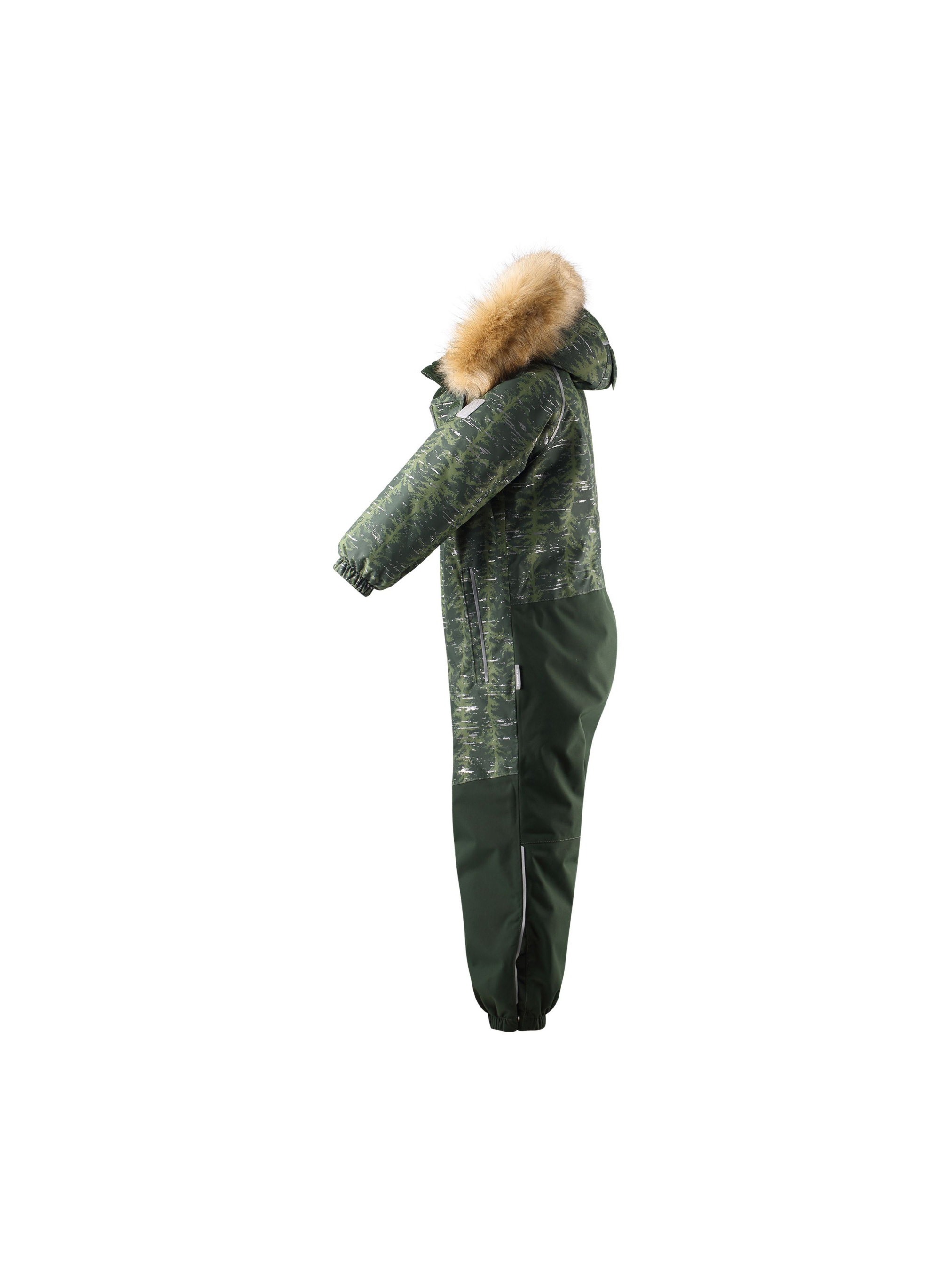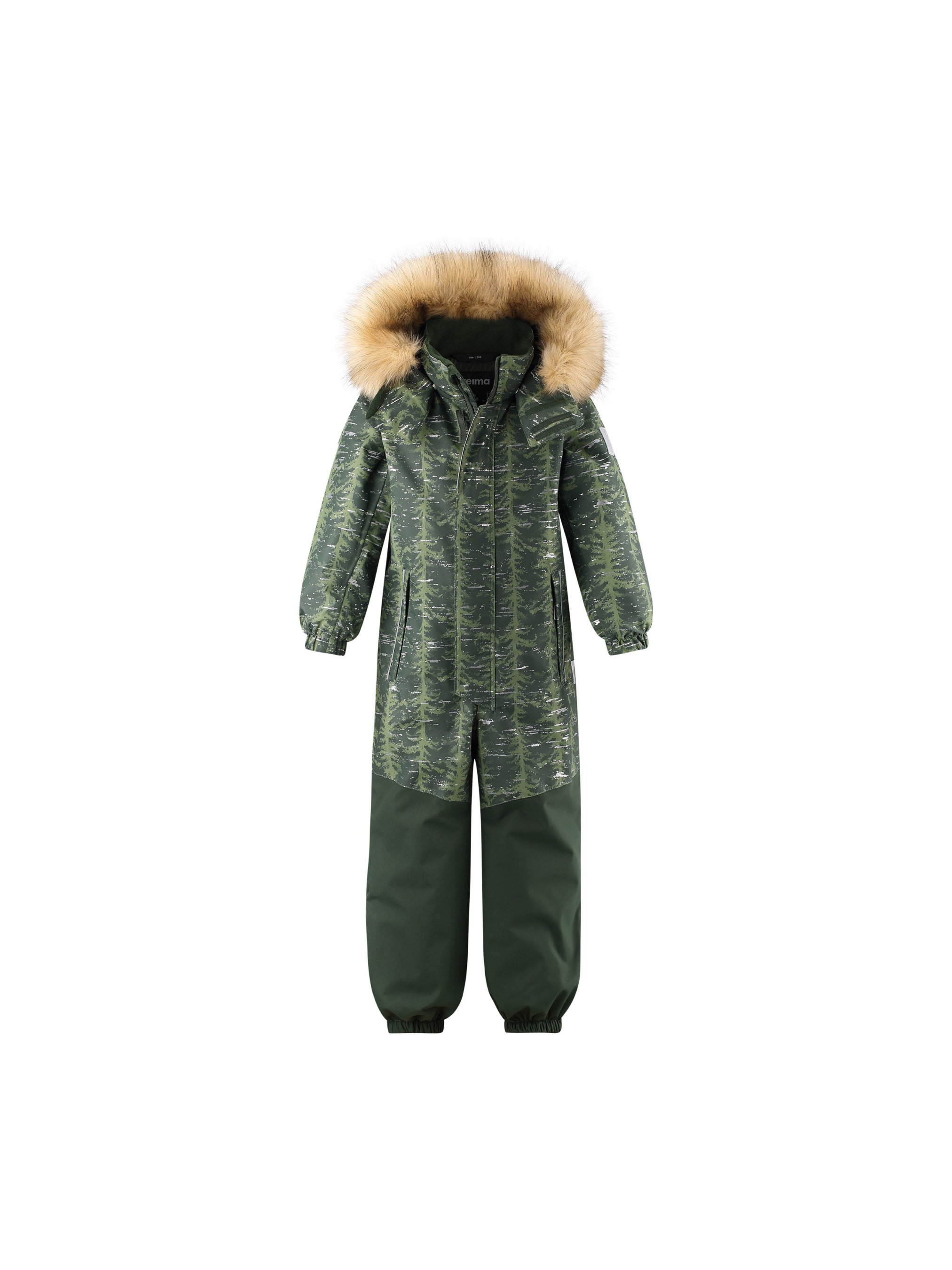 Детский комбинезон со светоотражающим рисунком выполнен из высококачественного материала Reimatec. Абсолютно непромокаемый и прочный детский зимний комбинезон Reimatec не пропускает влагу. Ветронепроницаемый и дышащий материал сохранит сухость и тепло, и не даст при этом коже вспотеть. Комбинезон с гладкой подкладкой из полиэстера и сверхпрочными усилениями внизу изделия. При желании комбинезон прямого кроя можно регулировать на талии, чтобы он плотнее прилегал к фигуре. Съемный регулируемый капюшон защищает от пронизывающего ветра, а еще он безопасен во время игр на свежем воздухе. Кнопки легко отстегиваются, если капюшон случайно за что-нибудь зацепится. Обратите внимание на суперпушистую съемную отделку из искусственного меха — она выглядит очень стильно. В комбинезоне предусмотрены два кармана на молнии, а в размерах от 116 и внутренний нагрудный карман. Материал имеет грязеотталкивающую поверхность, и при этом его можно сушить в сушильной машине. Светоотражающий рисунок довершает образ.