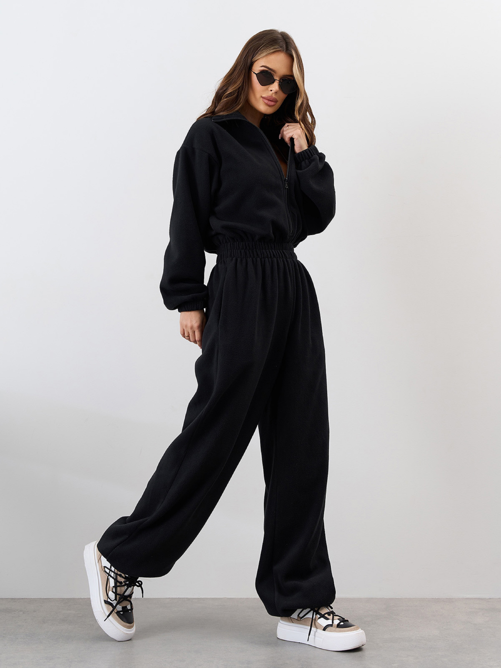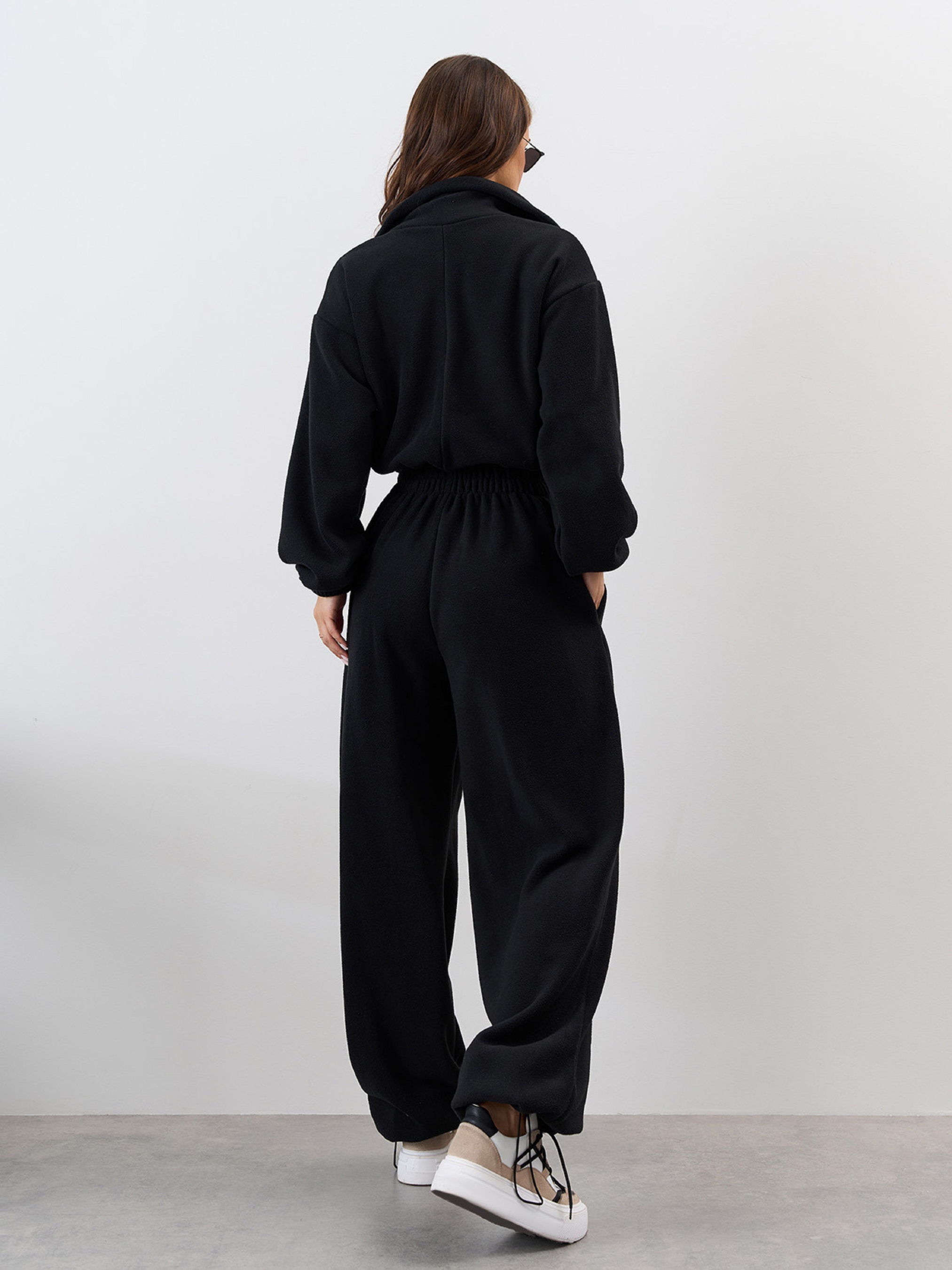 Утепленный флисовый комбинезон черного цвета в стиле оверсайз. Модель на резинках с приталенным свободным кроем и застежкой-молнией. Комбинезон с карманами, кулисками по нижнему краю штанин и длинными рукавами. Изделие с воротником-стойкой. Полуобхват: Грудь: S/M (50), L /XL (52), Талия: S/M (30-40), L /XL (32-42), Бедра: S/M (58), L /XL (60), Длина изделия - 153, Длина рукава - 53, Длина по внутреннему шву - 80, Ткань: Высокой эластичности.