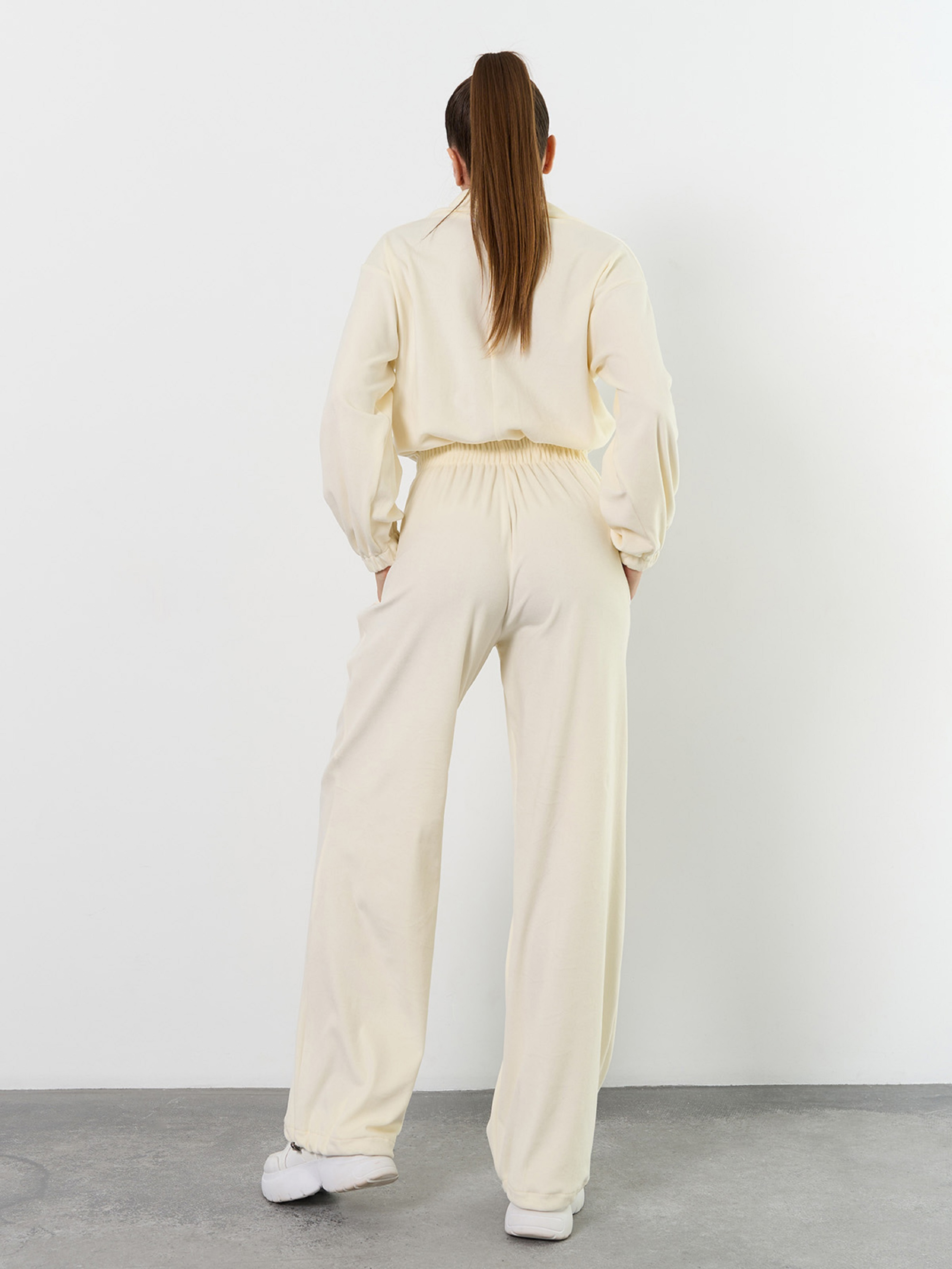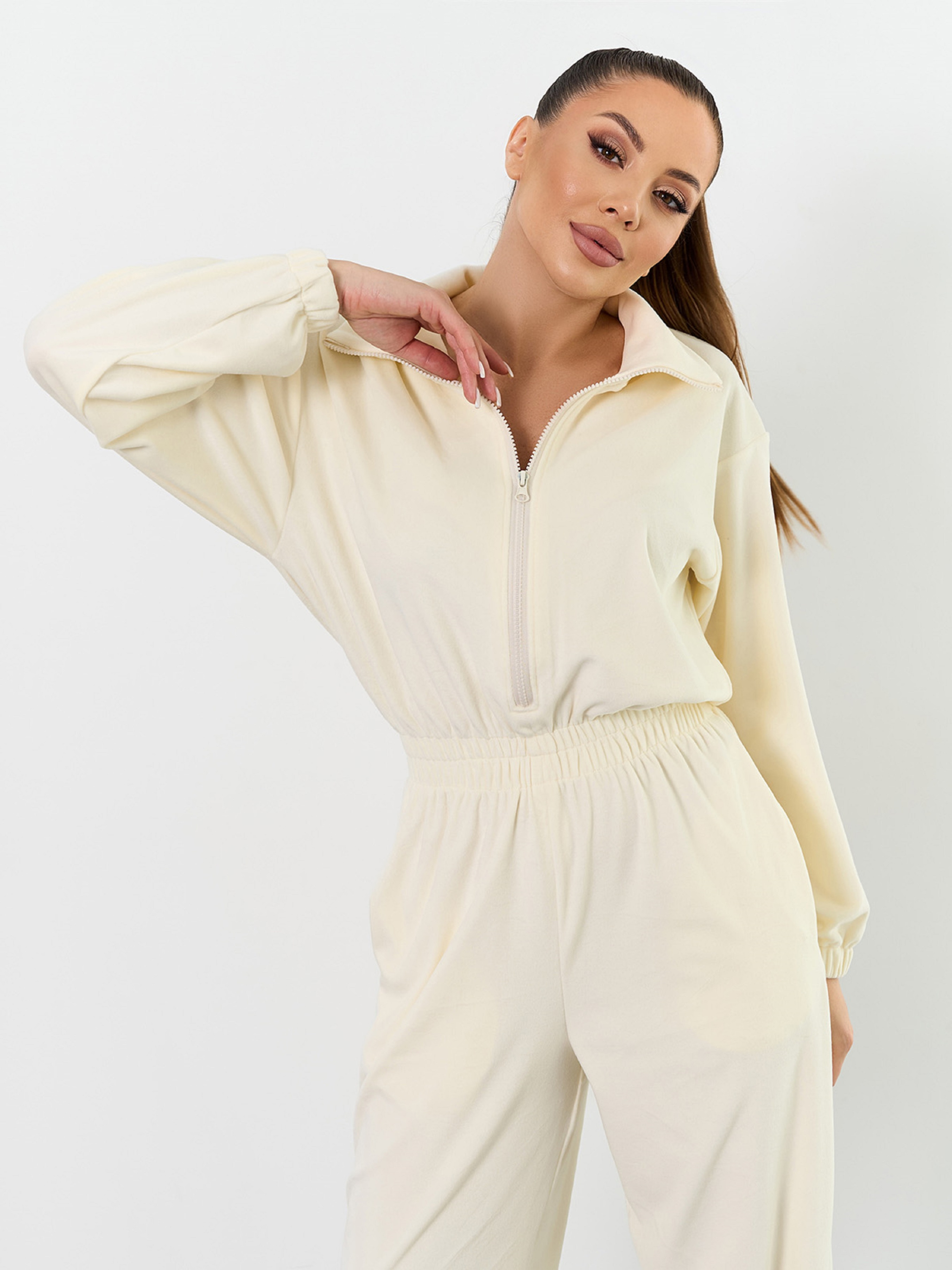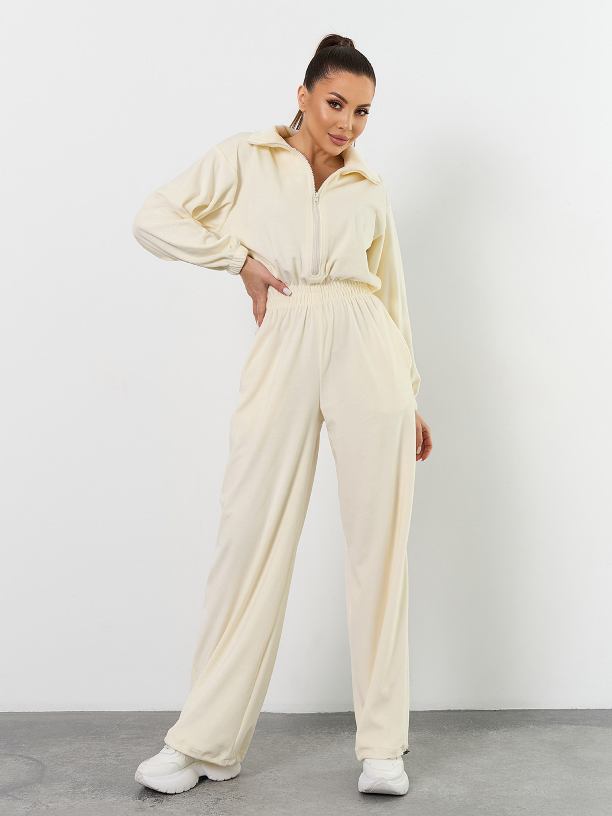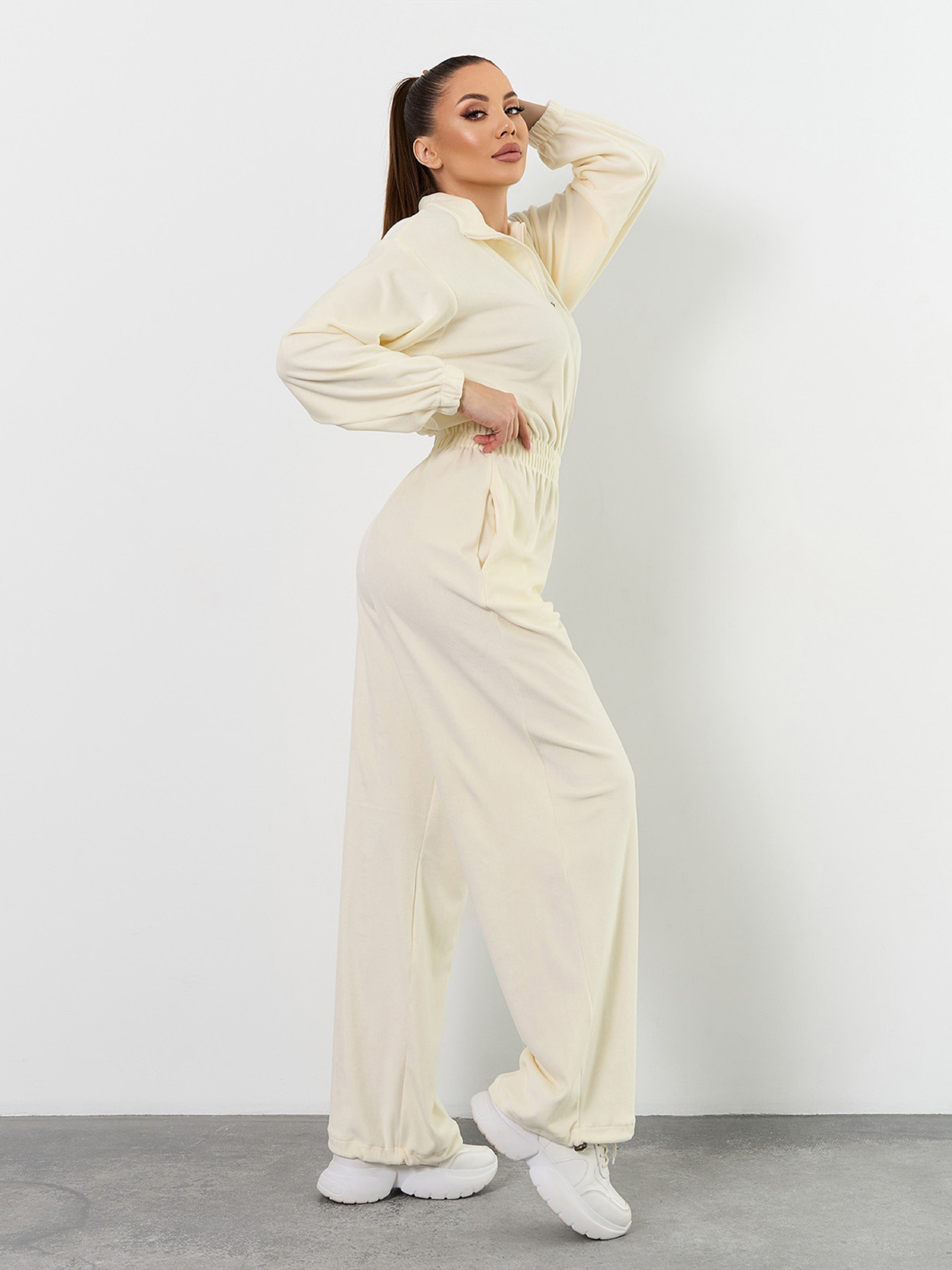 Свободный комбинезон на молнии, выполненный из плюшевого велюра молочного цвета. Изделие с широкими брюками на затяжках. Модель с резинками на талии и длинных рукавах оснащена воротником-стойкой и карманами. Полуобхват: Грудь: S/M (50), L /XL (52), Талия: S/M (28-40), L /XL (30-42), Бедра: S/M (60), L /XL (62), Длина изделия - 156, Длина рукава - 54, Длина по внутреннему шву - 82, Ткань: Высокой эластичности.