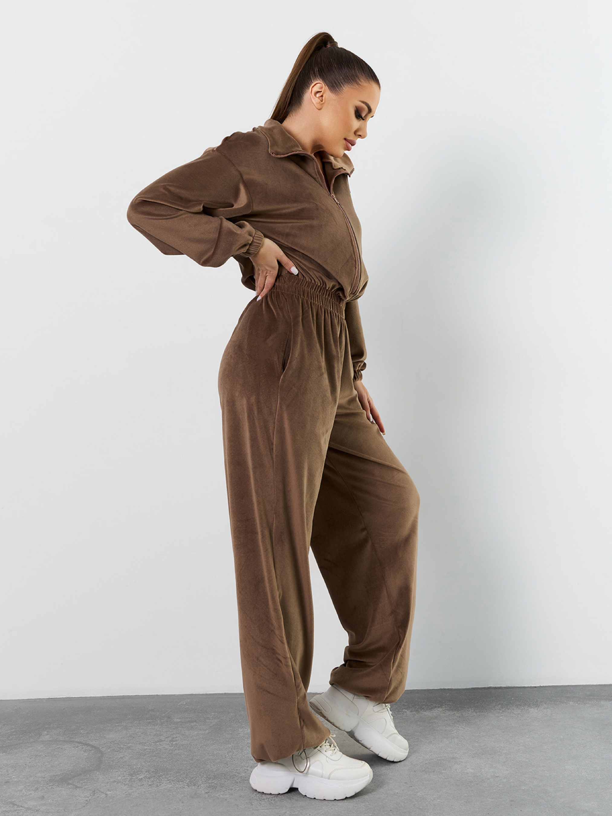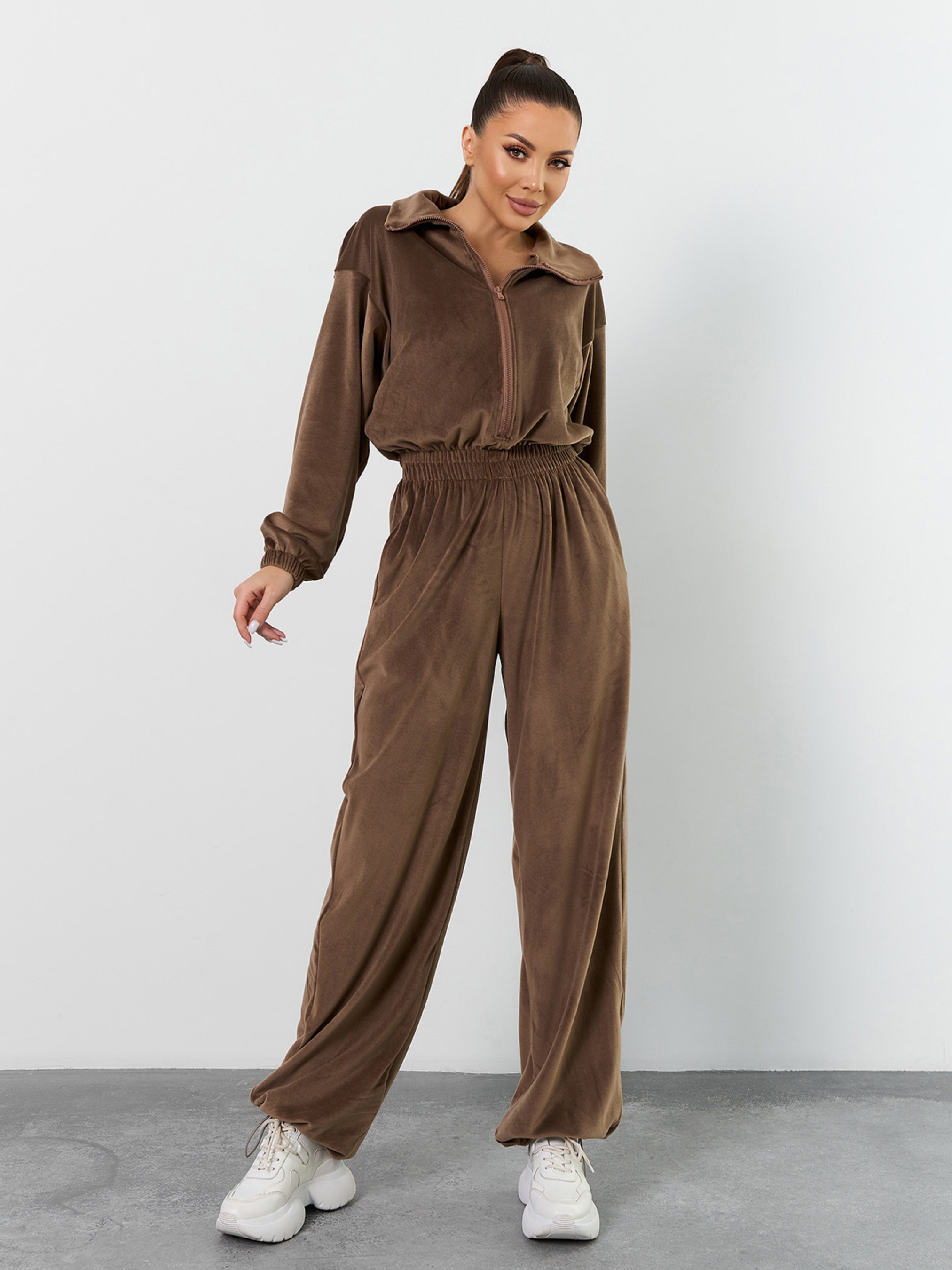 Молодежный комбинезон на молнии, выполненный из темно-бежевого плюшевого велюра. Модель с резинками на талии и длинных рукавах оснащена воротником-стойкой и карманами. Изделие с широкими брюками на затяжках. Полуобхват: Грудь: S/M (50), L /XL (52), Талия: S/M (28-40), L /XL (30-42), Бедра: S/M (60), L /XL (62), Длина изделия - 156, Длина рукава - 54, Длина по внутреннему шву - 82, Ткань: Высокой эластичности.