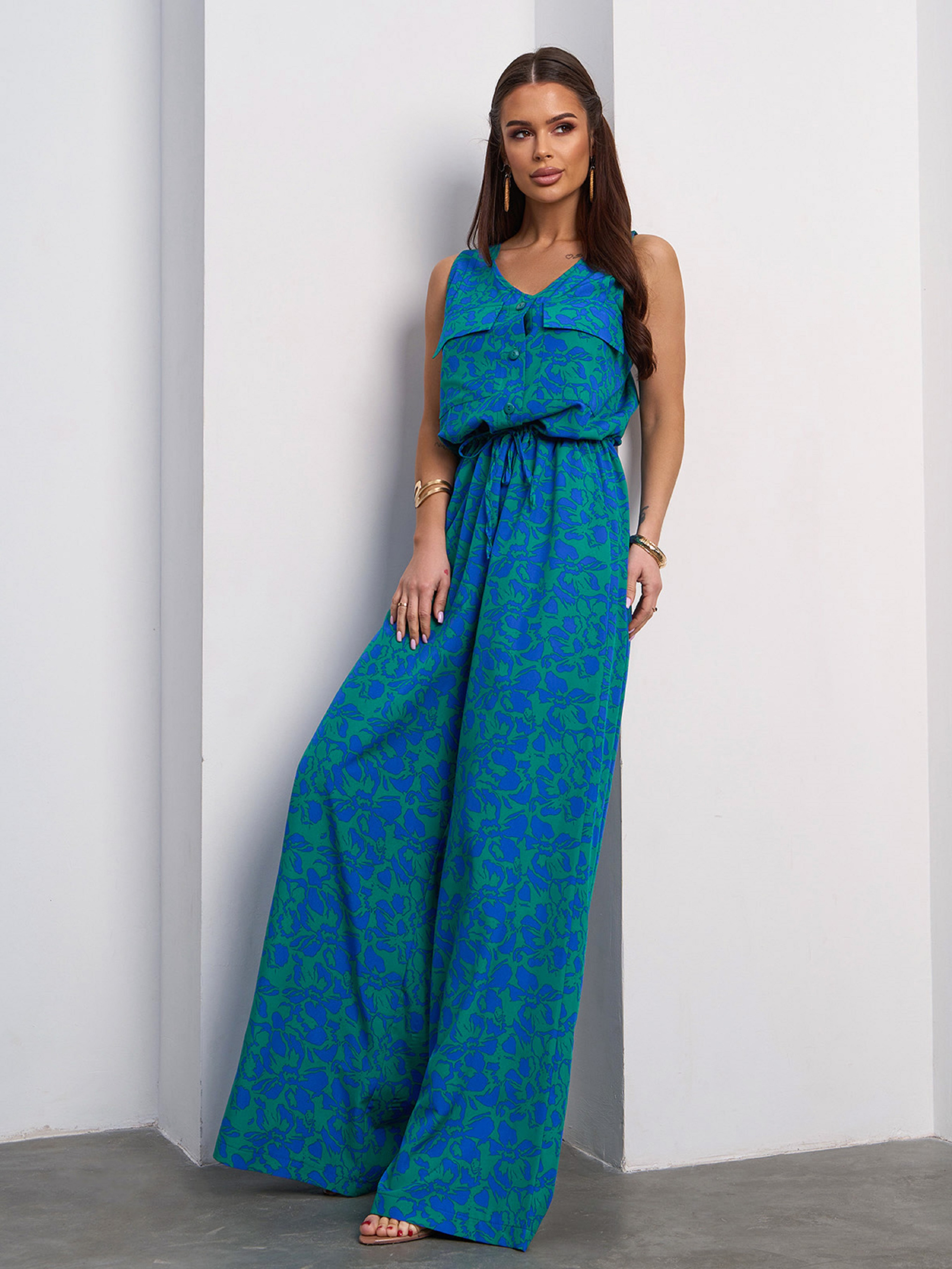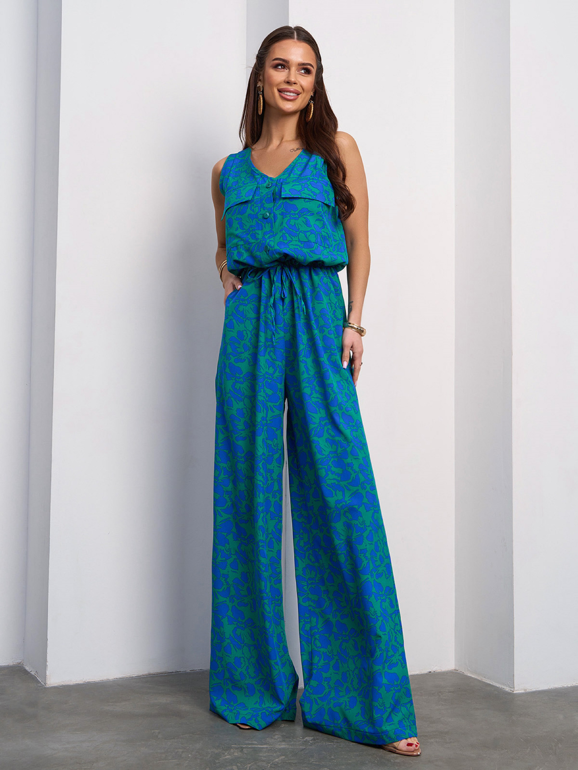 Зеленый цветочный комбинезон на кулиске. Полуобхват: Грудь: S (48), M (50), L (52), XL (54), Талия: S (48), M (50), L (52), XL (54), Бедра: S (56), M (58), L (60), XL (62), Длина изделия - 160, Длина по внутреннему шву -79, Ткань: Низкой эластичности. Состав: 59% полиэстер, 21% эластан, 20% хлопок