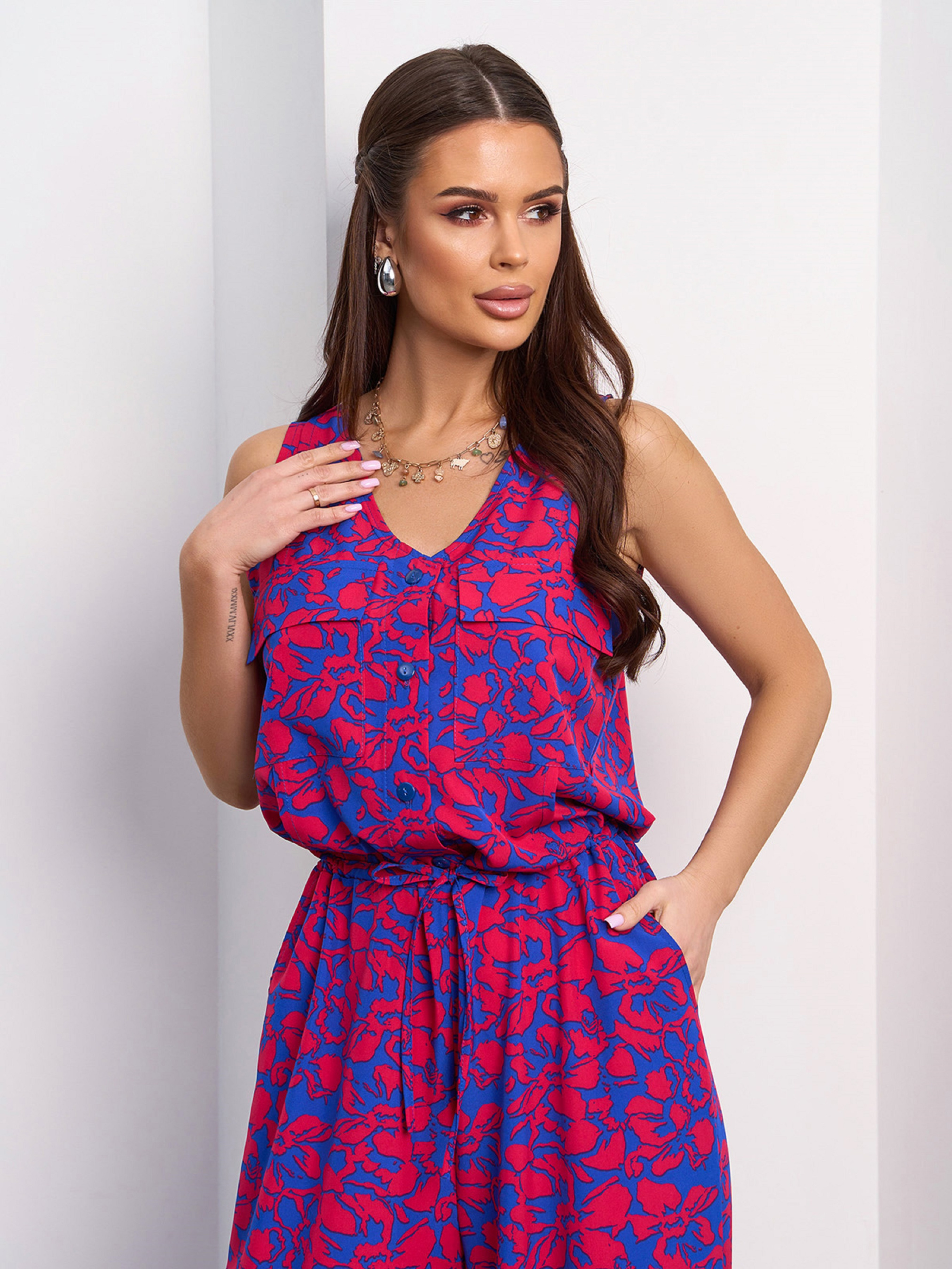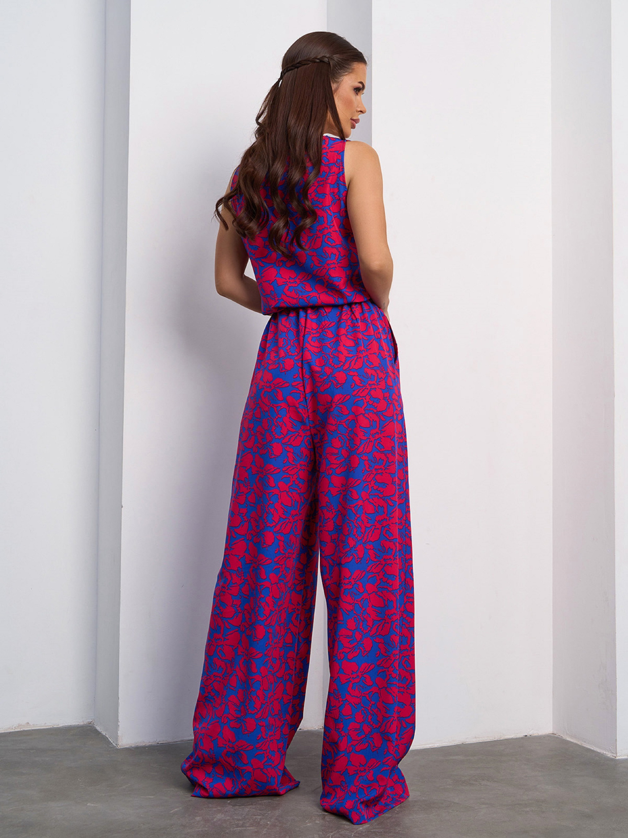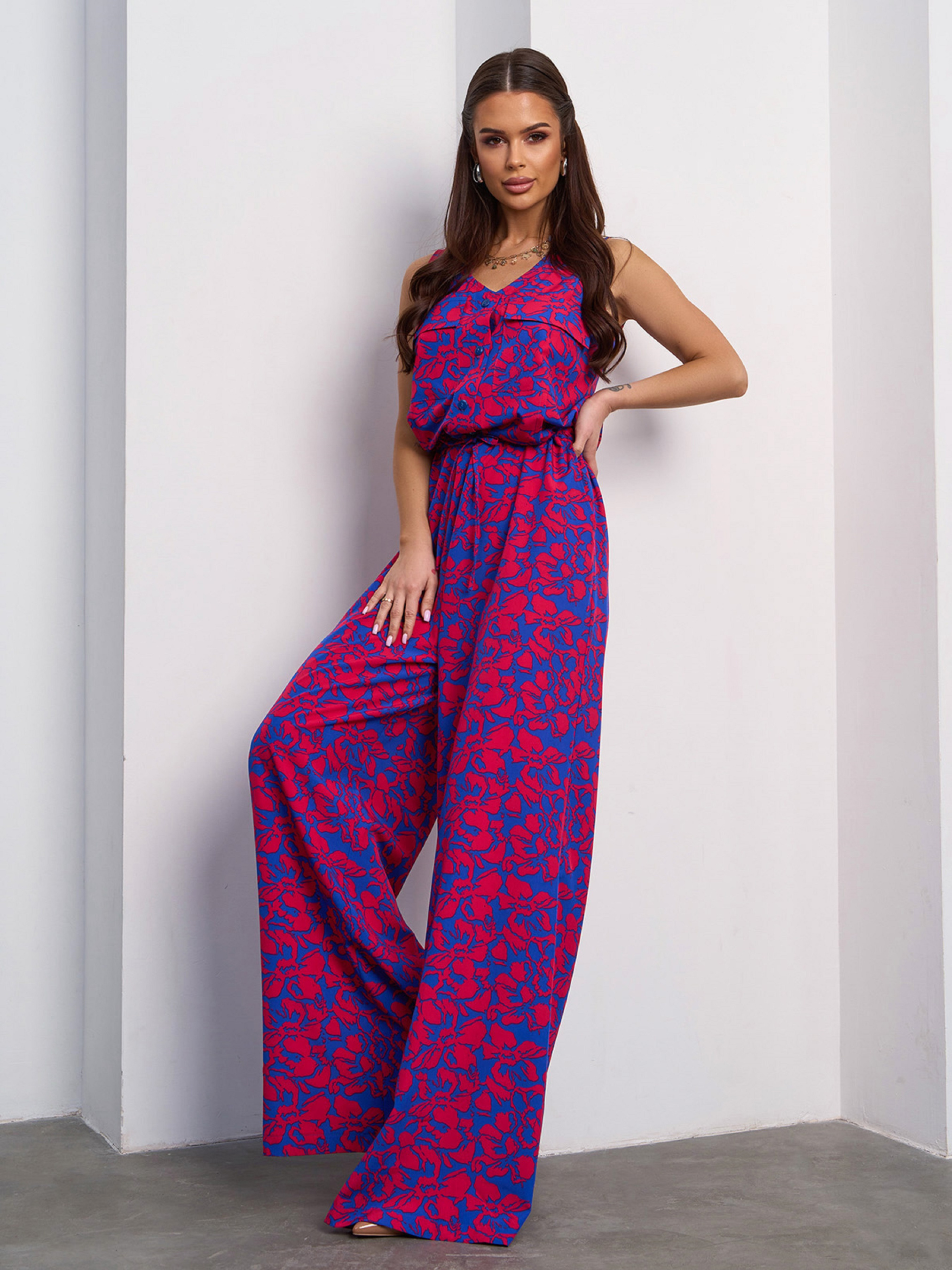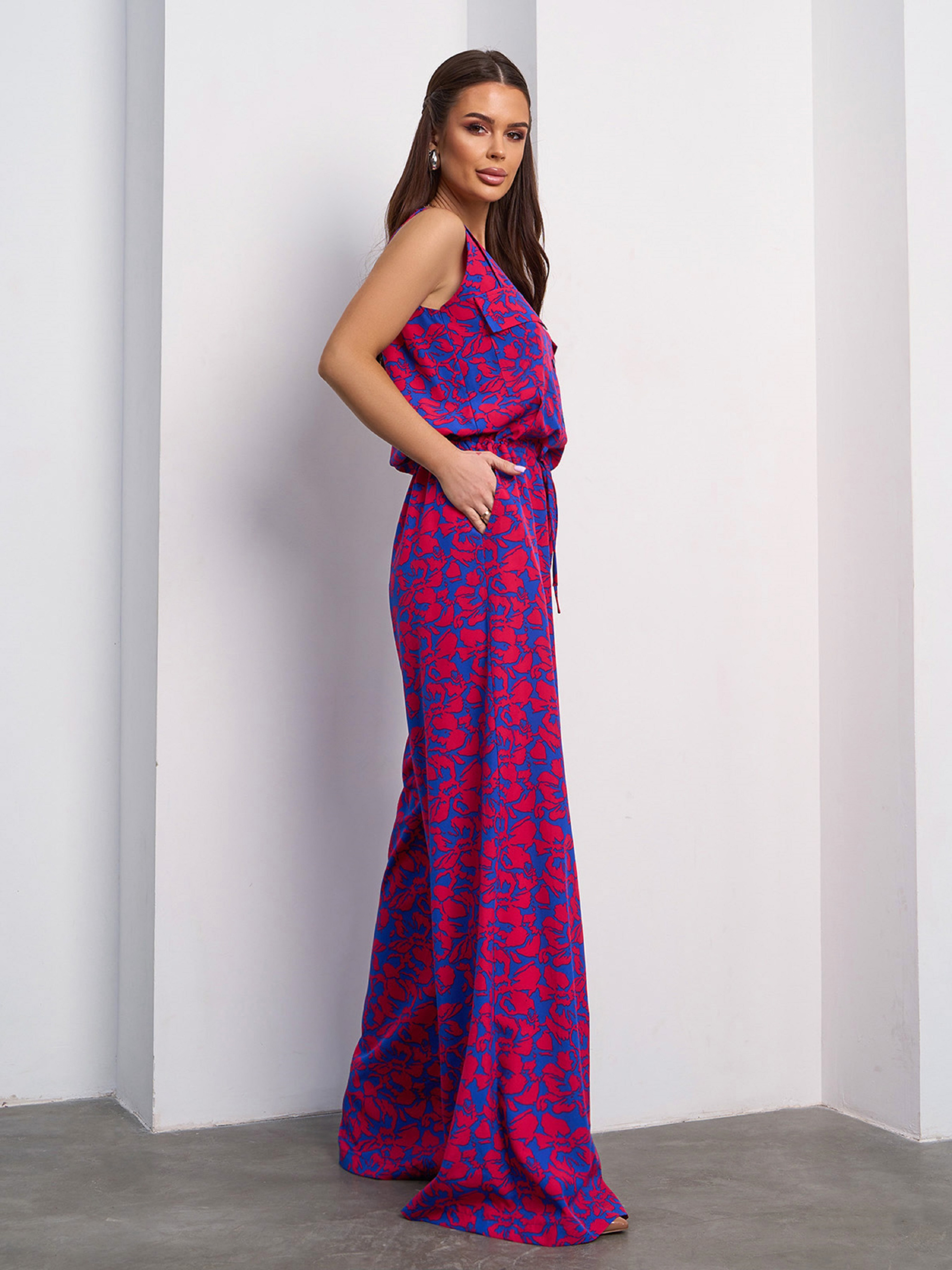 Синий цветочный комбинезон на кулиске. Полуобхват: Грудь: S (48), M (50), L (52), XL (54), Талия: S (48), M (50), L (52), XL (54), Бедра: S (56), M (58), L (60), XL (62), Длина изделия - 160, Длина по внутреннему шву -79, Ткань: Низкой эластичности. Состав: 59% полиэстер, 21% эластан, 20% хлопок