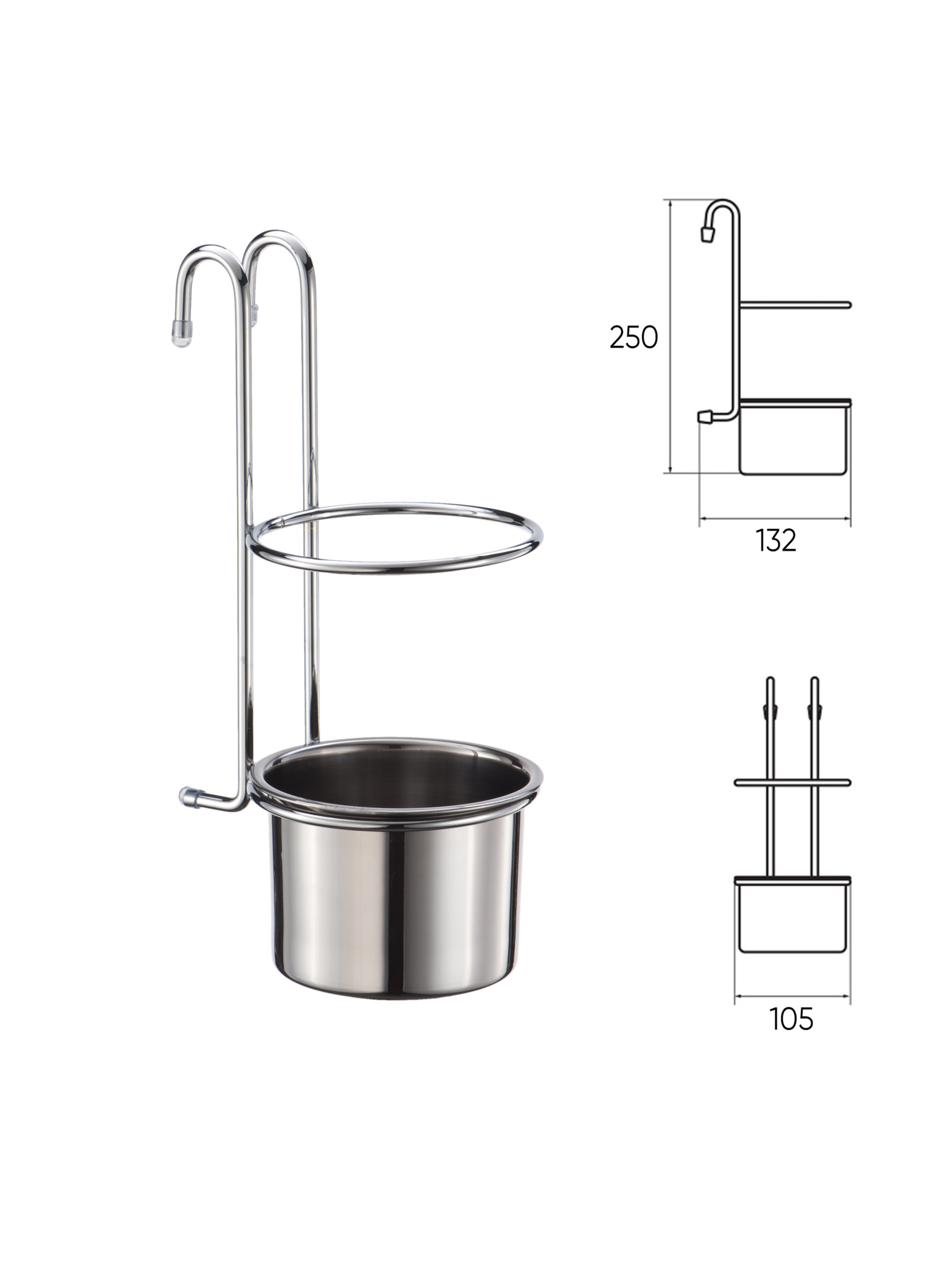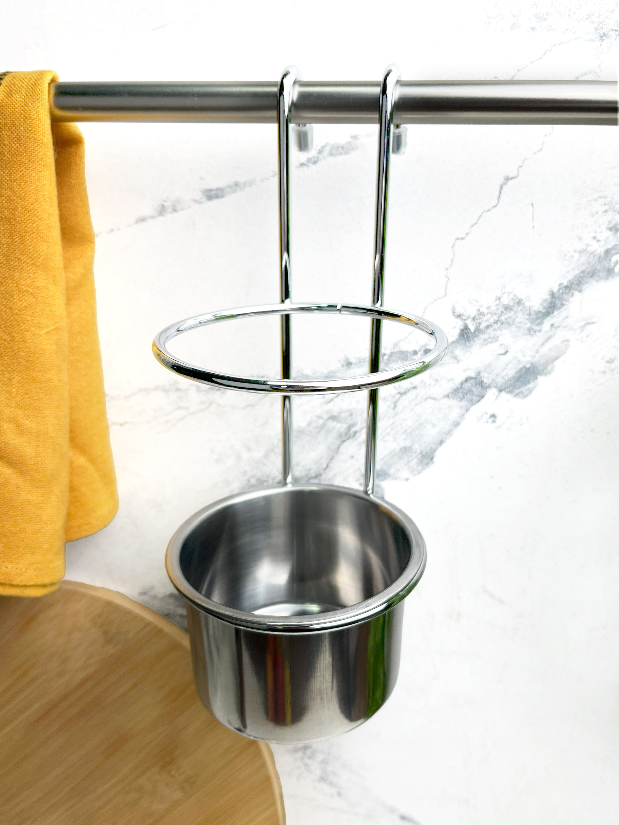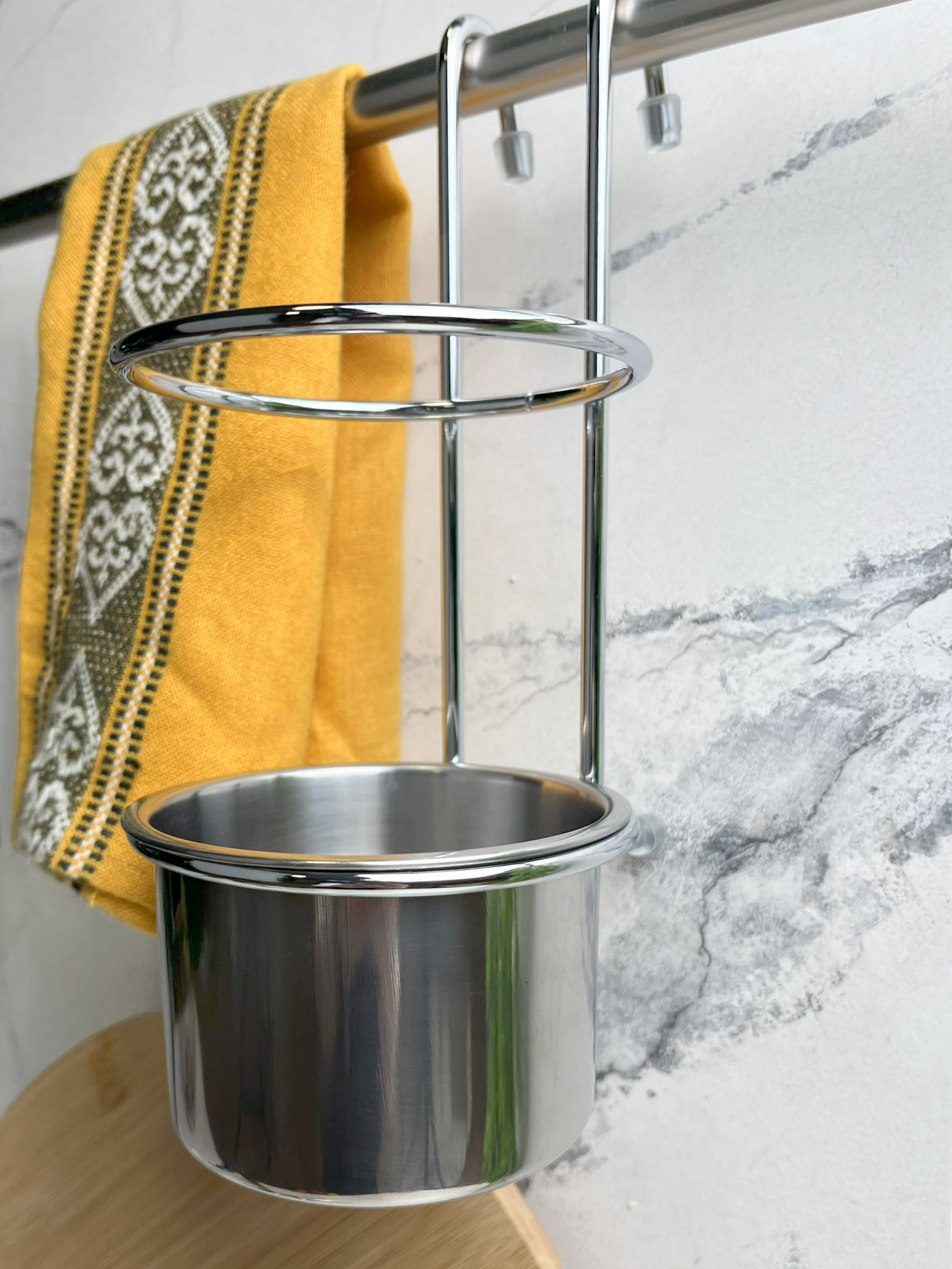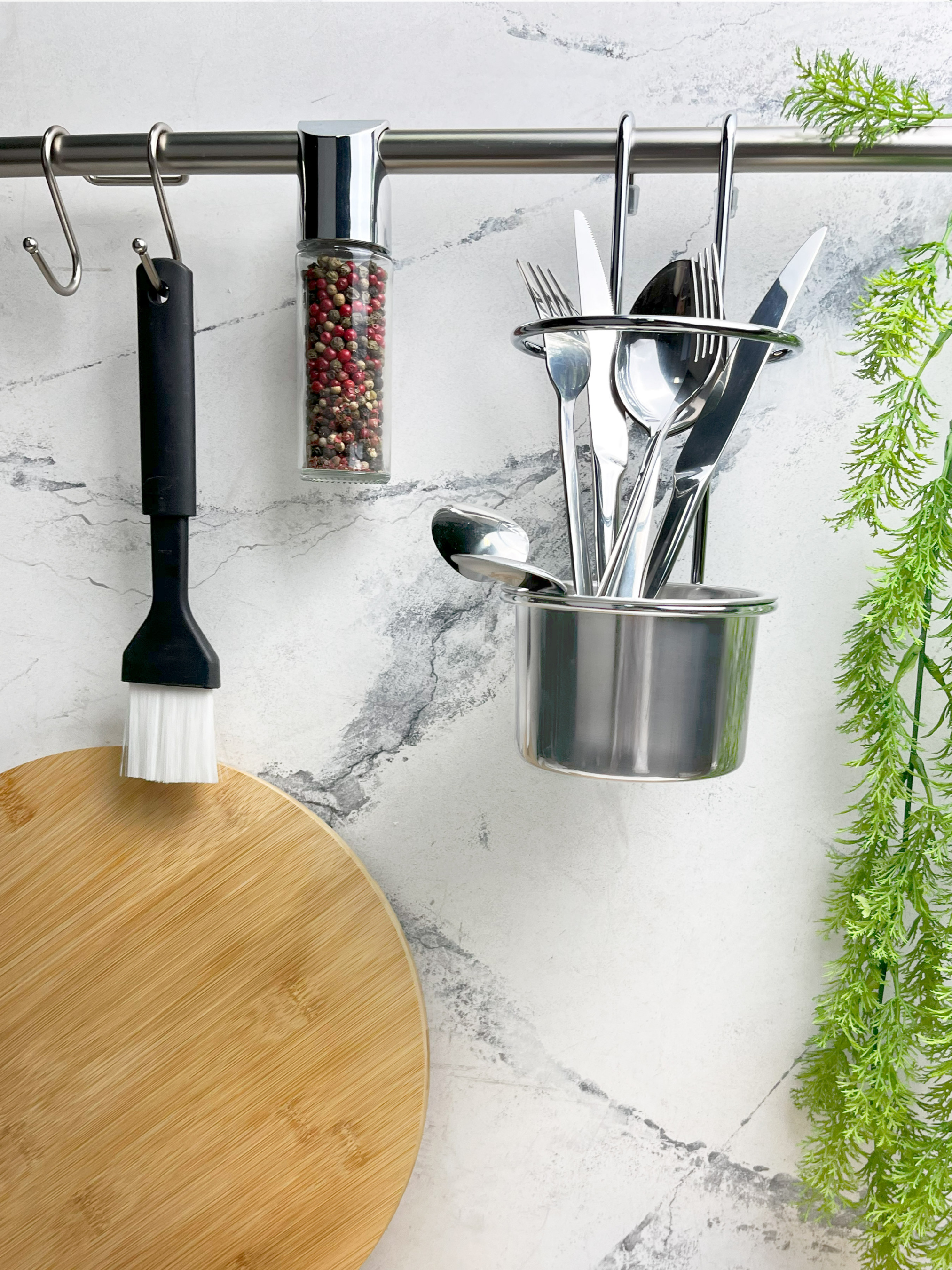 Подвесной стакан для столовых приборов Homax предназначен для использования на рейлинге. Чудесно дополнит кухонную обстановку и поможет грамотно распорядиться пространством в помещении. Металлический стакан YJ-G017 E имеет удобную конструкцию цилиндрической формы, а также лаконичный дизайн. Подвесной стакан на рейлинг сэкономит время, которое ранее было бы потрачено на поиски необходимых предметов, ведь теперь все есть под рукой, а дополнительный бортик не даст им опрокинуться. Предназначен для всех видов столовых приборов (ложки, вилки, ножи), а также хранения и сушки лопаток, половников, шумовок и т.д. Если вы хотите купить металлический подвесной стакан для приборов - выбирайте ТМ Homax. У нас в наличии широкий ассортимент аксессуаров для кухни, универсальный дизайн которых гармонично сочетается с большинством дизайнерских решений.