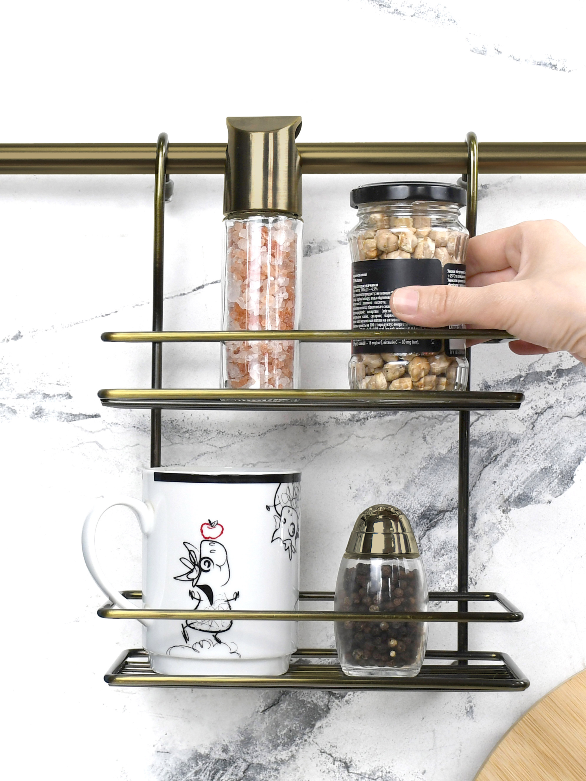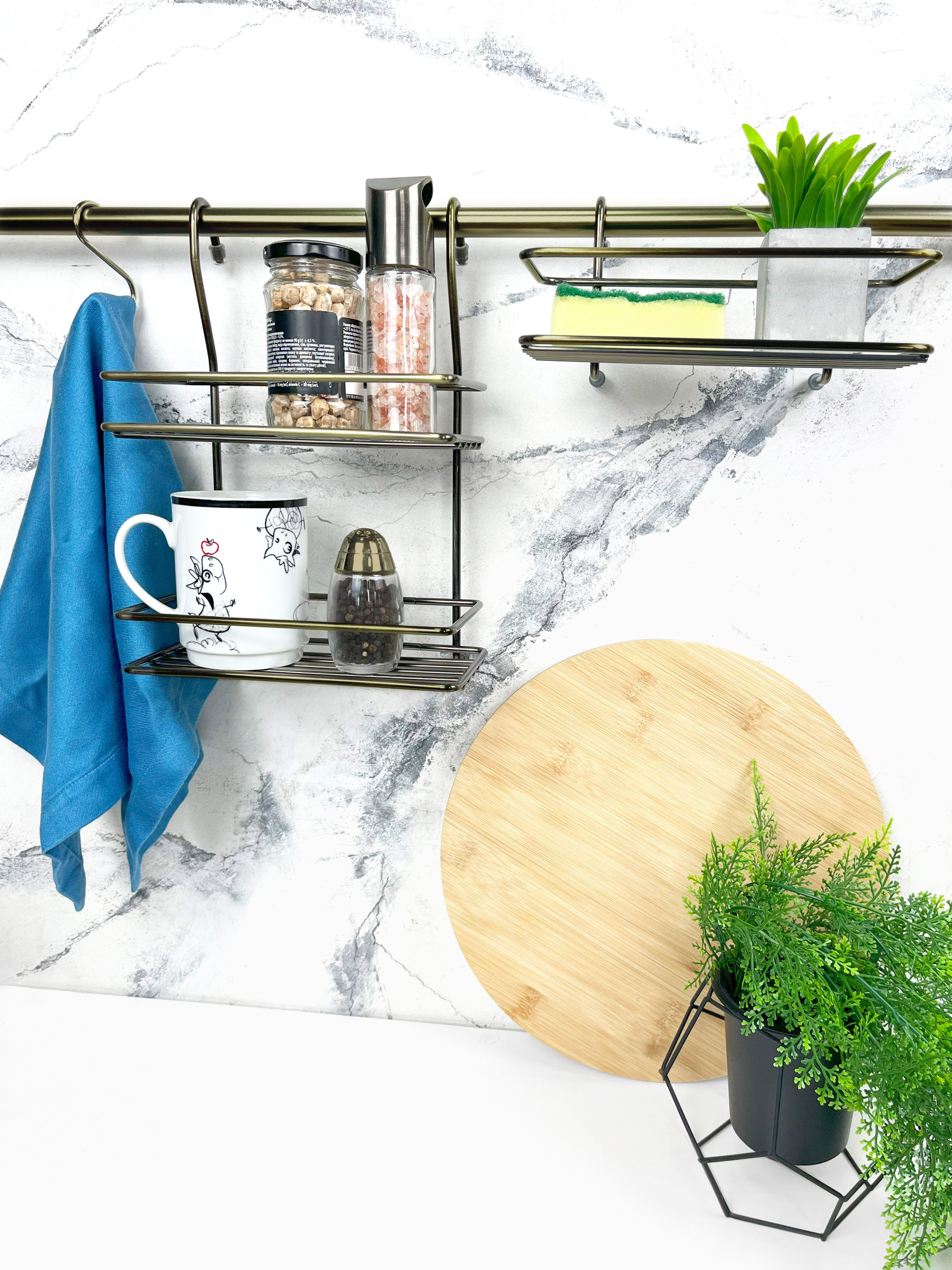 Рейлинг - это труба-перекладина, которая крепится на стену при помощи специальных креплений. На рейлинге могут быть расположены крючки для того, чтобы вешать на них всевозможную кухонную утварь, а могут быть и просто полочки для посуды, сушки или хлебницы. Металлическая двойная полка Lemax - это стильное и практичное решение для вашей кухни. Удобная подвесная форма гармонично сочетается с рейлингами и креплениями. Данная полка для кухни позволяет освободить место в шкафах и переместить специи ближе к рабочей зоне для более удобного использования. Два яруса полки позволяют удобно расположить большое количество баночек со специями. Дополнительные бортики не дадут им опрокинуться. Храните кухонные принадлежности в одном месте и рационально используйте пространство на вашей кухне. Особенность подвесной двухъярусной полки MX-066 ВA - минималистичный дизайн и функциональность использования. Цвет: античная бронза. Если вы хотите купить полку для кухни - выбирайте ТМ Lemax. У нас в наличии широкий ассортимент аксессуаров для кухни, универсальный дизайн которых гармонично сочетается с большинством дизайнерских решений.
