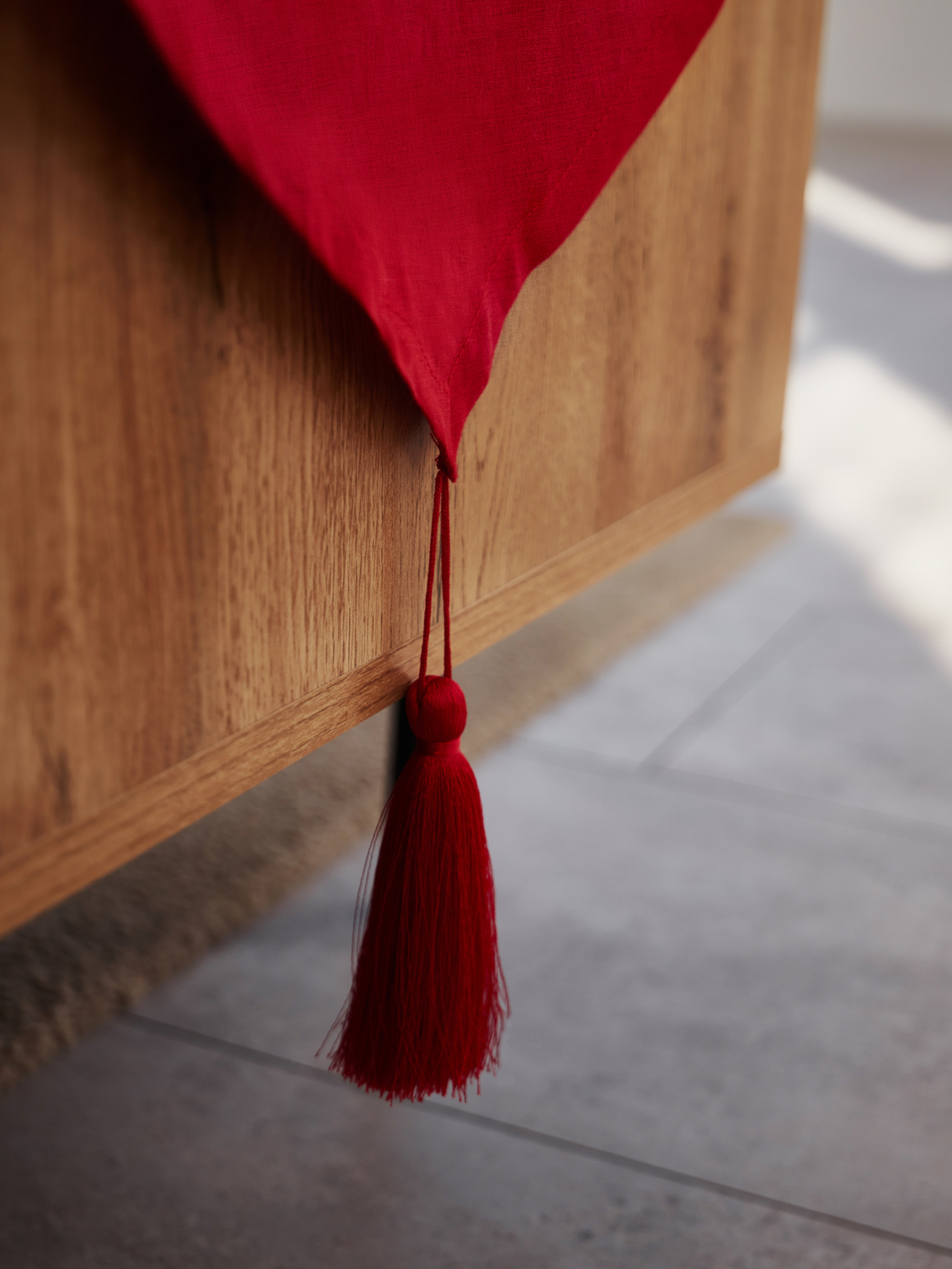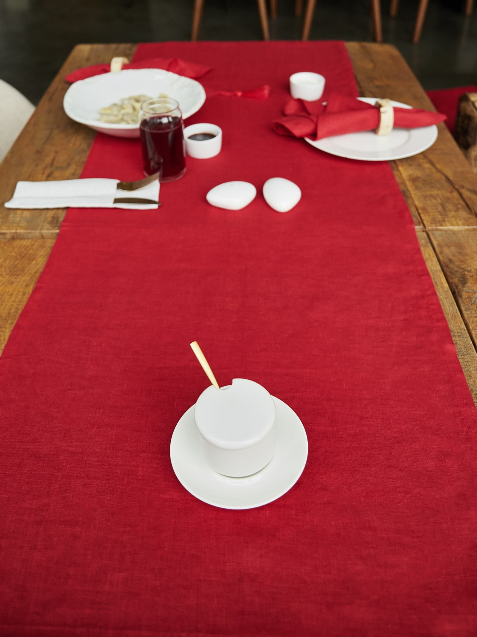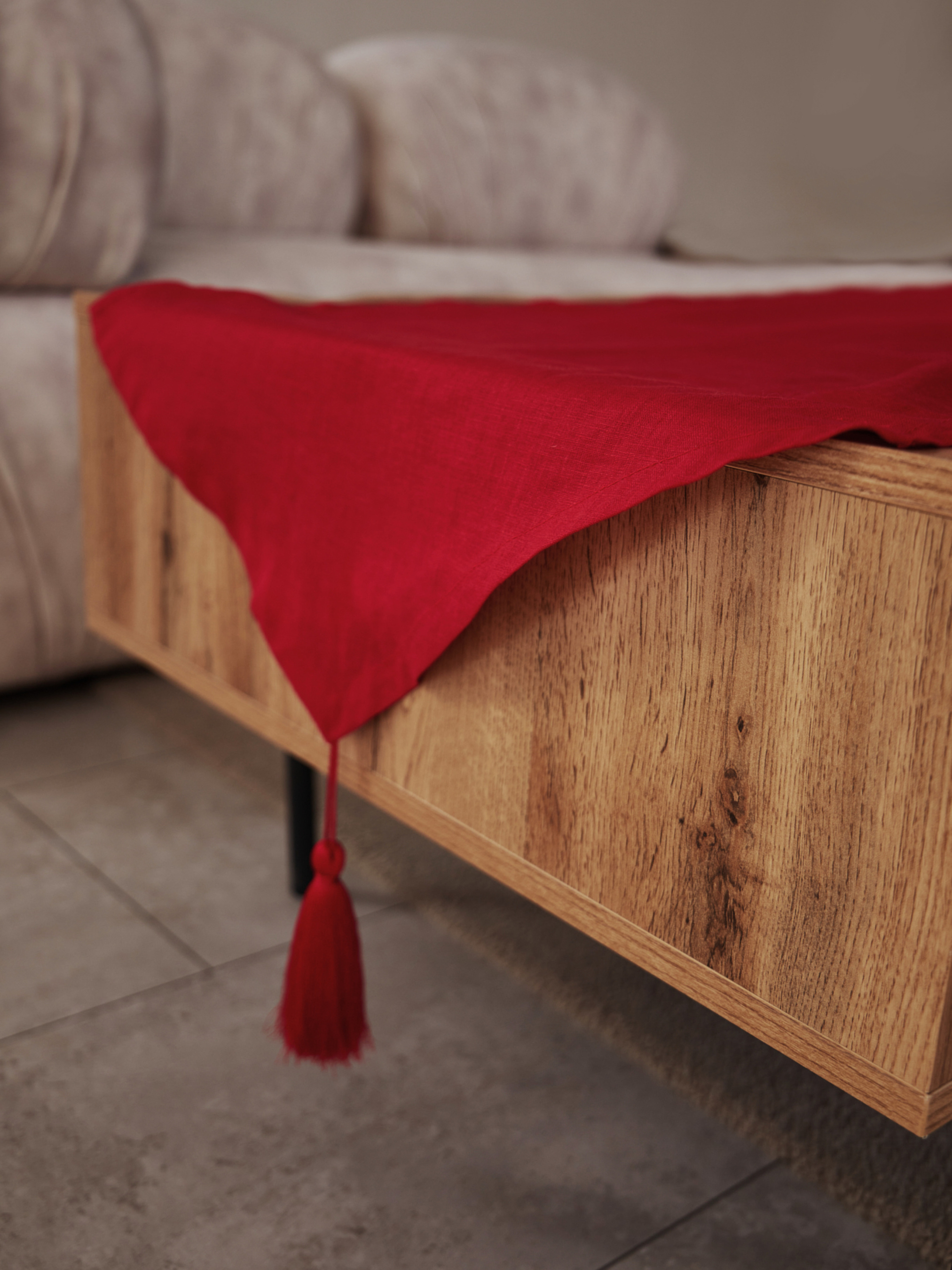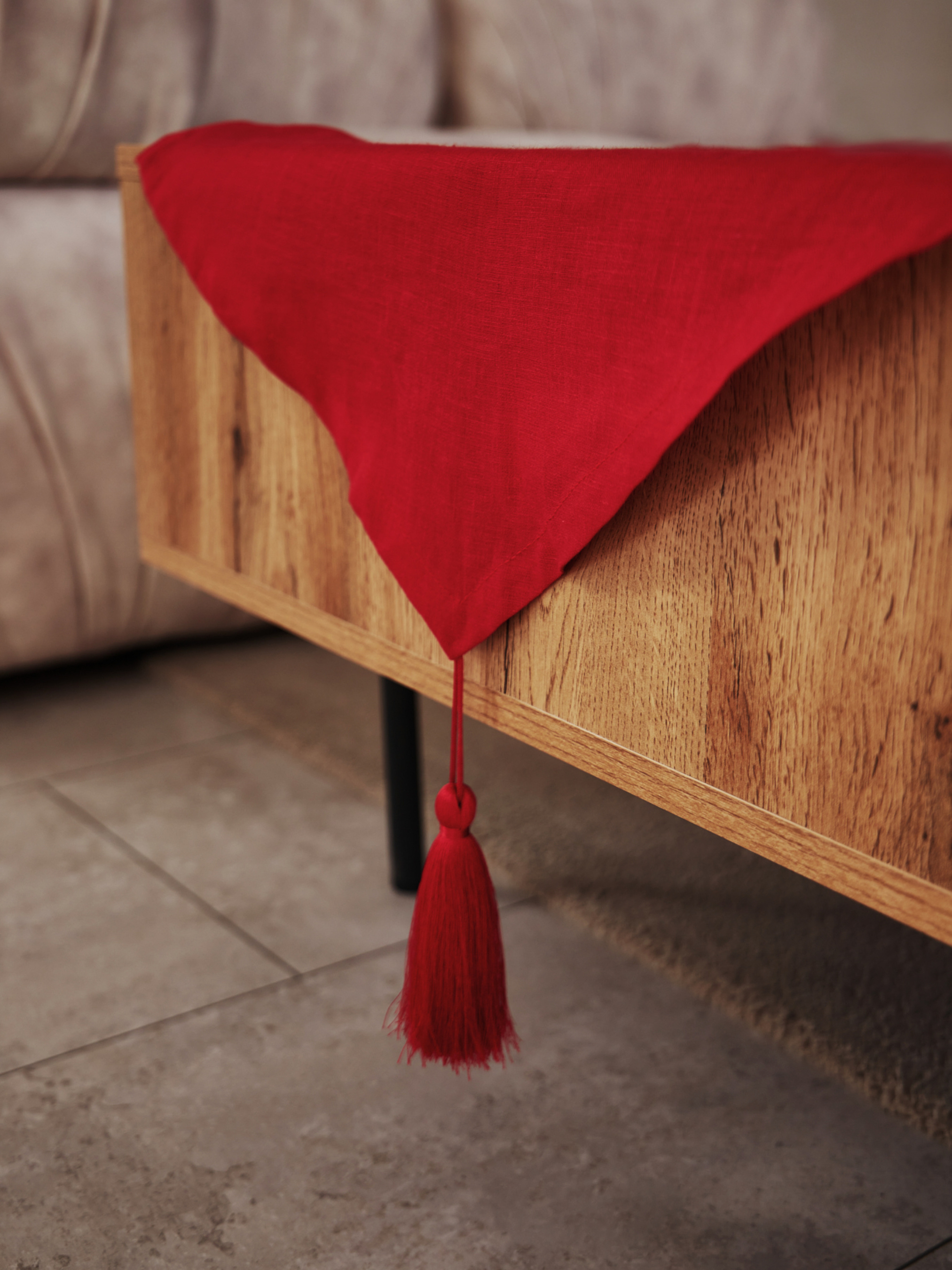 GNIZDOДоріжка на стіл (ранер) з льону з декоративними китицями в червоному кольорі