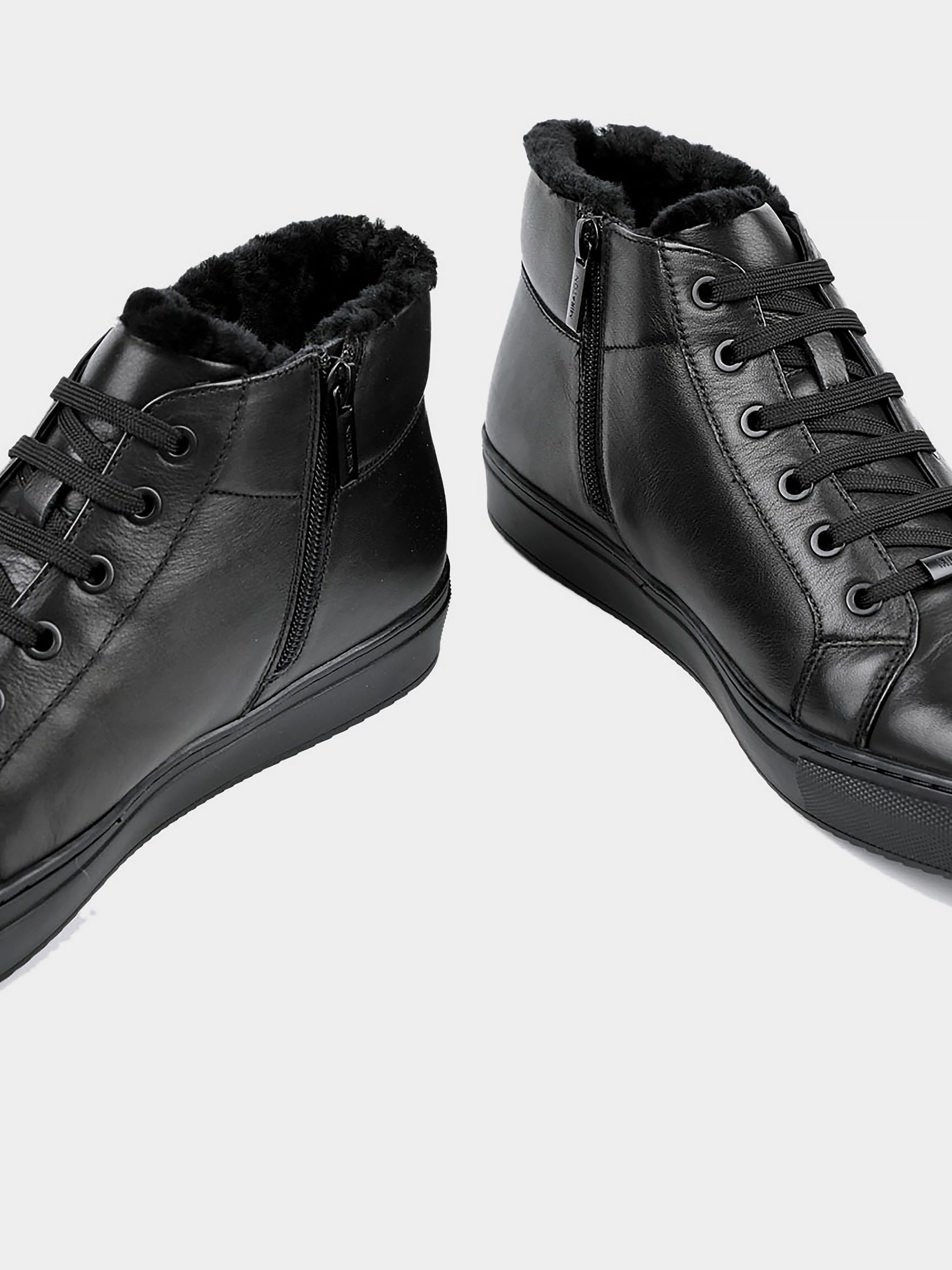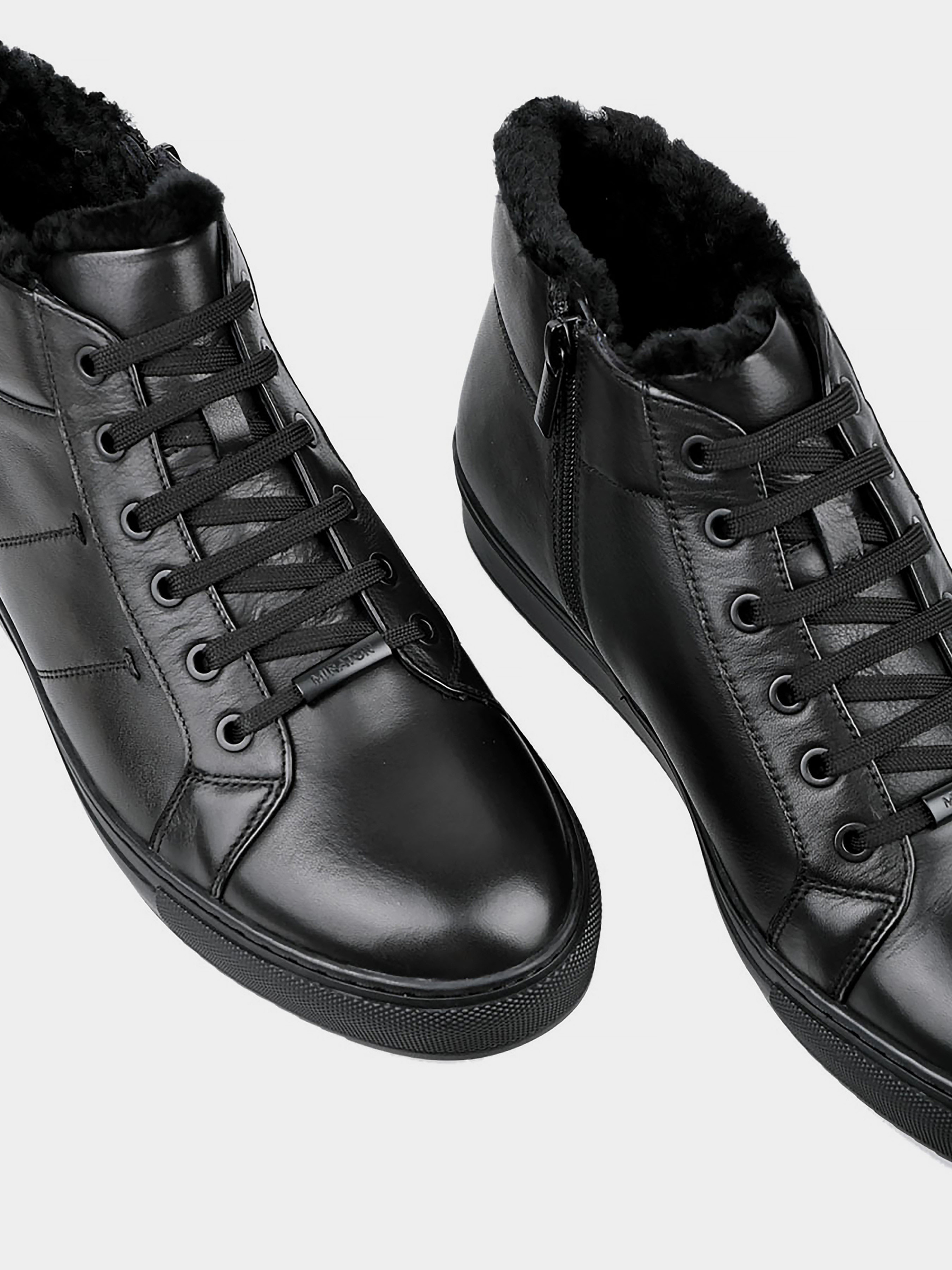 Мужские зимние кожаные ботинки MIRATON Подкладка: натуральный мех. Подошва: плоская. Каблук: без каблука. Цвет: черный. Застежка: молния. Декор: стежка.
