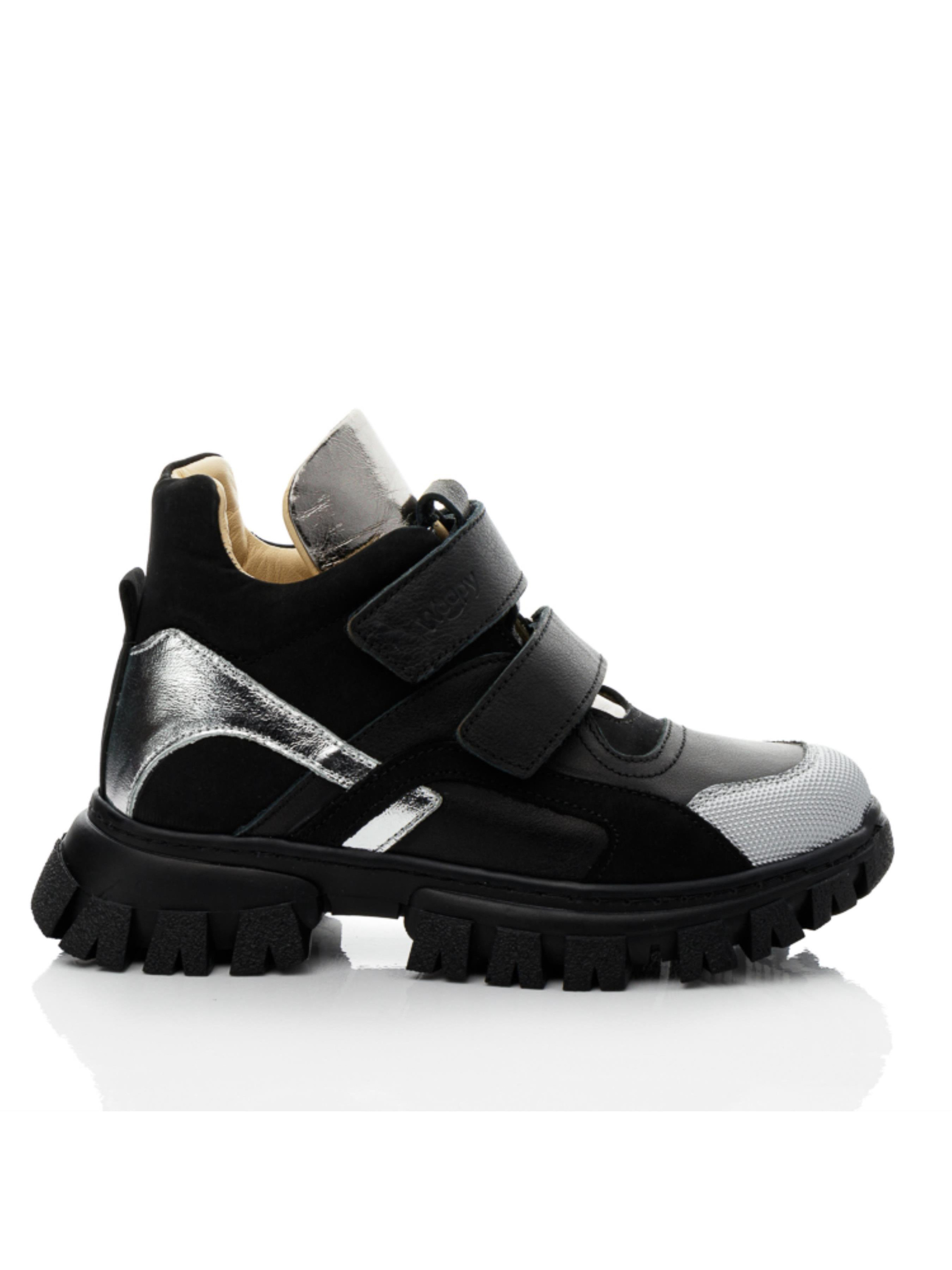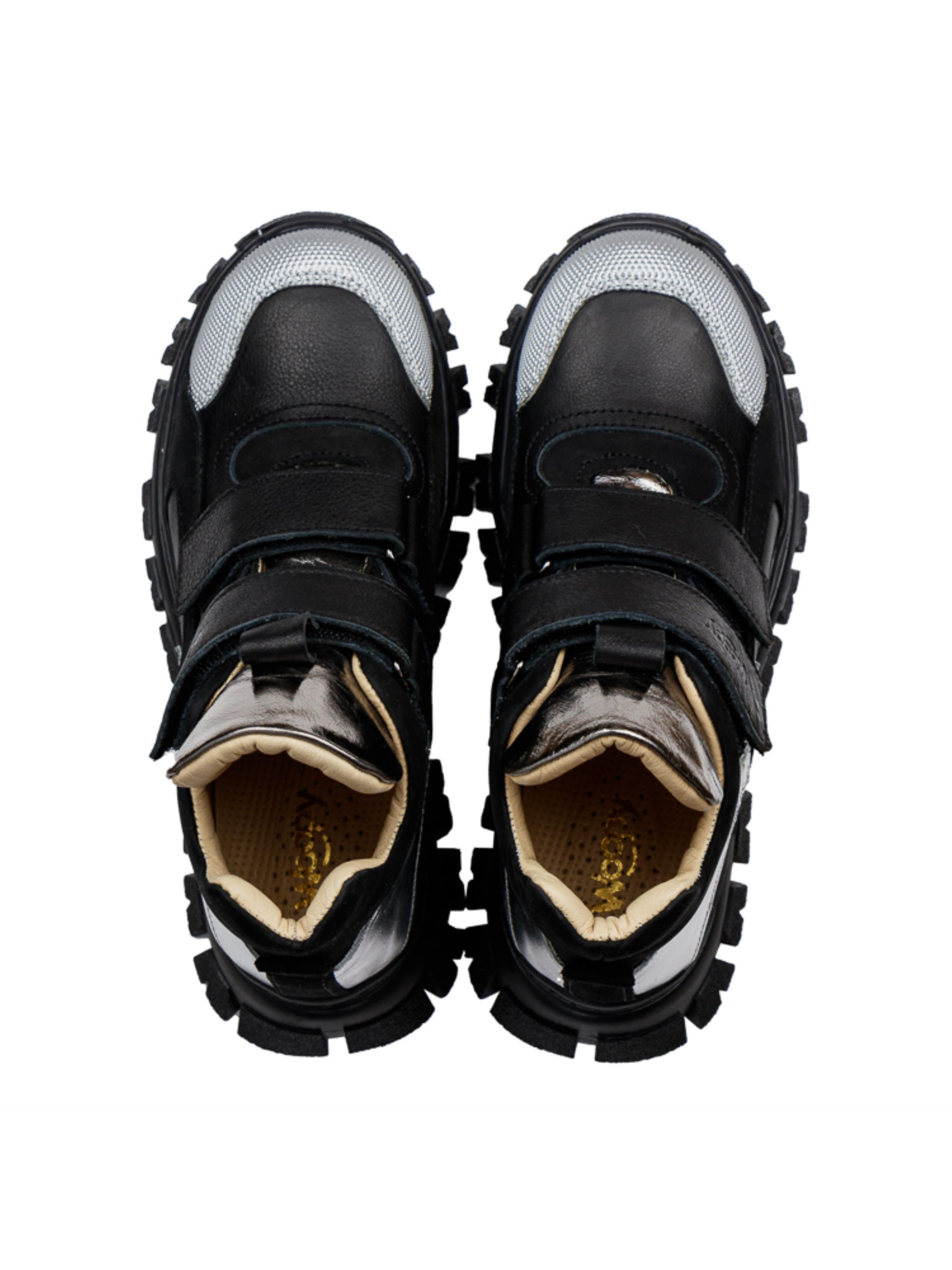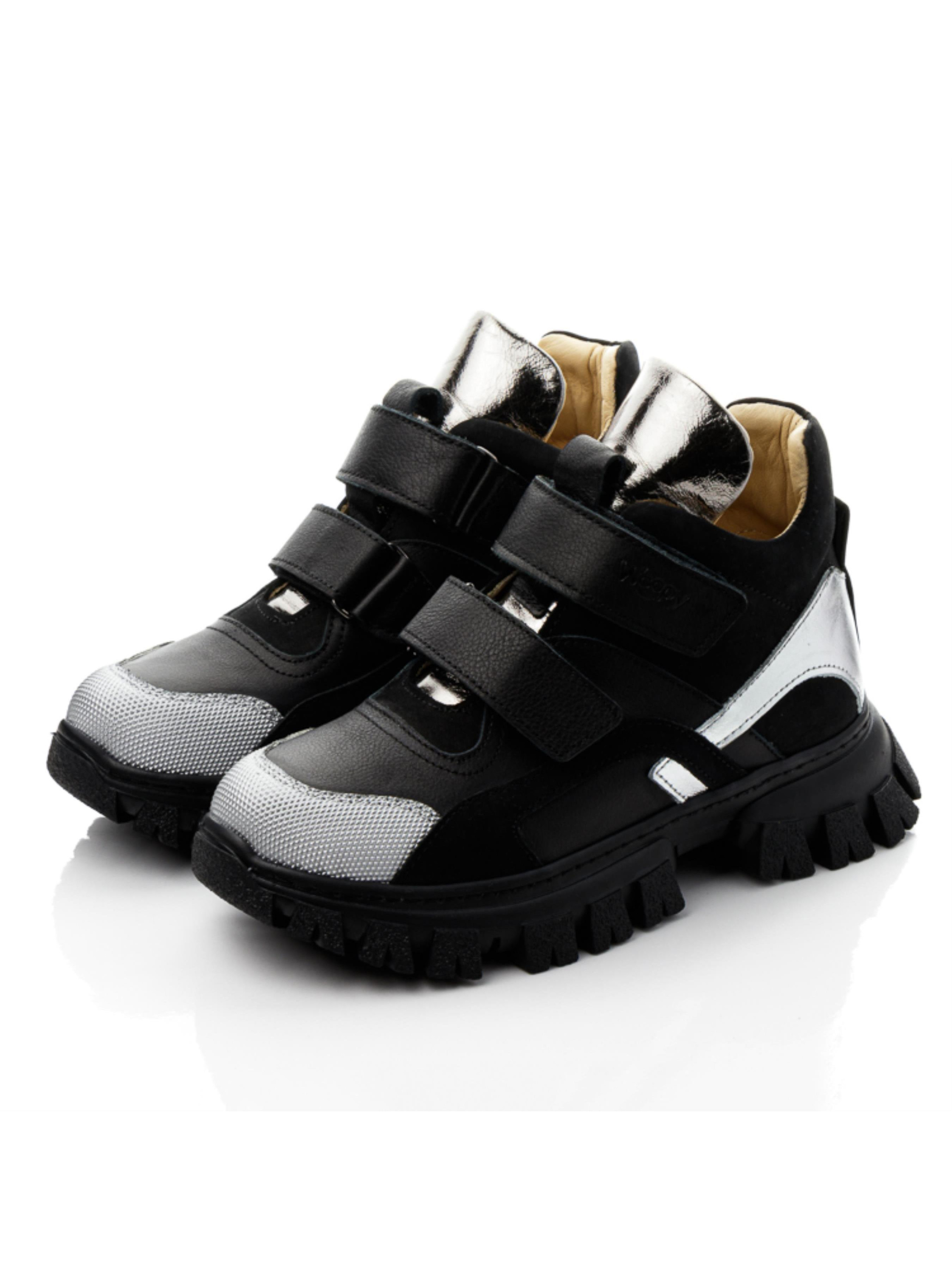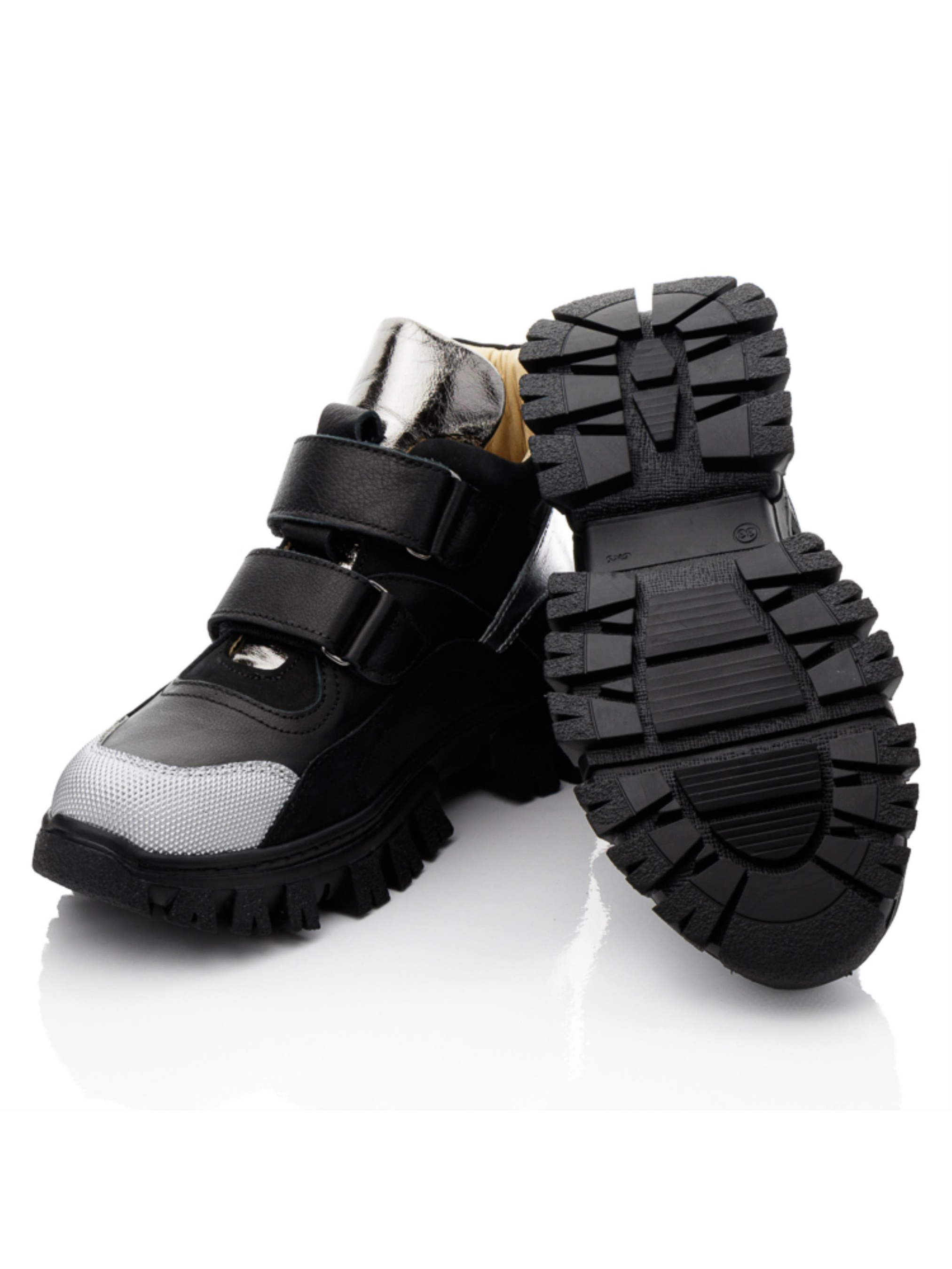 Удивительная пара демисезонных ботинок в таком исполнении позволит создать нереально крутые образы и гарантирует комфорт юной моднице в течение целого дня. Лаконические демисезонные ботинки для девочки пошиты в классическом черном цвете из натуральной гладкой кожи и нубука, внутри полностью кожаные. Стелька у модели анатомически правильная, имеет подушечку под свод стопы, пяточка жесткая. Максимально упростят процесс обувания надежные липучки. Мы уверены в том, что Вашу модницу такая модель ботинок очарует трендовой рифленой подошвой, которая вносит особый стильный акцент в дизайне модели. Подошва отлита из качественной термопластичной резины, она не скользкая, комфортная для стопы. Прекрасным дополнением дизайна выступают вставки серебряного цвета из натуральной кожи. А вставка из современного искусственного материала "неубивайка" надолго сохранит надлежащий вид обуви и защитит носок от повреждений.