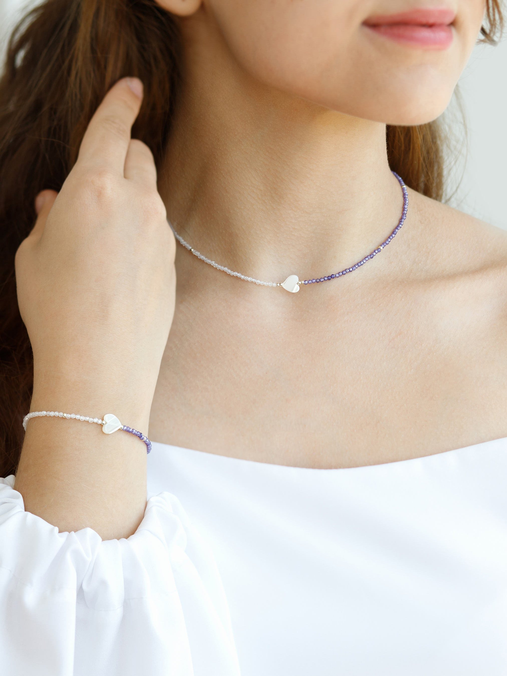 Насладитесь элегантной красотой нашего чокера Pearly Love. Украшенный потрясающими фиолетовыми и белыми цирконами, а также натуральным перламутром, этот чокер — это вневременное украшение, которое добавит изысканности любому наряду. Подчеркните свой стиль с помощью этого изысканного аксессуара. Код: 0104r Фурнитура: серебро родированное 0,6 г Камни: фиолетовый циркон 1,9 г, белый циркон 2,1 г, перламутр 0,31 г Вес 4,91 г Размер: ONE SIZE (39 см + 5 см цепочка удлинитель) ВНИМАНИЕ. Это изделие изготовлено вручную и является деликатным. Пожалуйста, следуйте нашим инструкциям по уходу, чтобы сохранить его в идеальном состоянии.
