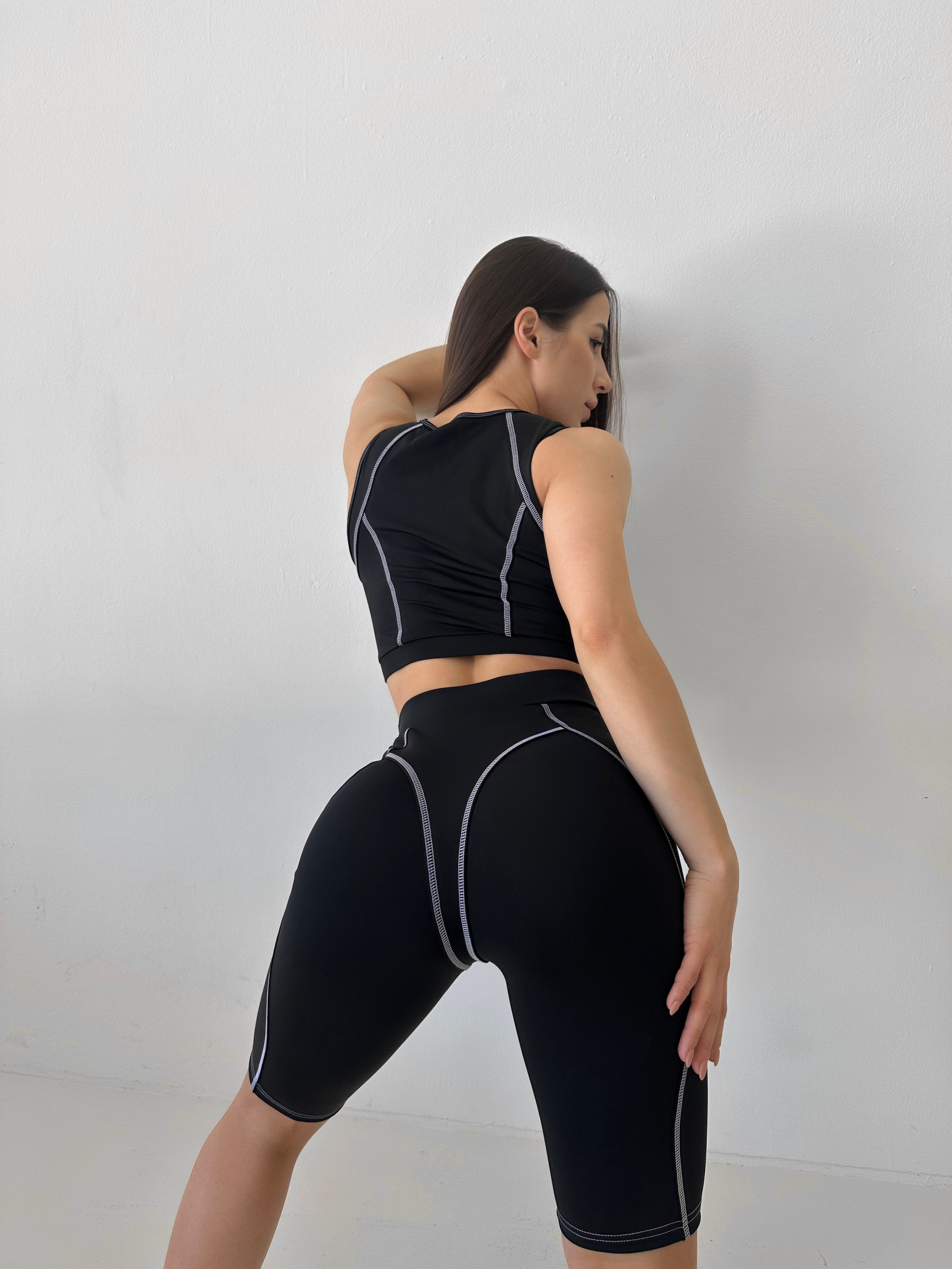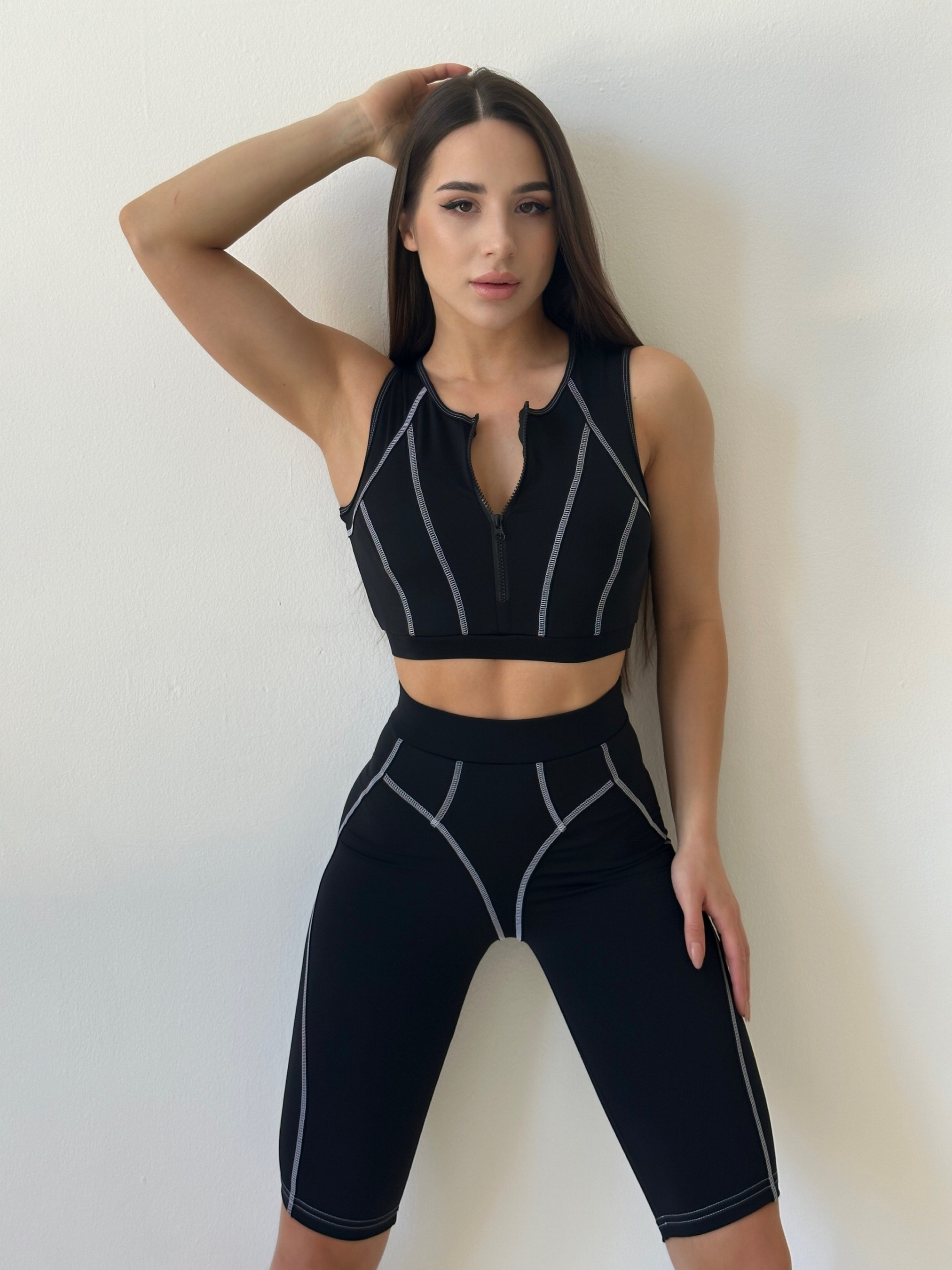Женский спортивный комплект Nova Vega. В комплект входят велосипедки и топ для занятий в зале или на открытом воздухе. Топ на змейке. Велосипедки с декоративными швами в виде трусиков создают пушап эффект и выгодно подчёркивают Ваши ягодицы. Комплект сделан из высококачественного Бифлекса. Особенностями данного материала является износостойкость, Бифлекс хорошо впитывает влагу и пропускает воздух, так же материал очень хорошо тянется и не теряет при этом своей формы, а плотный материал не просвечивается во время приседаний.