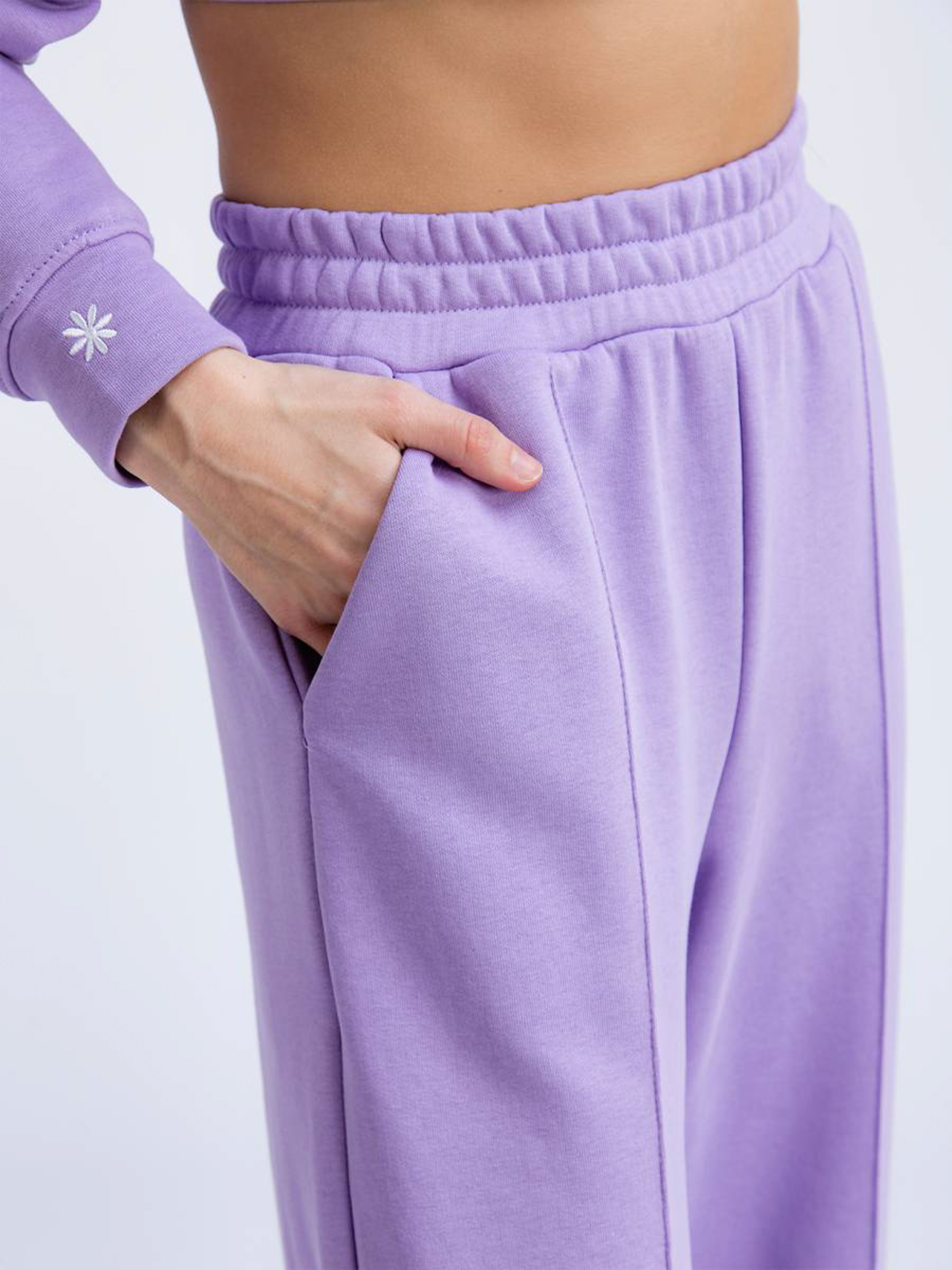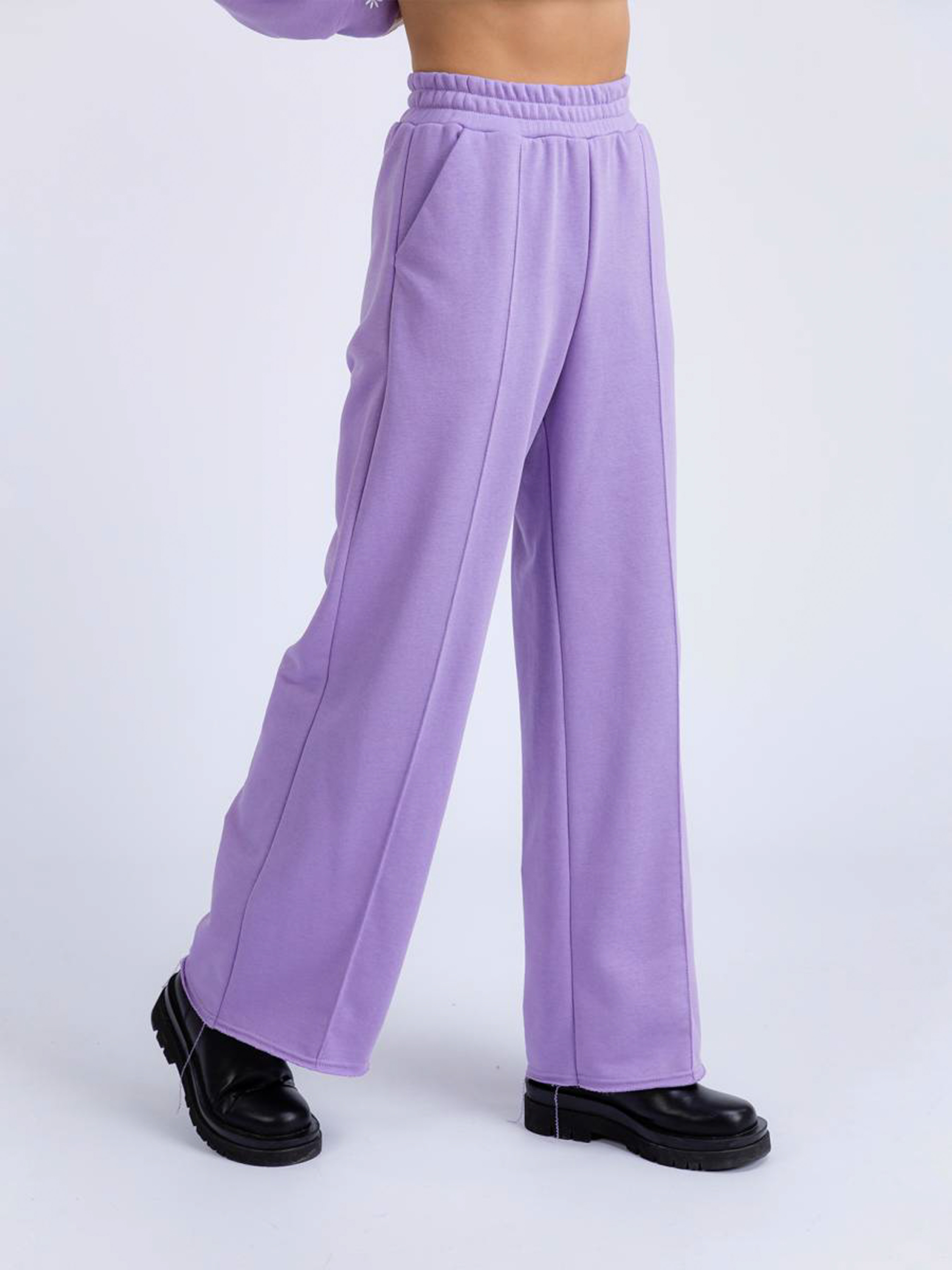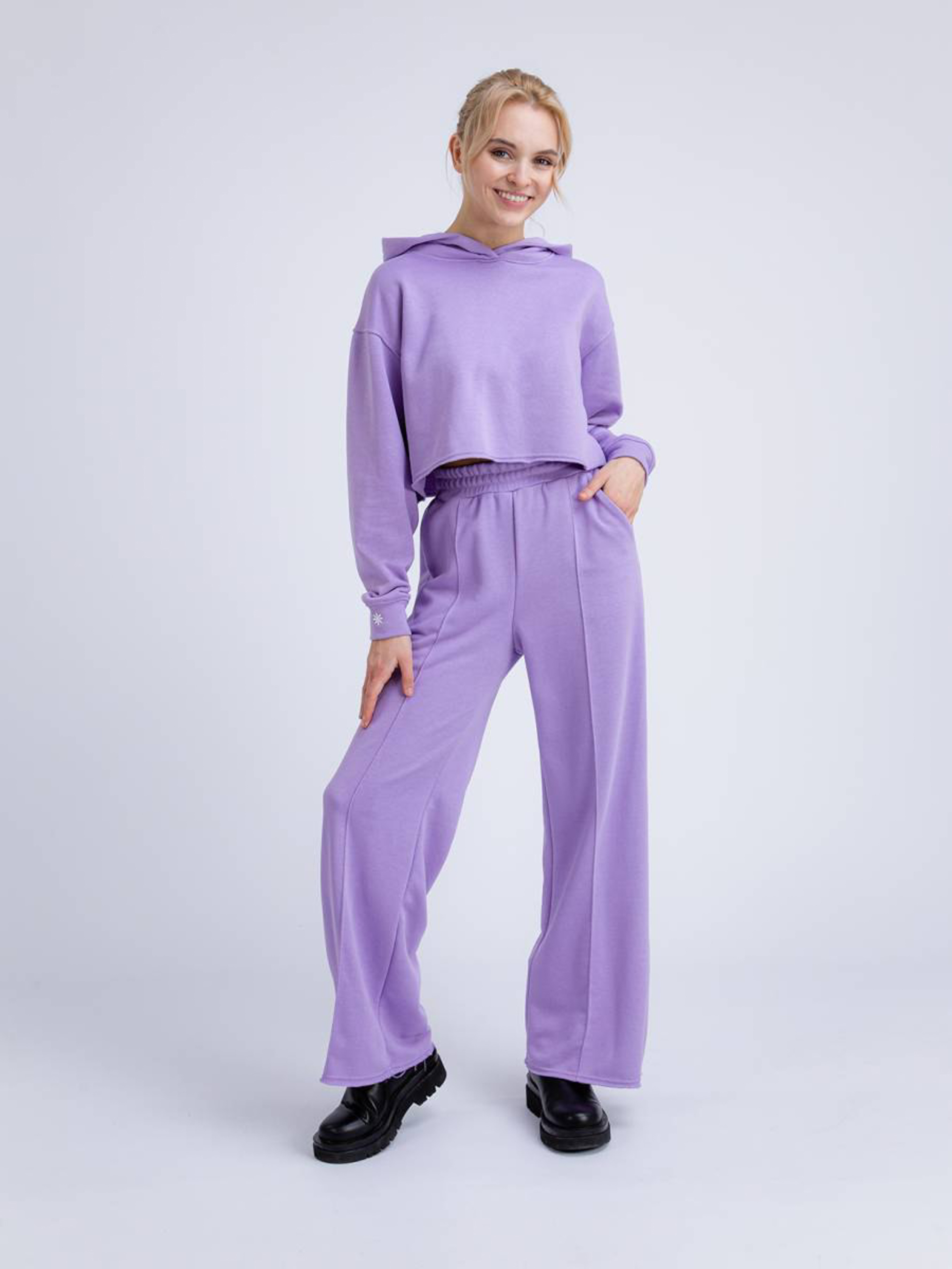 Свободные брюки на высокой посадке в спортивном стиле. Снизу эффект необработанного края. Удобные глубокие глубокие карманы. Талия на резинке. К комплекту можно приобрести укороченное худи аналогичного цвета. Целостный образ отлично будет смотреться со спортивной обувью и собранной прической. Добавить можно шоппер или рюкзак. XS : Длина по внутреннему шву : 79 см Длина по внешнему шву : 103 см Полуобхват бедер: 52 см Ширина по низу: 28,5 см Посадка : 31 см Полуобхват талии: 27 см S : Длина по внутреннему шву: 80 см Длина по внешнему шву: 106 см Полуобхват бедер: 52 см Ширина по низу : Ширина штанины снизу 28,5 см Посадка : 32,5 см Полуобхват талии: 30 см M : Длина по внутреннему шву : 80 см Длина по внешнему шву : 106 см Полуобхват бедер: 52 см Ширина по низу : Ширина штанины снизу 28,5 см Посадка : 32,5 см Полуобхват талии: 30 см L : Длина по внутреннему шву : 80 см Длина по внешнему шву: 108 см Полуобхват бедер: 53 см Ширина по низу : Ширина штанины снизу 30 см Посадка : 33 см Полуобхват талии : 31 см