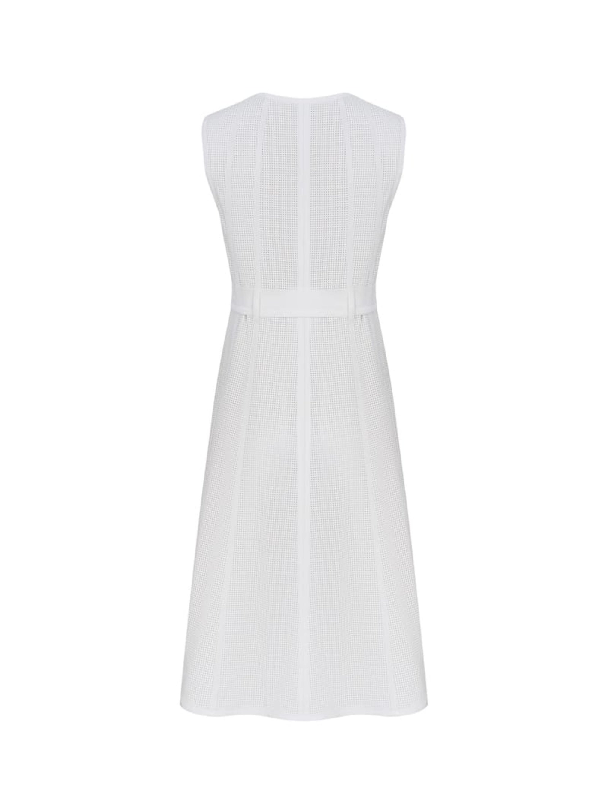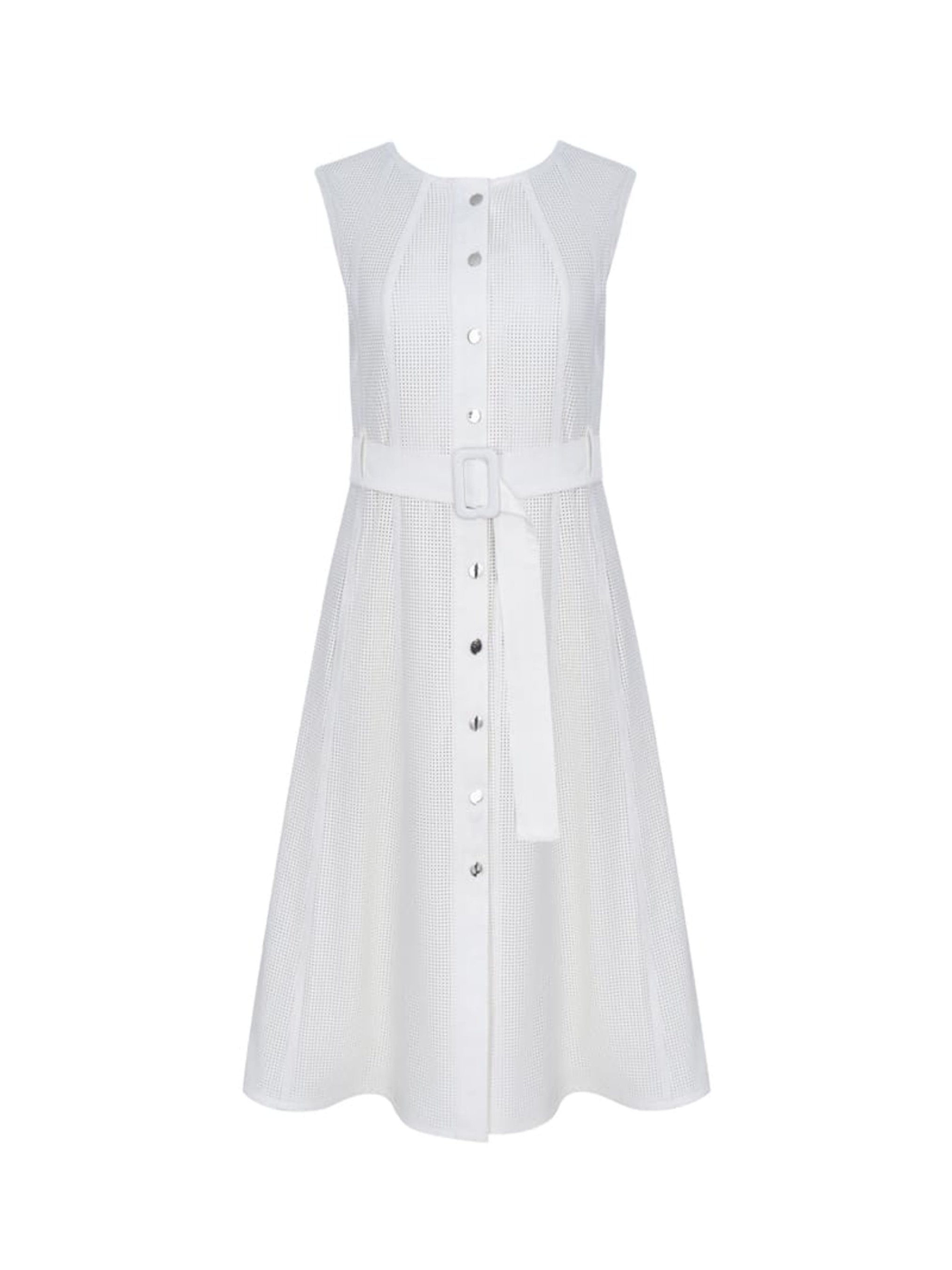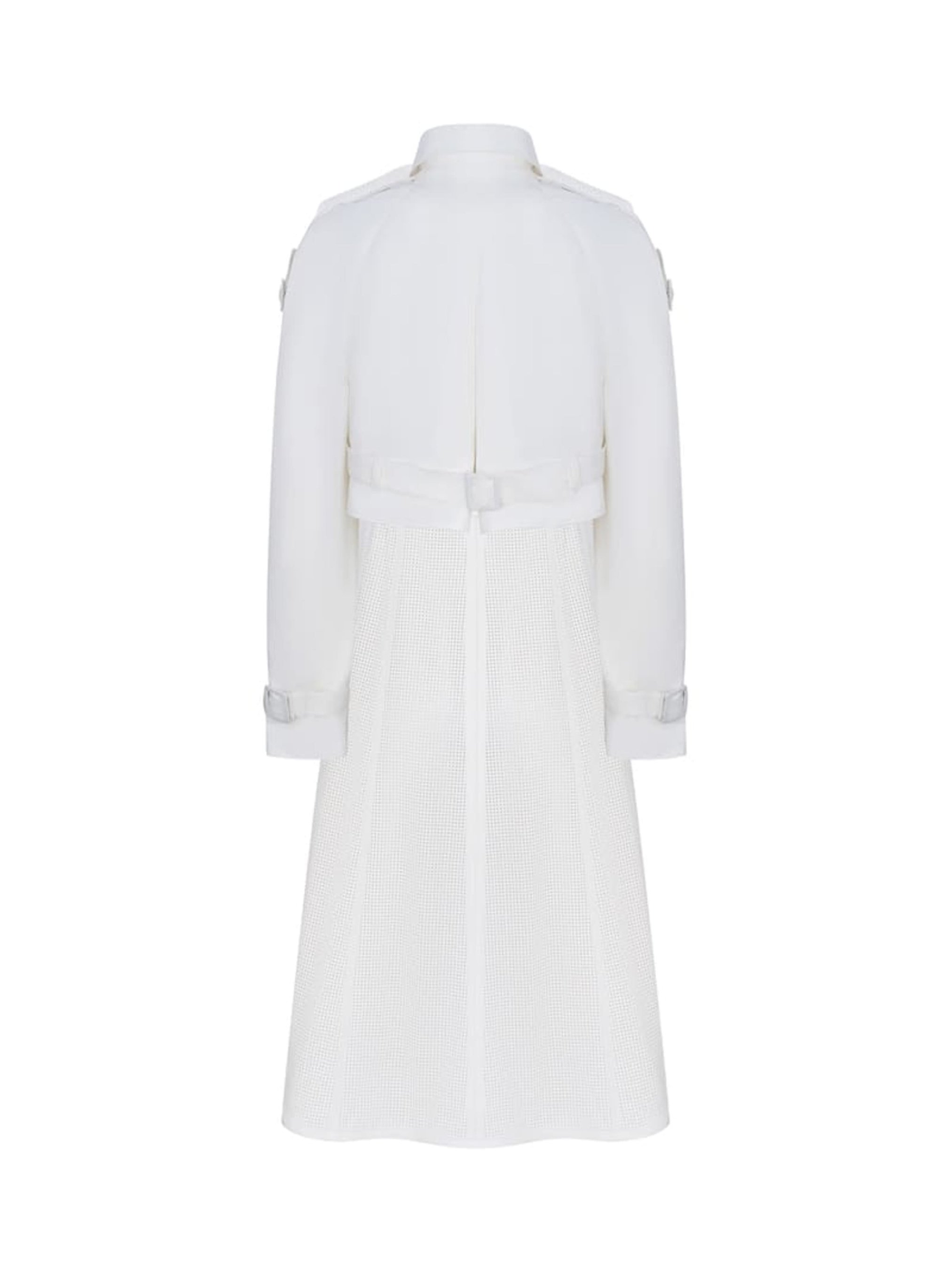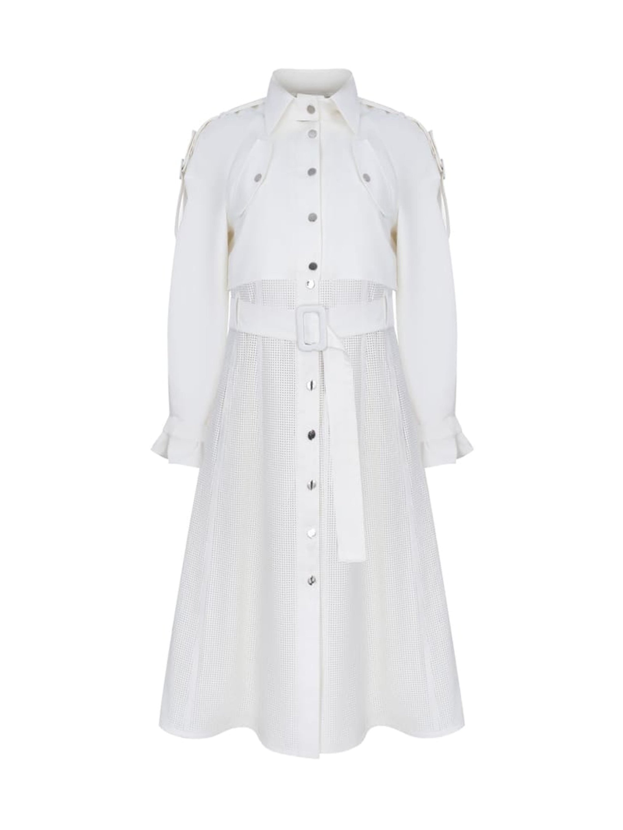 «Тренч Companula сочетается с сарафаном из перфорированной экокожи и короткой курткой из плащевки молочного цвета. Подкладка 100% вискоза. Застежка – кнопки. Имеет шпильки с пряжками. Длина тренча миди.