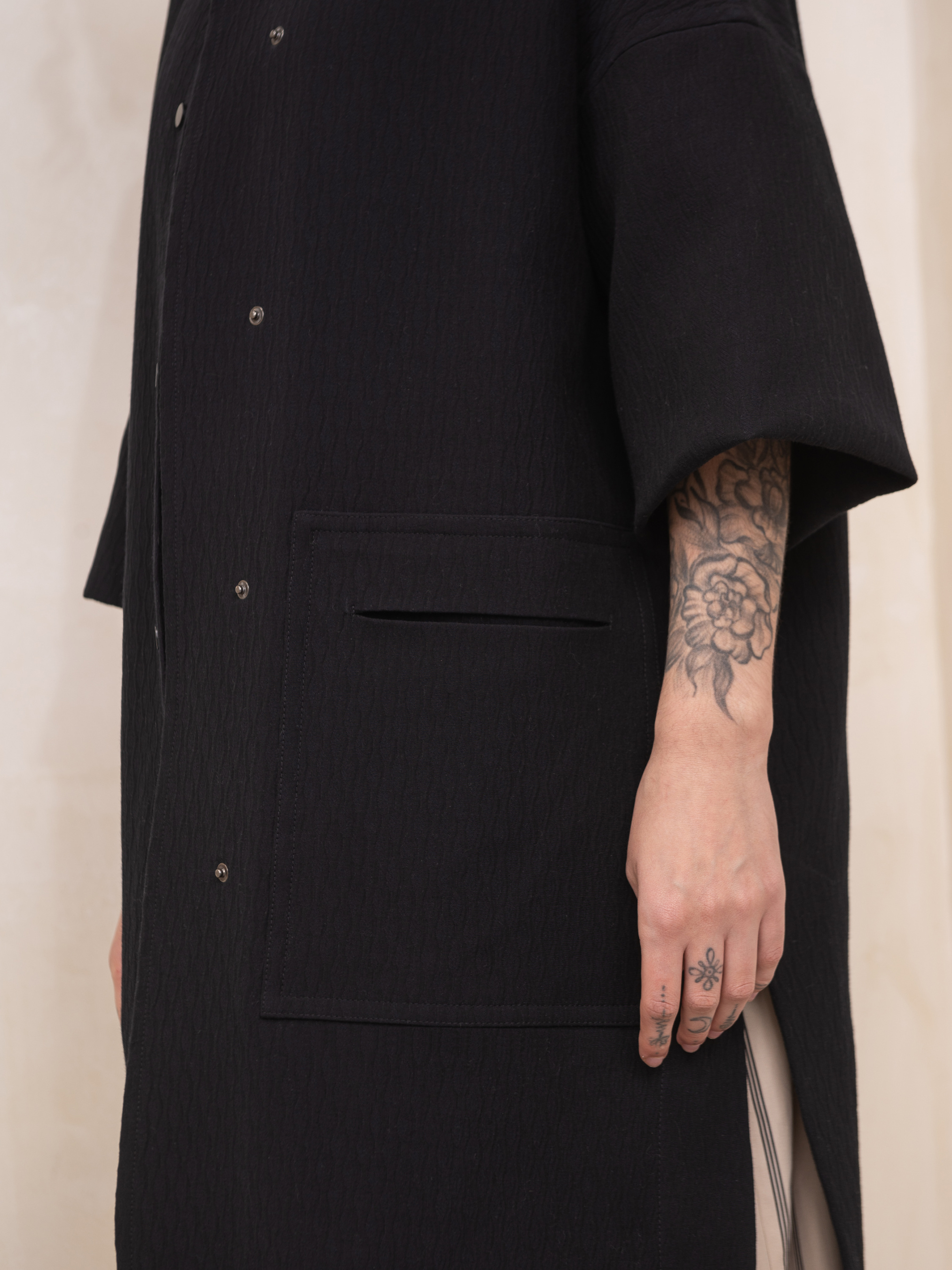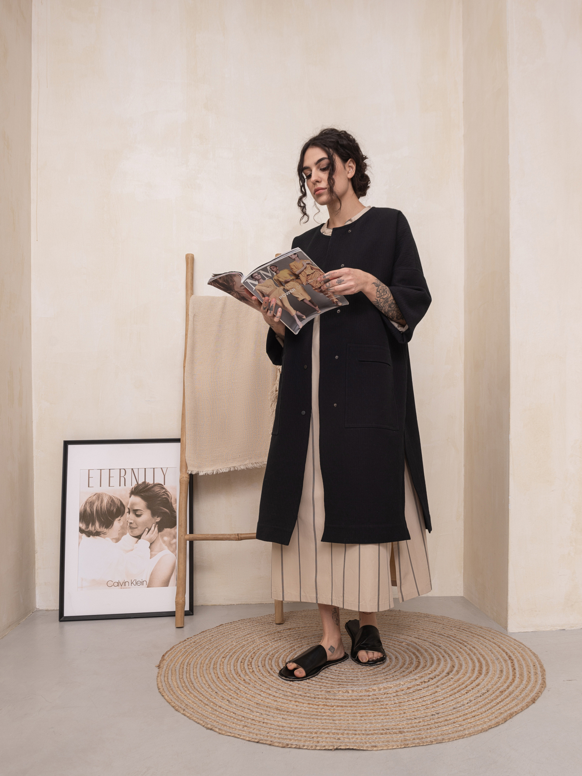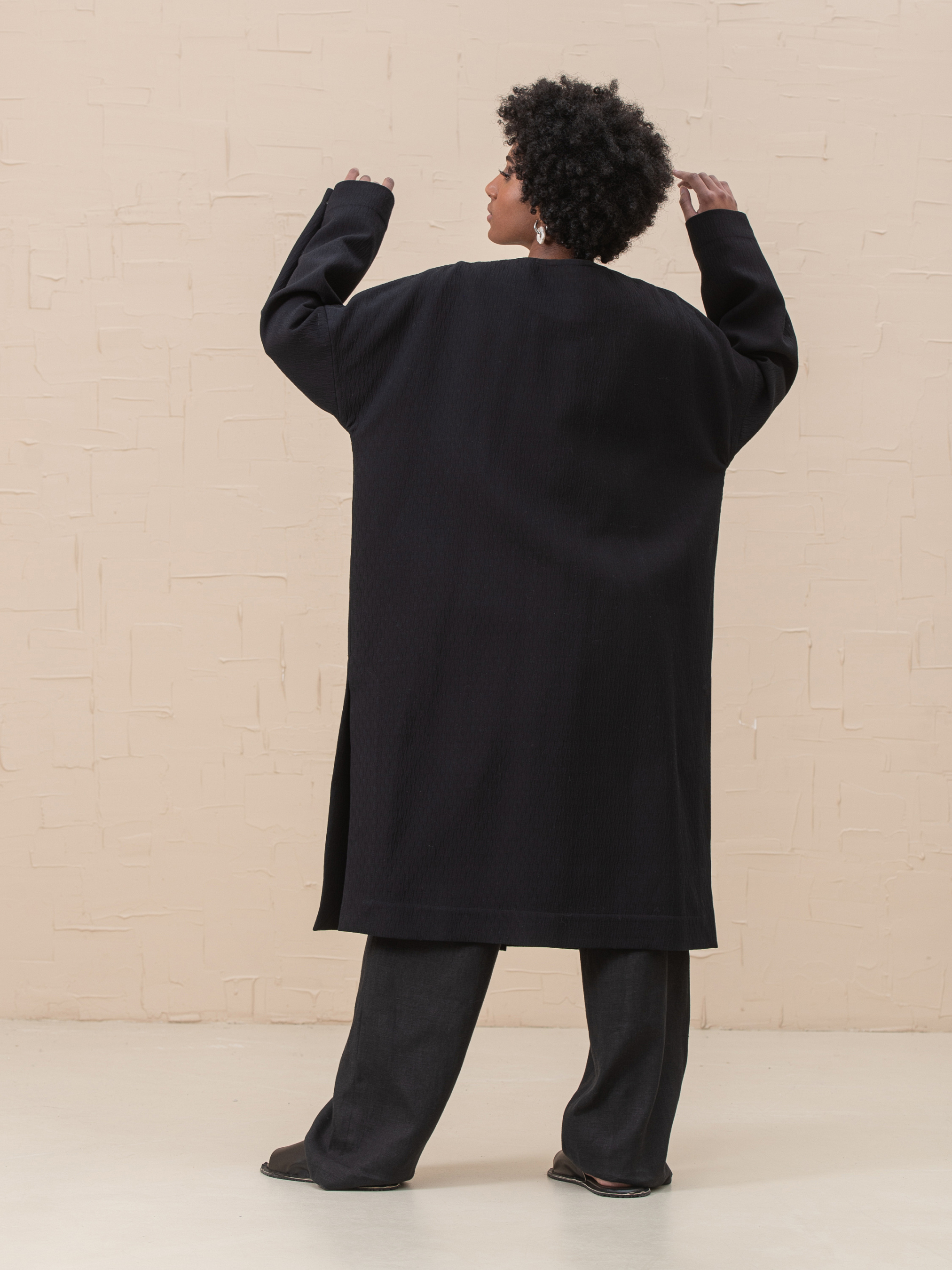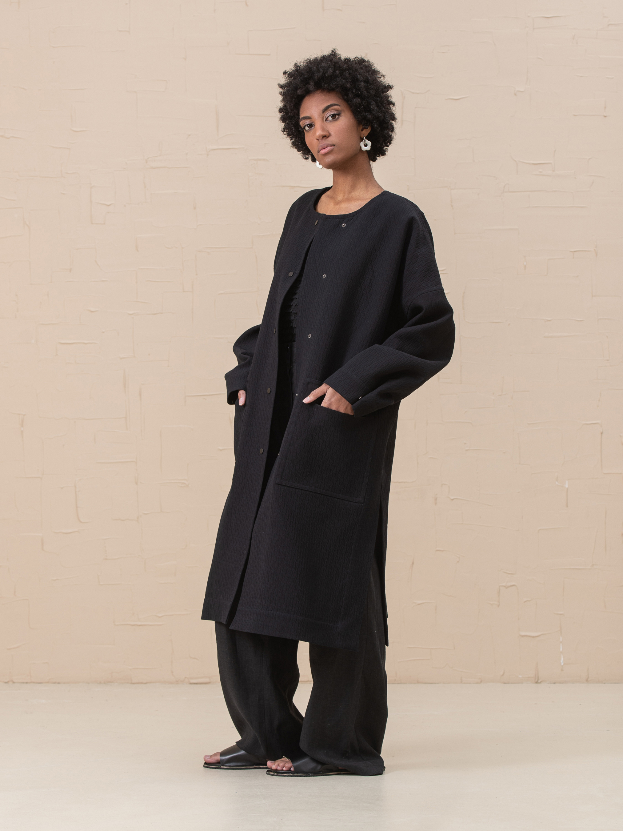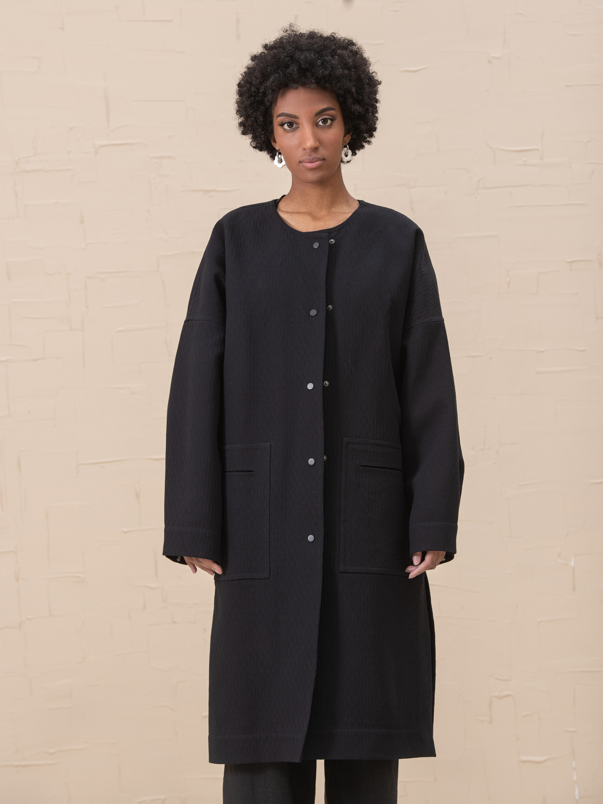 Пальто Florence - это объемное, без подкладки, пальто расслабленного стиля. Оно имеет бескомерный вырез горловины и застежку на кнопках, спущенные плечи, накладные карманы и длинные рукава с регулируемой длиной, боковые разрезы. Швы окантованы по краям. Хлопок 39%, полиамид 33%, вискоза 28% Наш размер One size: Грудь 130cm, Талия 130cm, Бедра 130cm, Длина 108cm, Длина рукава 83cm, Ширина рукава 42cm, Ширина низа рукава 42cm. Размер XS-XXL.