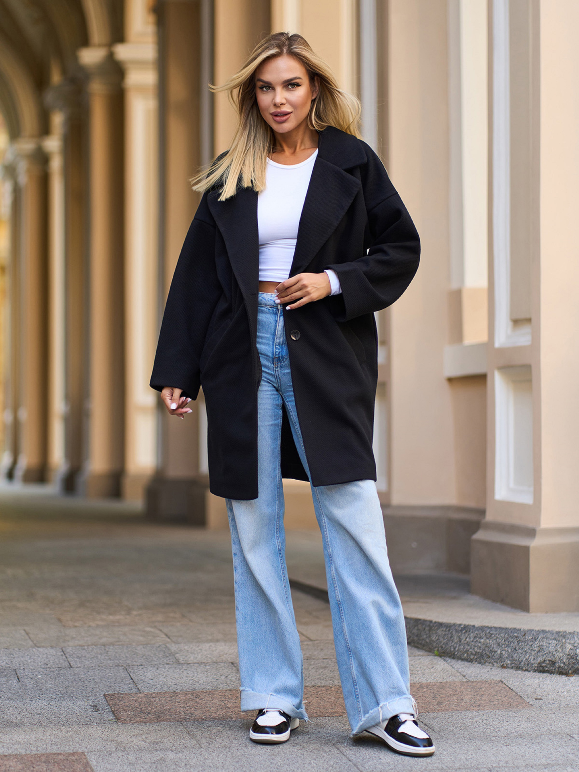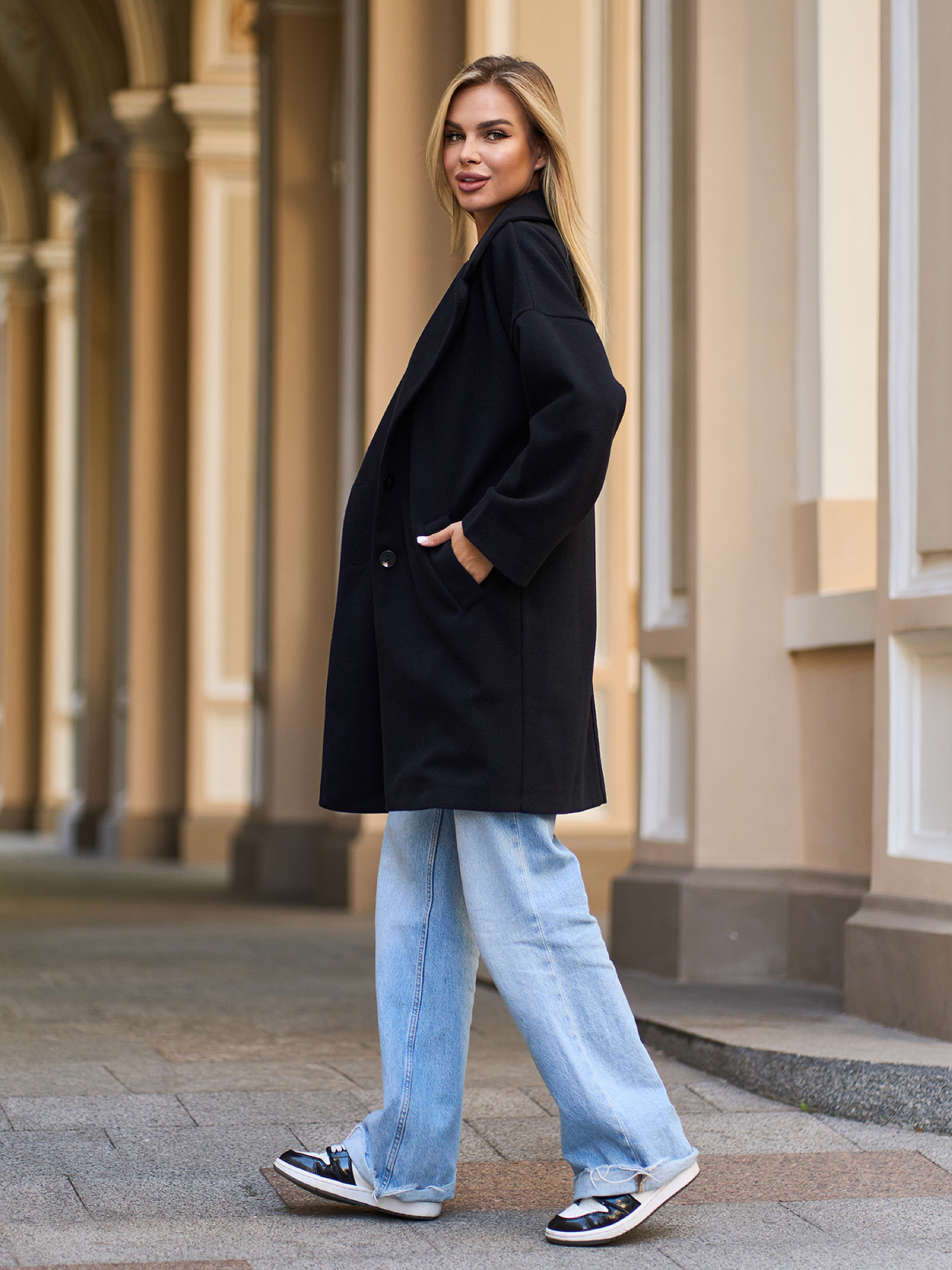 Свободное черное пальто-кокон, выполненное из фактурного пальтового кашемира. Пальто с длинными приспущенными с плеч рукавами и боковыми карманами. Модель на пуговице с английским воротником и длиной до колен. Модель без подкладки. Полуобхват: Грудь: S (56), M (58), L (60), XL (62), Талия: S (54), M (56), L (58), XL (60), Бедра: S (52), M (54), L (56), XL (58), Длина изделия - 89, Рукав - 44, Ткань: Низкой эластичности.