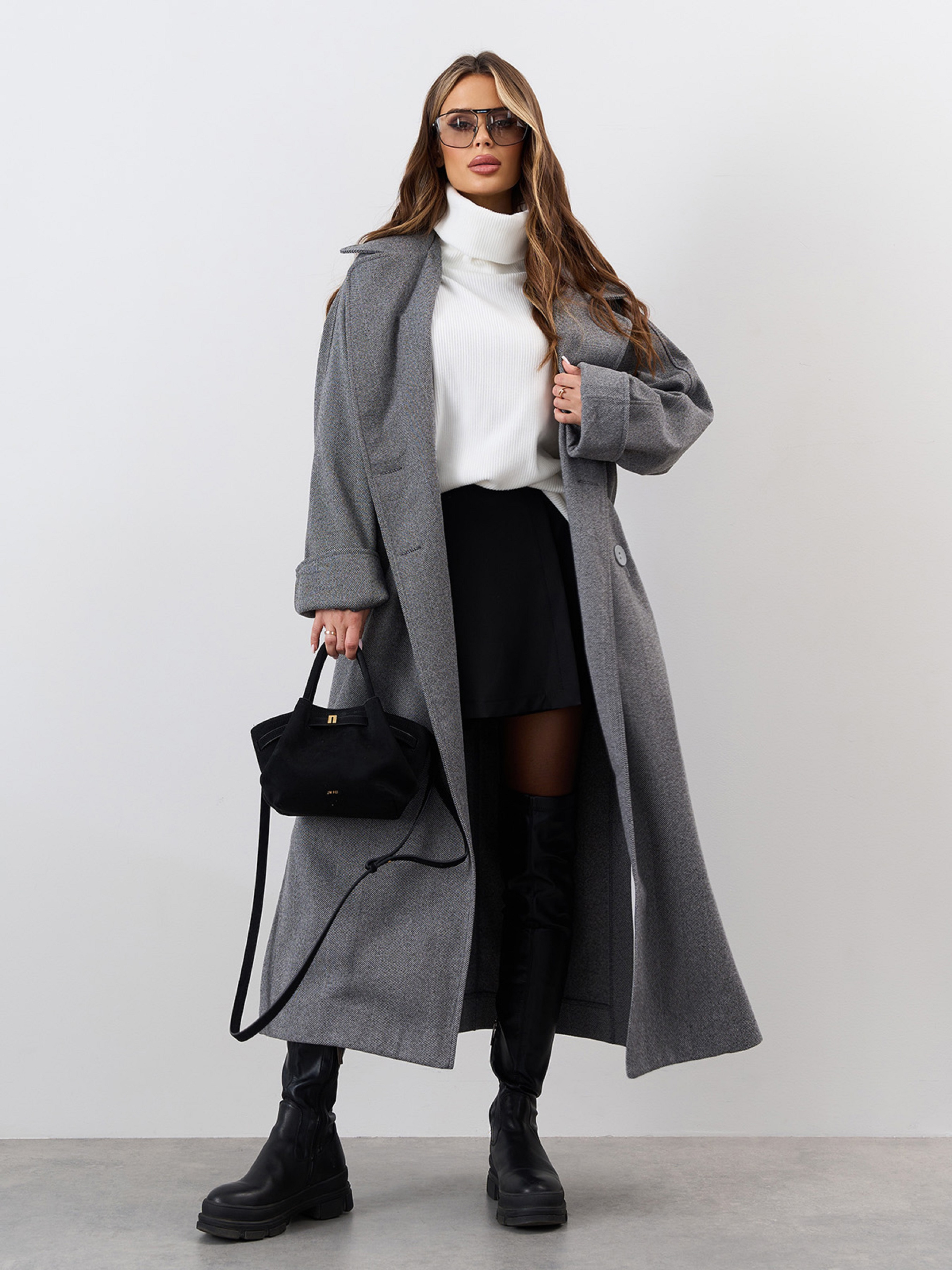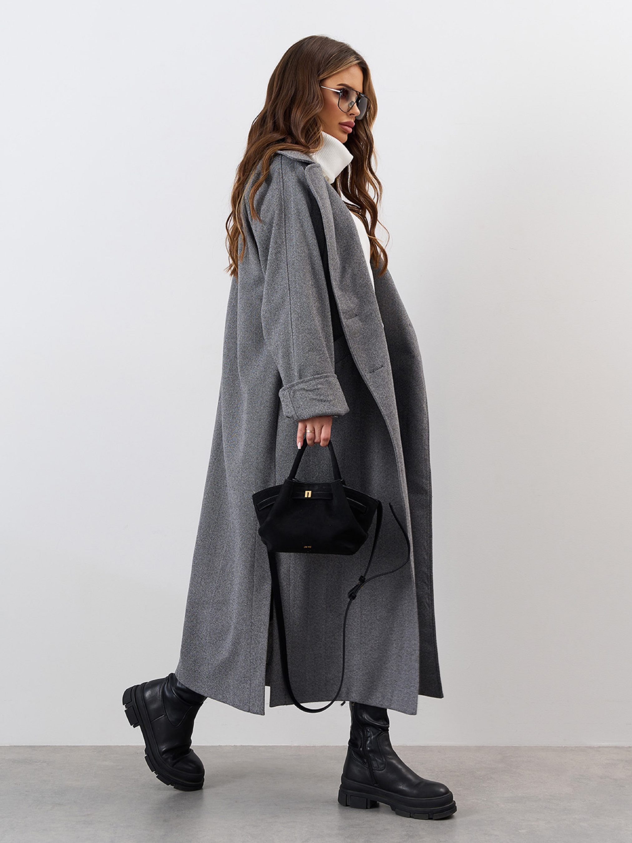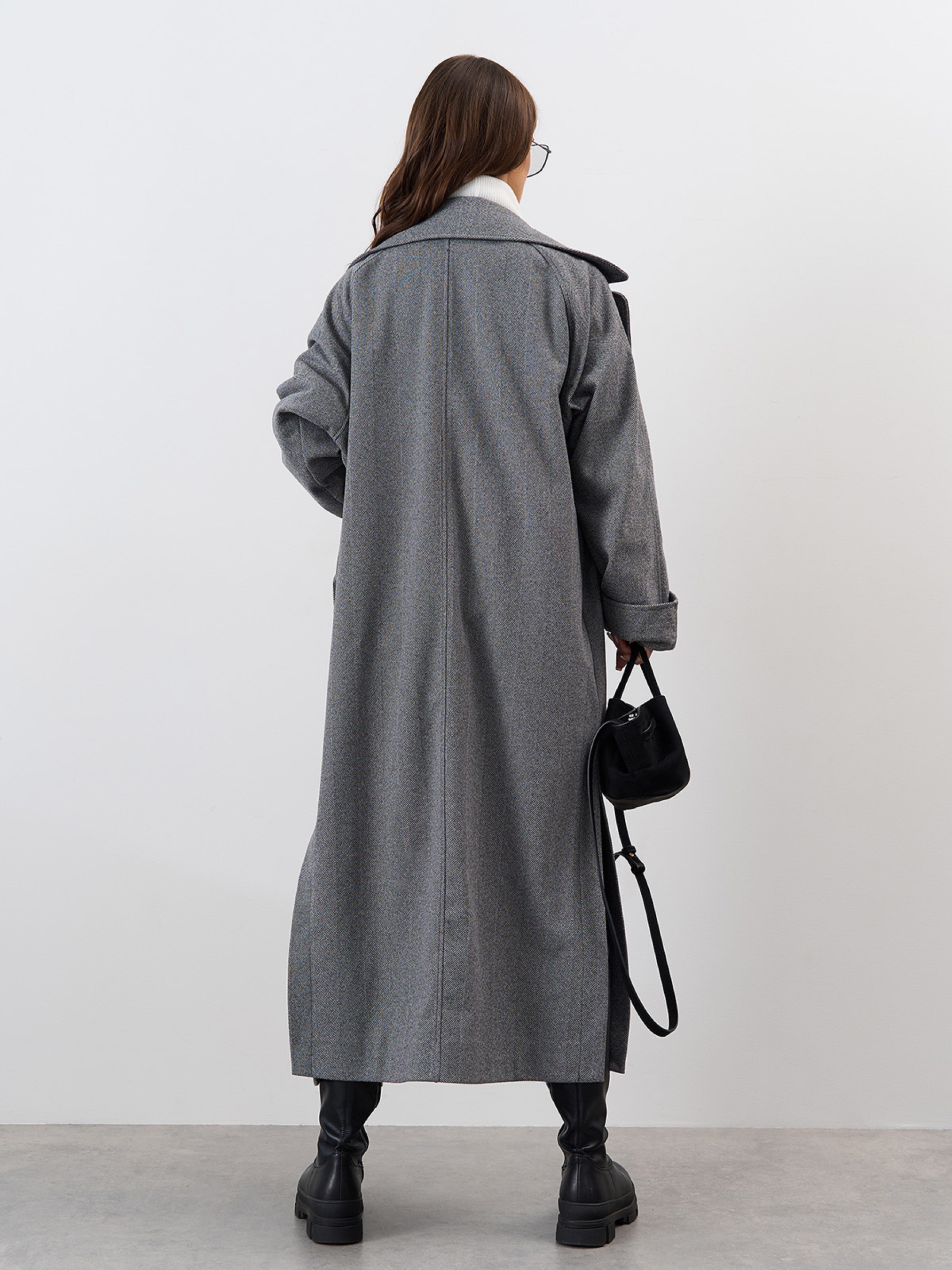 Кашемировое серое пальто кокон со свободным кроем и фактурой в елочку. Модель на пуговицах с воротником и длинными рукавами-реглан. Пальто оснащено карманами и боковыми разрезами. Пальто без нижнего подклада. Полуобхват: Грудь: S (60), M (62), L (64), XL (66), XXL (68), 3XL (70), Талия: S (58), M (60), L (62), XL (64), XXL (66), 3XL (68), Бедра: S (58), M (60), L (62), XL (64), XXL (66), 3XL (68), Длина изделия -115-122*, Рукав - 60, Ткань: Низкой эластичности.