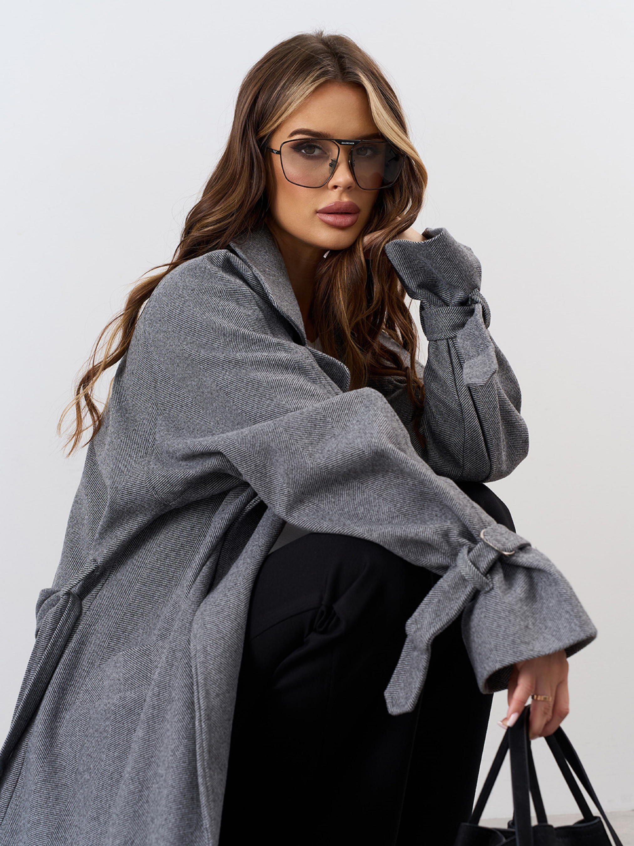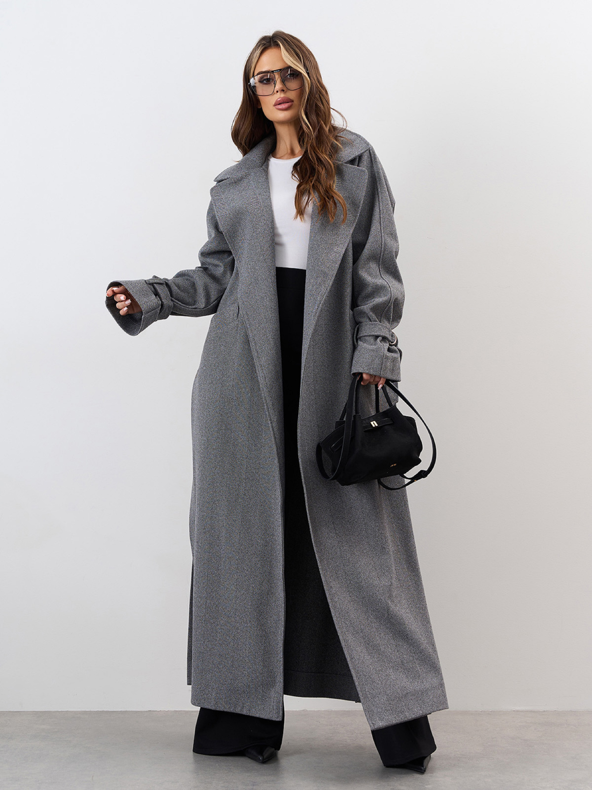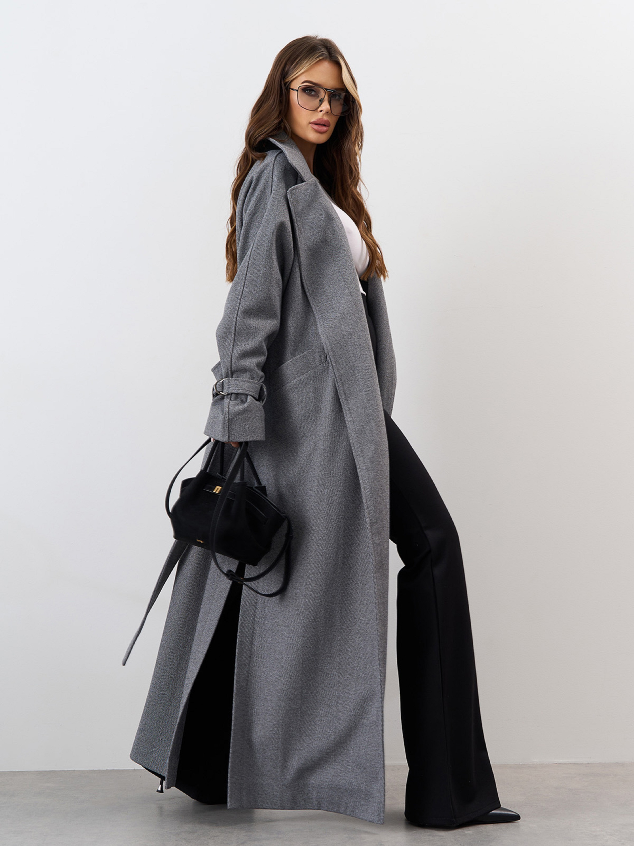 Серое кашемировое пальто с фактурой елочка. Полуобхват: Грудь: S (59), M (61), L (63), XL (65), XXL (67), 3XL (69), Талия: S (55), M (57), L (59), XL (61), XXL (63), 3XL (65), Бедра: S (59), M (61), L (63), XL (65), XXL (67), 3XL (69), Длина изделия - 136, Рукав - 60, Ткань: Низкой эластичности.