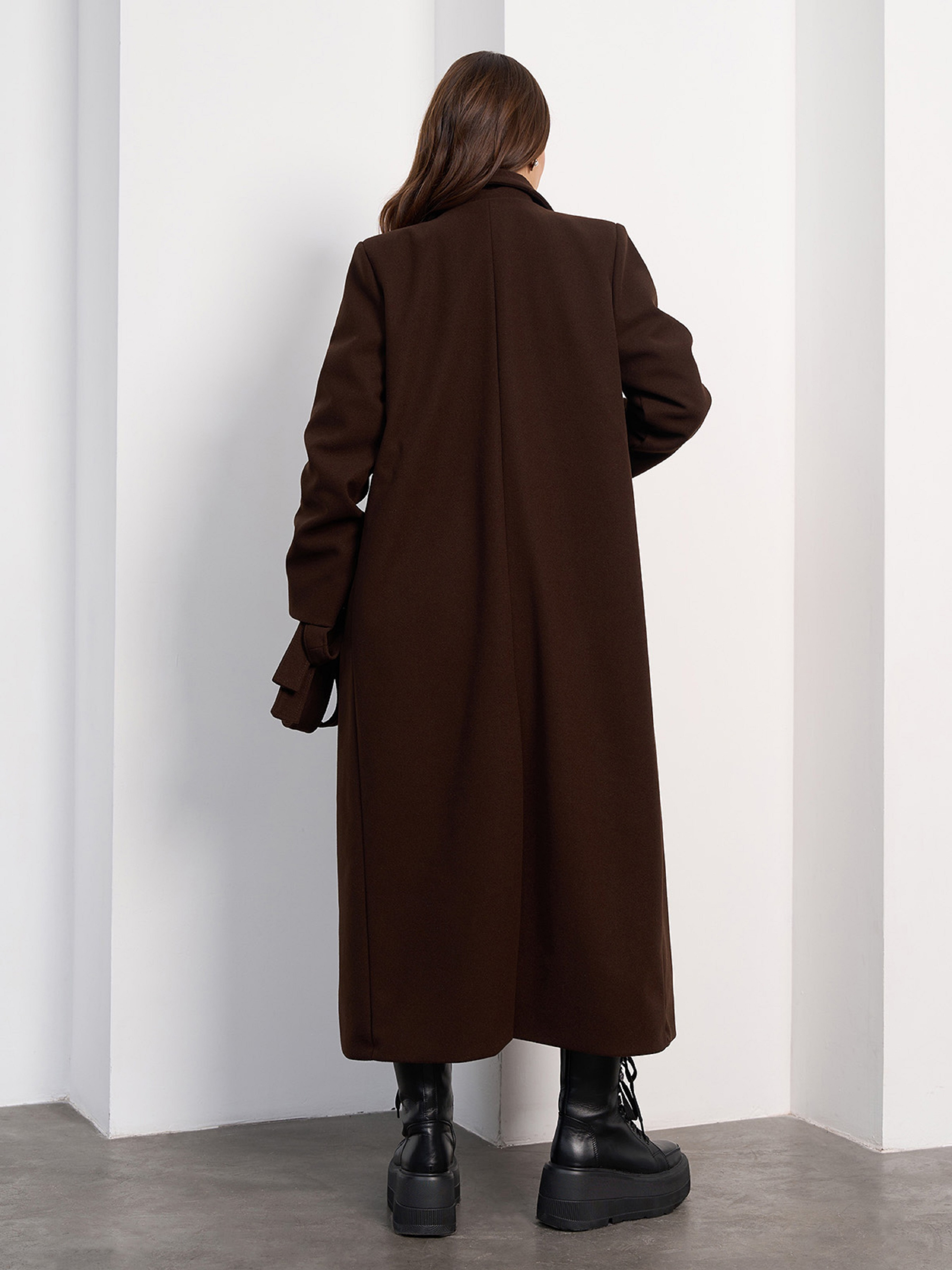 Темно-коричневое двубортное пальто на пуговицах, выполненное из кашемира с нижним текстильным подкладом. Пальто миди длины с прямым кроем, английским воротником и поясом. Пальто с карманами и нагрудной листочкой. Полуобхват: Грудь: S (51), M (53), L (55), XL (57), XXL (59), 3XL (61), Талия: S (51), M (53), L (55), XL (57), XXL (59), 3XL (61), Бедра: S (51), M (53), L (55), XL (57), XXL (59), 3XL (61), Длина изделия - 123, Рукав - 63, Ткань: Низкой эластичности.