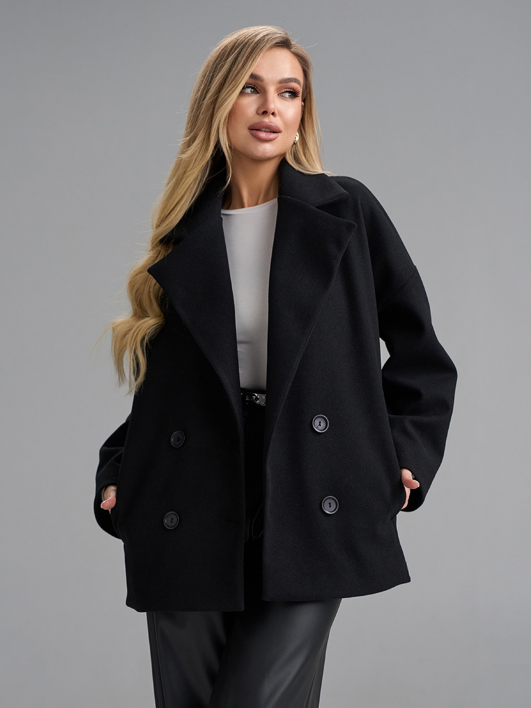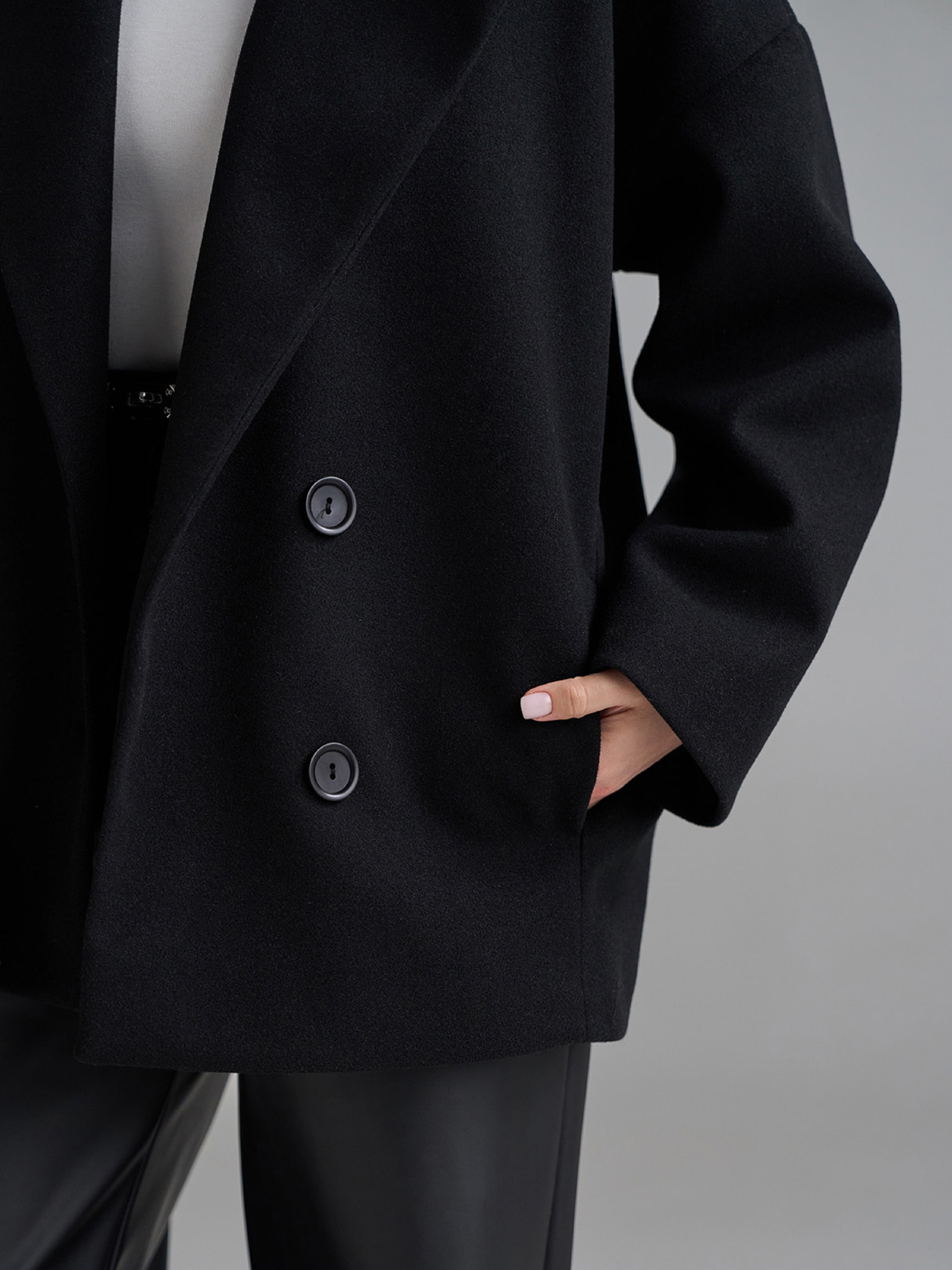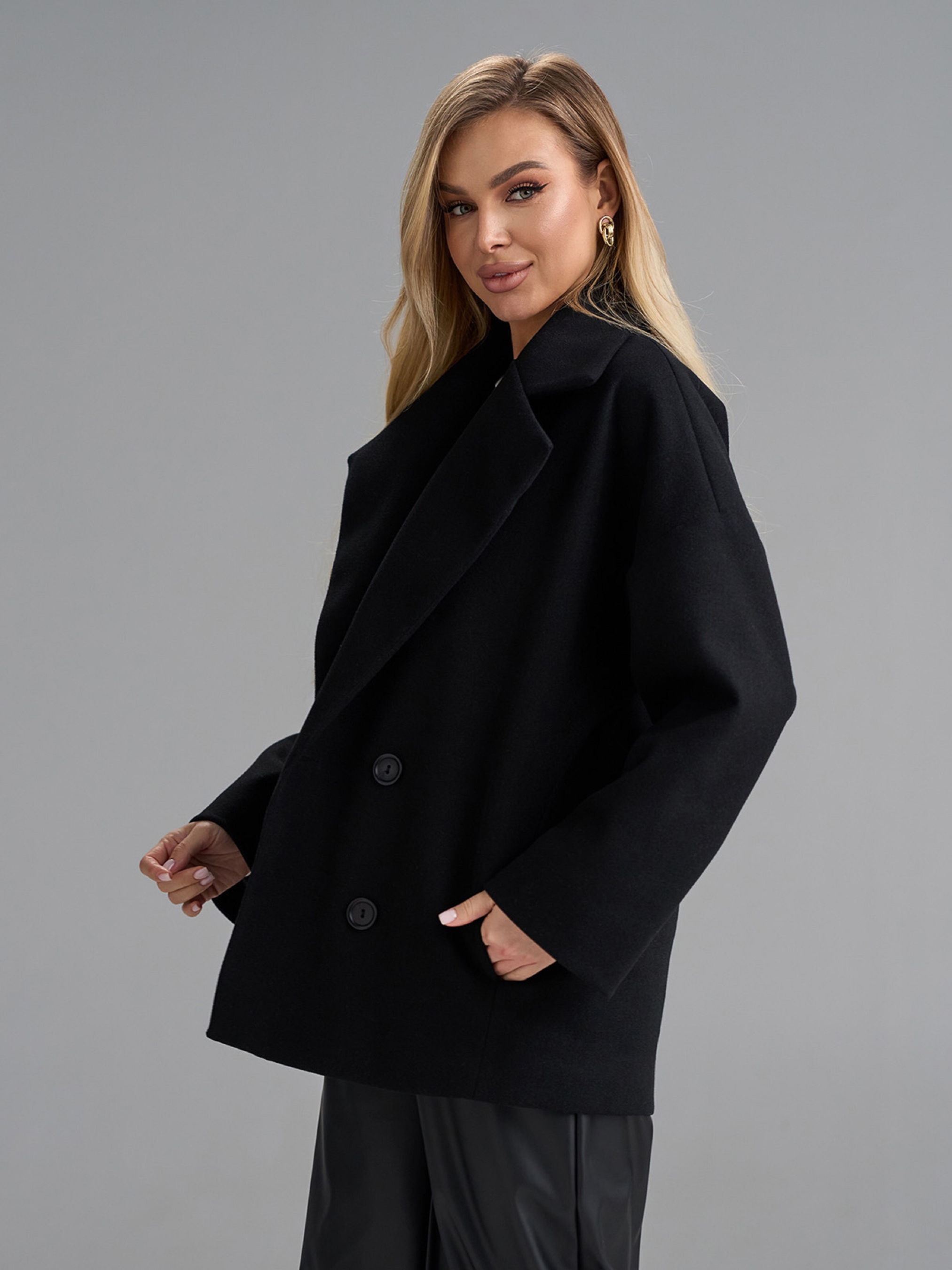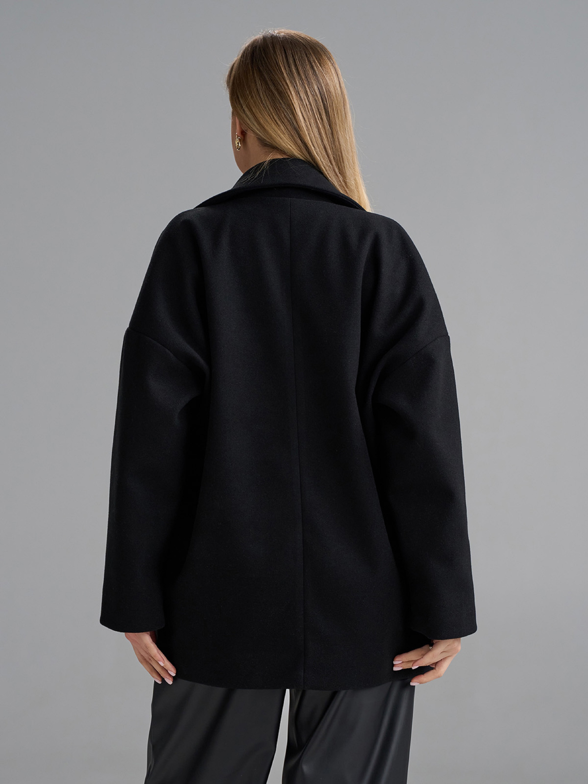 Двубортное пальто-кардиган на пуговицах, выполненное из пальтового кашемира черного цвета. Модель укороченного свободного кроя с длинными рукавами и карманами. Пальто с текстильным подкладом и английским классическим воротником. Полуобхват: Грудь: S (58), M (60), L (62), XL (64), XXL (66), 3XL (68), Длина изделия - 73, Рукав - 56, Ткань: Низкой эластичности.