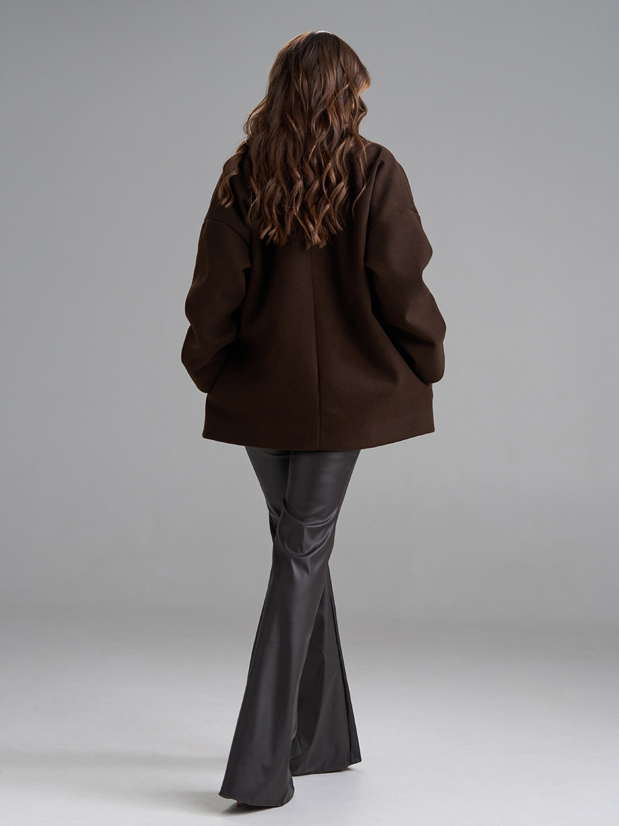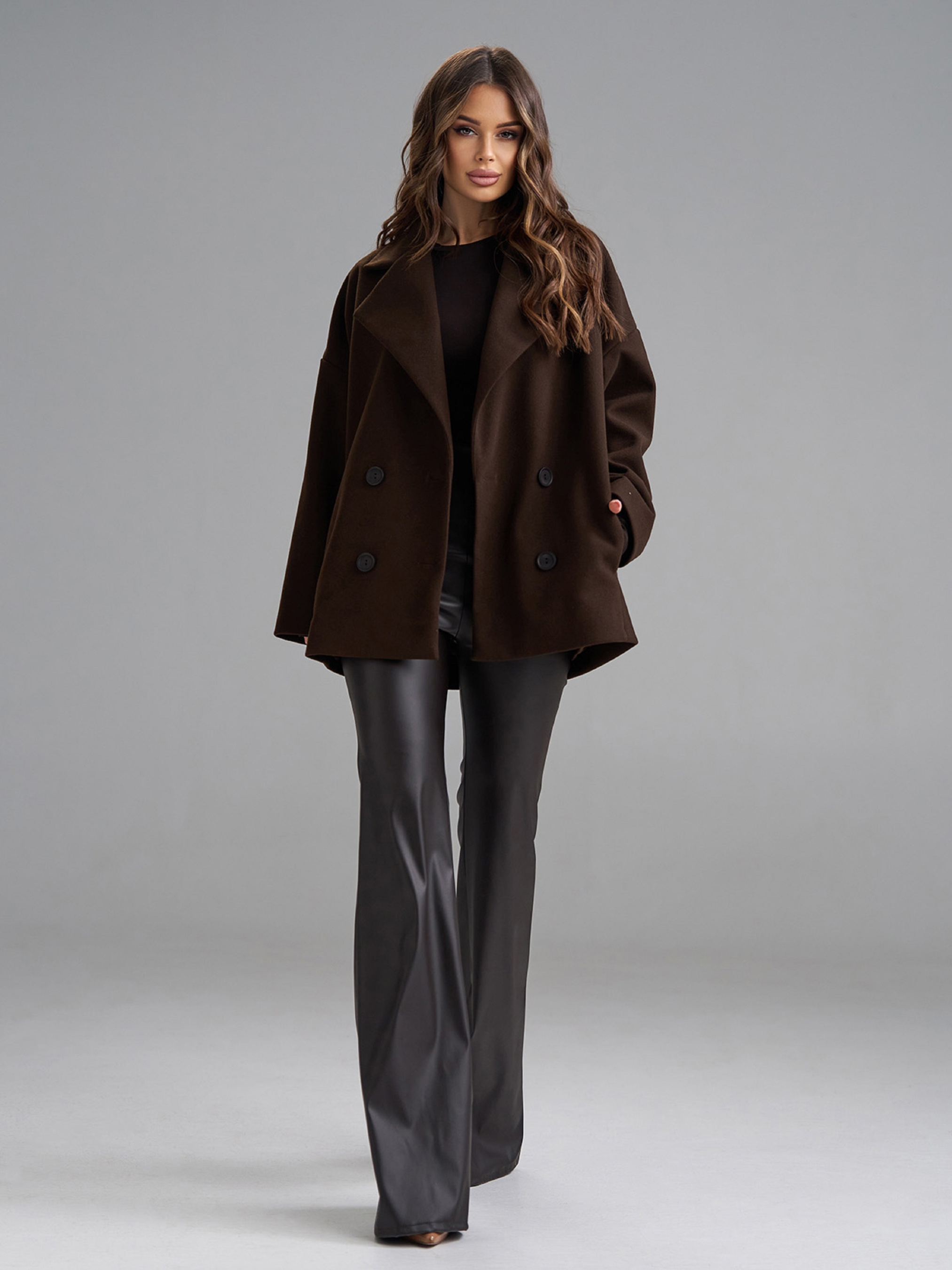Двубортное пальто-кардиган на пуговицах, выполненное из темно-коричневого кашемира. Модель укороченного свободного кроя с длинными рукавами и карманами. Пальто с текстильным подкладом и английским классическим воротником. Полуобхват: Грудь: S (58), M (60), L (62), XL (64), XXL (66), 3XL (68), Длина изделия - 73, Рукав - 56, Ткань: Низкой эластичности.