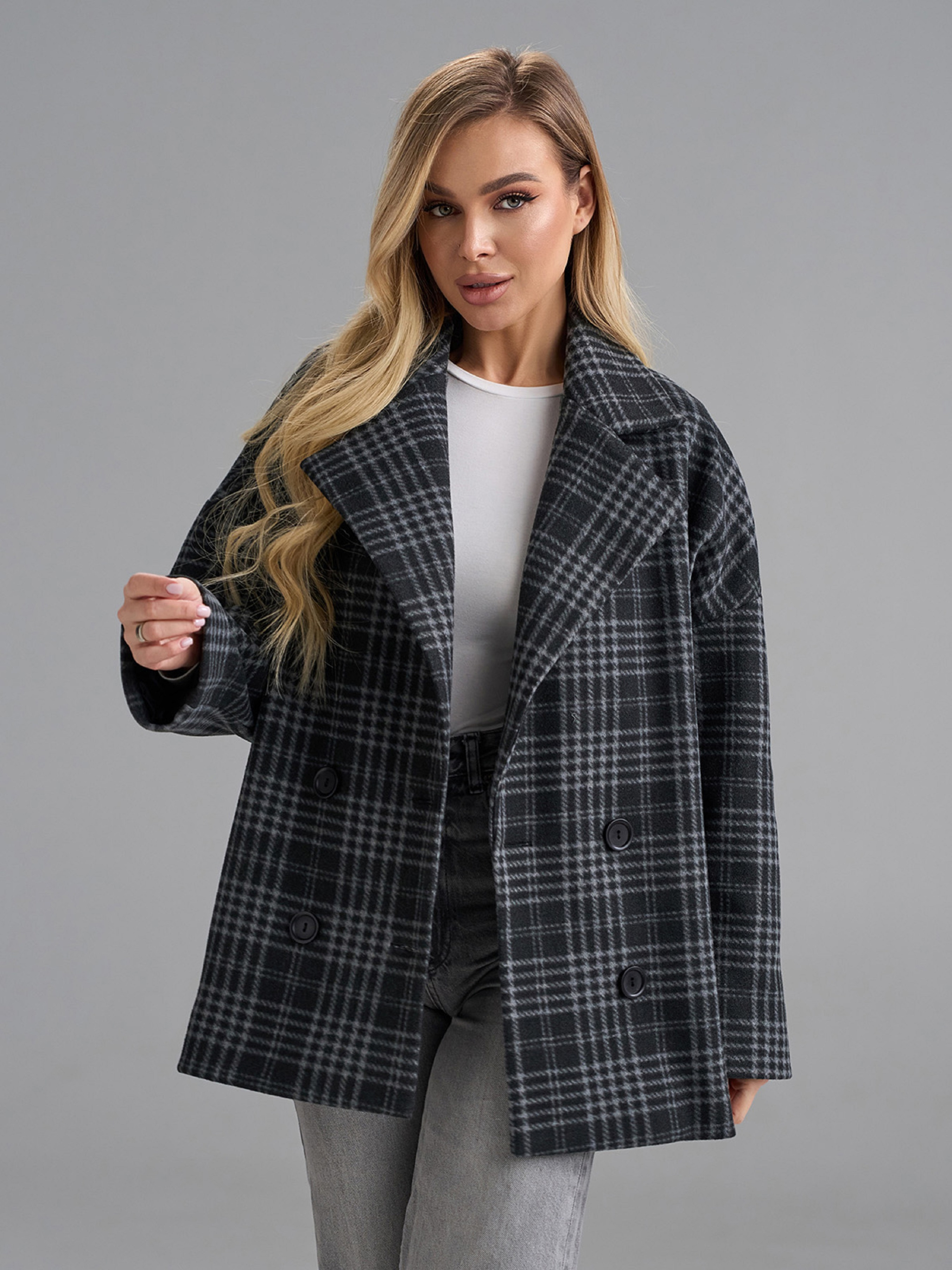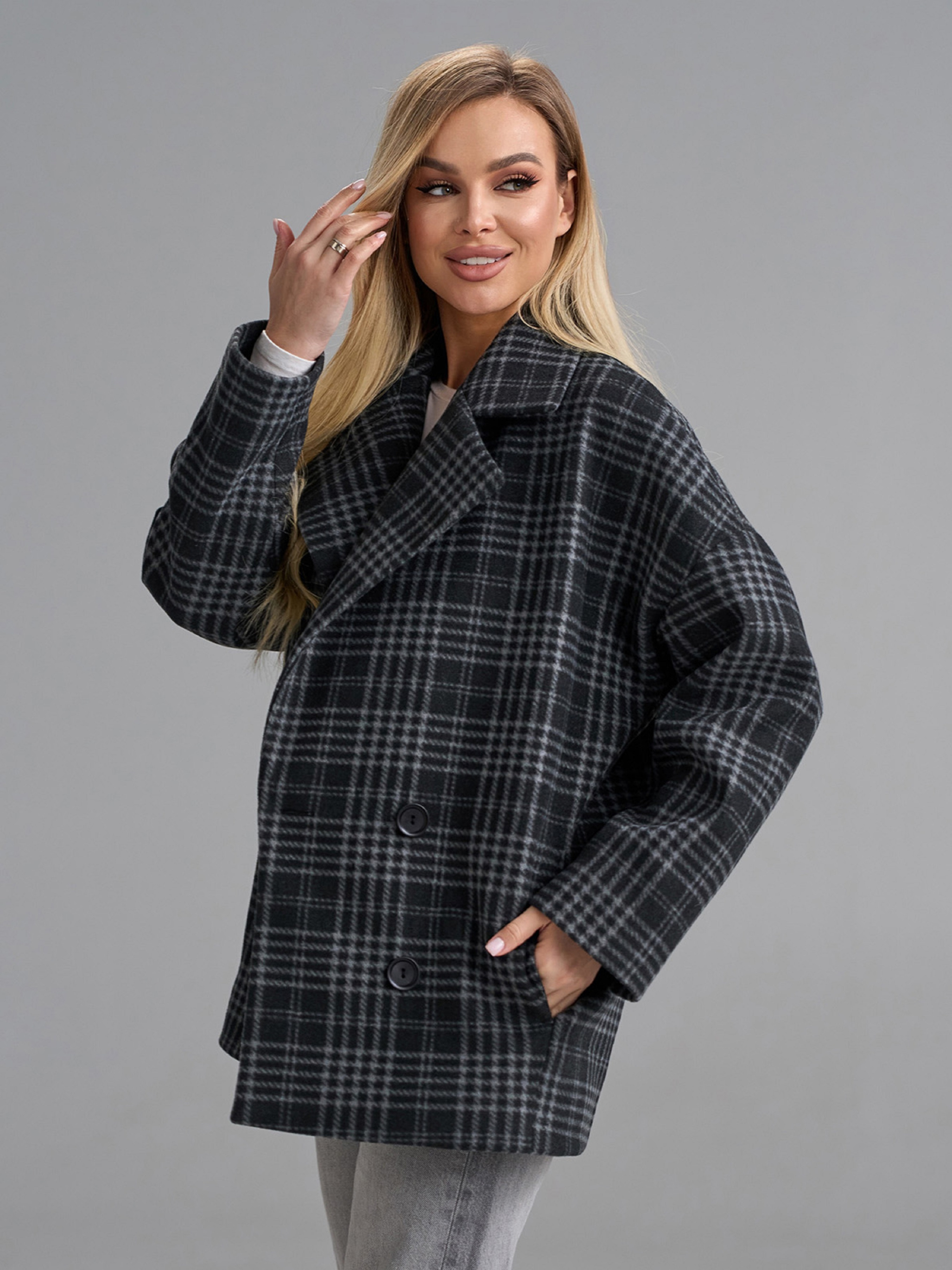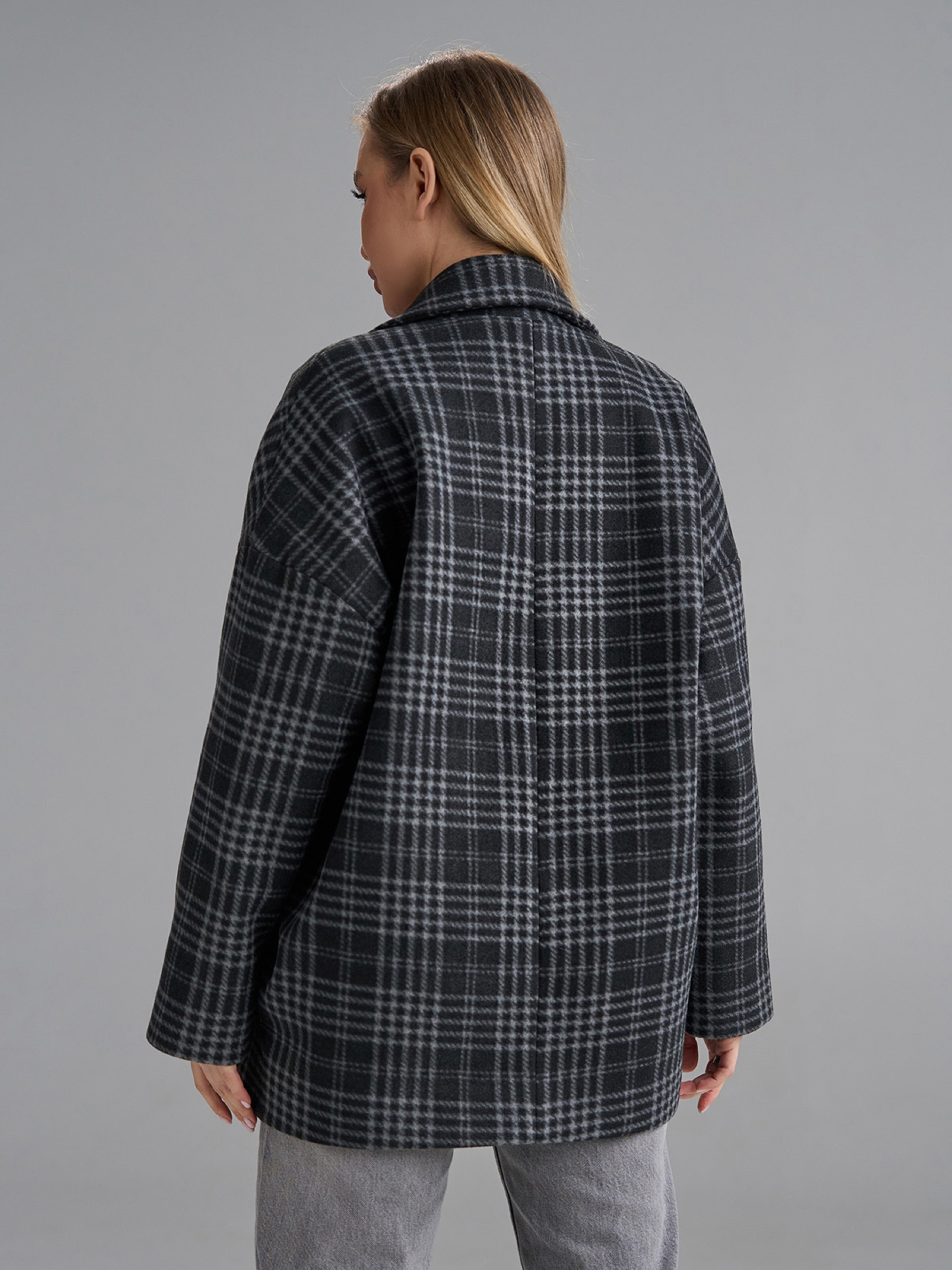 Кашемировое клетчатое пальто-кардиган серого цвета с укороченным свободным кроем и застежками-пуговицами. Модель с длинными рукавами и карманами оснащено английским классическим воротником. Пальто с текстильным подкладом. Полуобхват: Грудь: S (58), M (60), L (62), XL (64), XXL (66), 3XL (68), Длина изделия - 73, Рукав - 56, Ткань: Низкой эластичности.