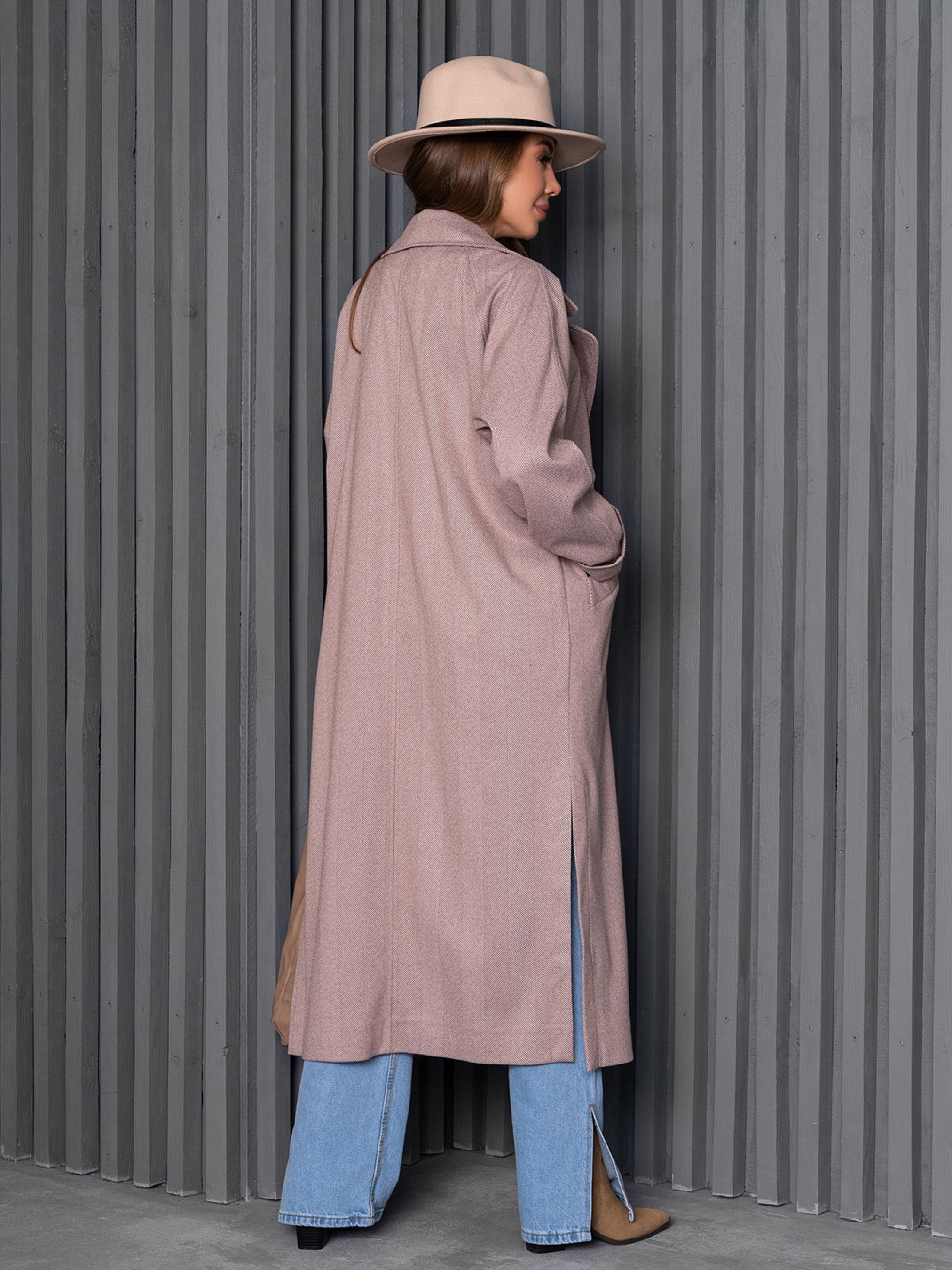 Бежевое шерстяное пальто-кокон на пуговицах. Модель без подклада с приспущенными рукавам реглан и карманами. Модель макси длины с боковыми разрезами. Полуобхват: Грудь: S (58), M (60), L (62), XL (64), Талия: S (56), M (58), L (60), XL (62), Бедра: S (56), M (58), L (60), XL (62), Длина изделия - 122, Рукав - 65, Ткань: Низкой эластичности.