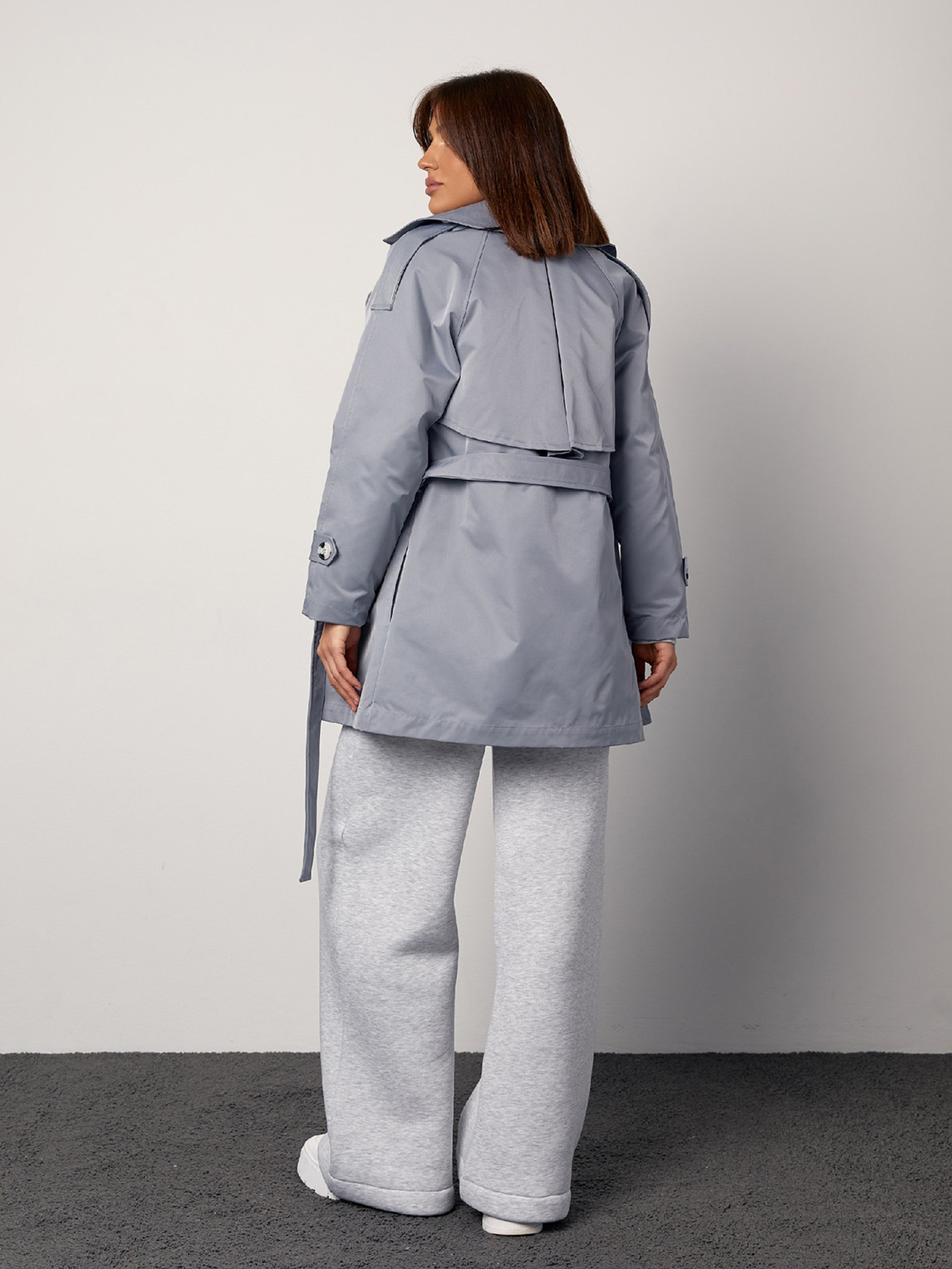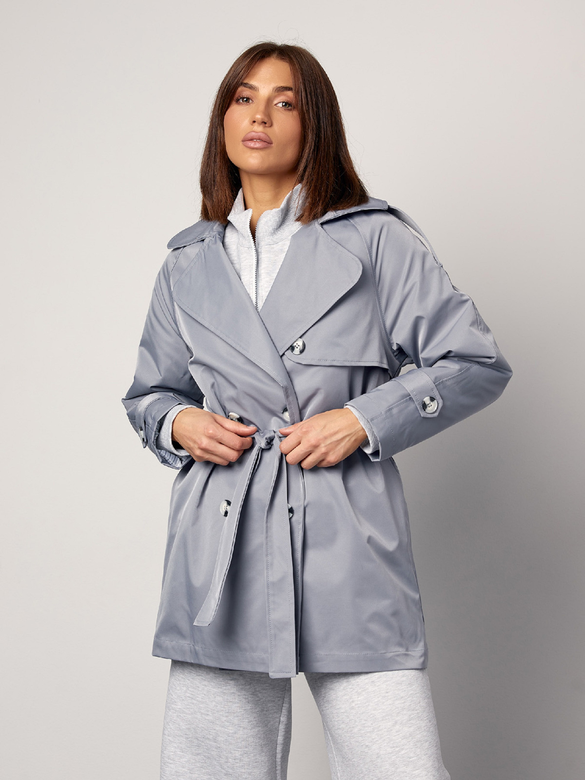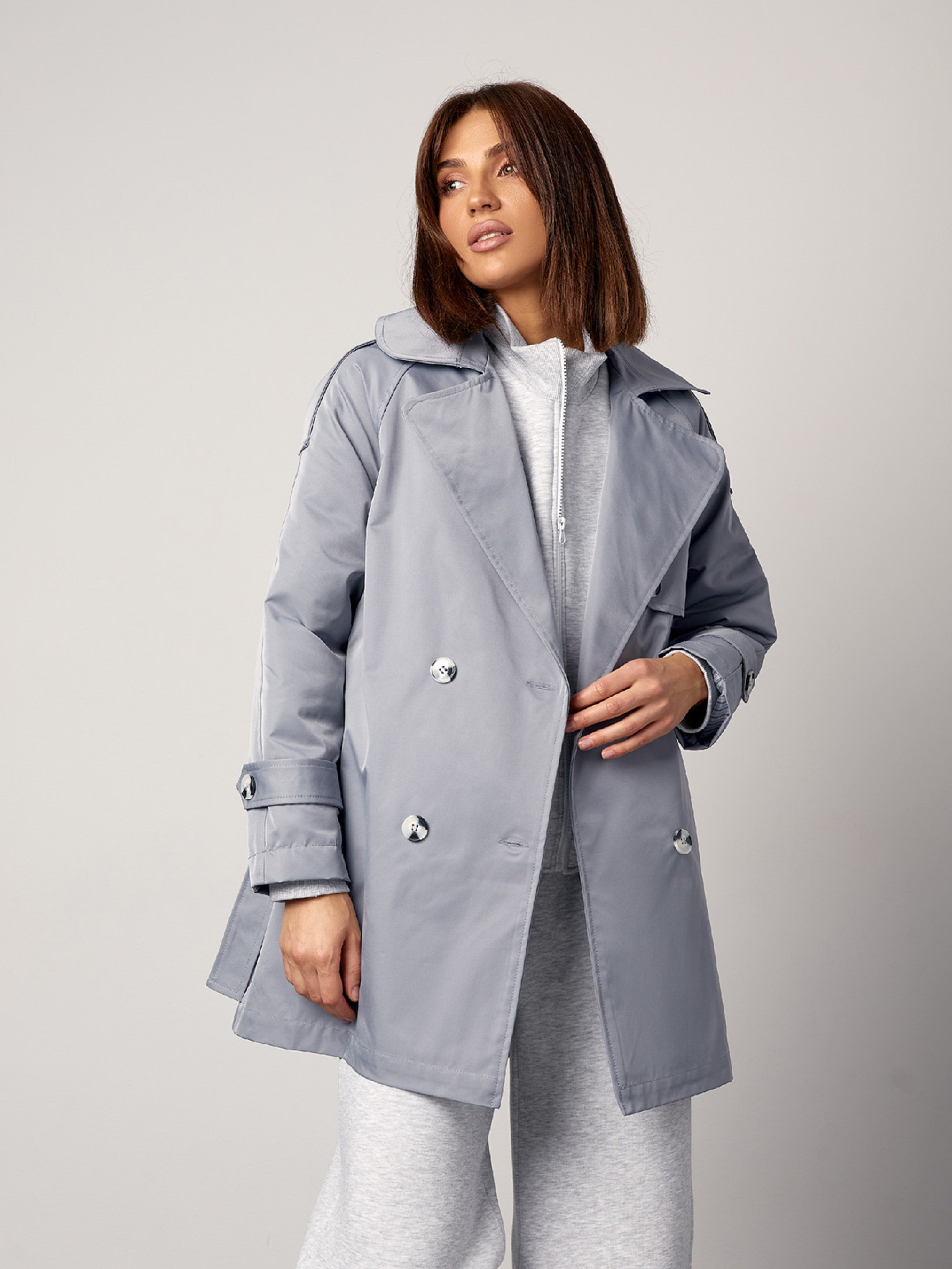 Демисезонный классический тренч серого цвета, выполненный из полированного хлопка с нижним подкладом. Изделие на пуговицах с прямым кроем и английским воротником. Модель с длинными рукавами декорирована хлястиками и вставкой. Тренч с карманам и съемным поясом. Полуобхват: Грудь: S (50), M (52), L (54), XL (56), Талия: S (52), M (54), L (56), XL (58), Бедра: S (56), M (58), L (60), XL (62), Длина изделия - 80, Длина рукава - 50, Ткань: Низкой эластичности.