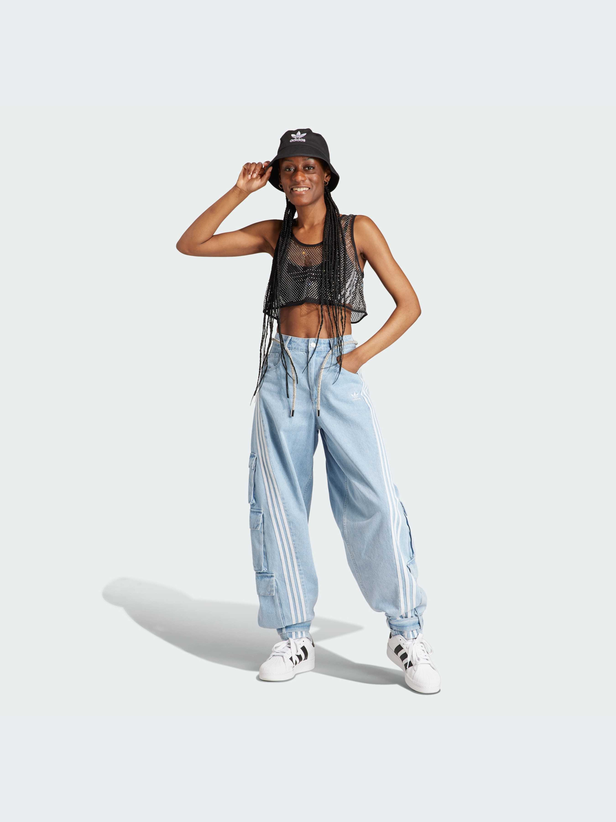 Эти брюки-карго от adidas навевают атмосферу 2000-х, причем в джинсовом исполнении. Их выразительный силуэт свободно ниспадает, а регулируемые штанины можно оставить свободными, чтобы носить с высокими каблуками, или заузить, чтобы создать более объемную форму шаровар. Ты можешь сделать этот образ полностью в стиле Y2K, добавив в него побрякушек - стразы на поясе закладывают хорошую основу. Как бы ты ни стилизовала эти брюки-карго, три полоски несомненно выдают наследие adidas.