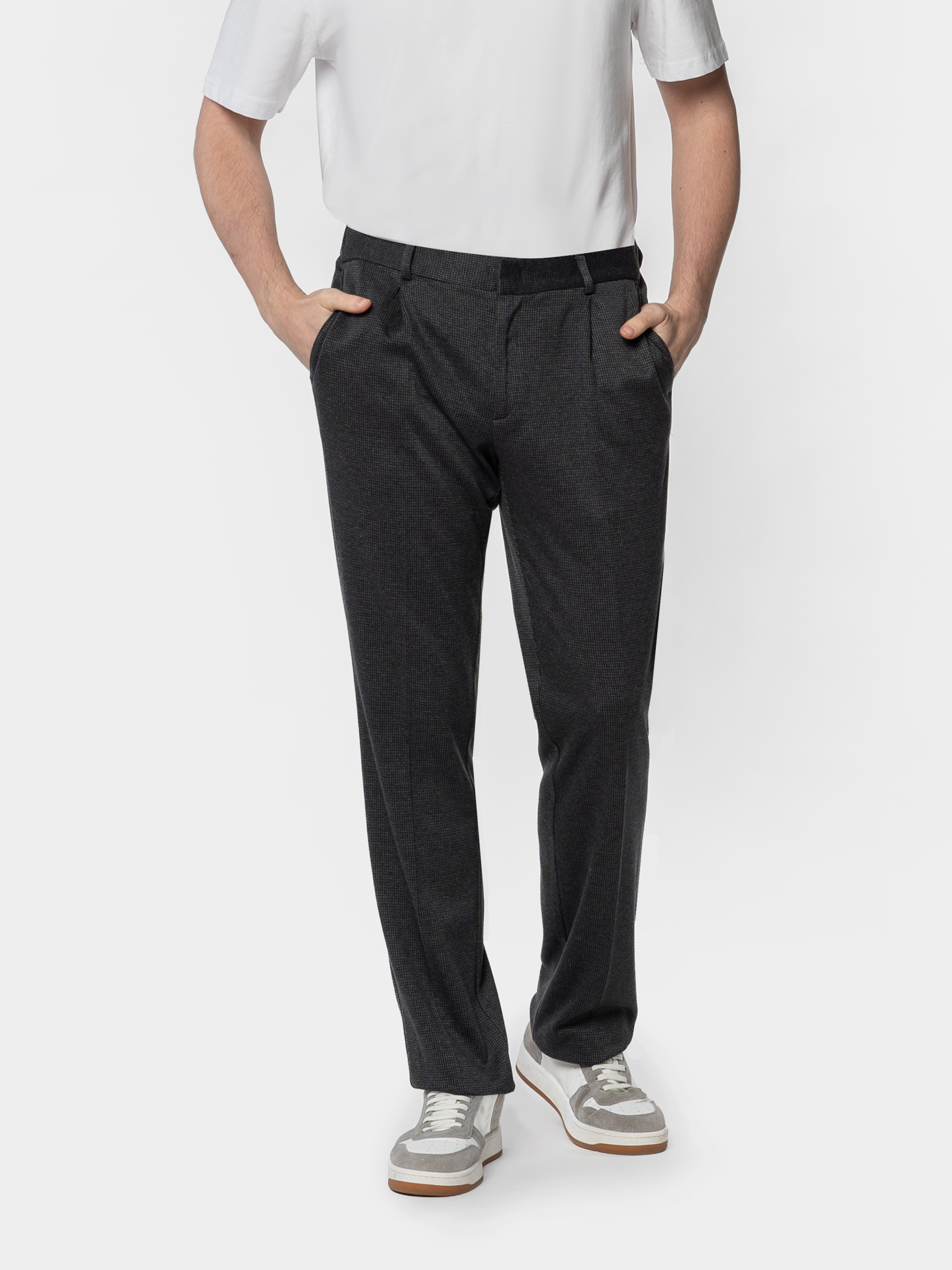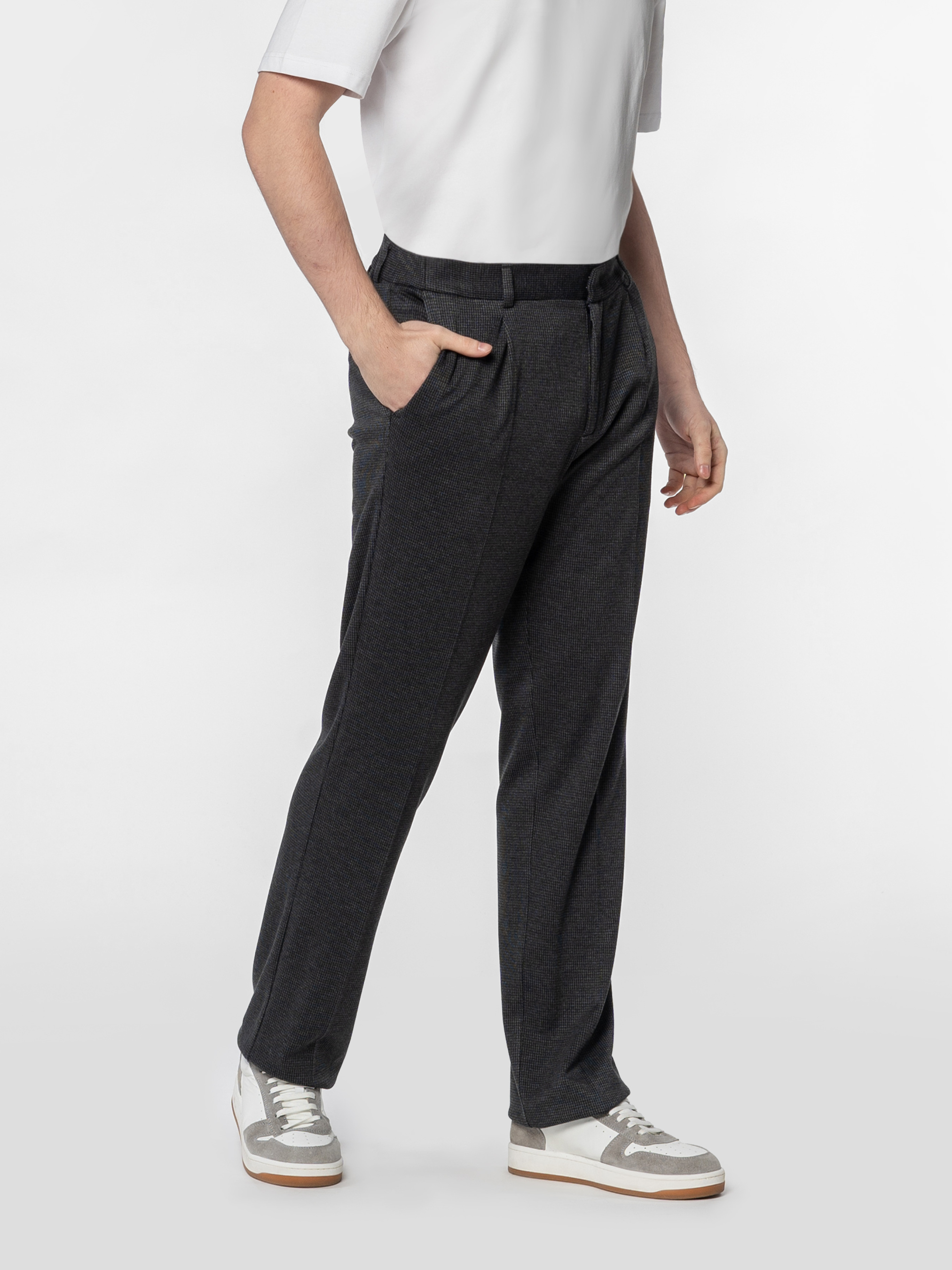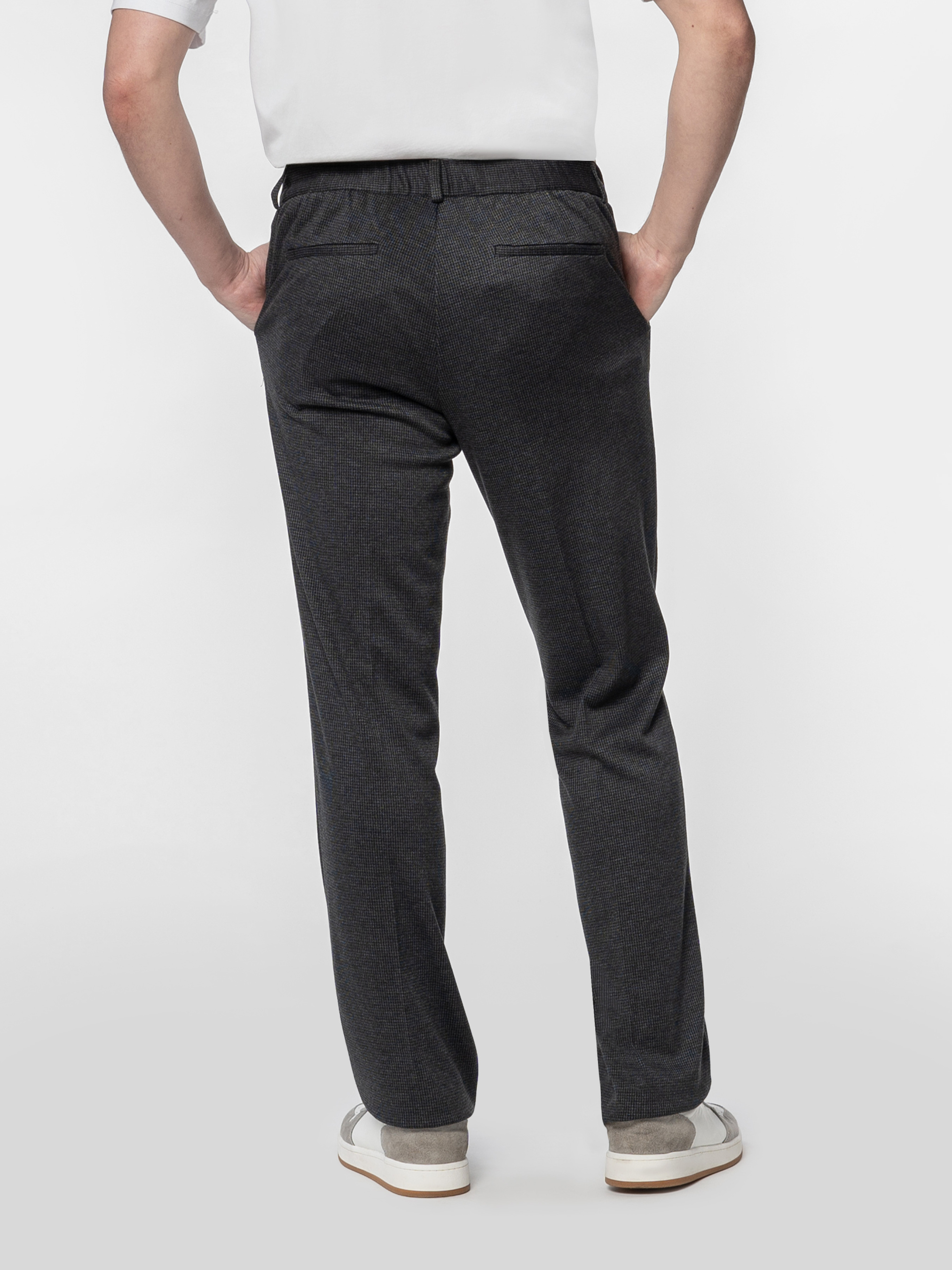 Мужские брюки Arber темно-серого цвета, изготовленные из инновационной ткани с добавлением шелковистой вискозы, что обеспечивает комфорт и практичность. Они не мнутся и сохраняют безупречный вид в течение дня. Модель имеет среднюю посадку, оформлена стрелками, пояс на резинке с застежкой на молнию и пуговицу для удобства. Оснащены двумя косыми боковыми карманами и двумя задними карманами. Модель на фото в размере 48. Рост: 185 см. Параметры: 103/78/100