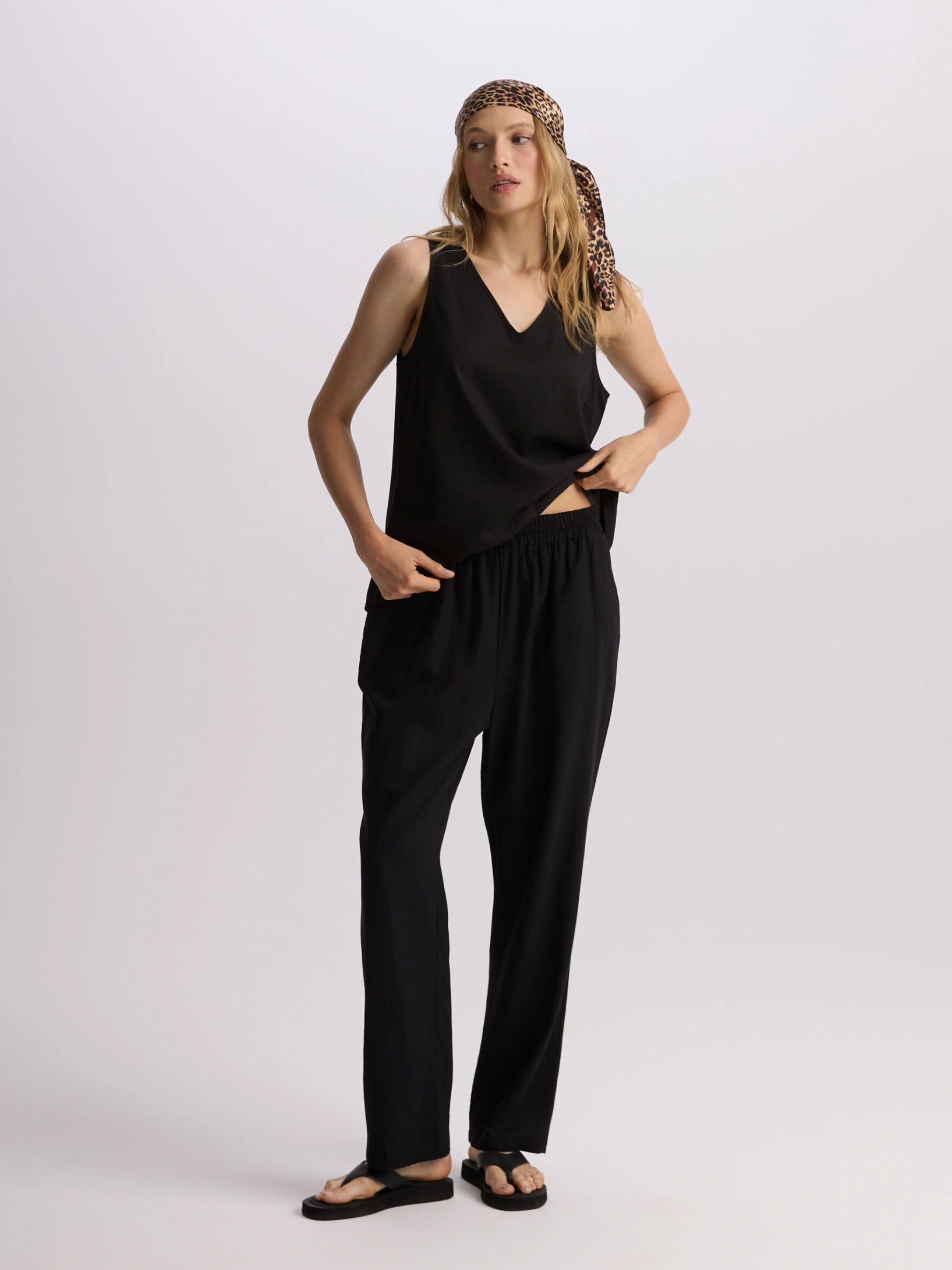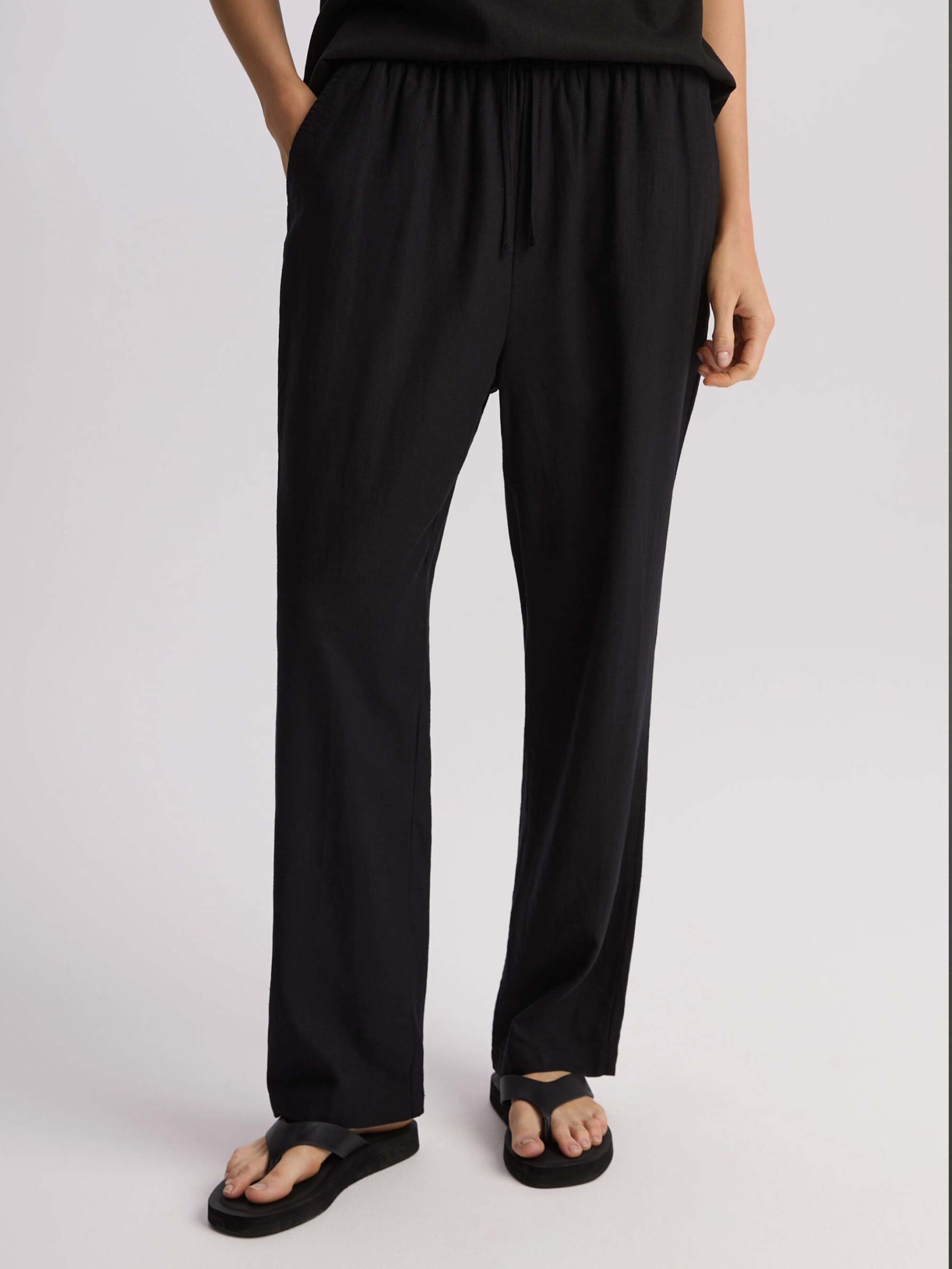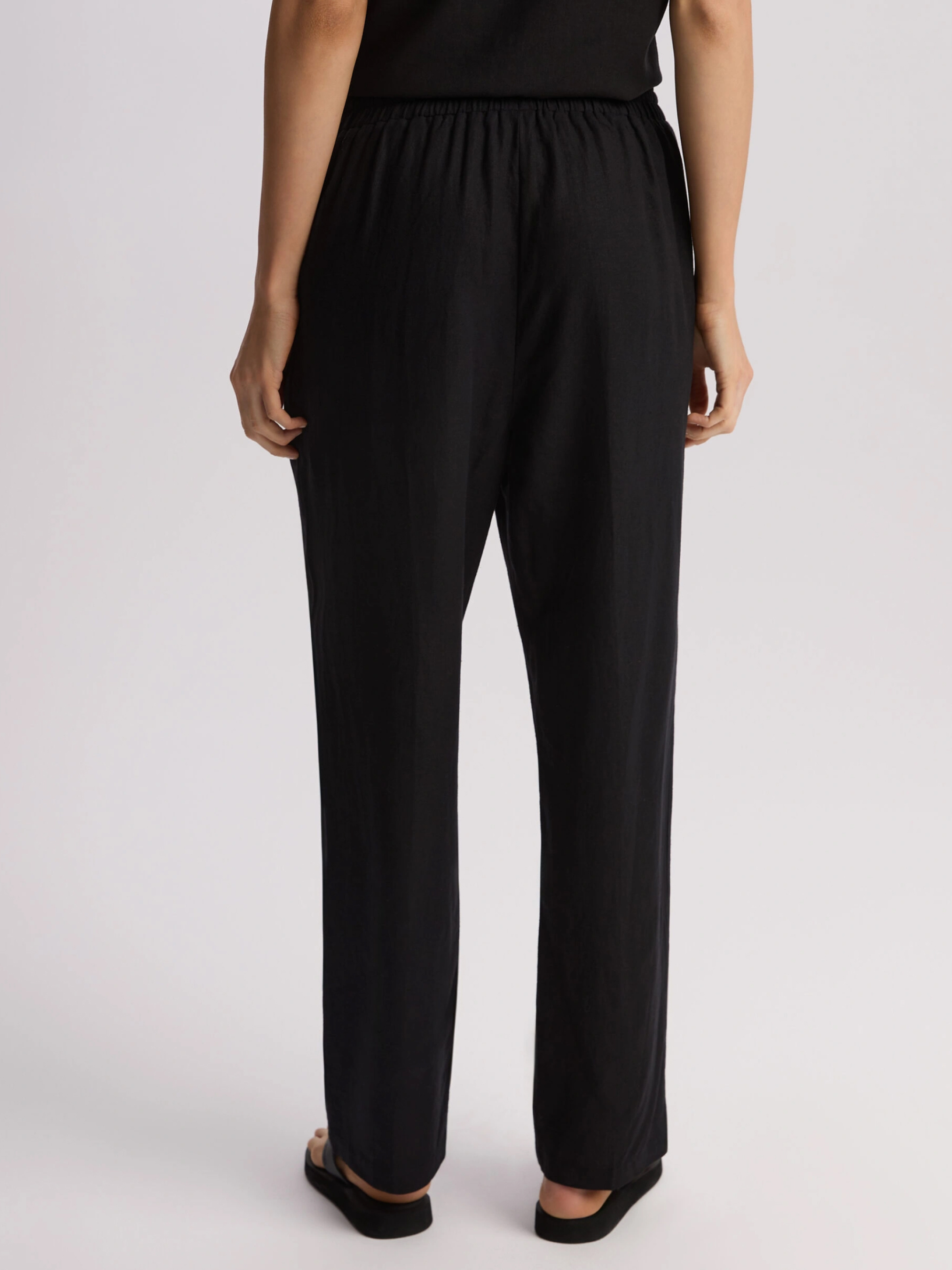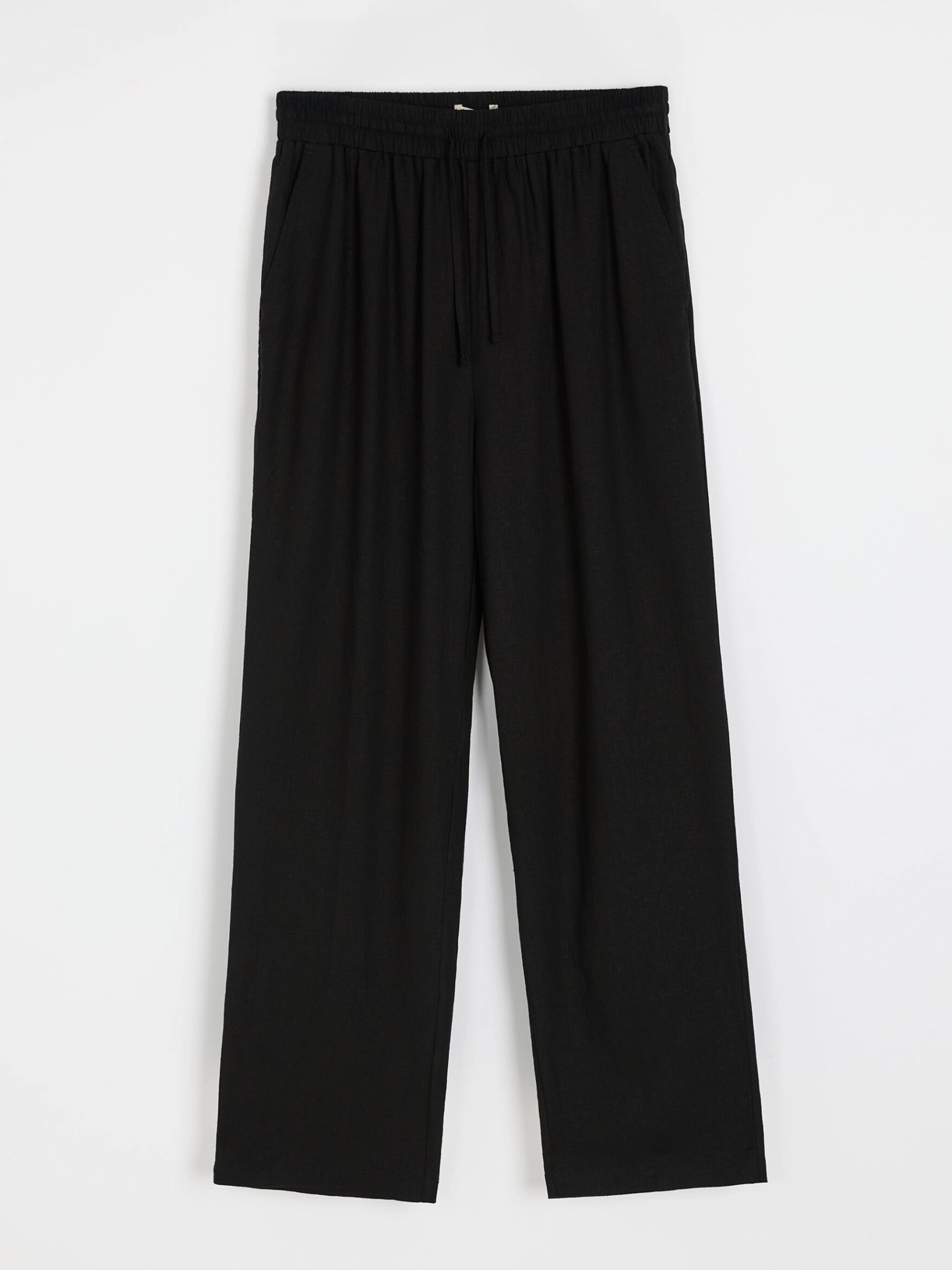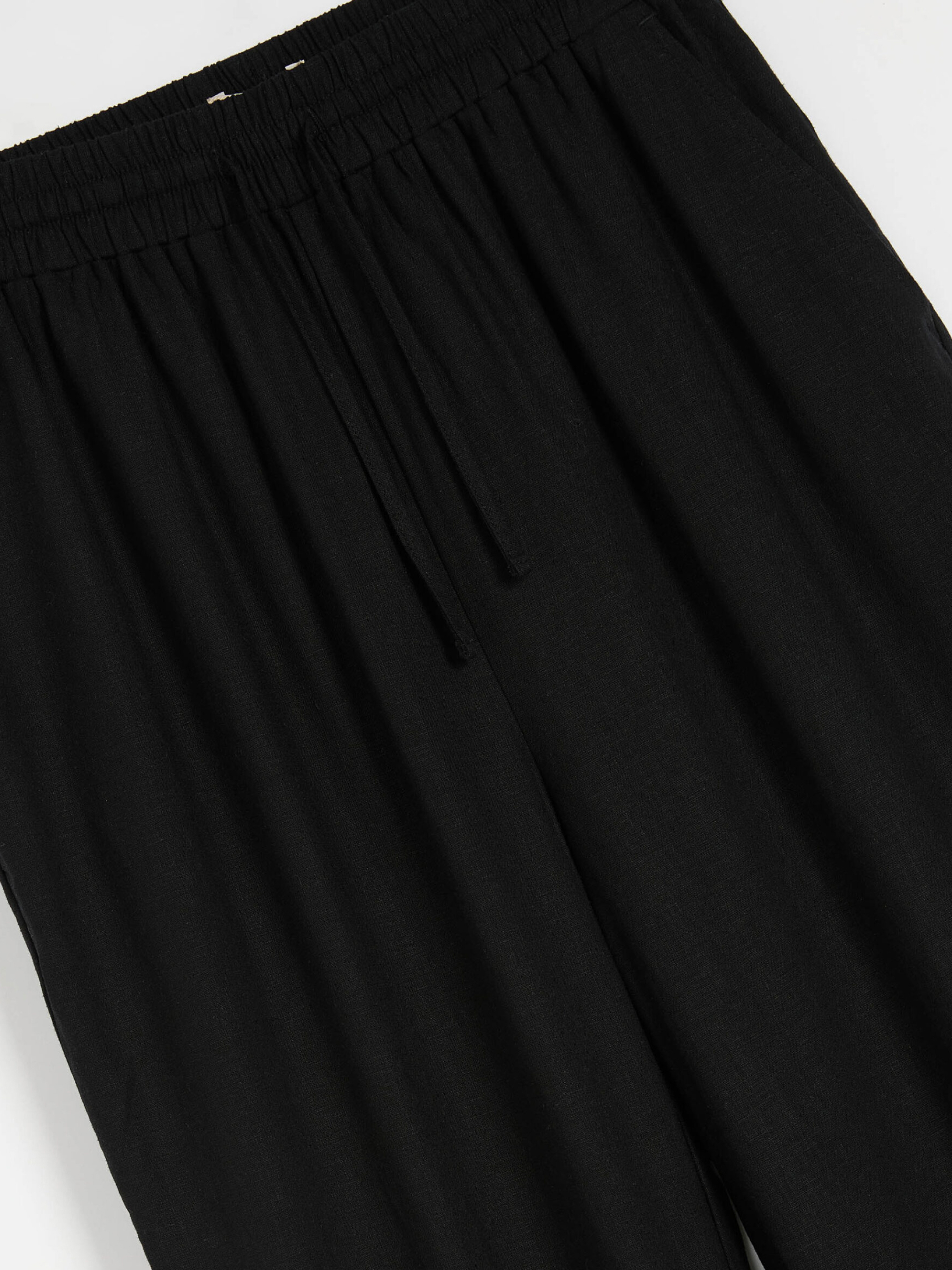 LENEA Женские брюки из льна и вискозы: - свободного кроя, - высокая талия с резинкой и завязкой на талии, - прямой крой к лодыжке, - карманы по бокам. Состав: 55% лен, 45% вискоза. Сезон: Весна/Лето Уход: - стирка при максимум 30 °С - не отбеливать - не сушить в сушильной машине - гладить максимум при темпе. 150 °С - не химчистка