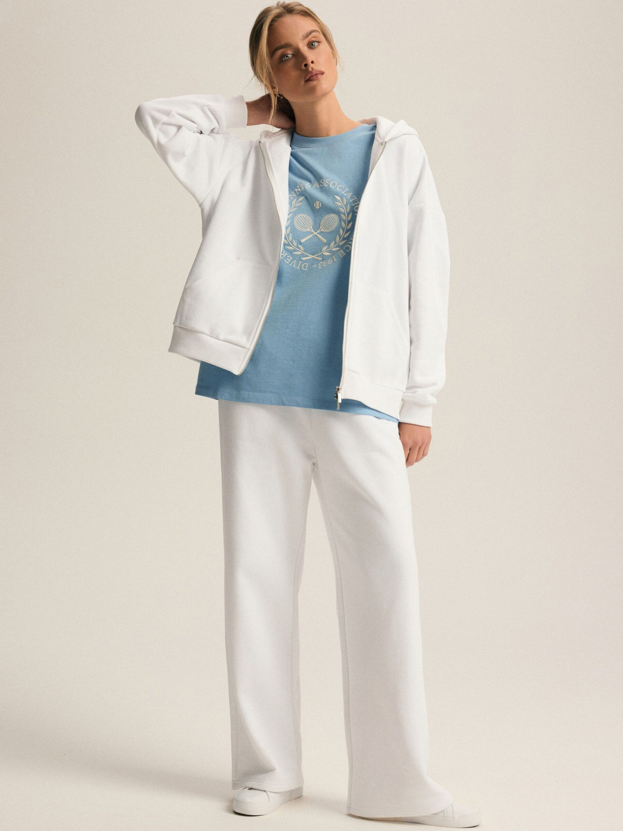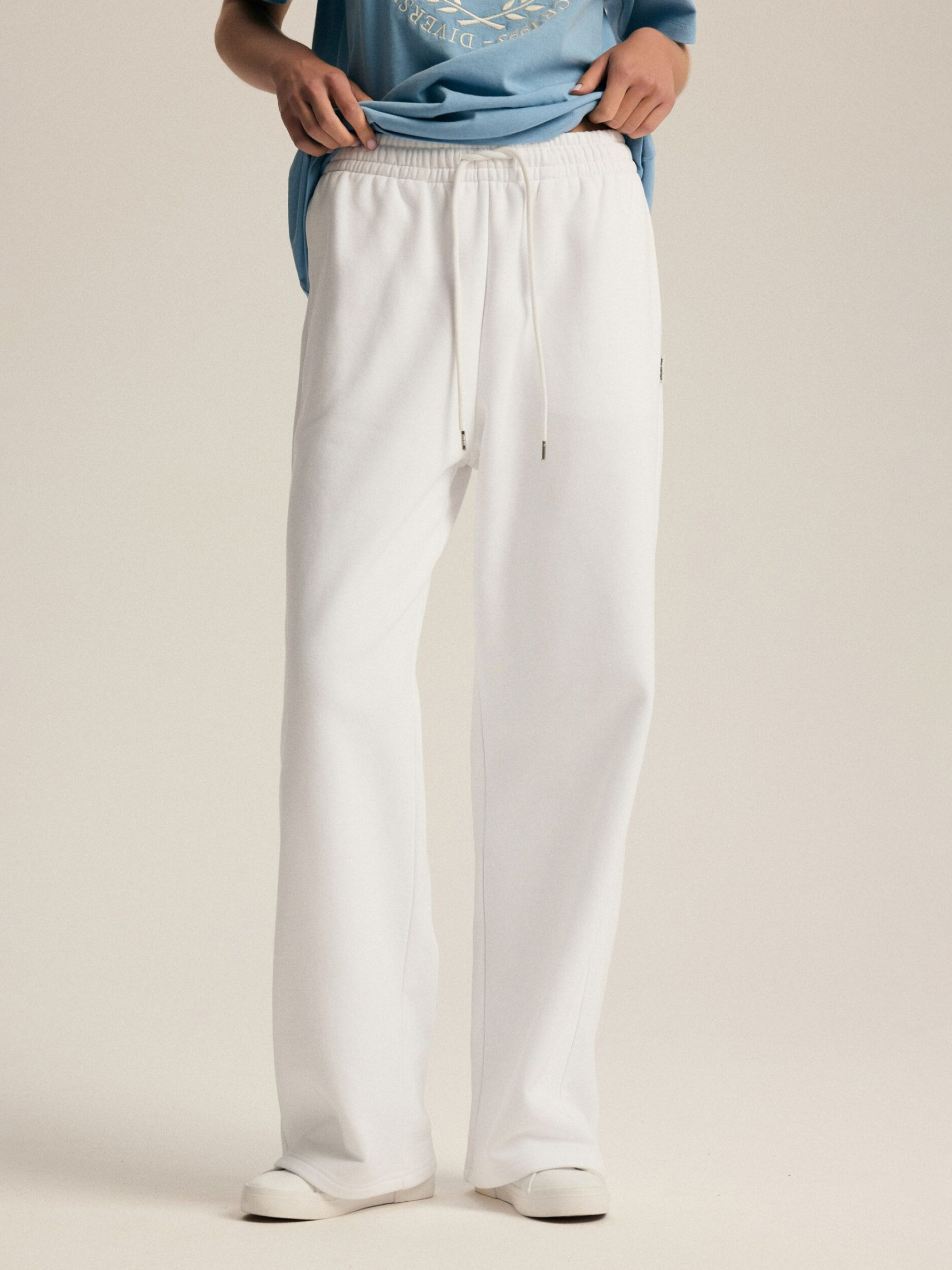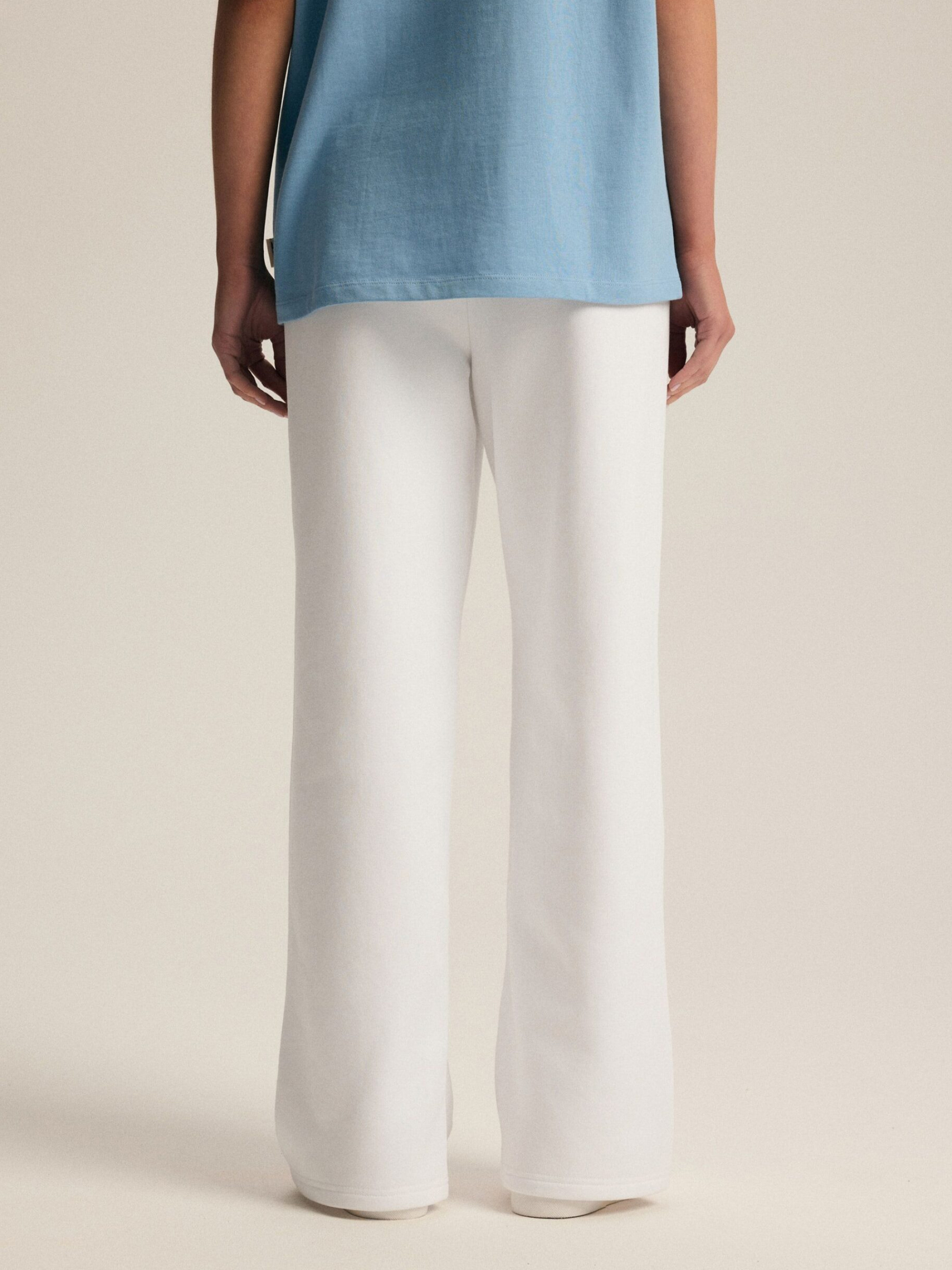 Спортивные брюки WIDENS OP/ID: 10047521 Брюки из мягкой ткани свитшота: - высокая талия, - широкие штанины, - карманы в боковом шве, - регулировка талии шнурком, - белые. Внешний состав: 80% хлопок 20% полиэстер Уход: - стирка при максимум 30 °С - не отбеливать - не сушить в сушильной машине - гладить максимум при температуре 150 °С - не подвергать химчистке Размер XS S М L XL Ширина талии 34,5 36,5 38,5 40,5 42,5 Длина внутренней части штанины 75,5 75,5 77,5 78,5 80 Ширина бедра 32 33 34 35 36 Ширина нижней части штанины 25,5 26,5 27,5 28,5 29,5