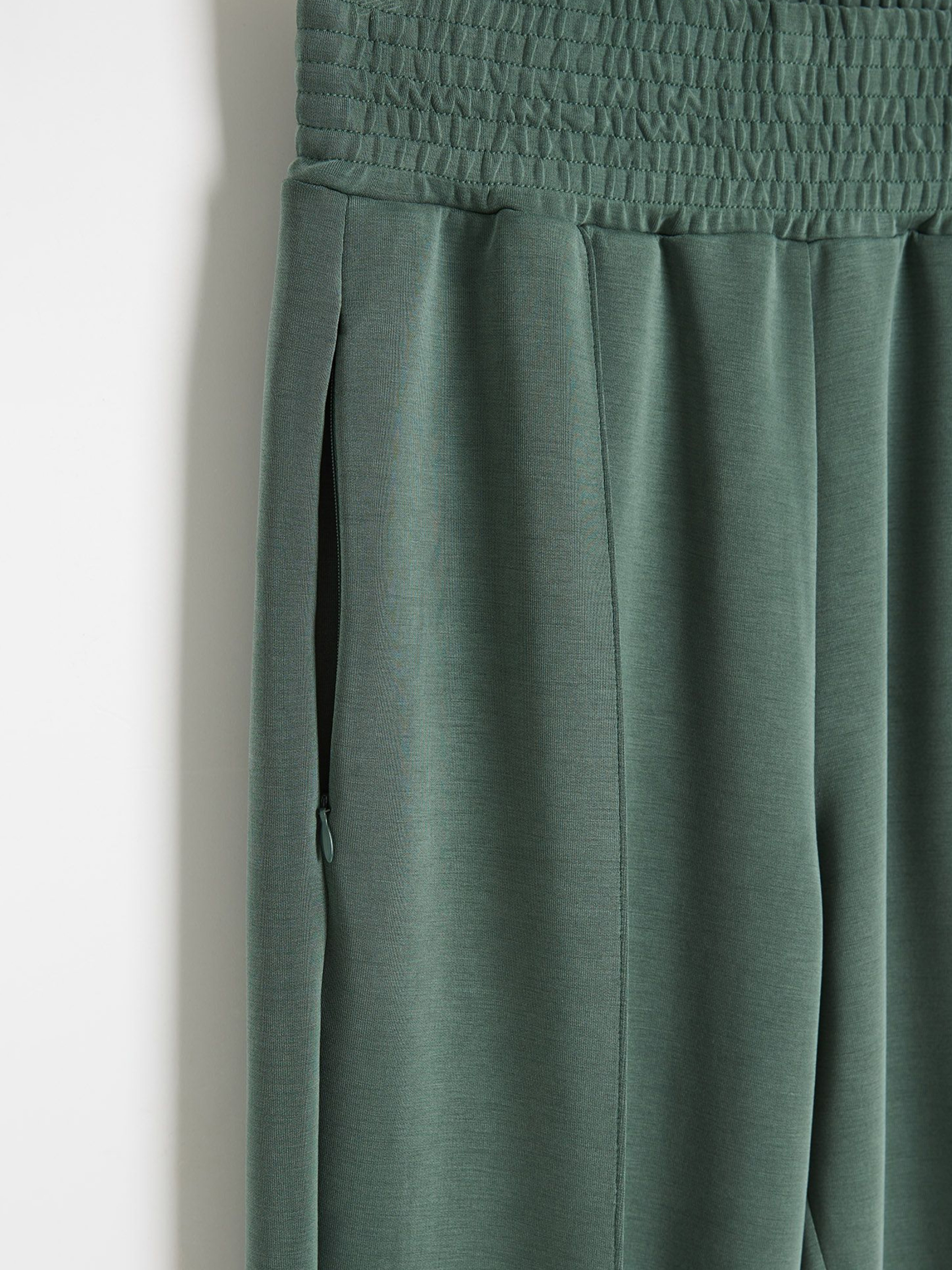 Спортивные штаны SORNO / ID: 10048865 Рост модели: 172 см Размер товара: S Широкие женские брюки с декоративным широким поясом, изготовленные из приятного на ощупь материала: - удобный крой, - высокая талия, - штанины украшены ребристыми манжетами, - штанины с декоративными складками, - два кармана на молнии, - изготовлены из приятного на ощупь трикотажа с вискозой, идеально подходят для ежедневных занятий и отдыха на открытом воздухе. Наружный состав 46% полиэстер 44% вискоза 10% эластан Уход: - стирка при максимум 30 °С - не отбеливать - не сушить в сушильной машине - гладить при максимальной температуре 110 °C - не подвергать химчистке Размер: XS S М L Ширина талии: 33 35 37 39 Длина внутренней части штанины: 68 68 70 72 Ширина бедра: 31 32 33 34 Ширина нижней части штанины: 10.5 11.5 12.5 13,5