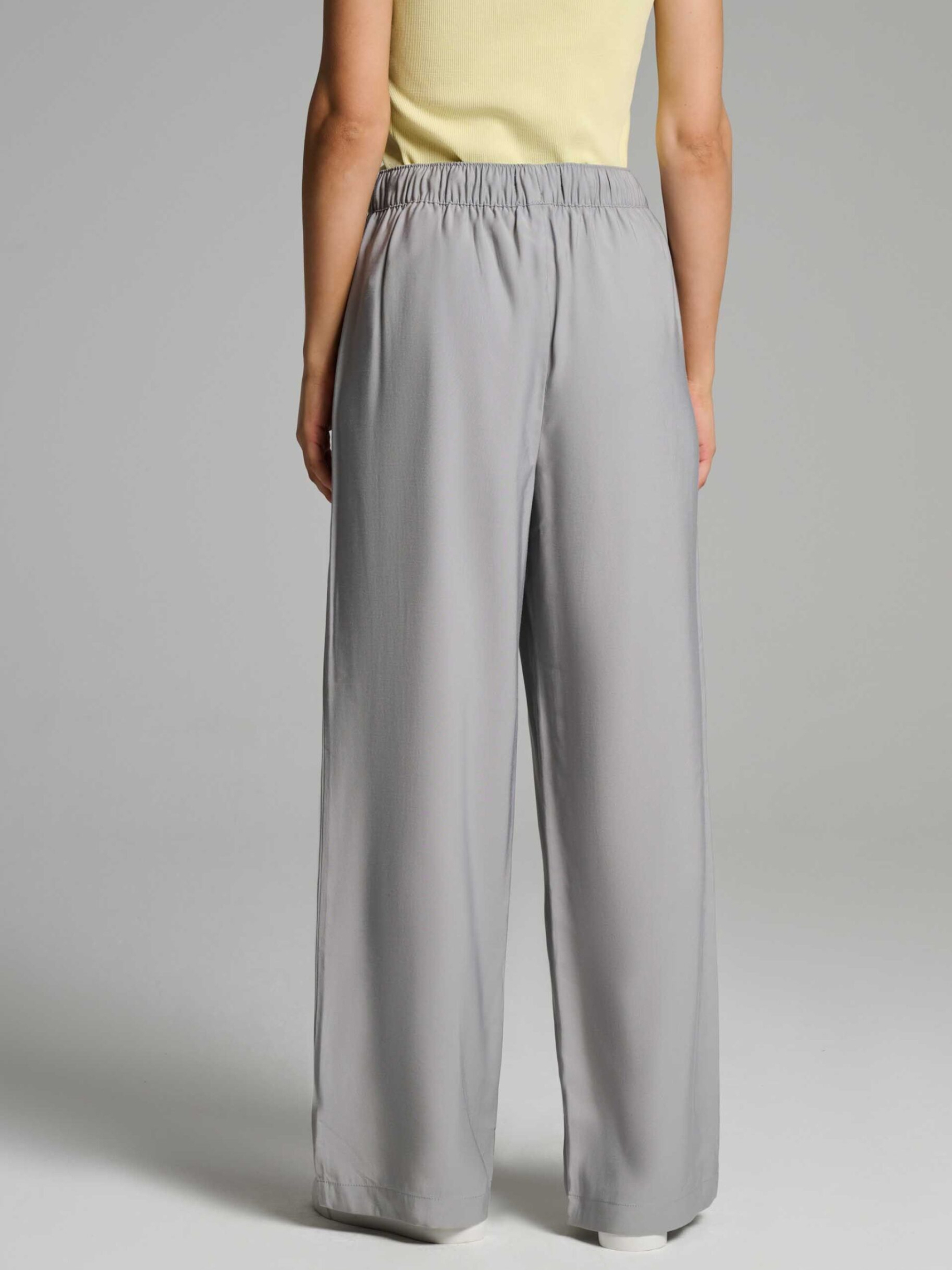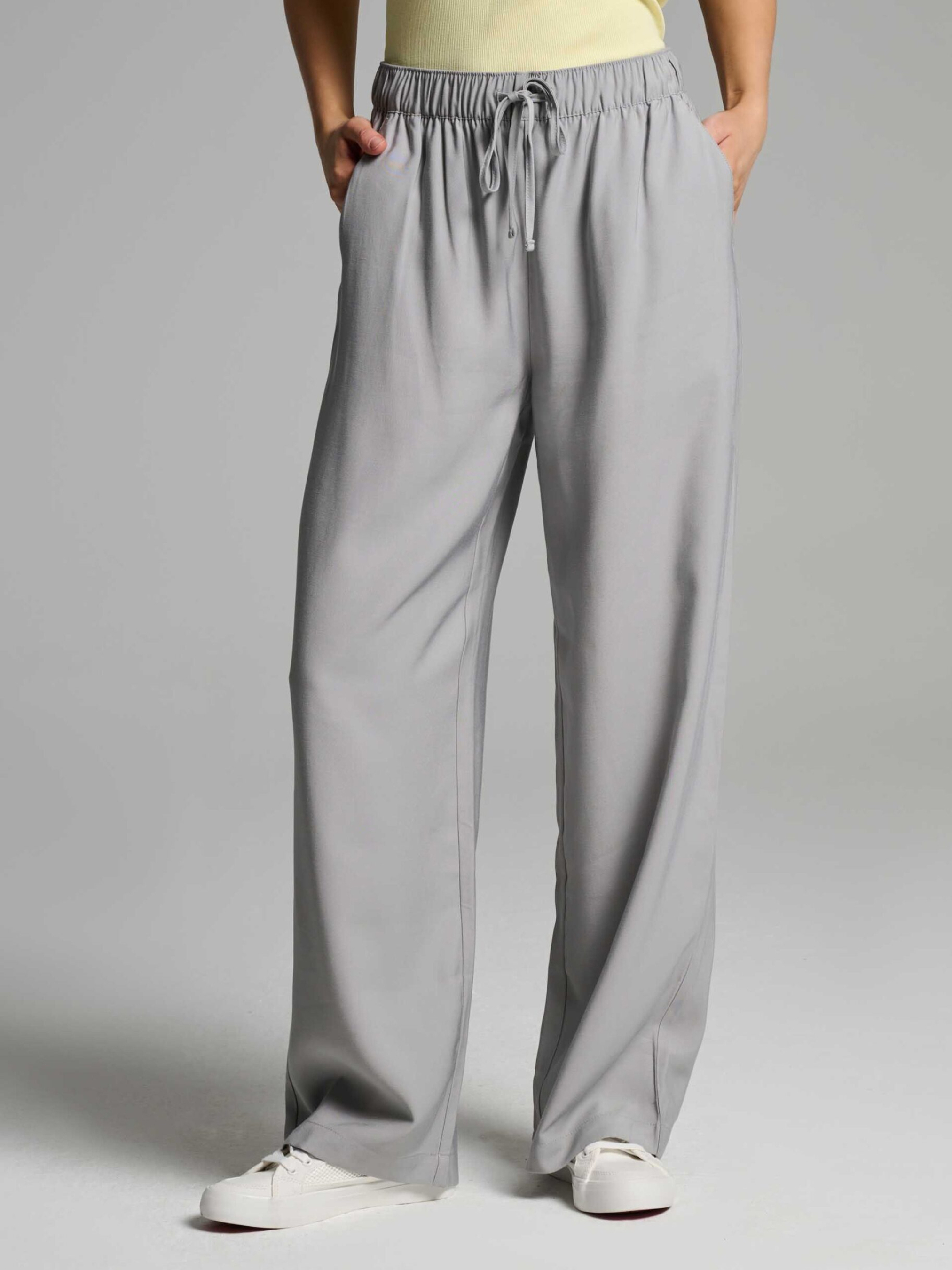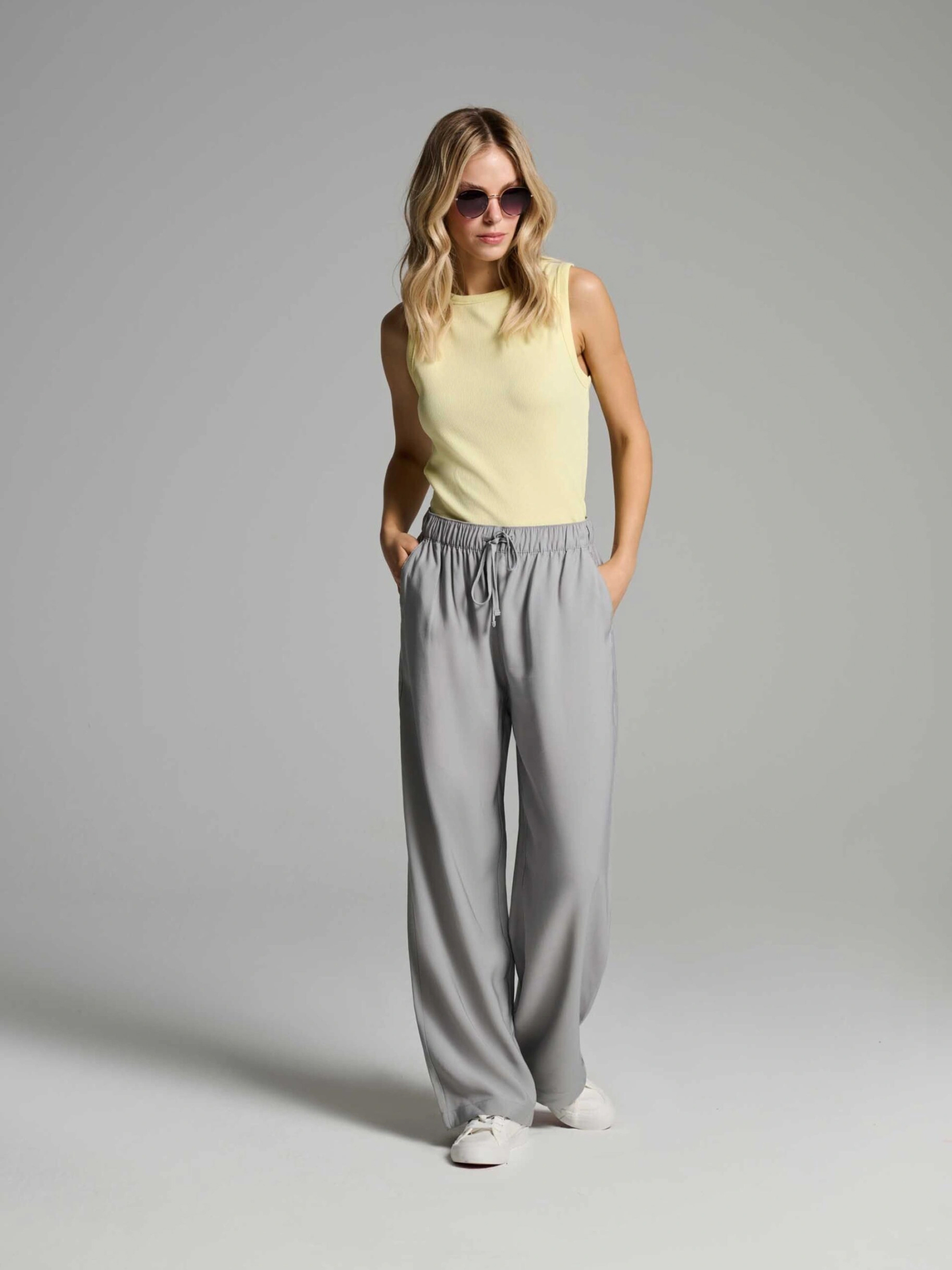 Брюки WIDER / Артикул: 10046456 Широкие брюки-джоггеры Рост модели: 176 см Размер изделия: S Женские брюки из воздушной вискозы: - высокая талия, - регулируемый пояс со шнурком, - длинные, широкие брючины. Состав: 90 % вискоза, 10 % полиэстер Уход: - стирка при температуре не выше 30 °С - не отбеливать - не сушить в сушильной машине - гладить при температуре не выше 110 °С - не подвергать химической чистке Размер: 34, 36, 38, 40, 42, Ширина талии: 34, 36, 38, 40, 42, Длина внутренней части штанины: 77, 77, 79, 79, 79, Ширина бедра: 33, 34, 35, 36, 37, Ширина нижней части штанины: 26, 27, 28, 29, 30,