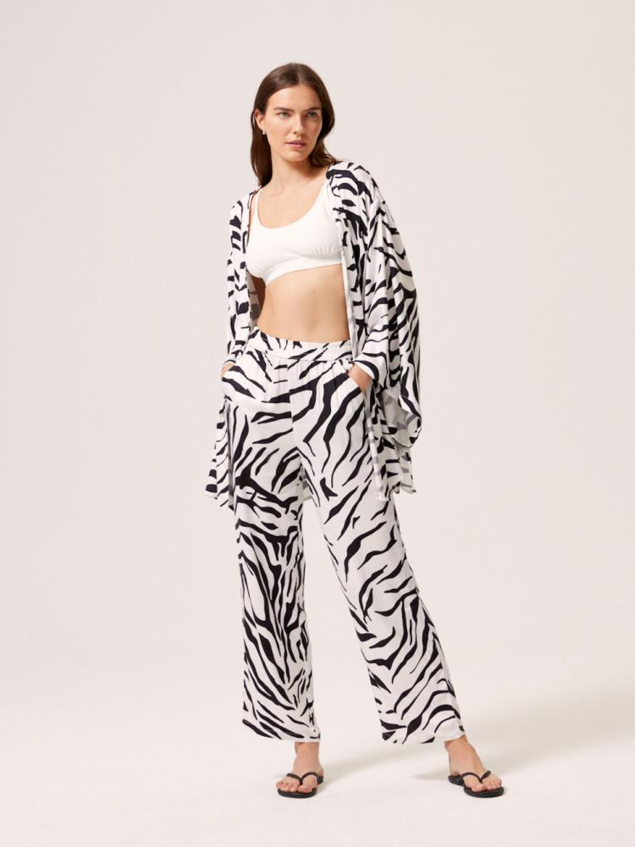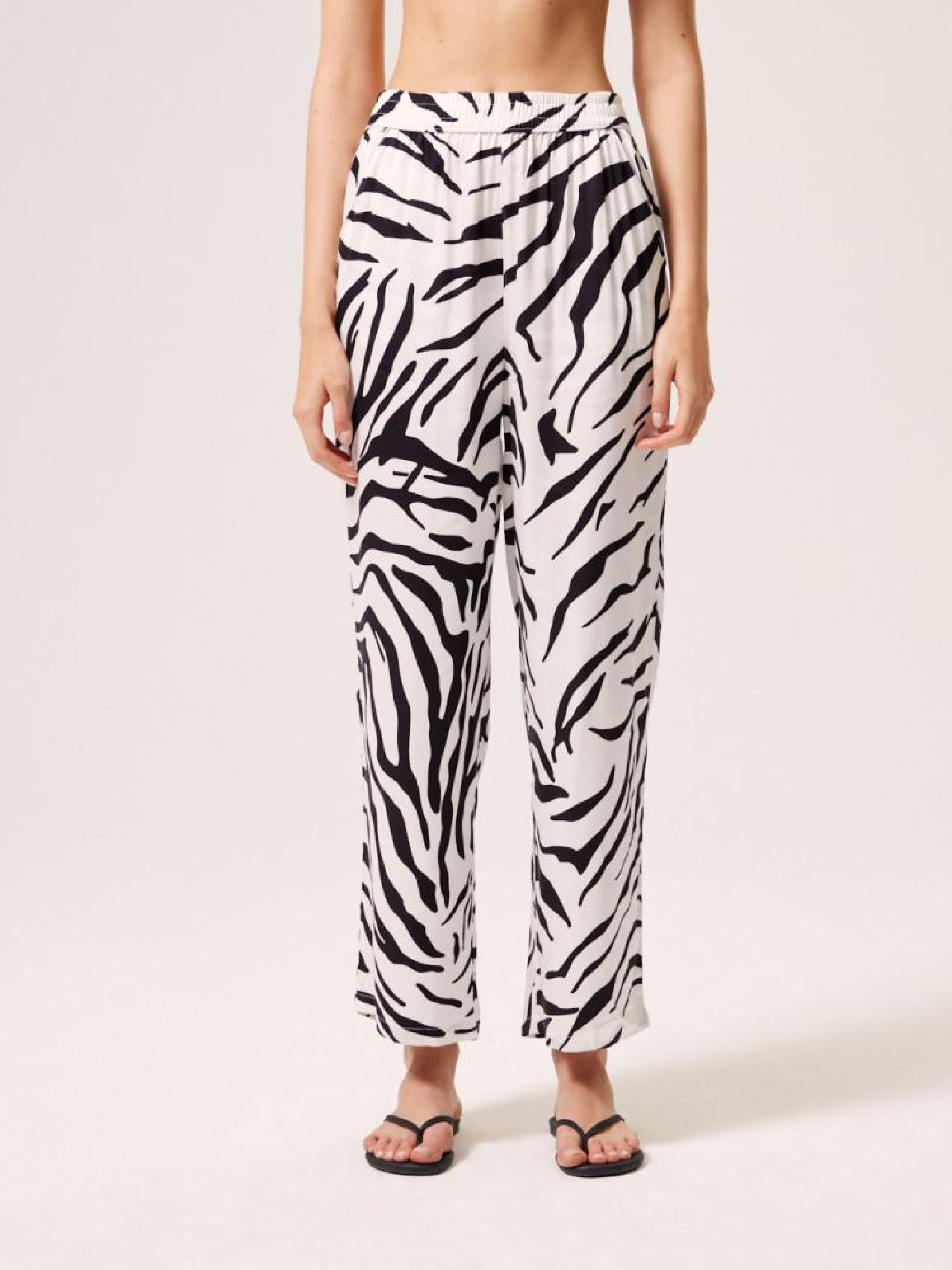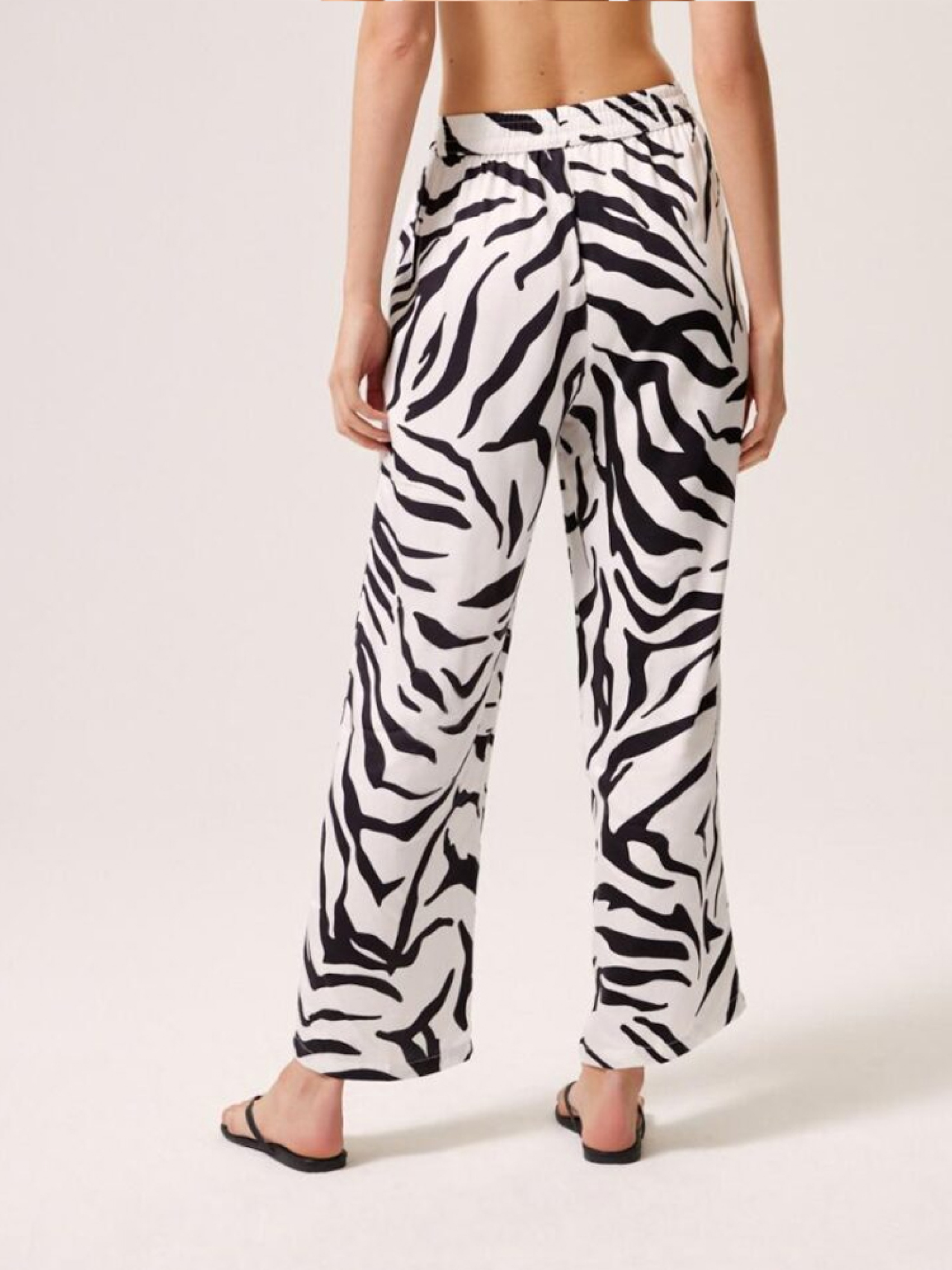 Брюки ZERBO 10044602 Брюки из струящейся вискозы с животным мотивом: - высокая талия с эластичной талией, - свободные, прямые штанины, - практичные передние карманы, - доступны в черно-белом цвете. Сезон: Весна/Лето 2024 Состав: 100% вискоза Уход: - стирка при максимум 30 °С - не отбеливать - не сушить в сушильной машине - гладить максимум при темп. 150 °С - не химчистка Размер на модели - 36 Рост модели - 180 см