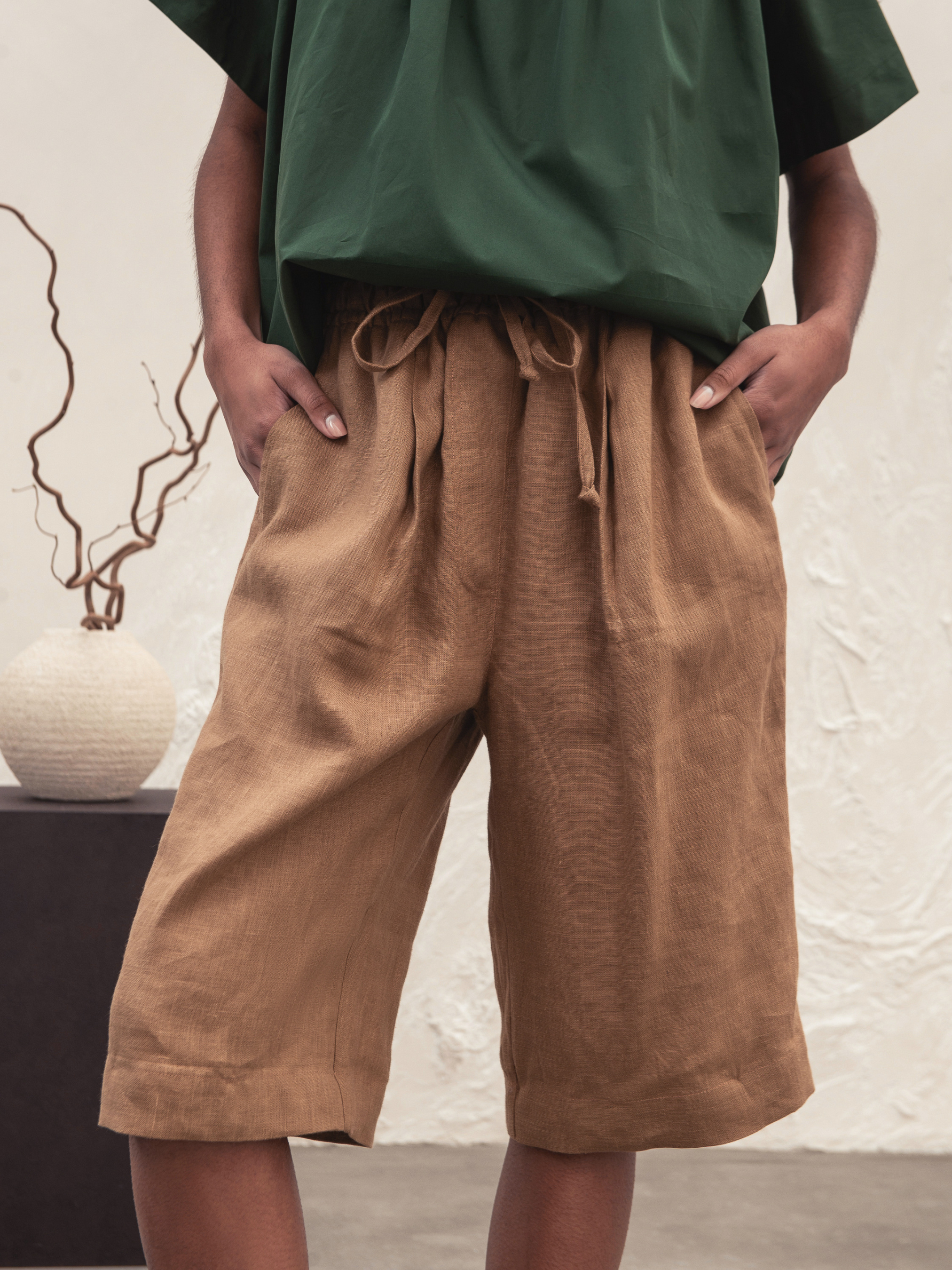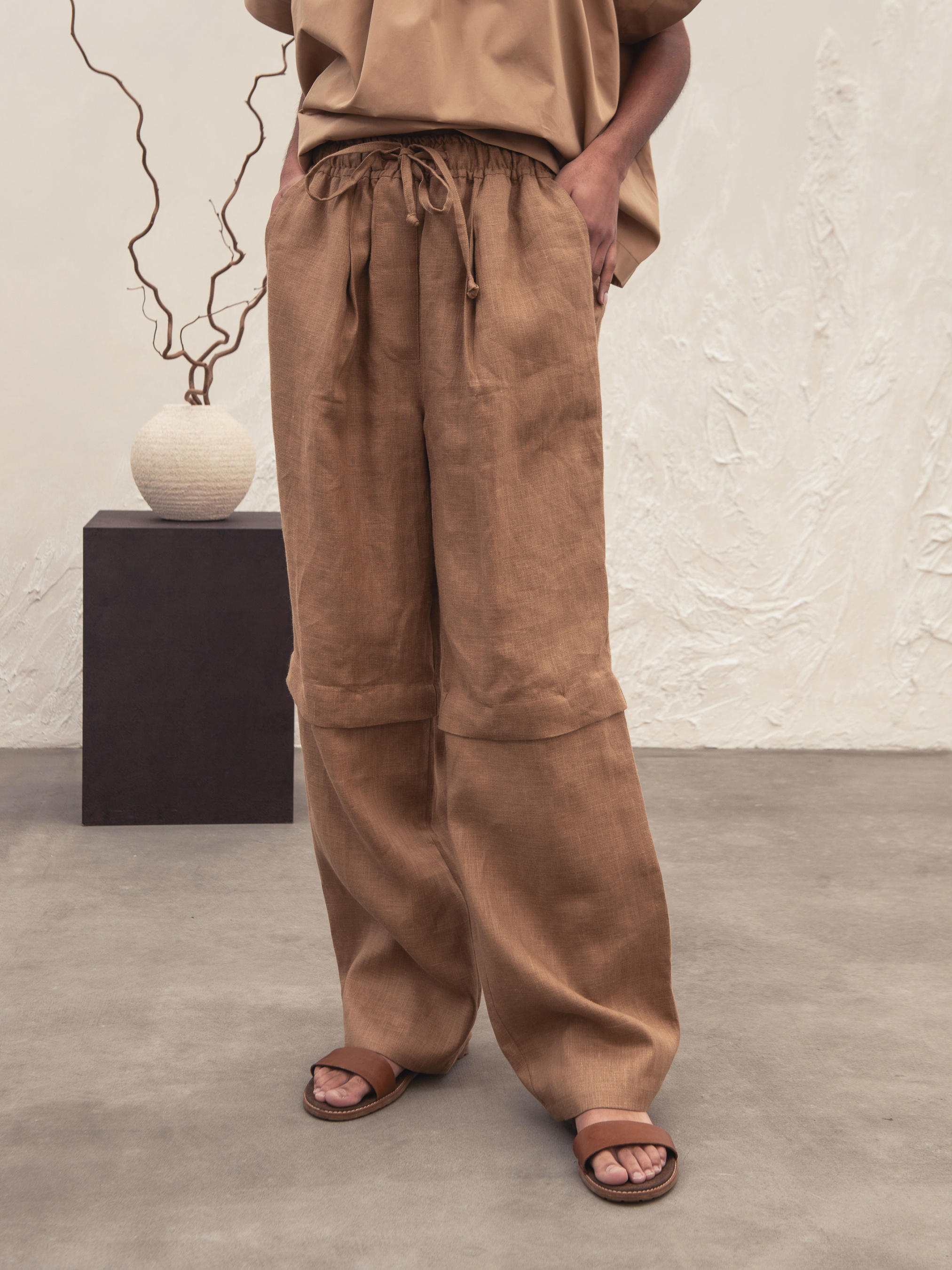 Брюки свободного кроя с разрезными деталями из мягкой крашеной льняной ткани. Эластичный пояс со шнурком. Боковые карманы по бокам. С помощью пуговиц брюки превращаются в шорты. На модели топ Linda и топ Thea. Лен 100% Лаура имеет размер XS и рост 165 см и носит размер HK1. НК 1 (S-M): Талия 64см, Талия растянутая 80см, Бедра 108см, Длина 106см, Длина (шорты) 63см, Длина внутренняя 75см, Длина сиденья 79см, Ширина низа 49см НК 2 (L-XL): Талия 78см, Талия растянутая 105см, Бедра 120см, Длина 106см, Длина (шорты) 63см, Длина внутренняя 75см, Длина сидения 84см, Ширина низа 54см